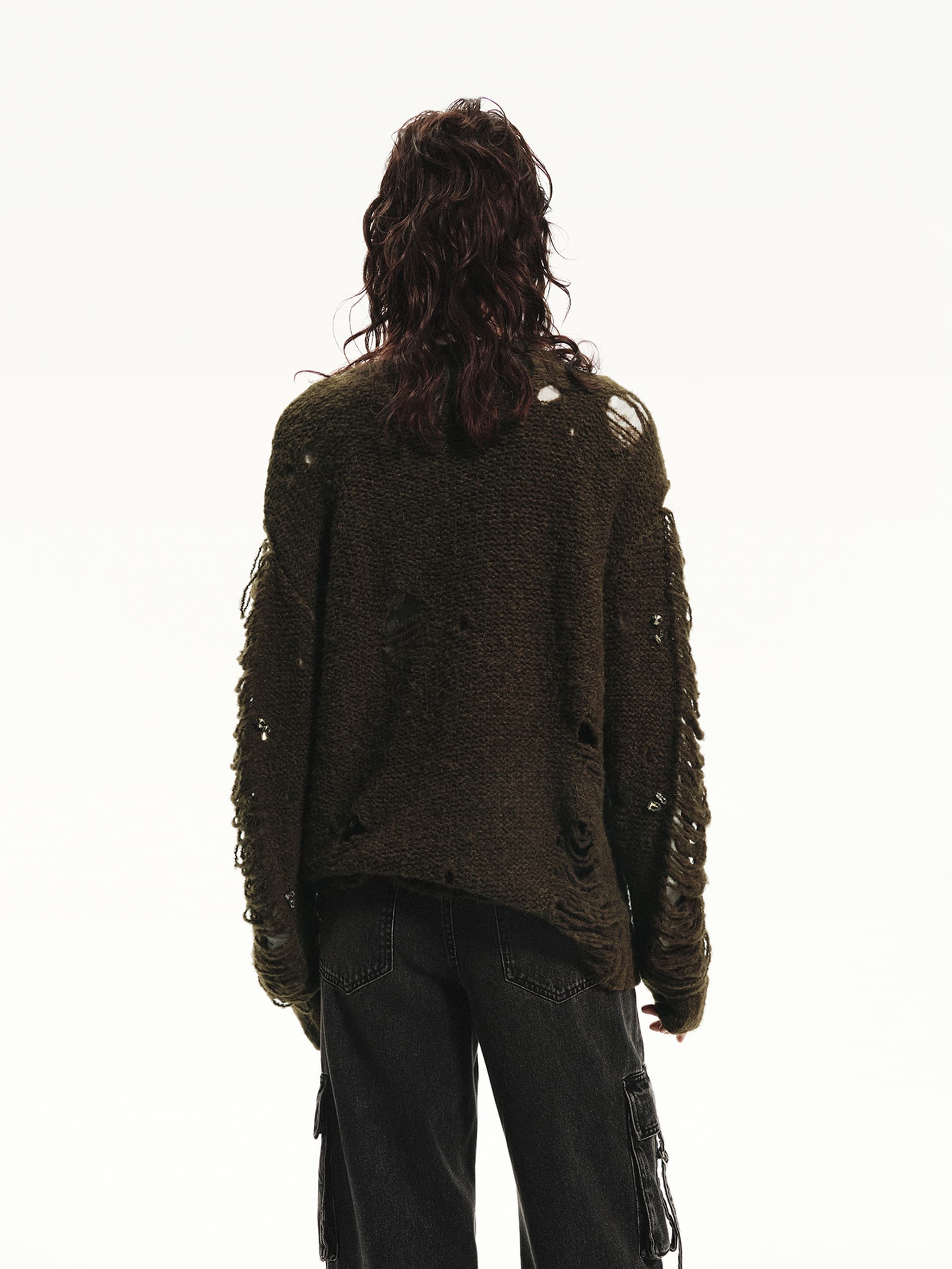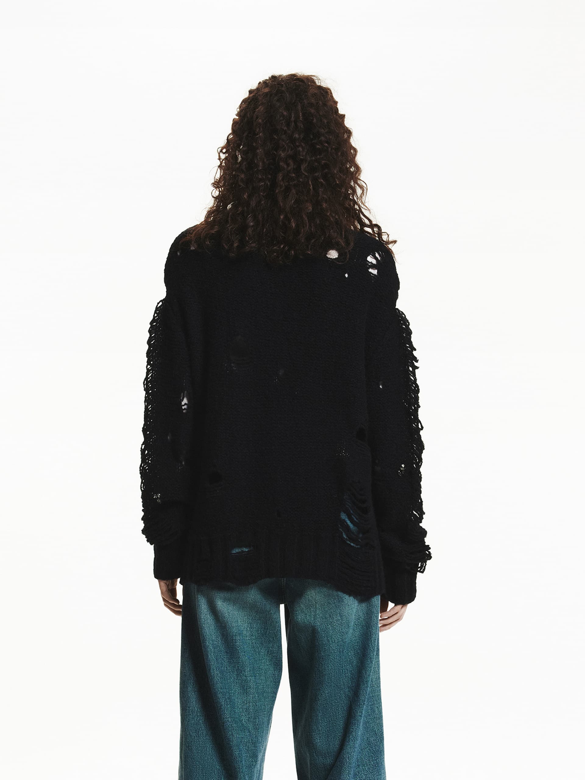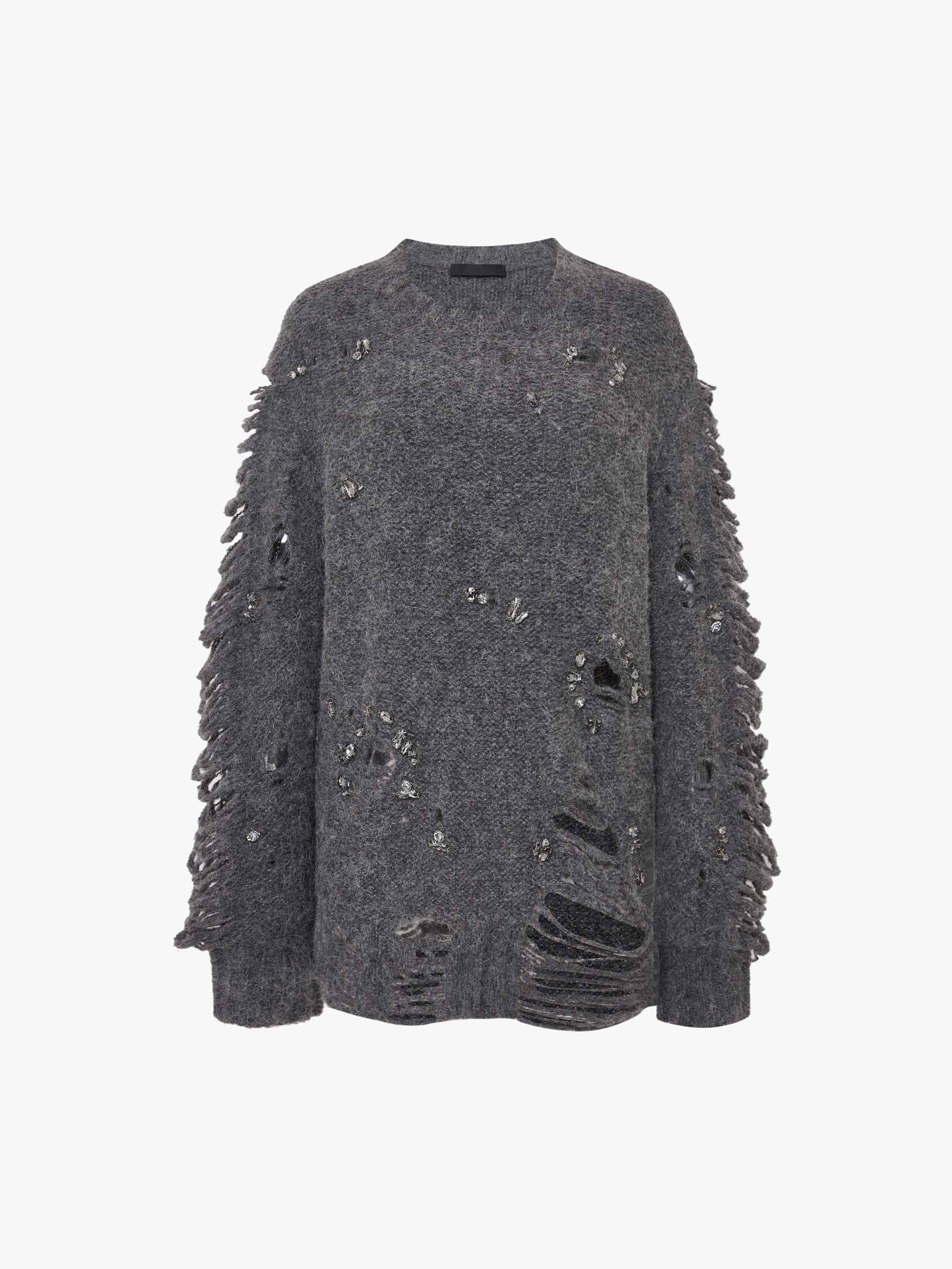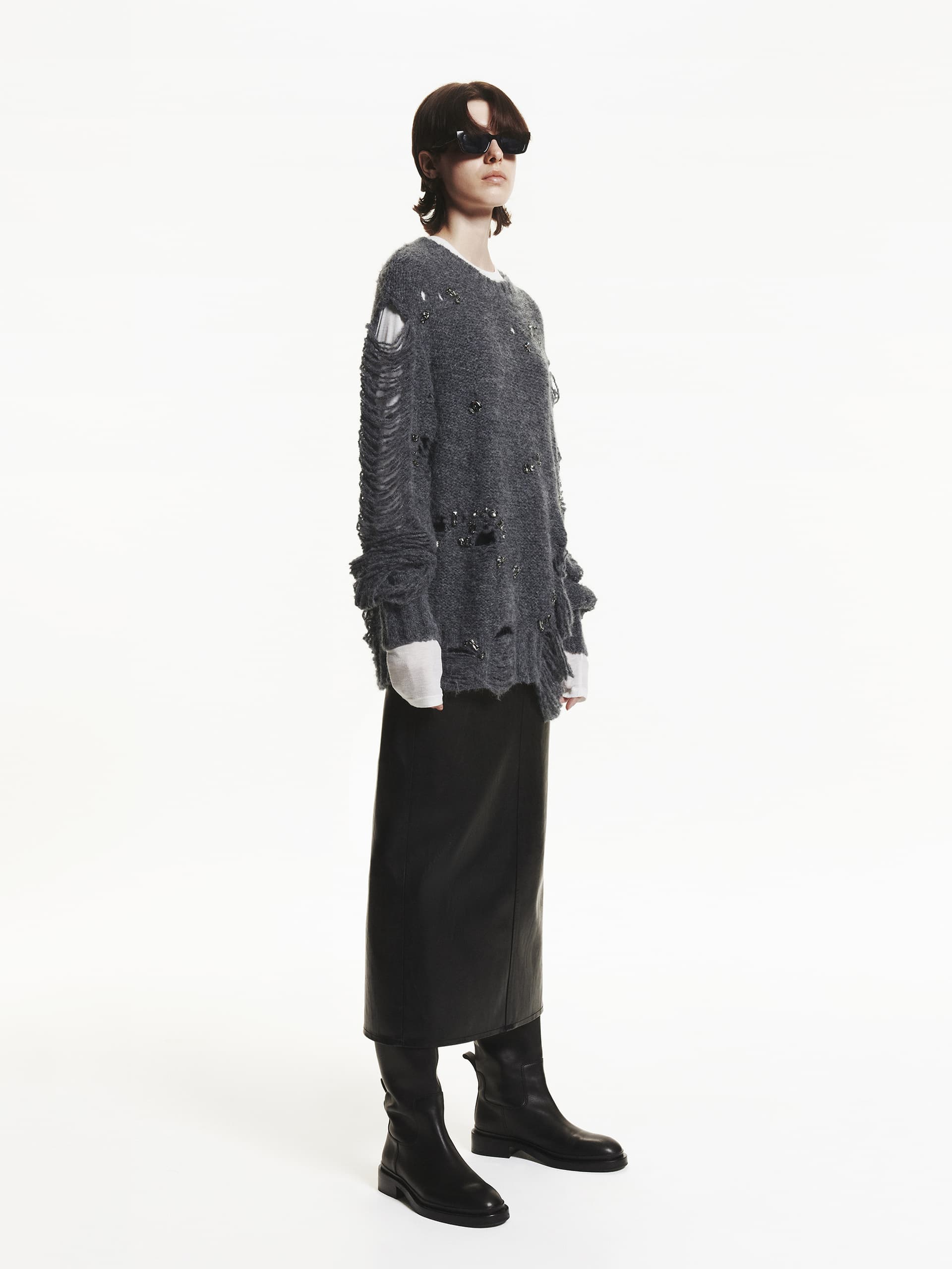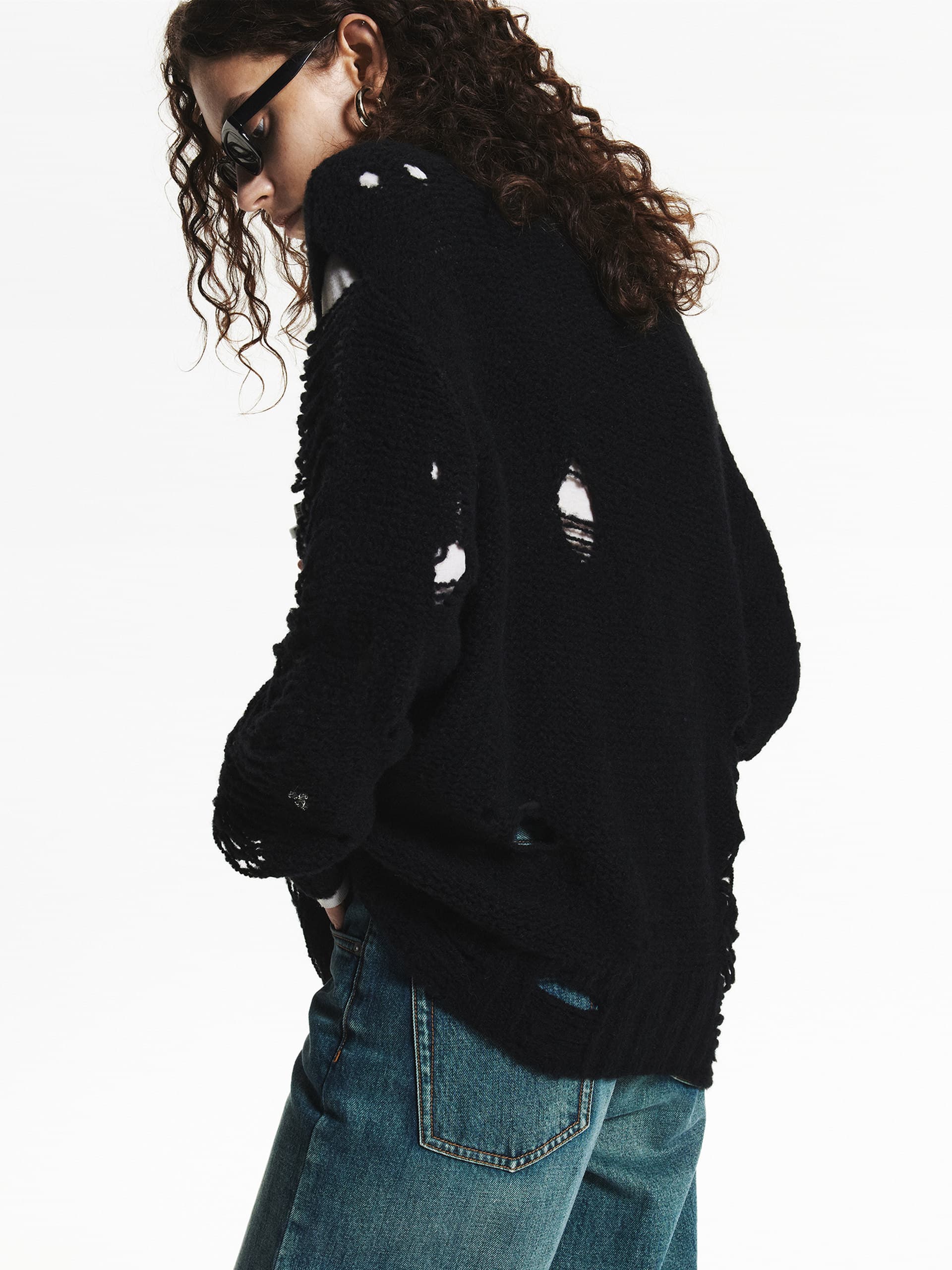 Crafted from a luxurious wool and alpaca blend, this sweater boasts a fluffy touch for ultimate comfort. The irregular distressed design and crystal embellishment add a unique touch, while the loose fit allows for easy wear.