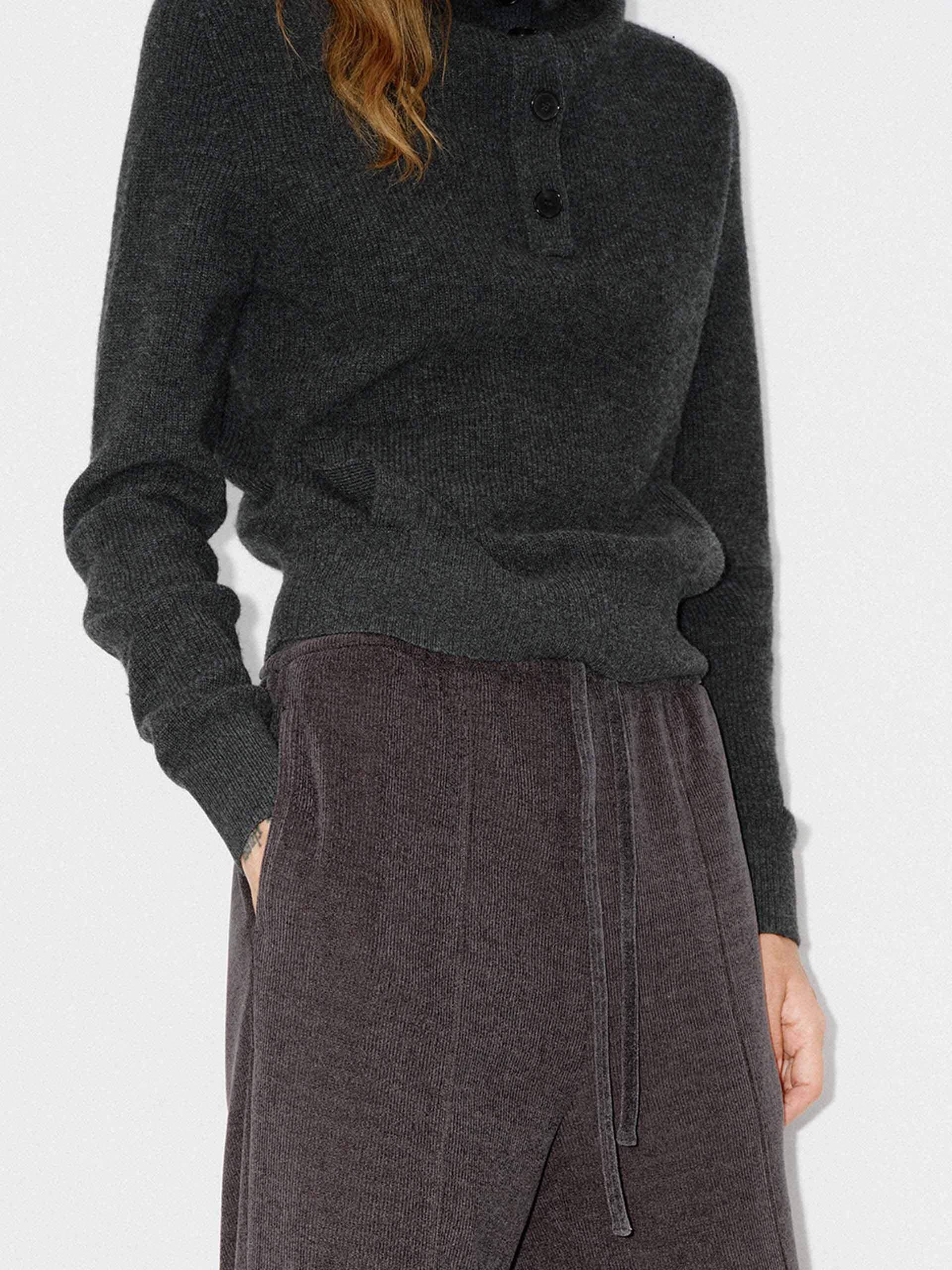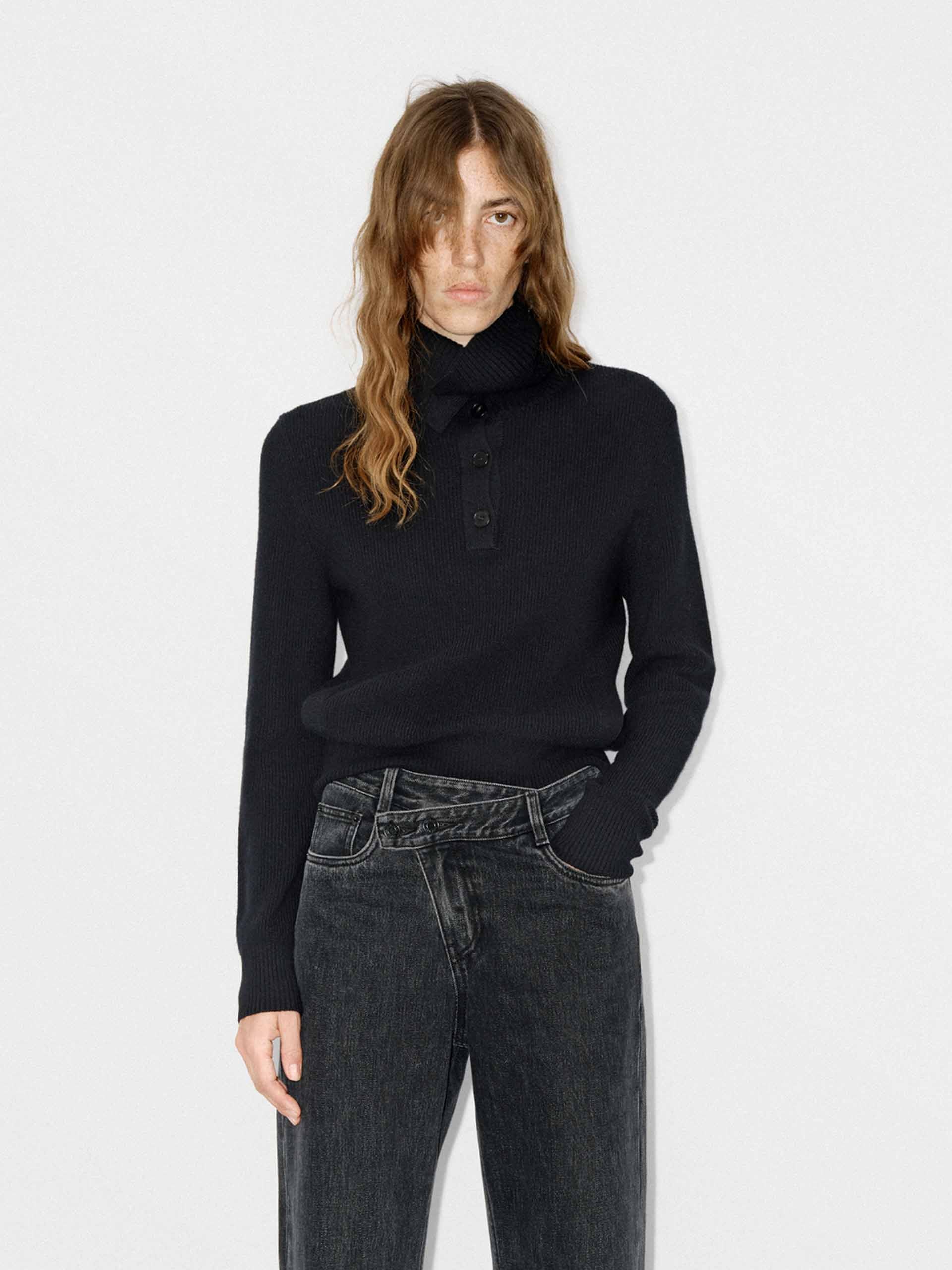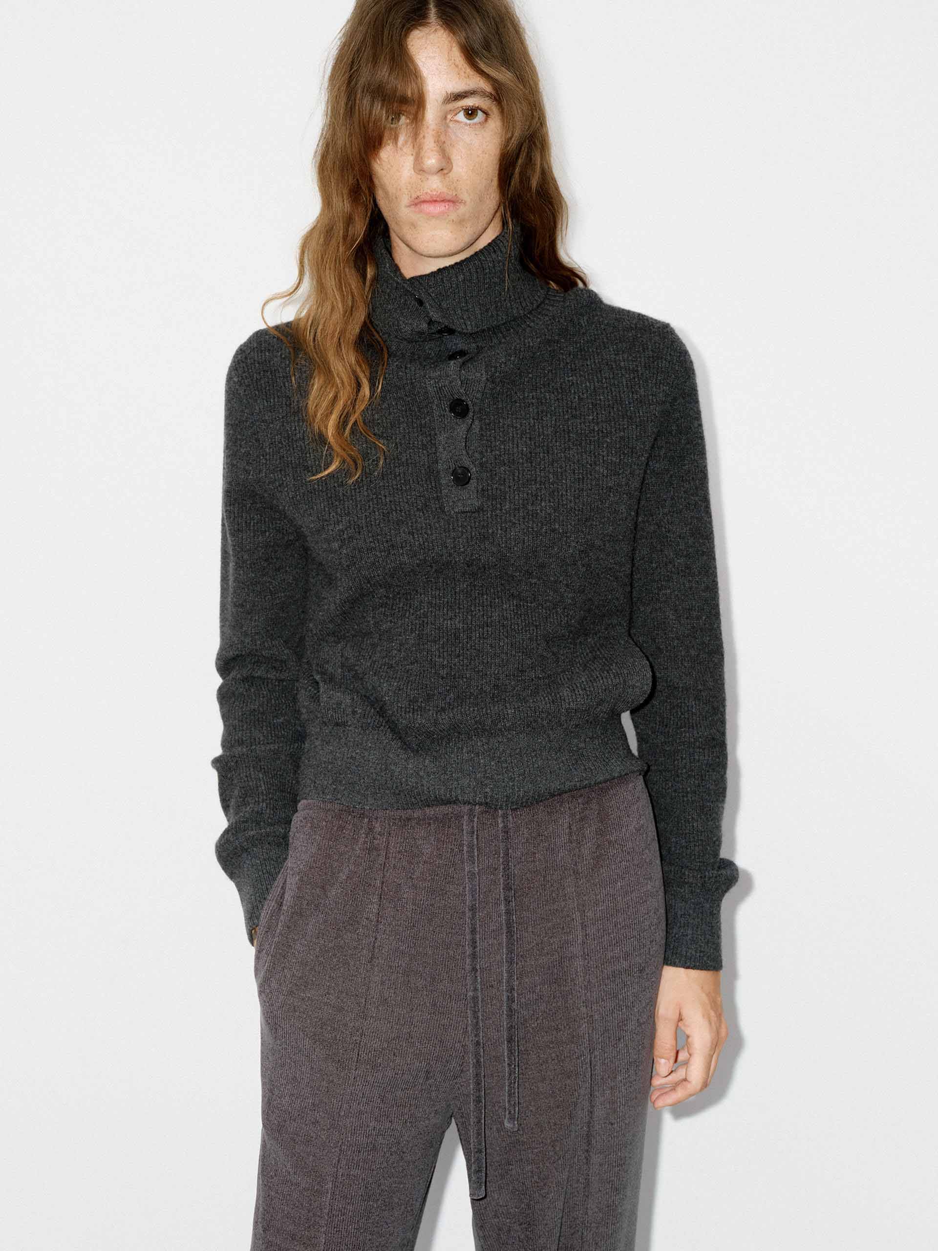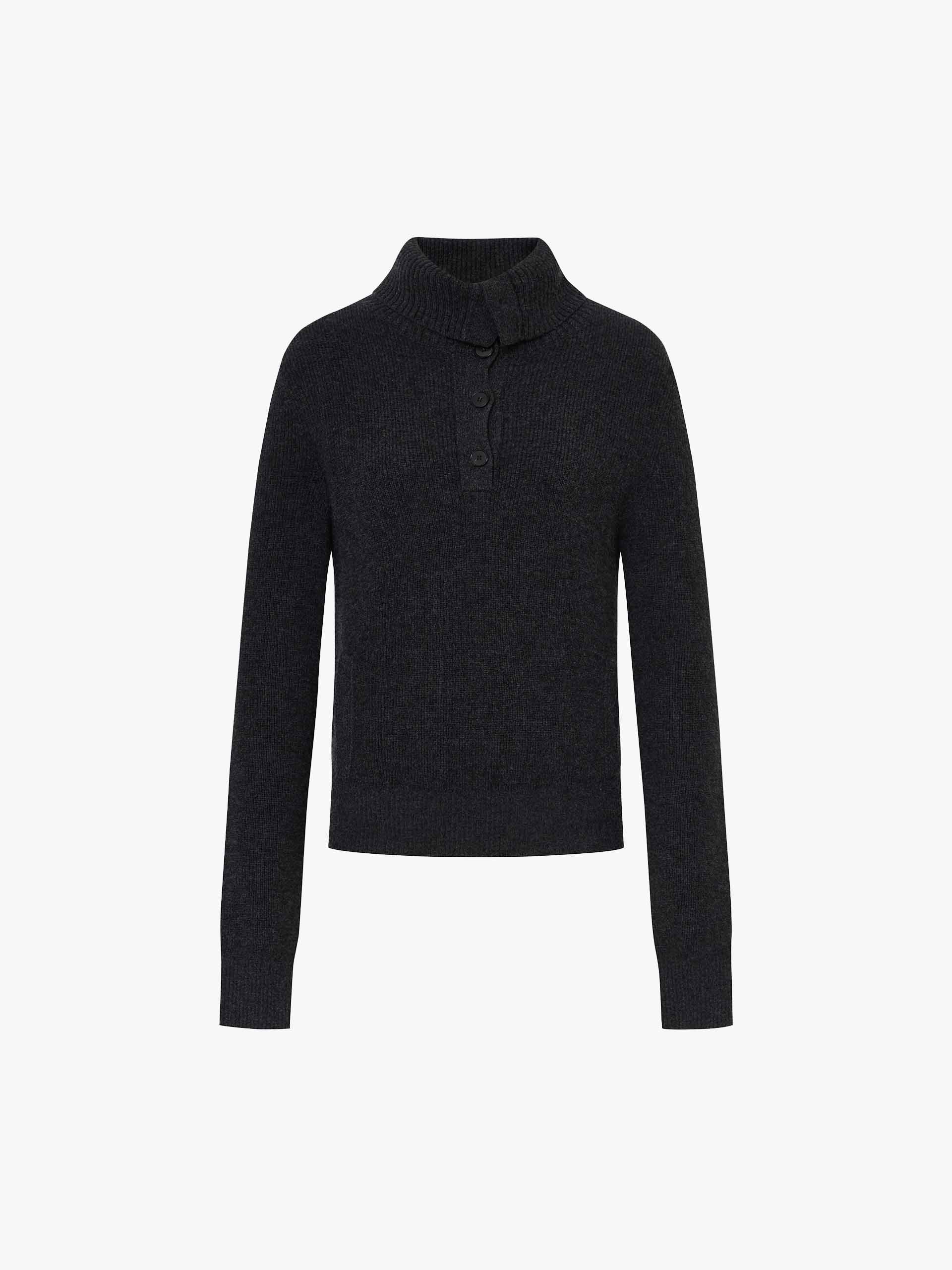 This knit top is a must-have for comfortable wear during the fall and winter. Made from a soft wool and cashmere blend, it features a slim fit, high roll-neck collar, half button detail, and side pockets for added convenience.