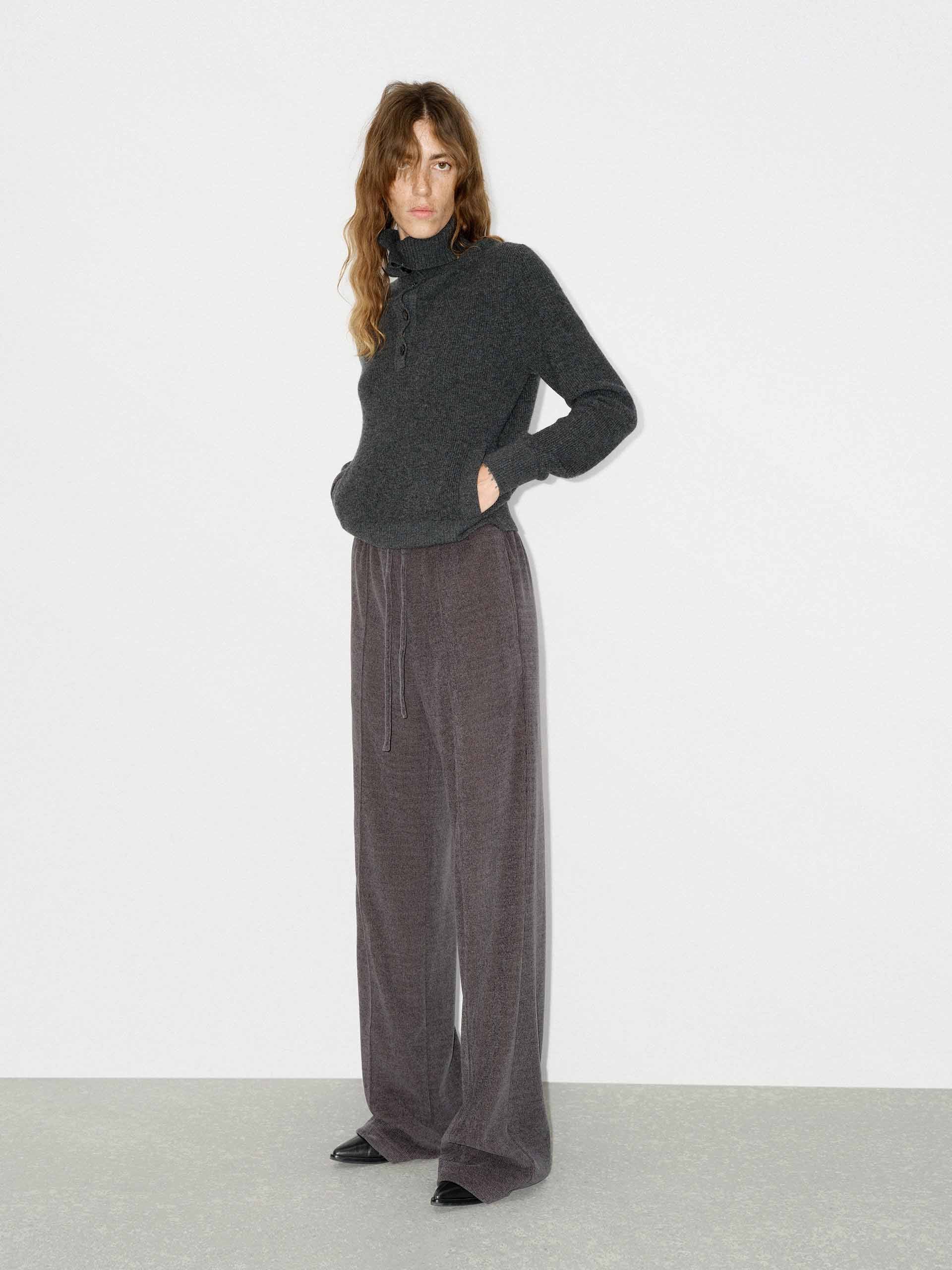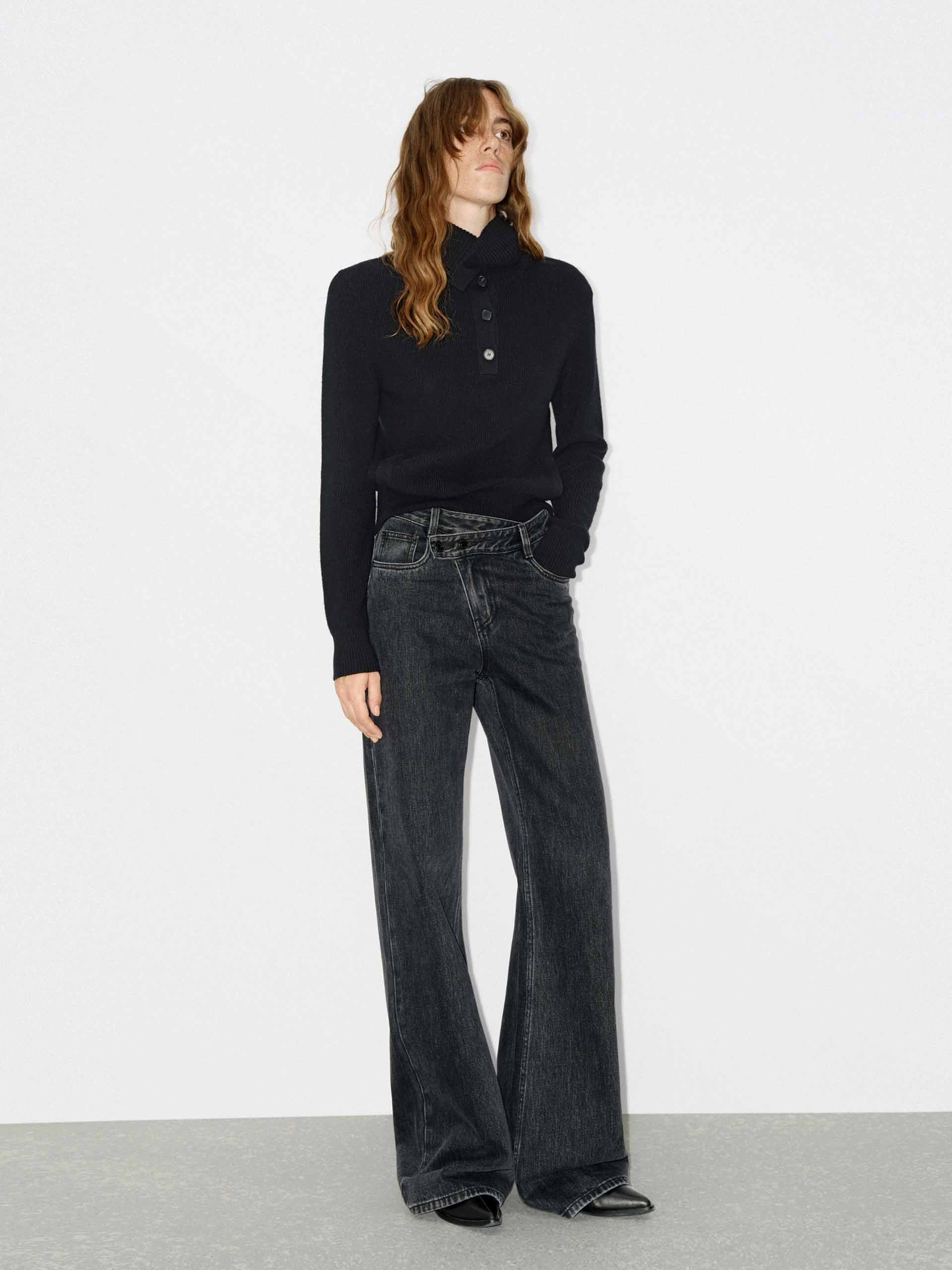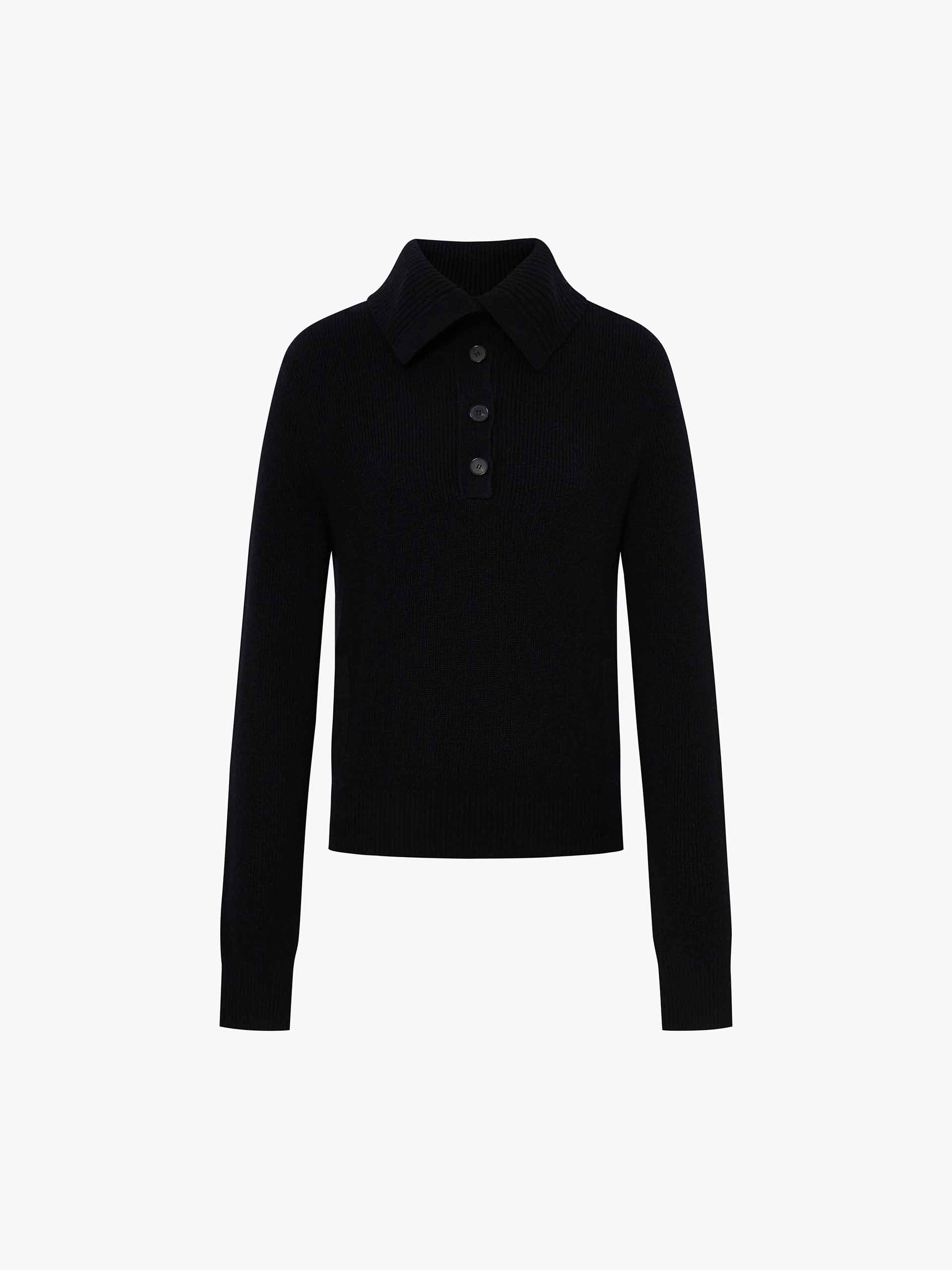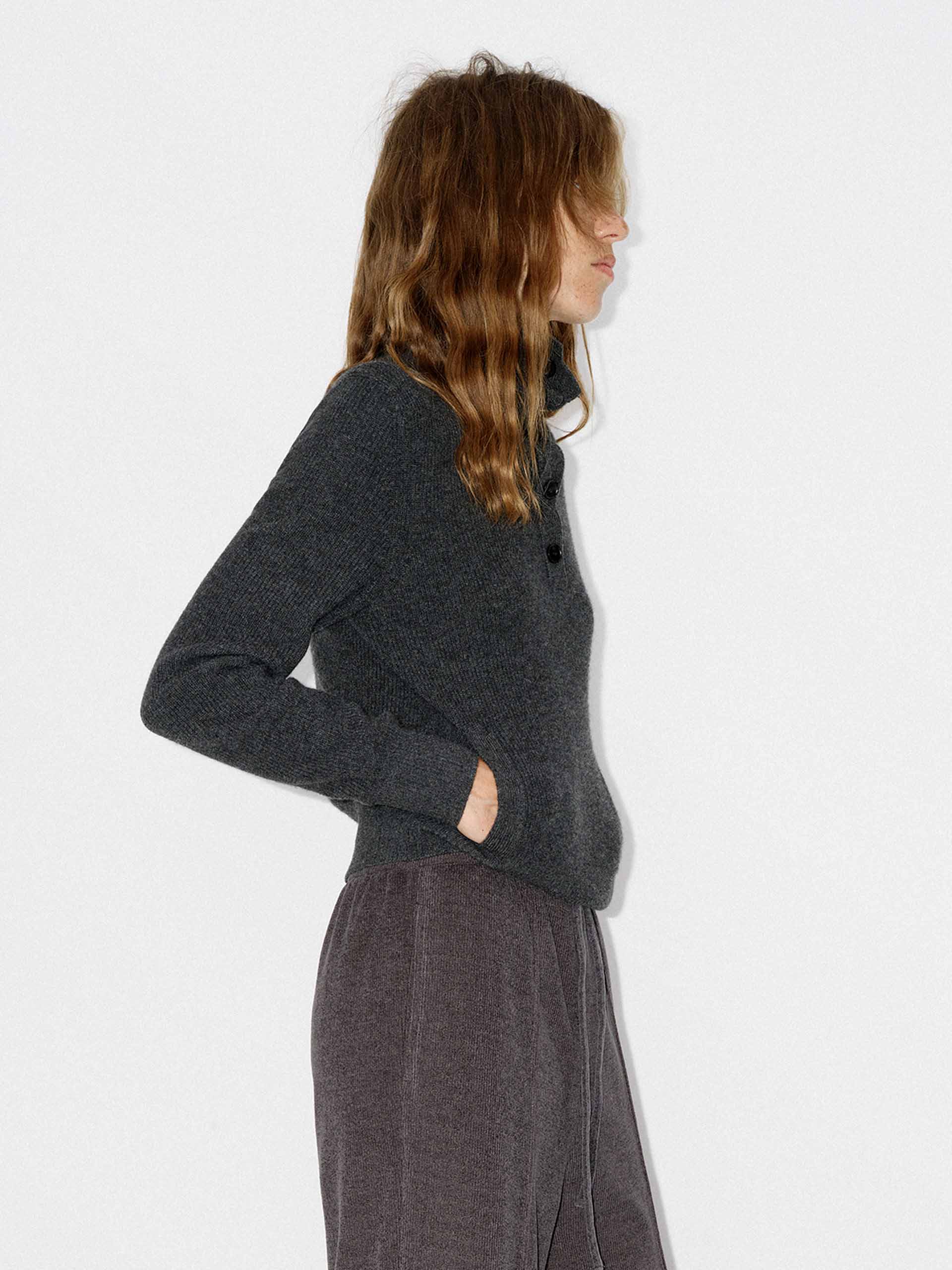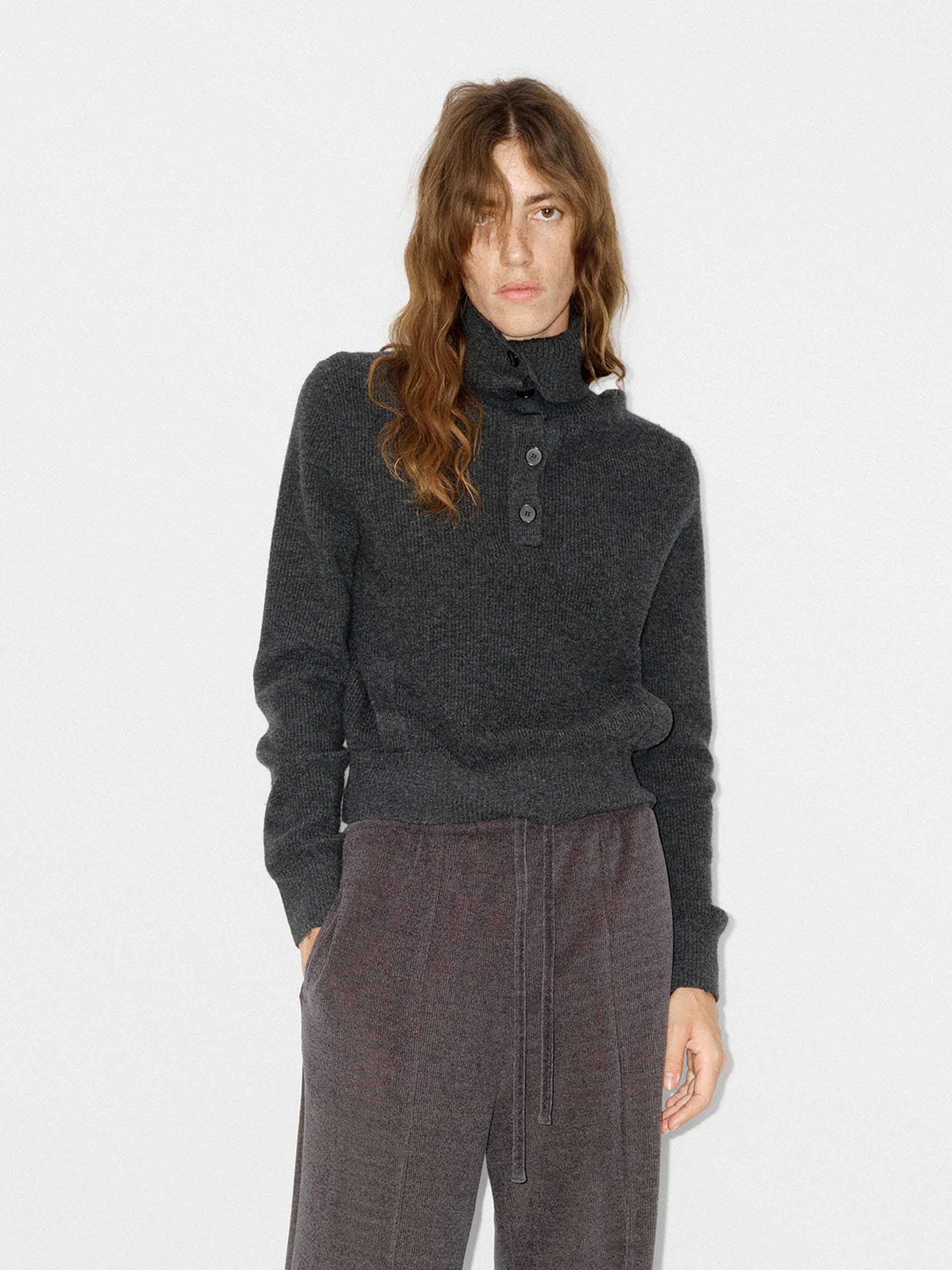 This knit top is a must-have for comfortable wear during the fall and winter. Made from a soft wool and cashmere blend, it features a slim fit, high roll-neck collar, half button detail, and side pockets for added convenience.
