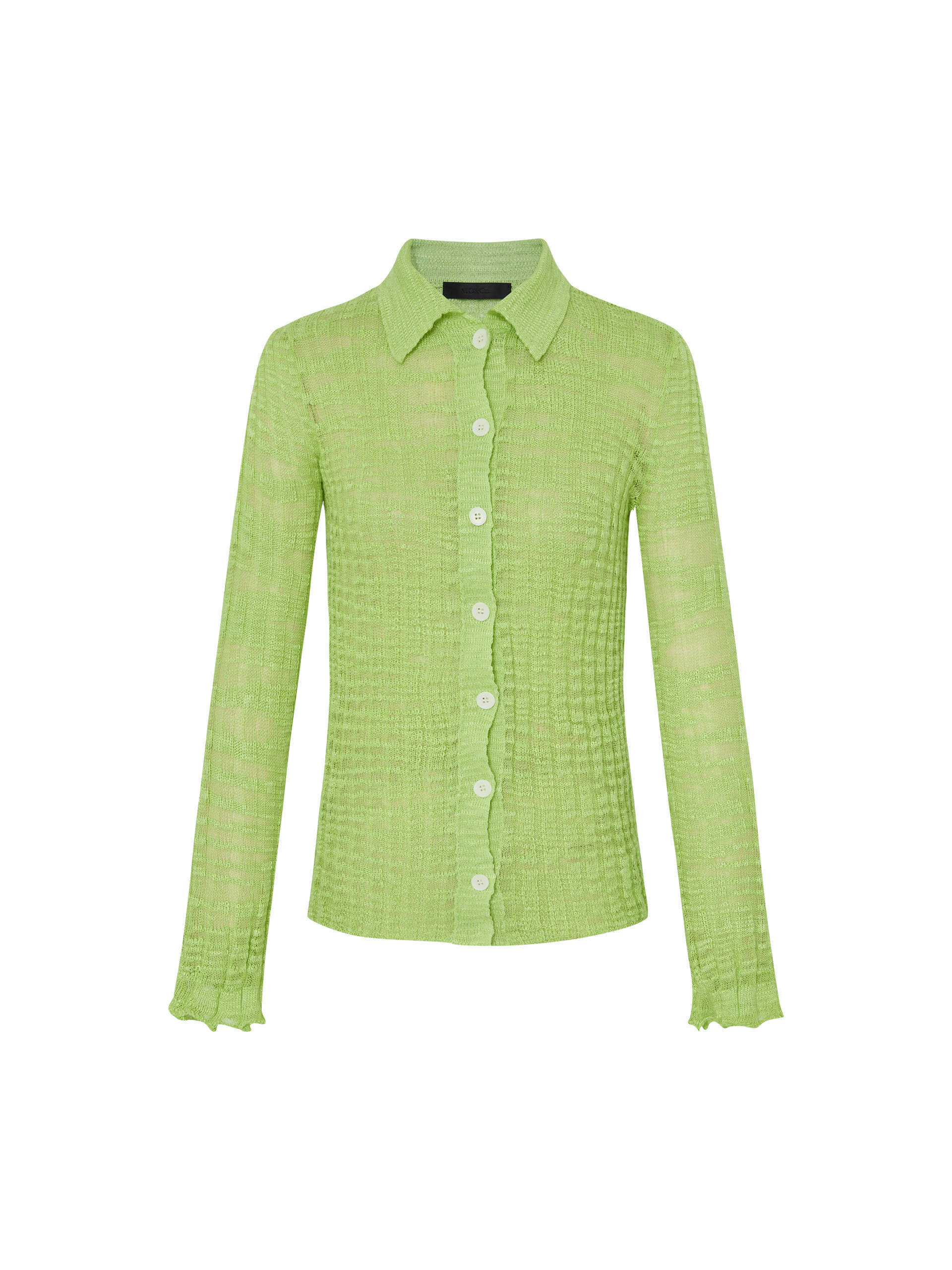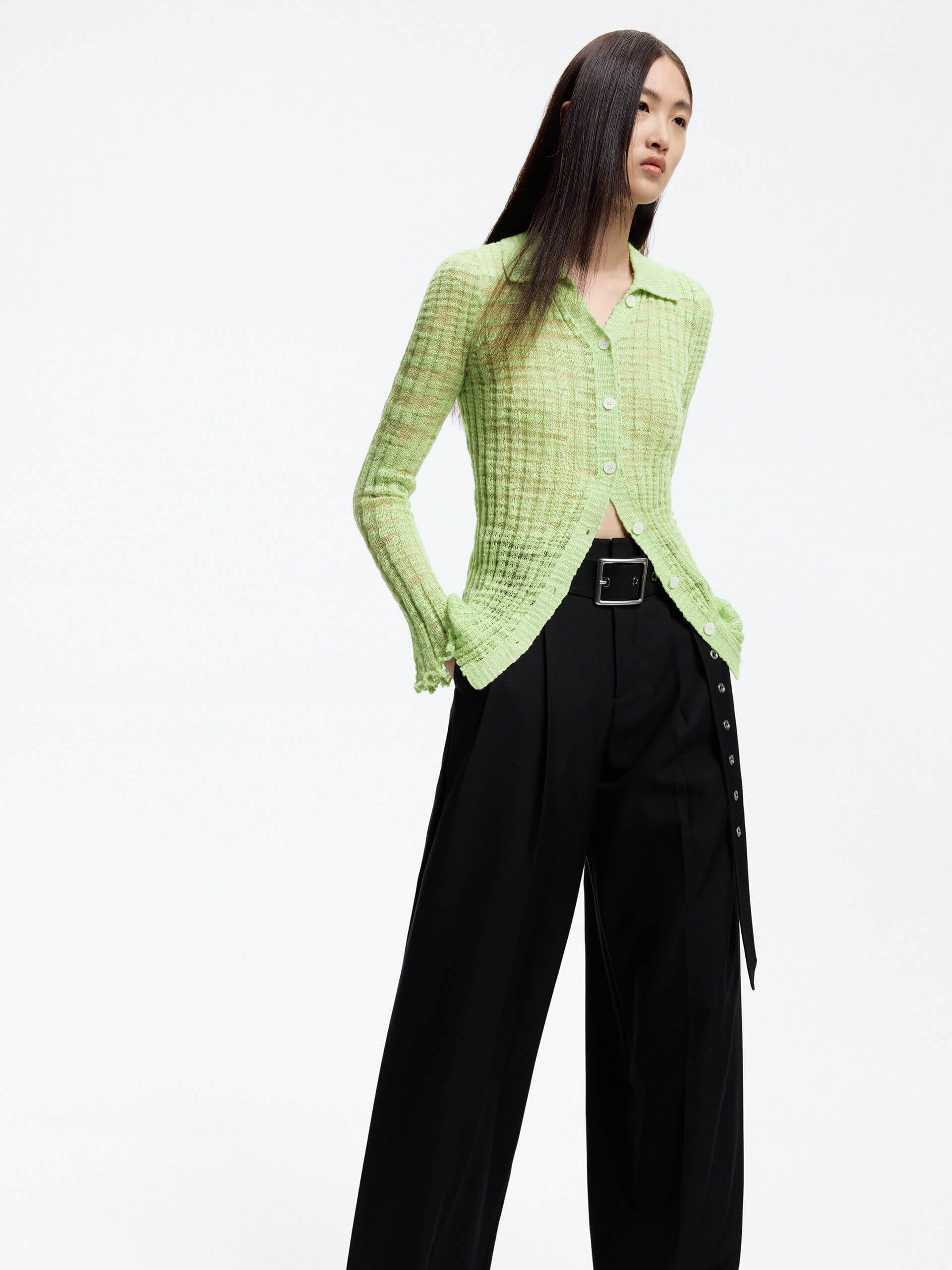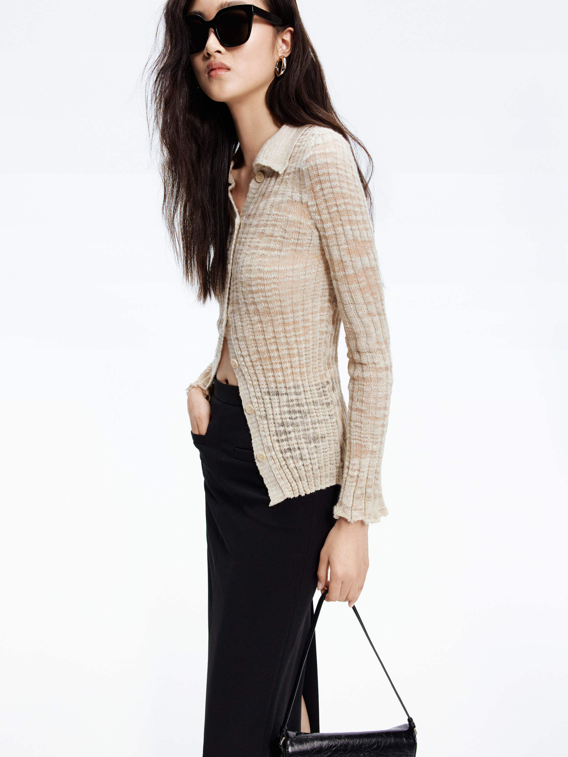 Our team has updated the classic tailoring code for spring. The soft, slightly sheer fabric offers a delicate touch. The trumpet cuffs add a touch of elegance. Its slim fit pairs perfectly with high-waisted skirts and pants, making it a fashion-forward and unique addition to your wardrobe.