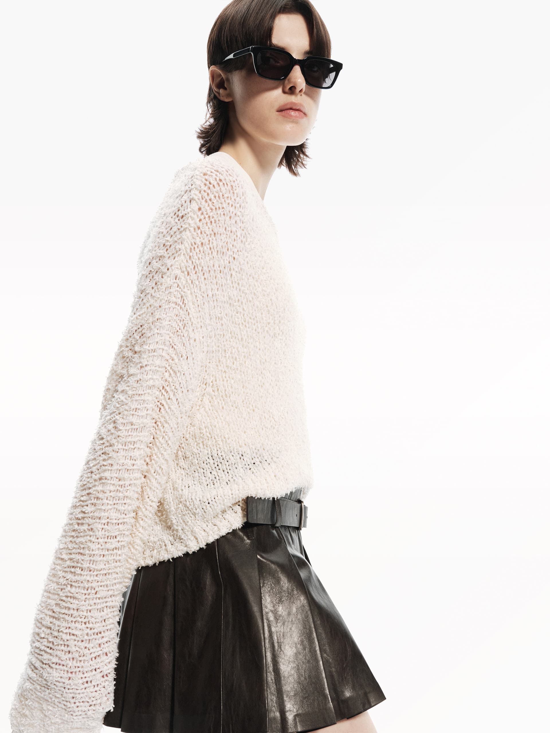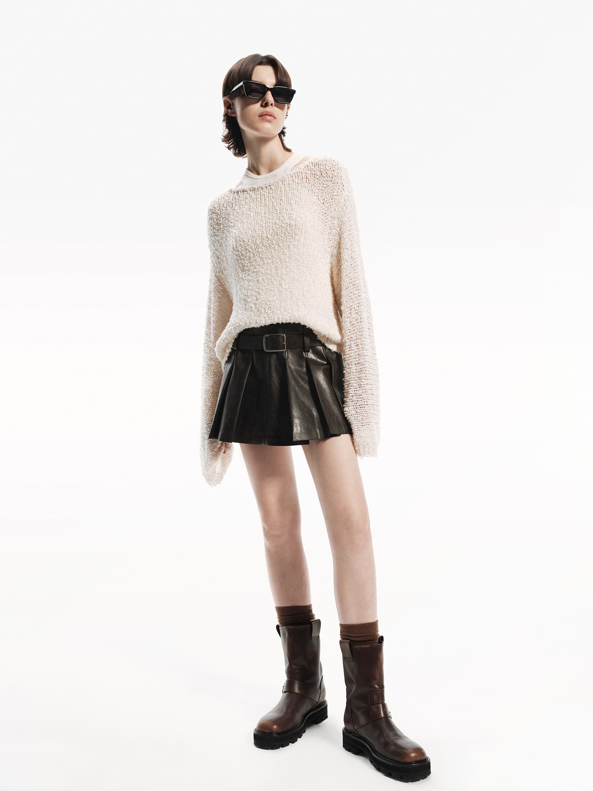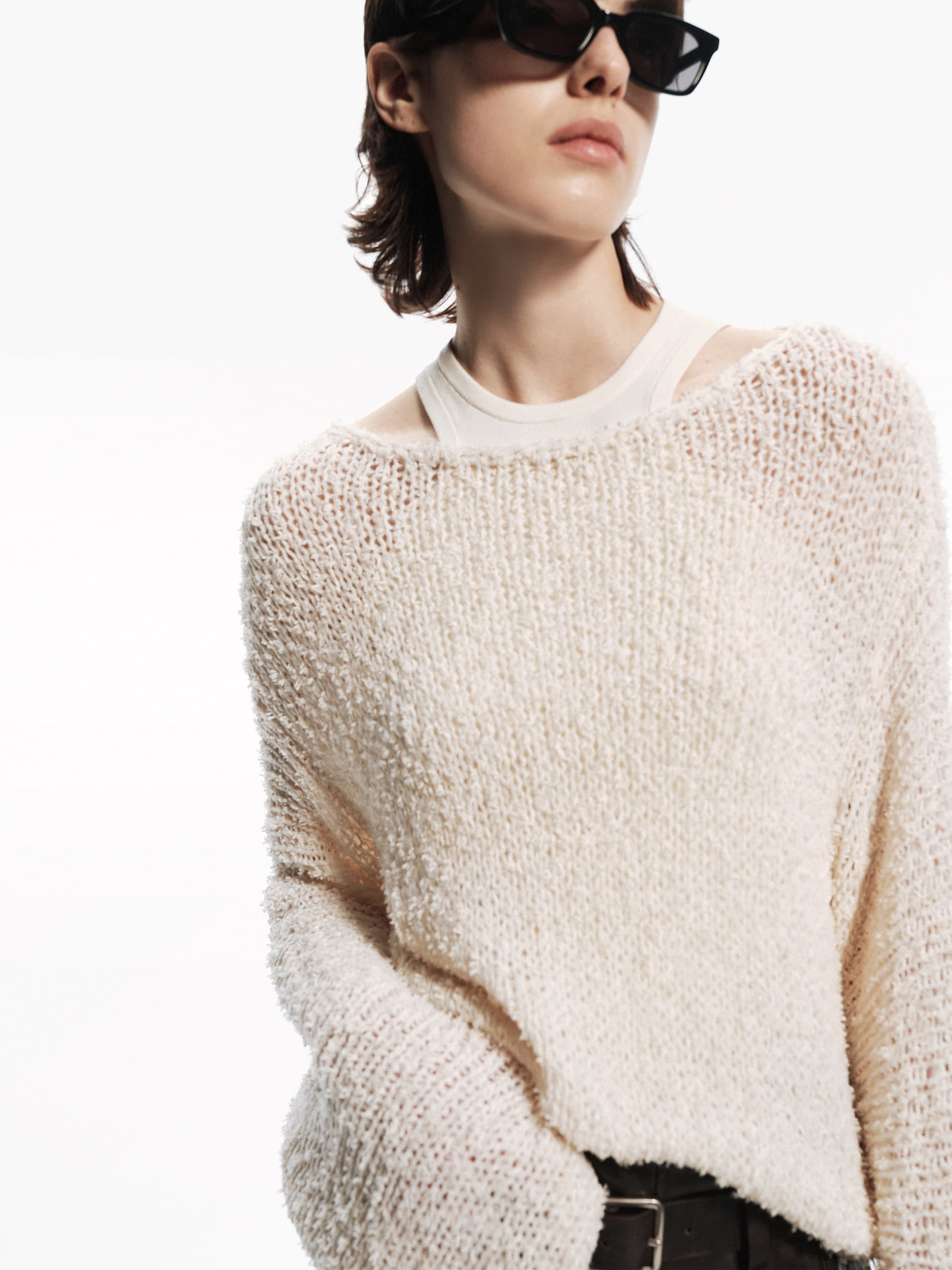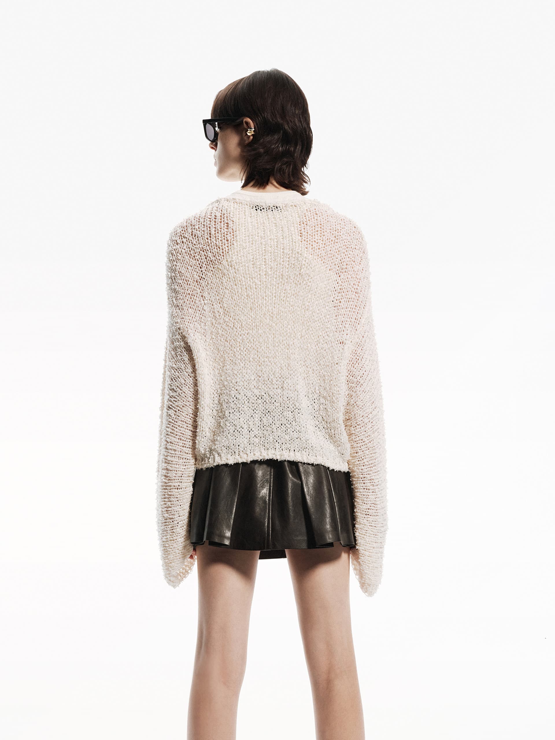 Expertly crafted from a cozy cotton blend, this sweater has a delicate crochet knit design that adds a chic with a sheer effect, while the slightly oversized fit provides a flattering silhouette. Perfect for layering and the beige hue pairs well with a leather skirt for a stylish look.