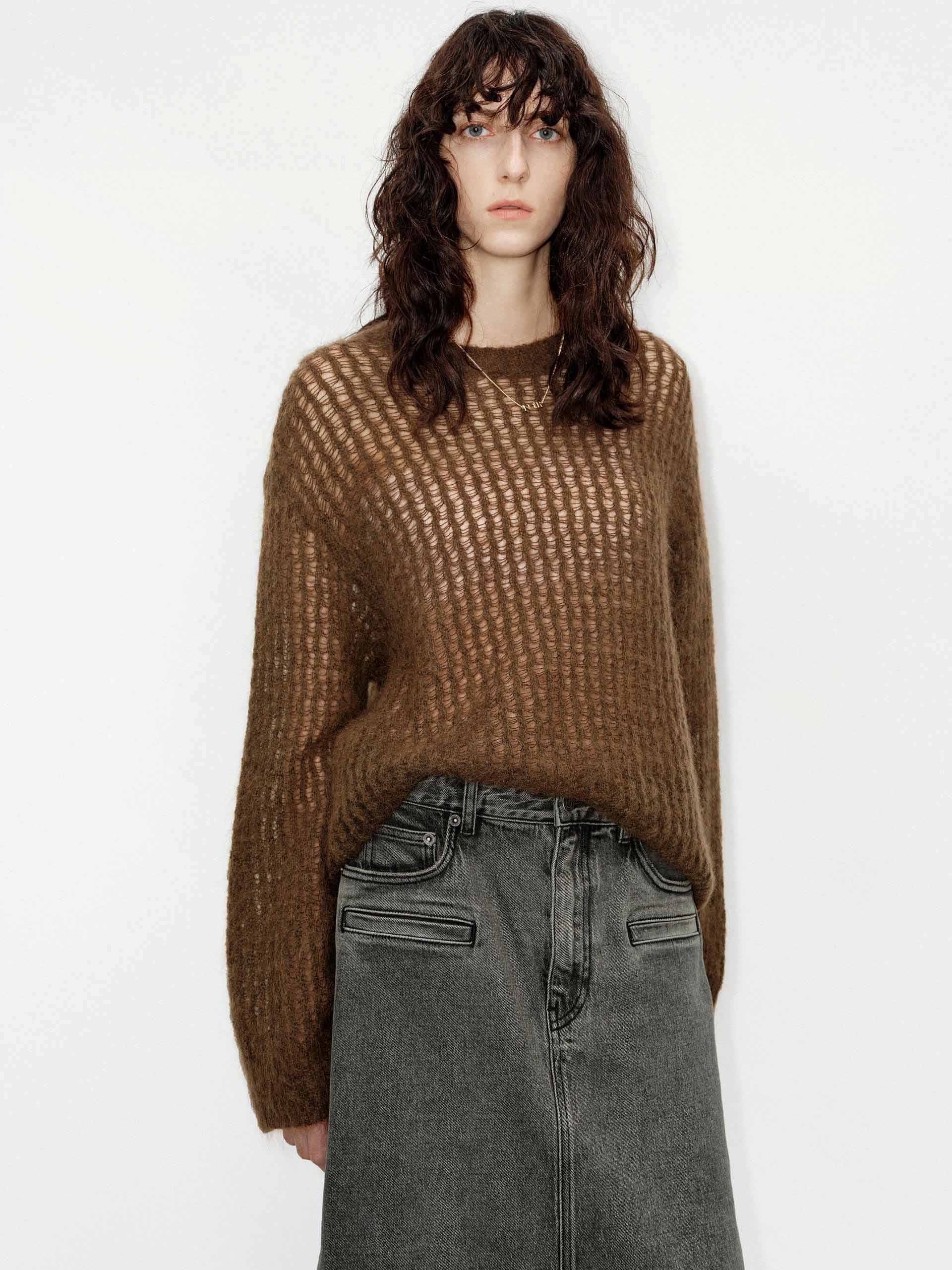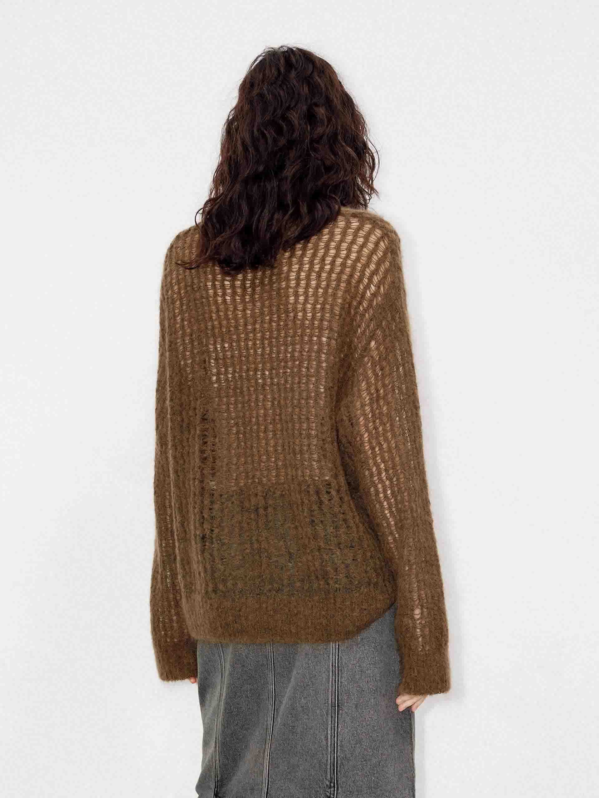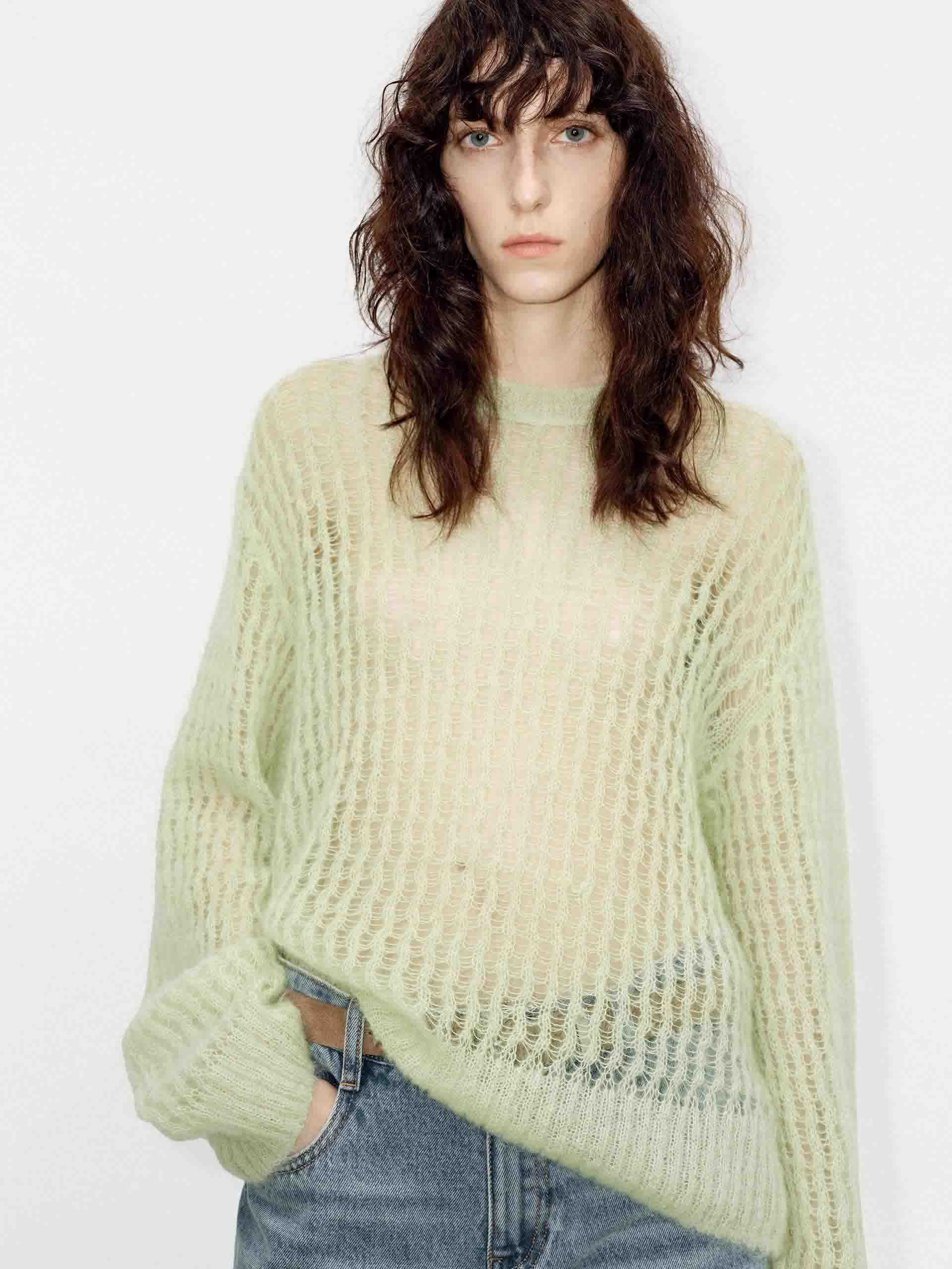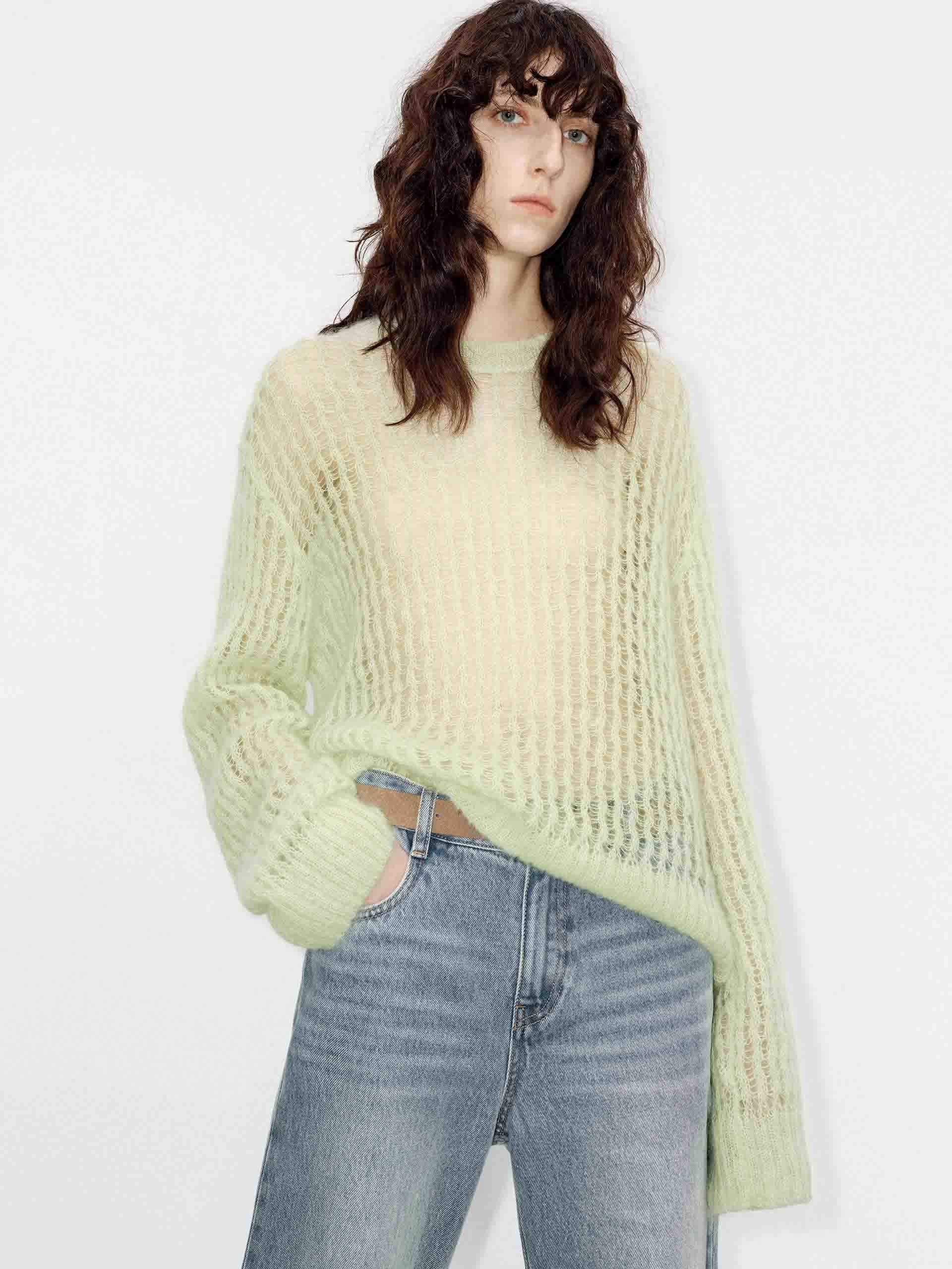 Expertly crafted from a soft blend of mohair, wool, and other fibers, this sweater offers luxurious comfort and eye-catching style. Features a loose shape and drop shoulder design, while the crochet knit and sheer details add a chic.