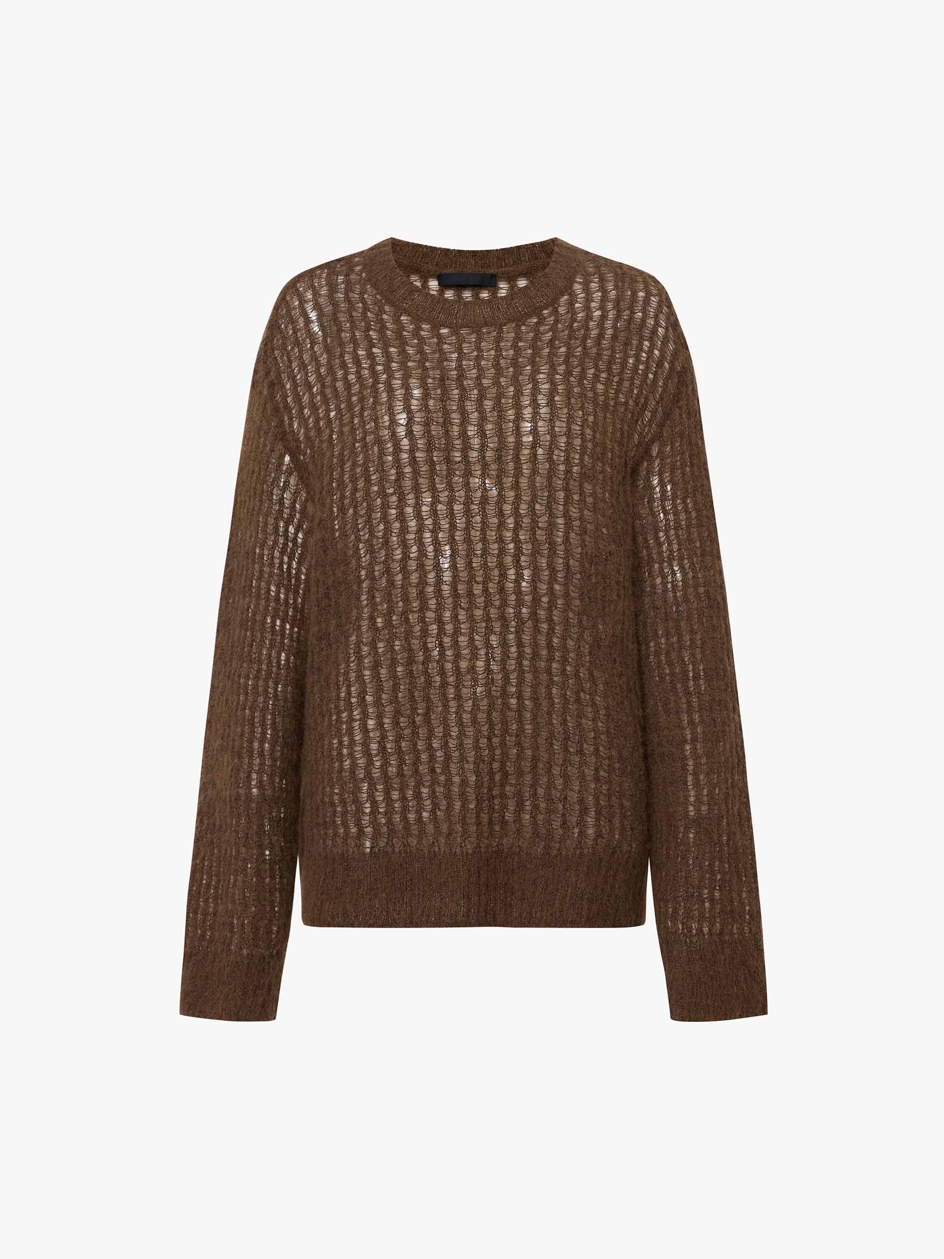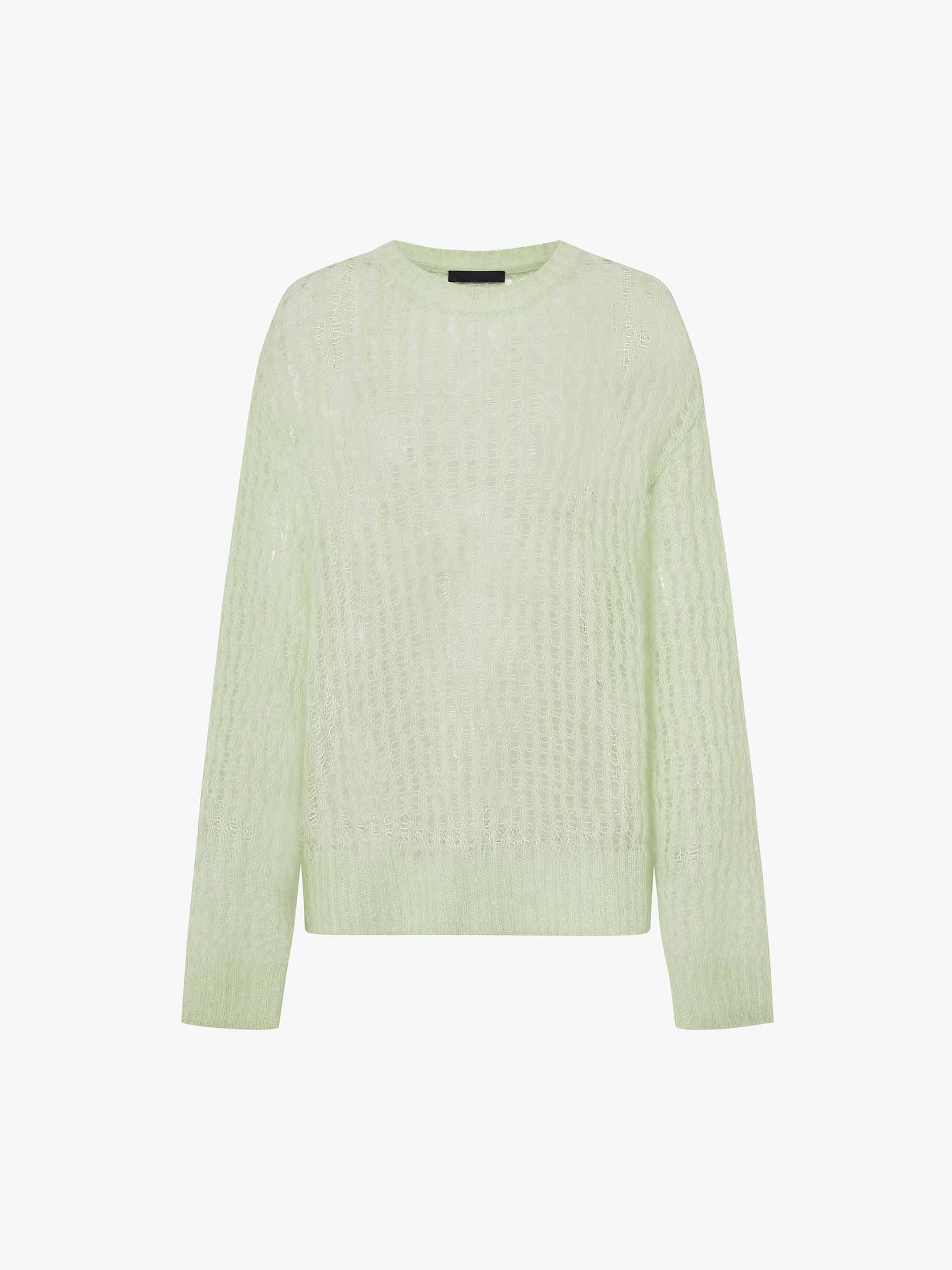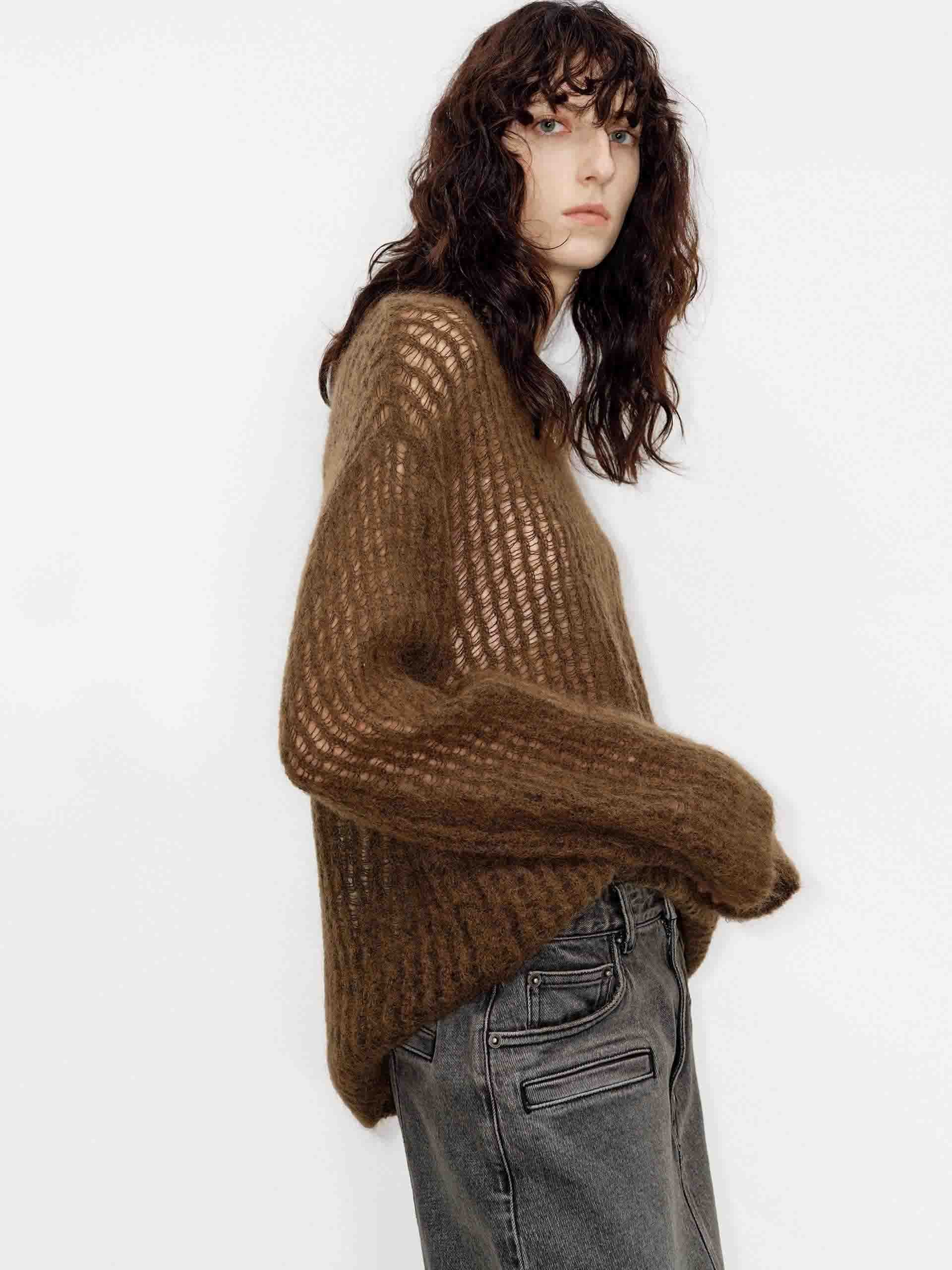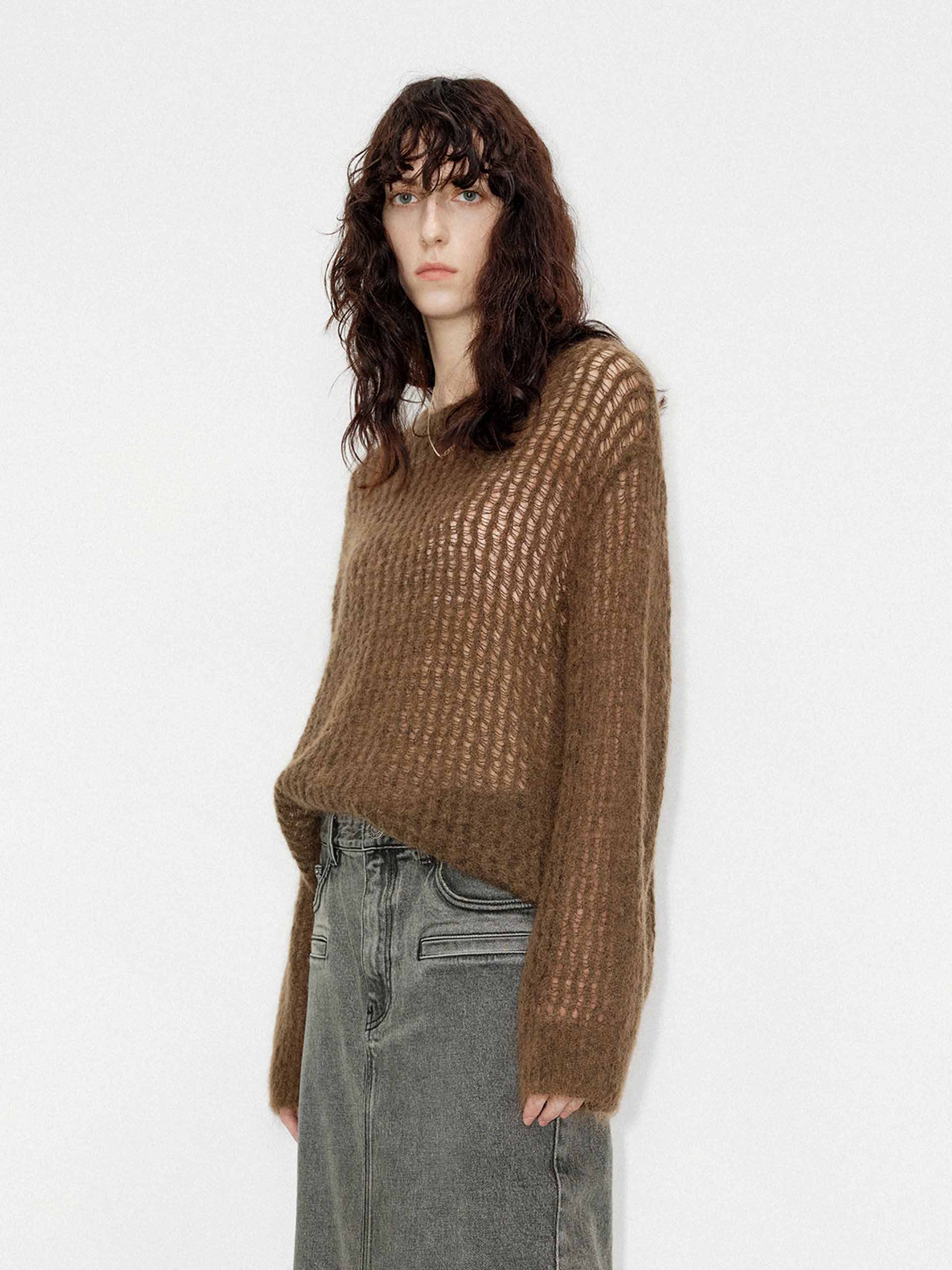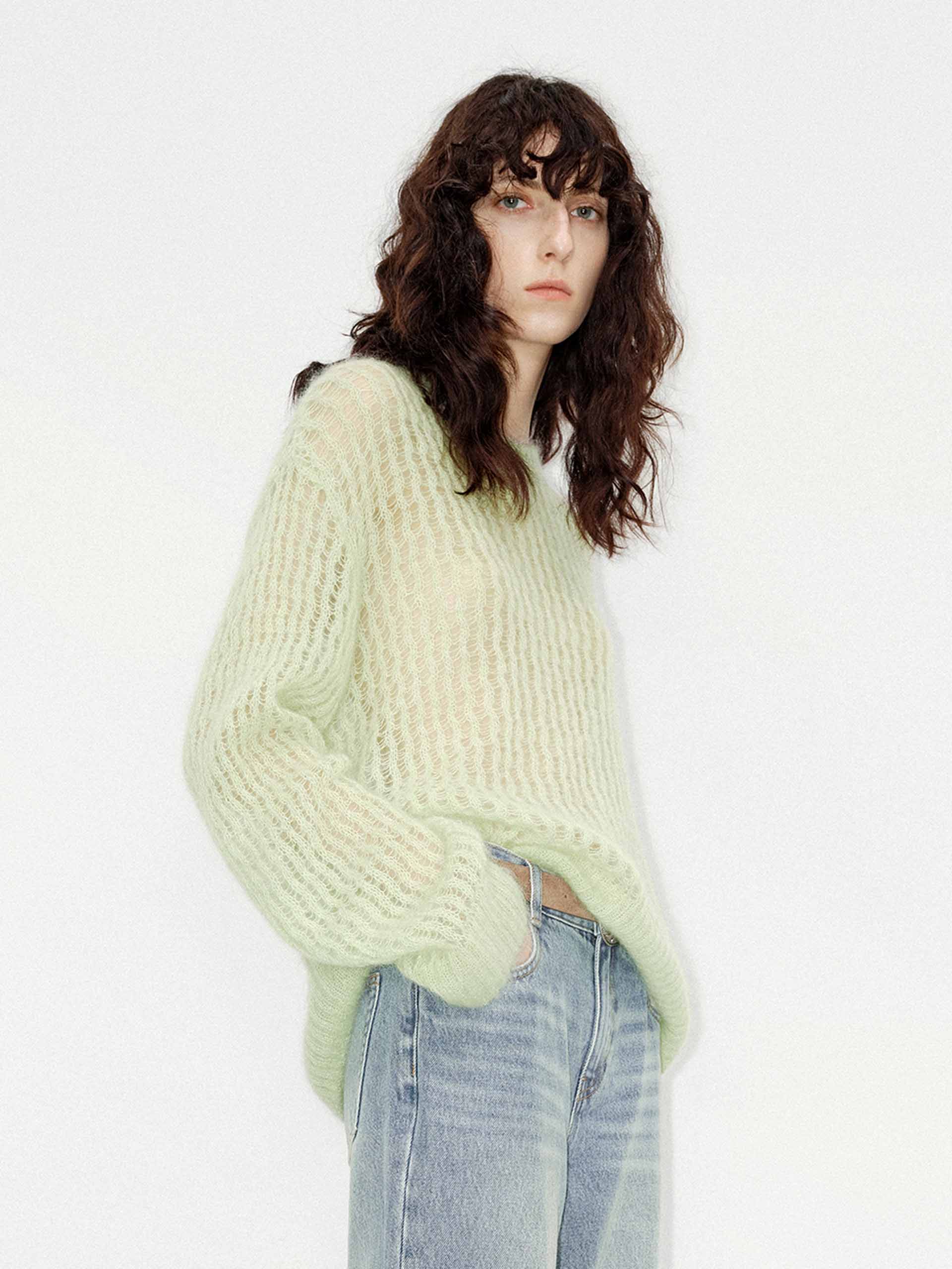 Expertly crafted from a soft blend of mohair, wool, and other fibers, this sweater offers luxurious comfort and eye-catching style. Features a loose shape and drop shoulder design, while the crochet knit and sheer details add a chic.