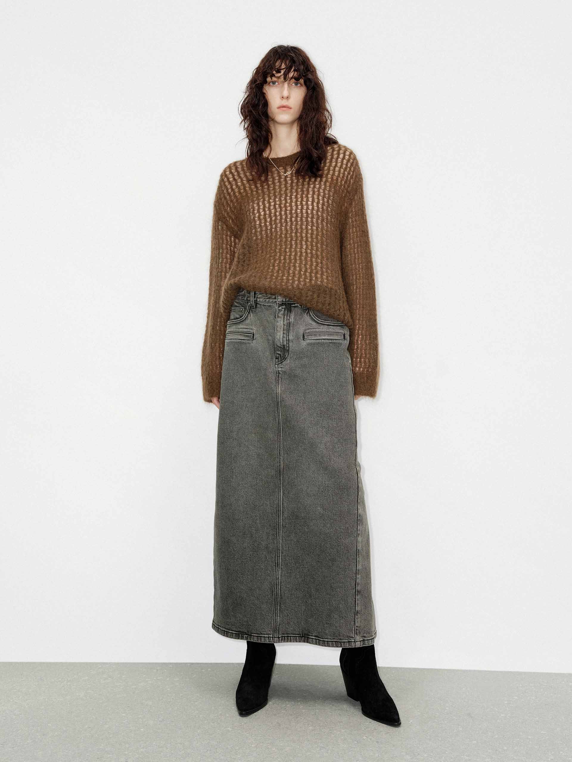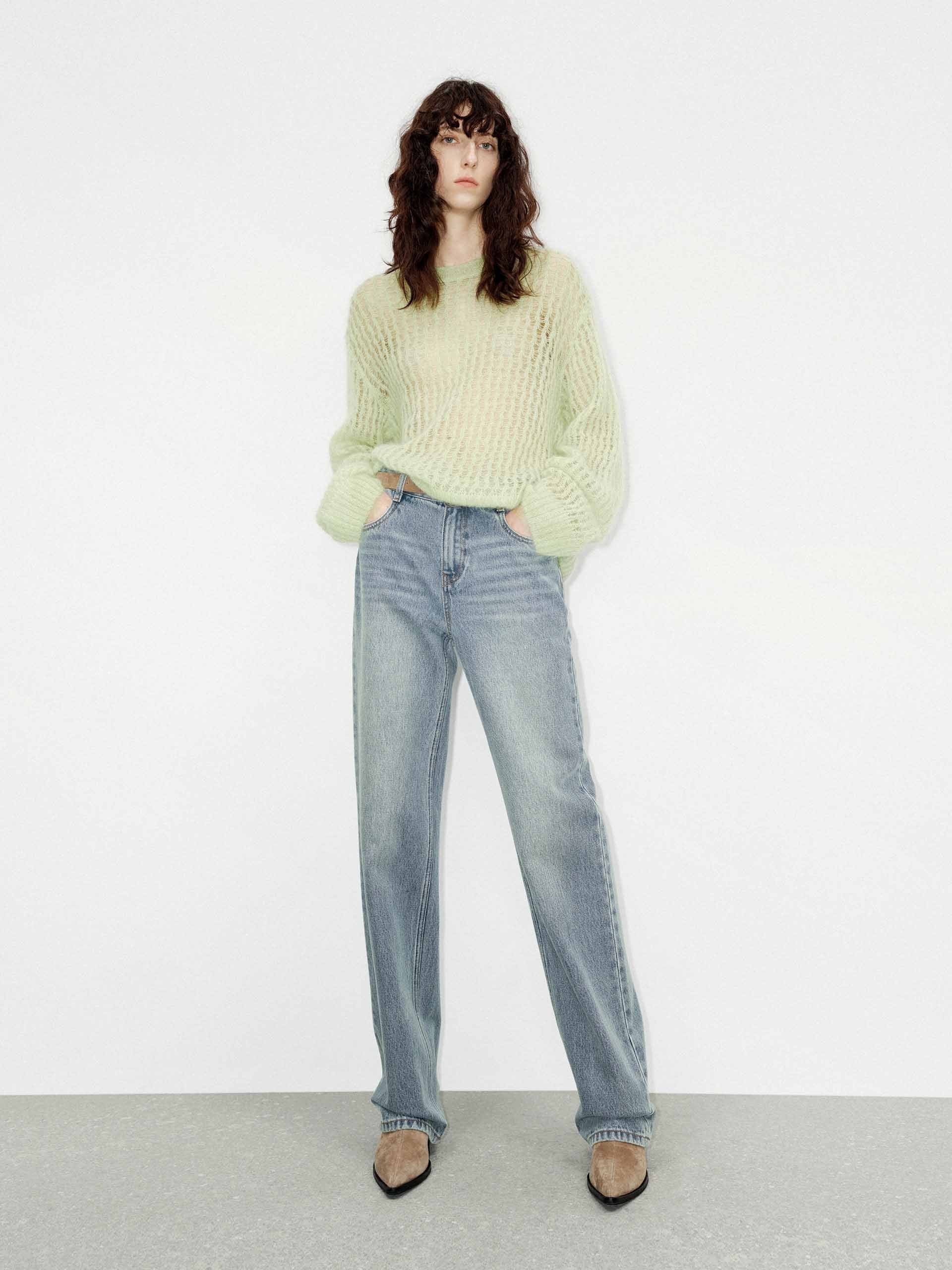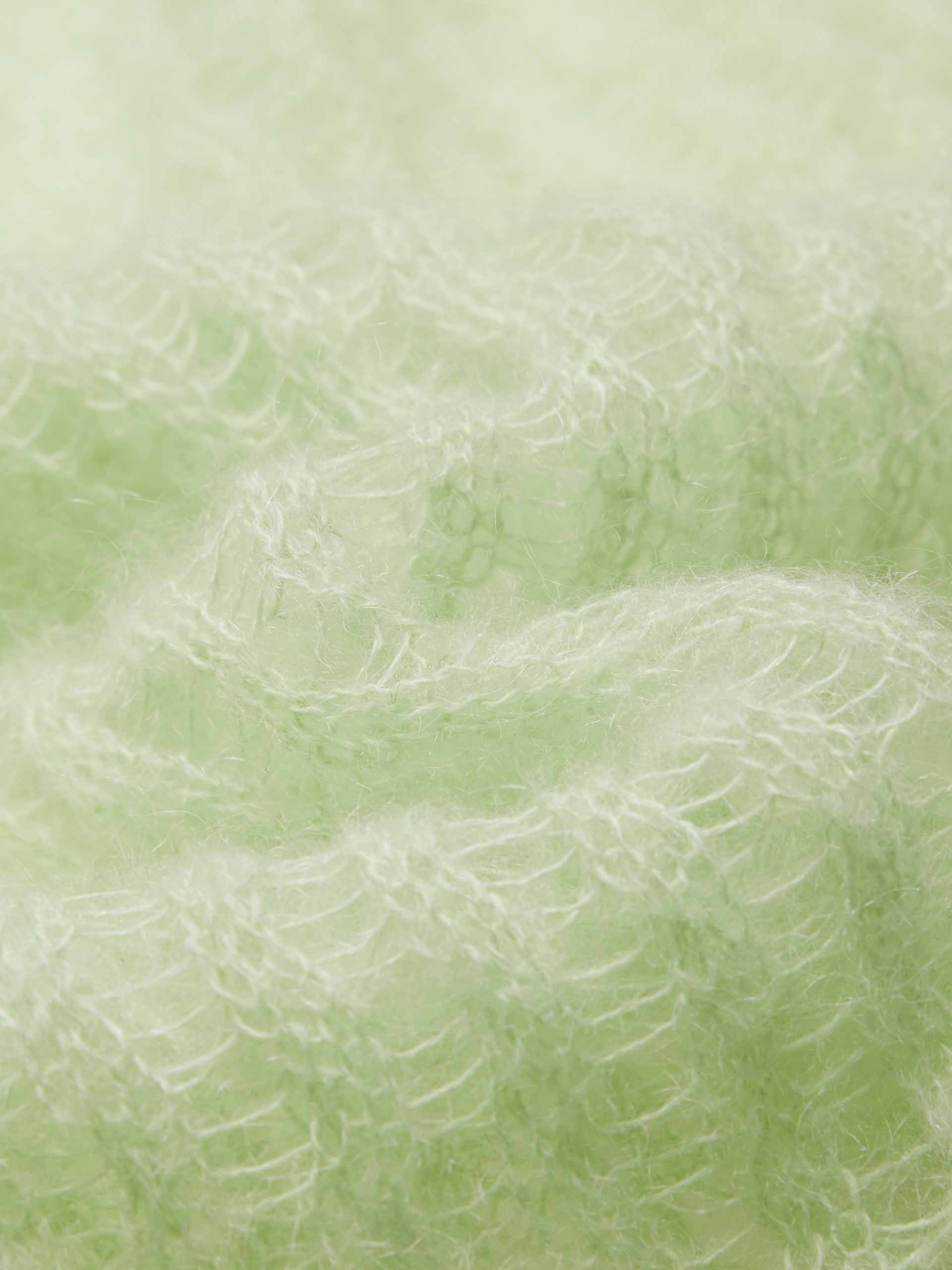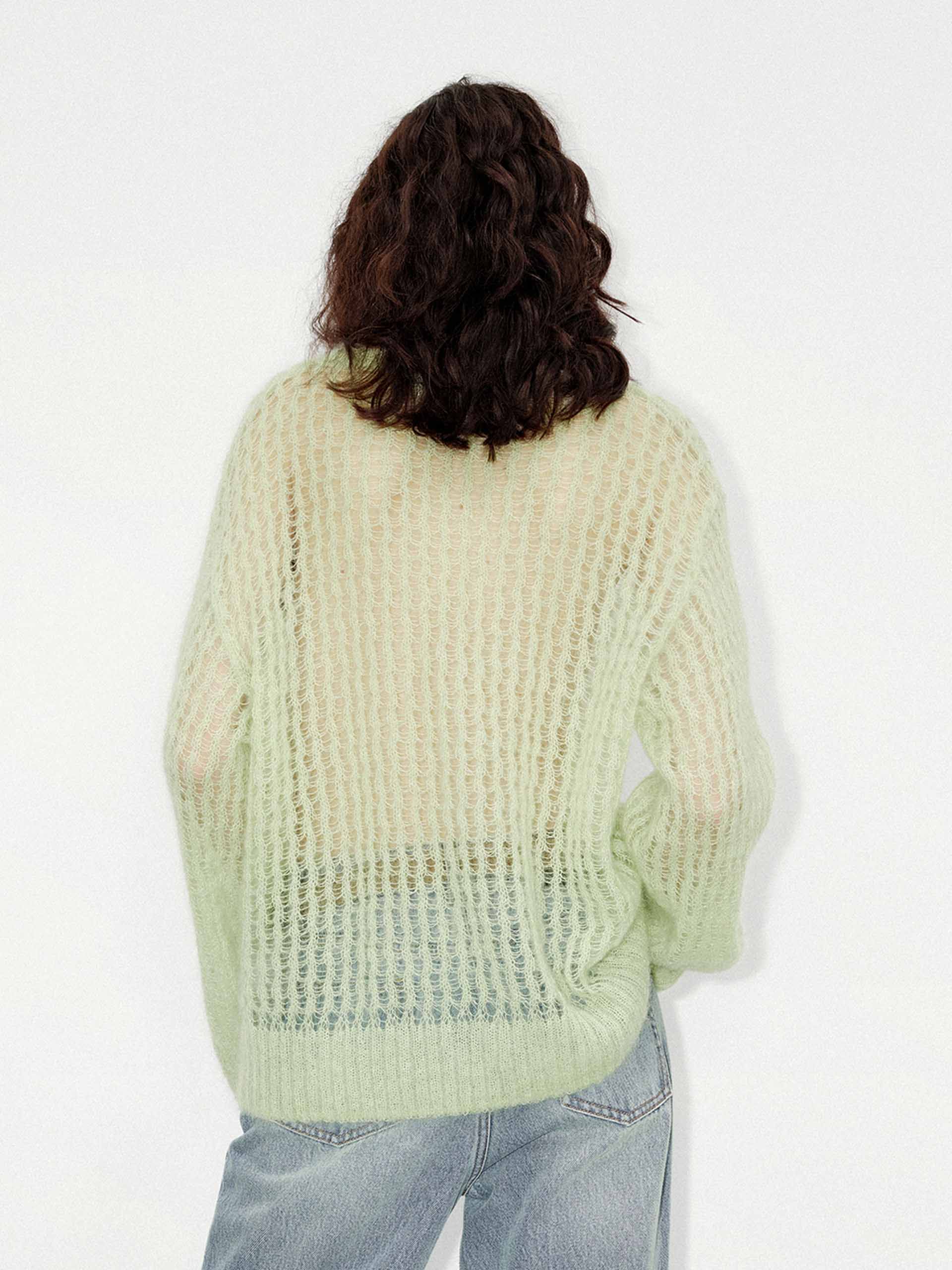 Expertly crafted from a soft blend of mohair, wool, and other fibers, this sweater offers luxurious comfort and eye-catching style. Features a loose shape and drop shoulder design, while the crochet knit and sheer details add a chic.