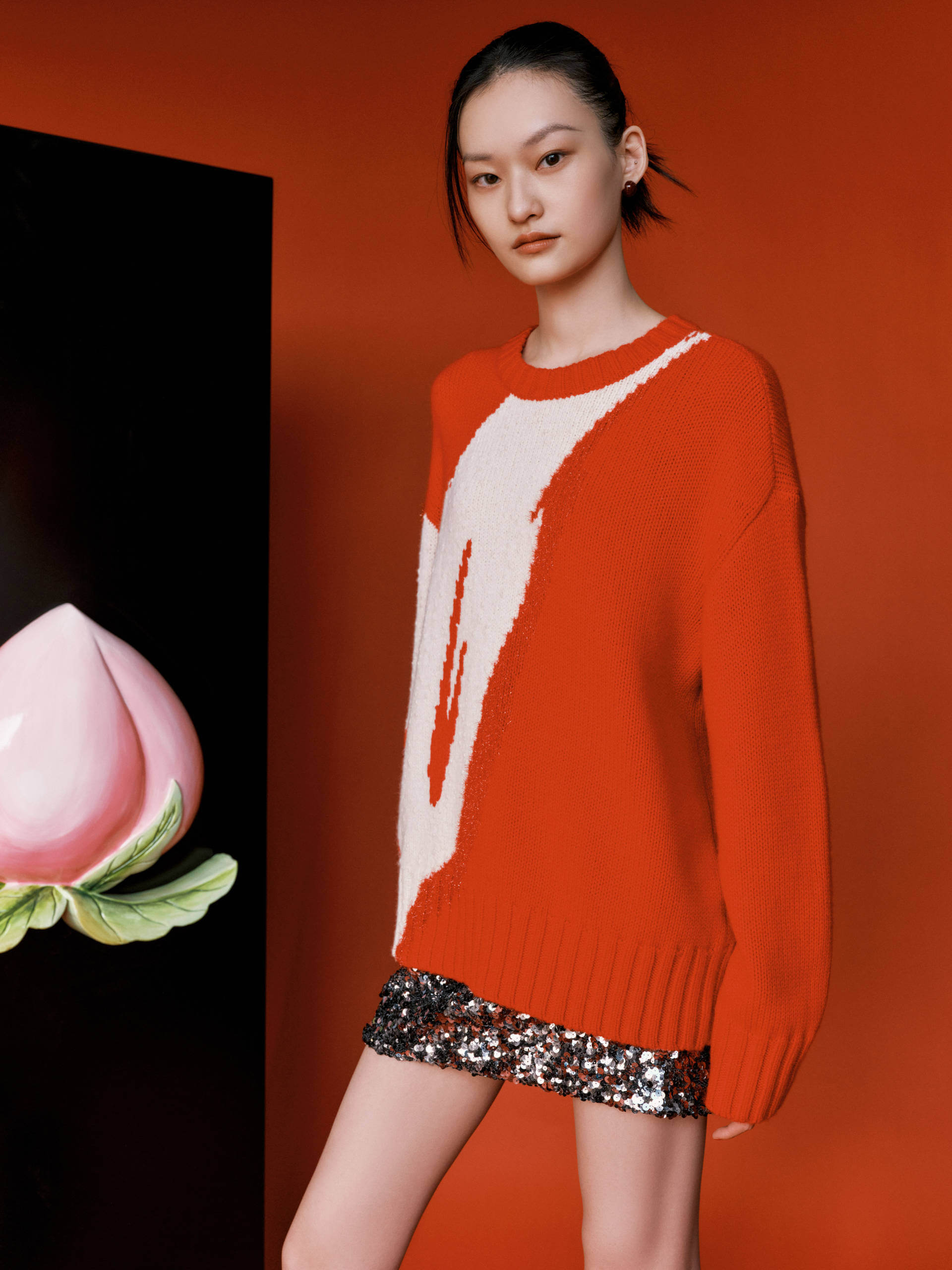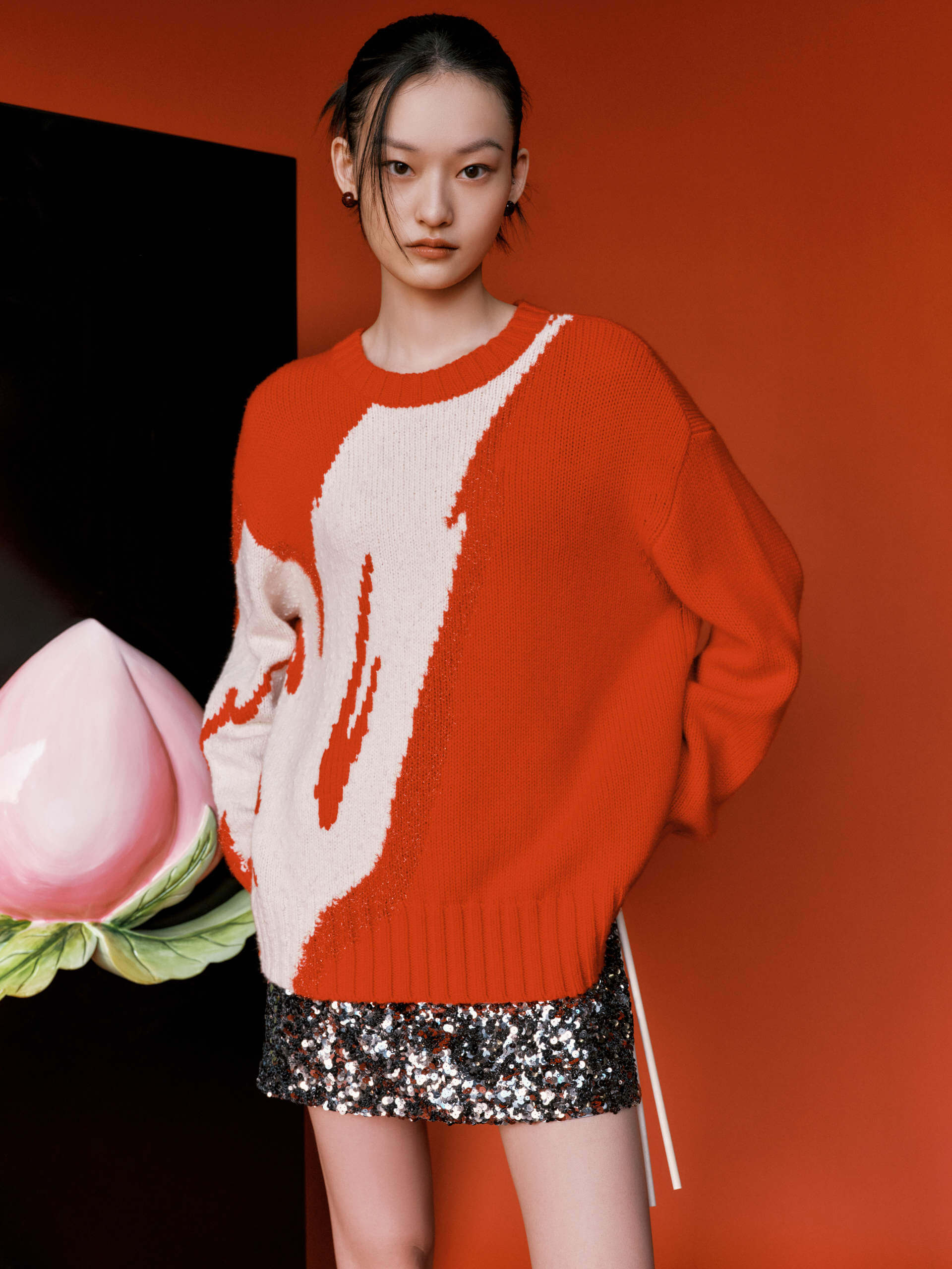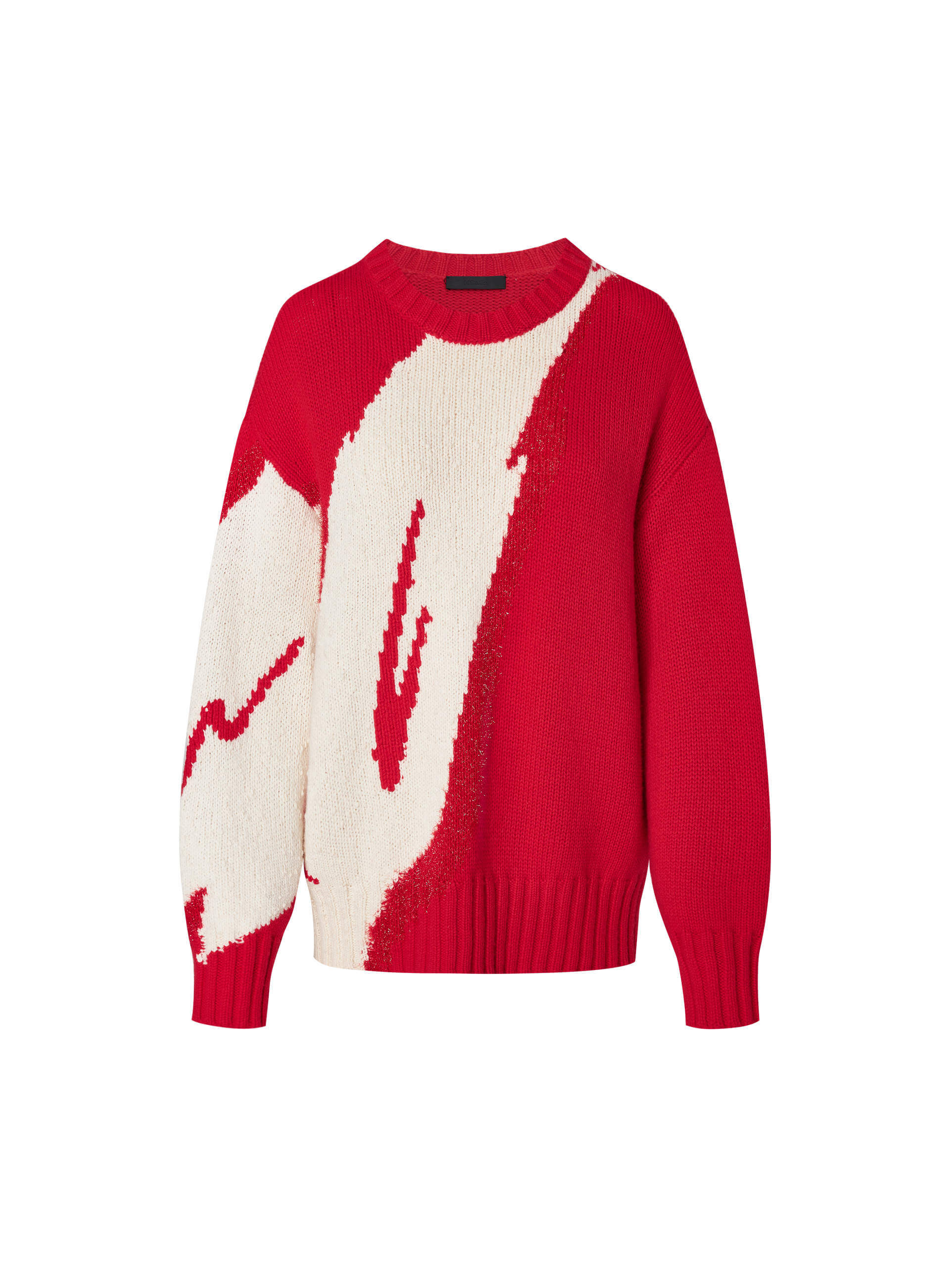 Made with luxurious merino wool, this sweater features a striking wing pattern and a relaxed fit. The bold red hue pairs perfectly with a sequin min skirt for a unique and effortless look.