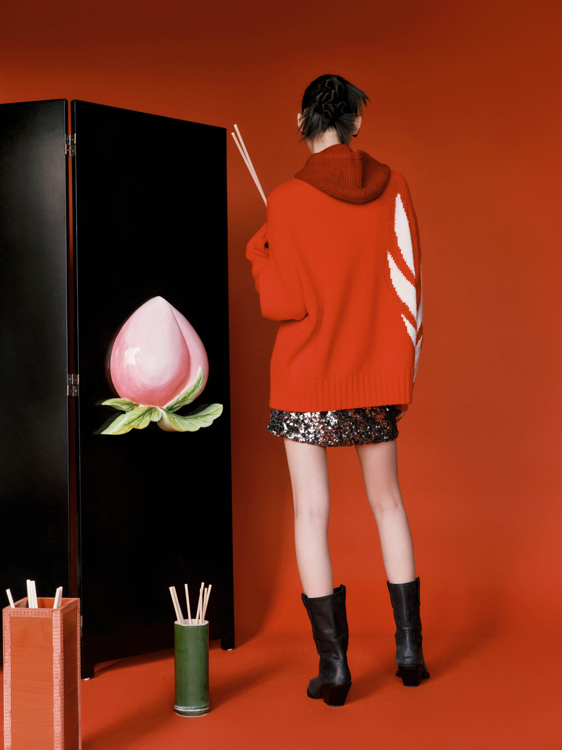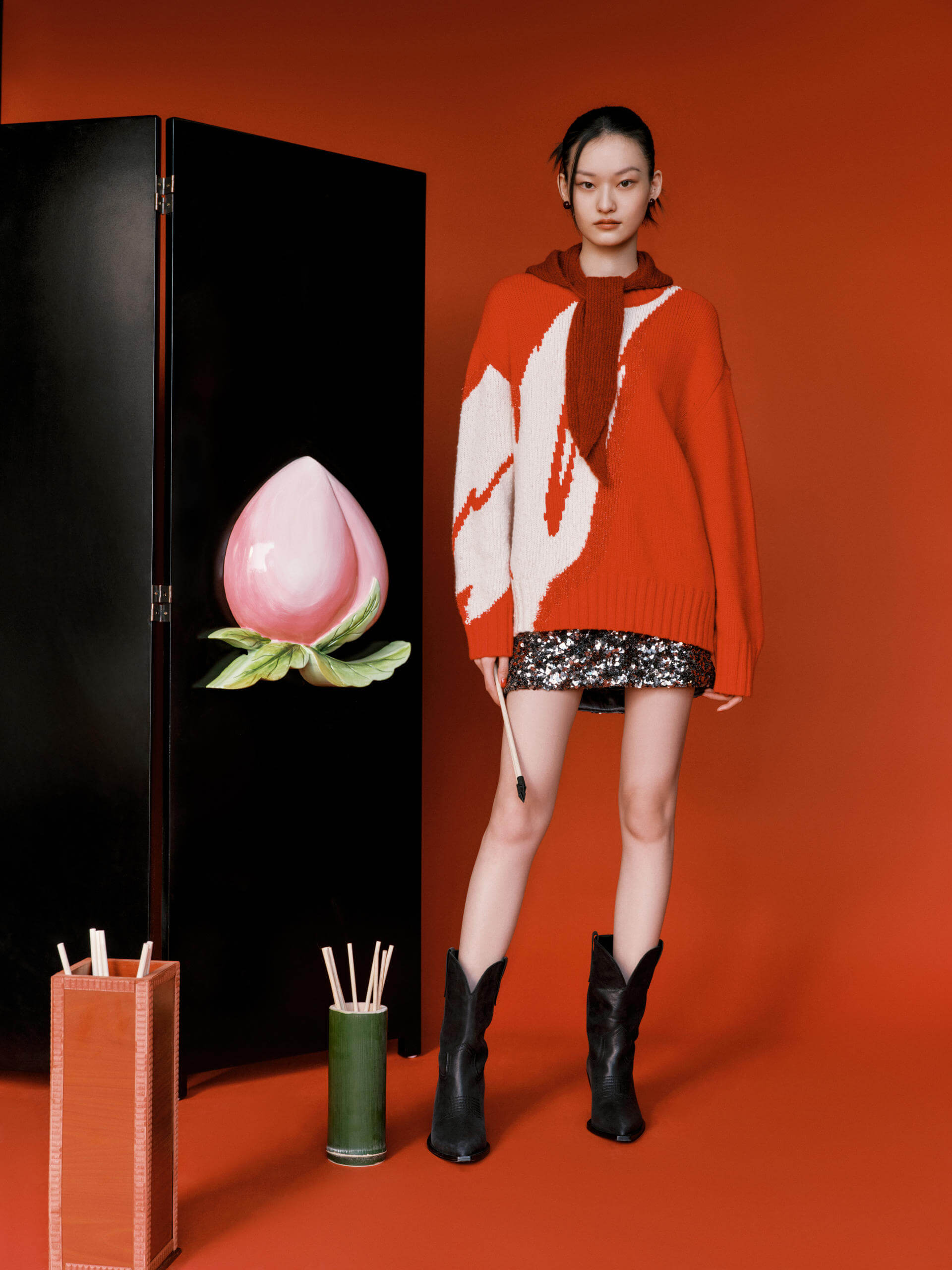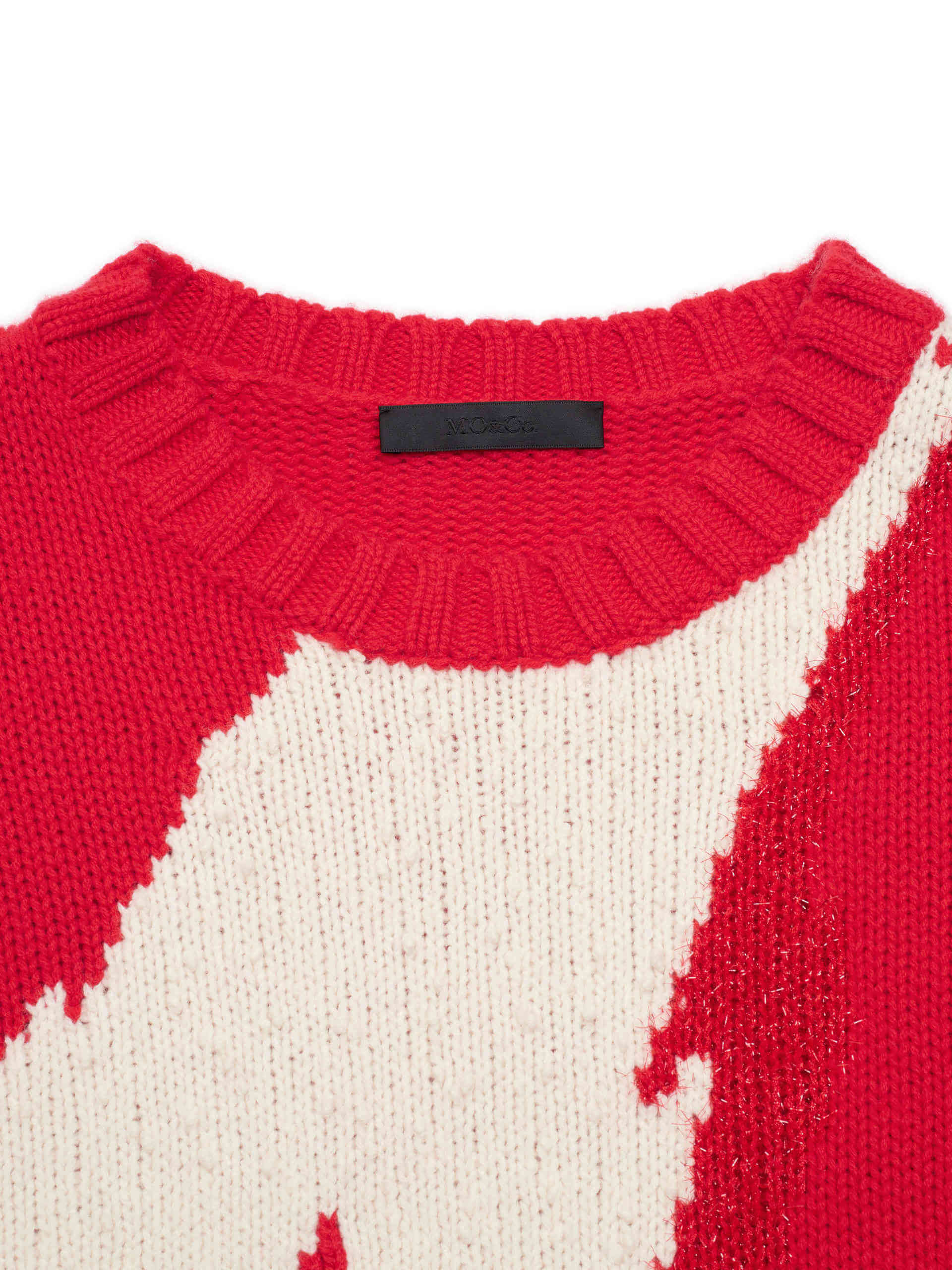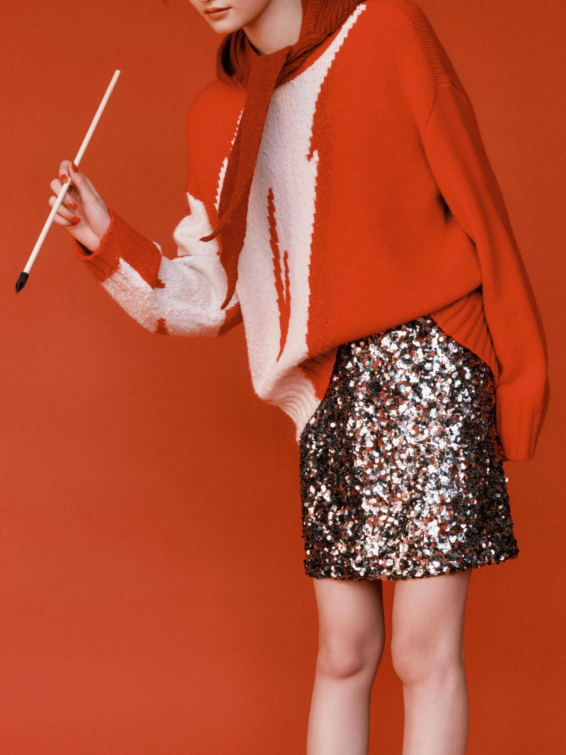 Made with luxurious merino wool, this sweater features a striking wing pattern and a relaxed fit. The bold red hue pairs perfectly with a sequin min skirt for a unique and effortless look.