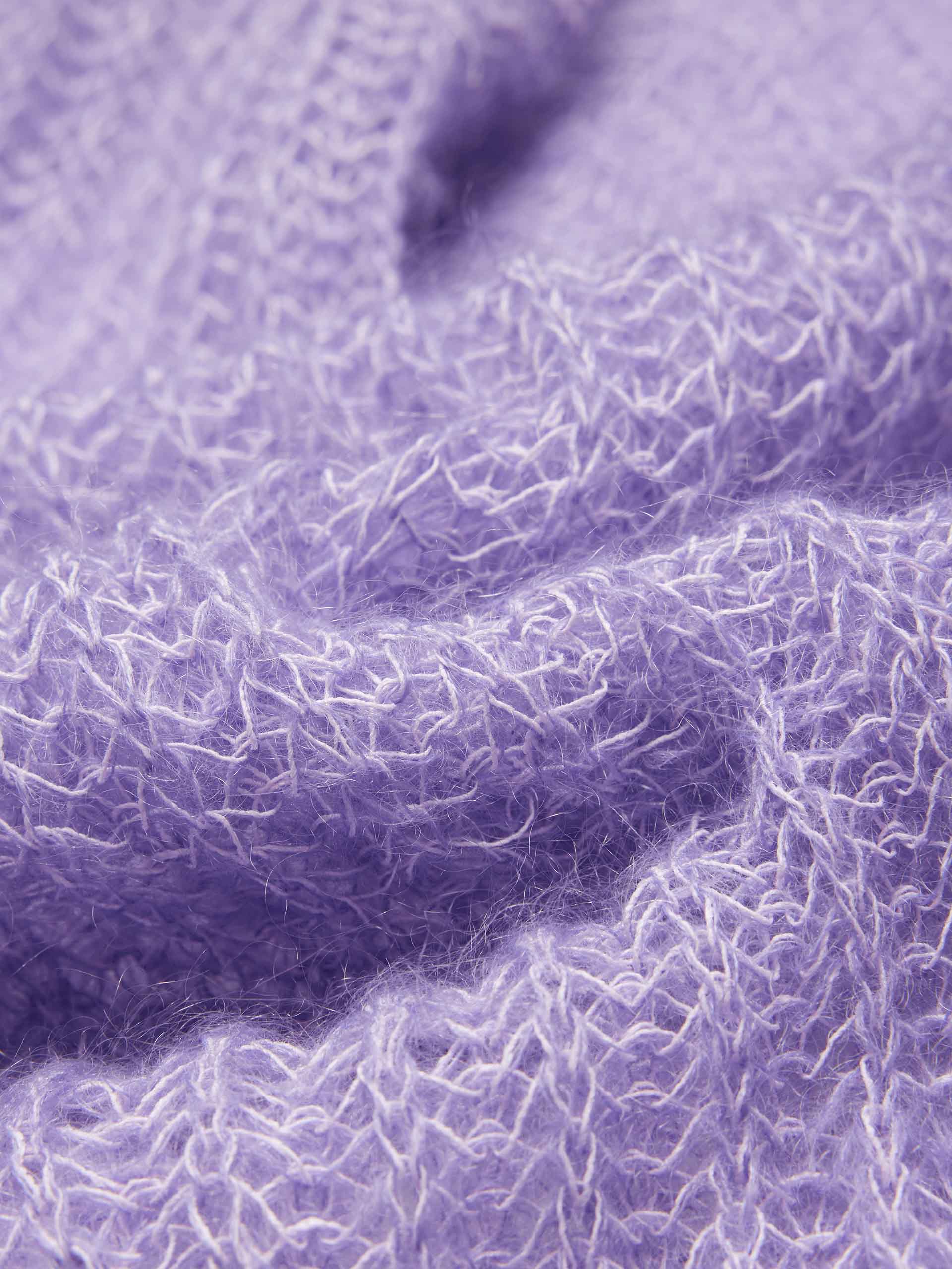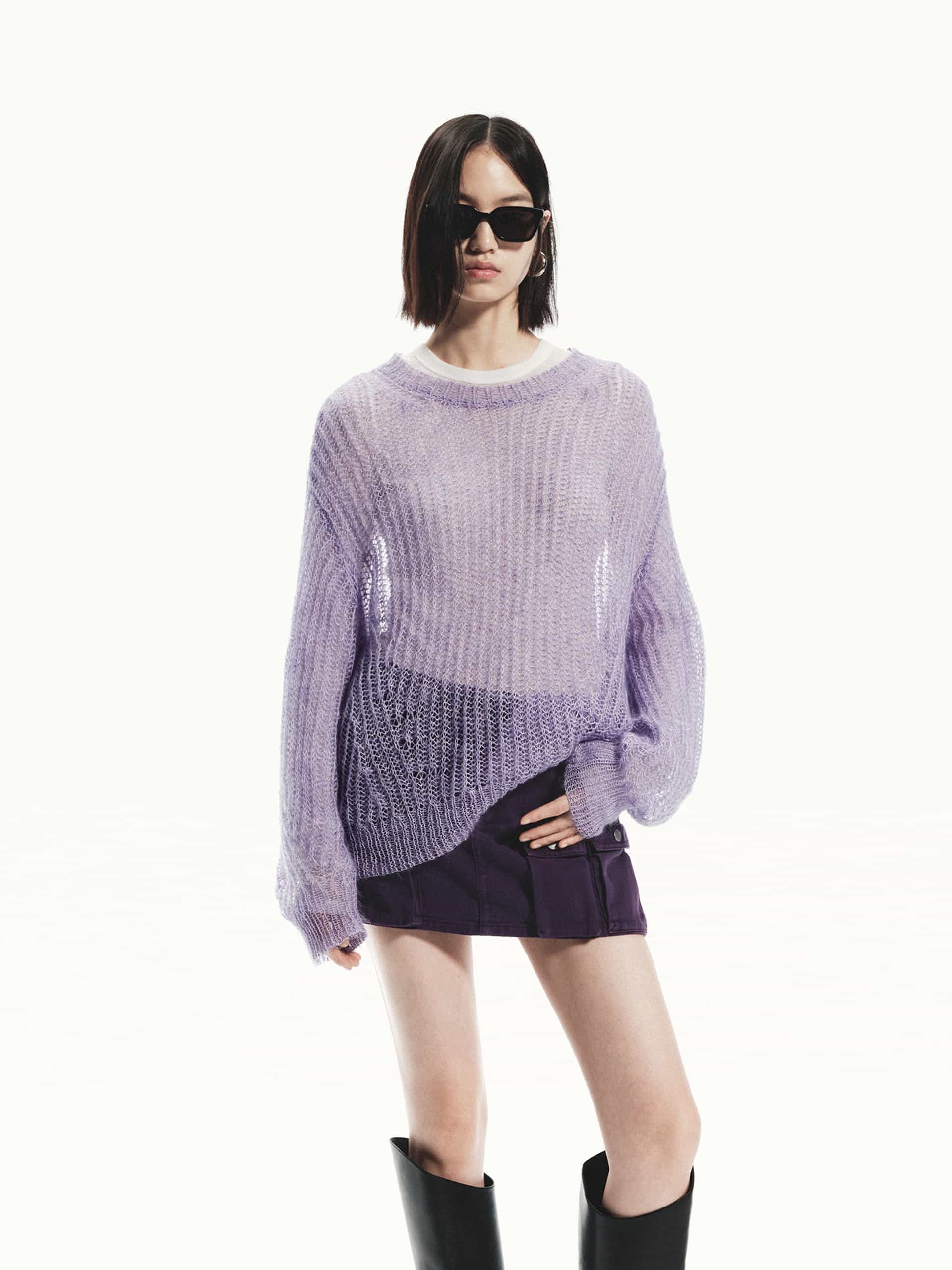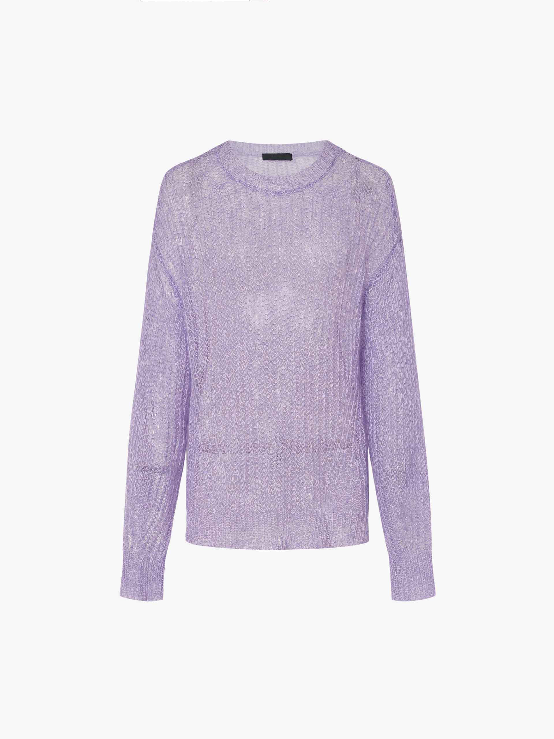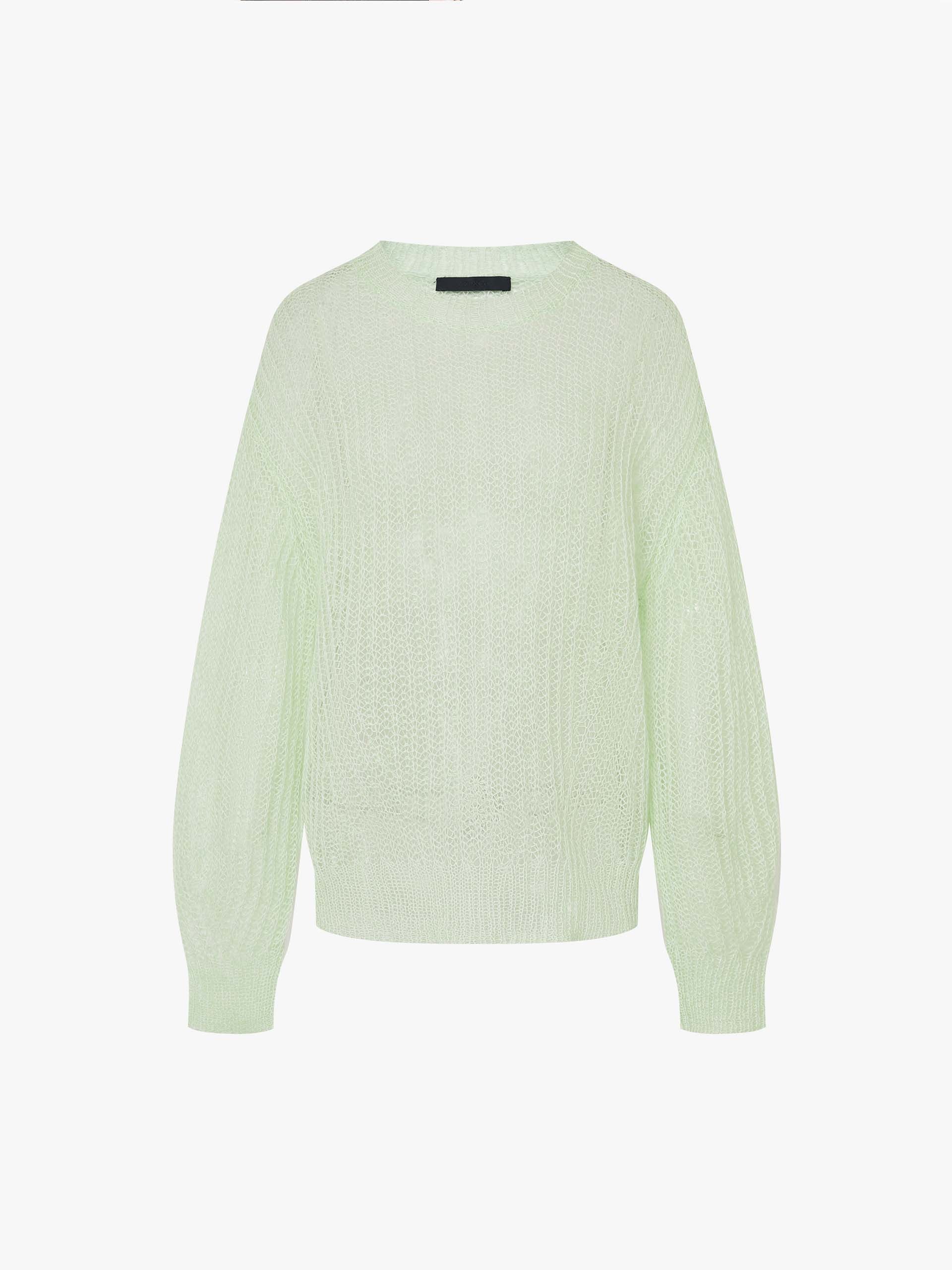 This sweater is crafted with a mohair and wool blend, providing a soft and lightweight feel. The crochet knit design creates a sheer effect, adding a touch of elegance to this cozy piece. Pair with a tank top for a layered look.