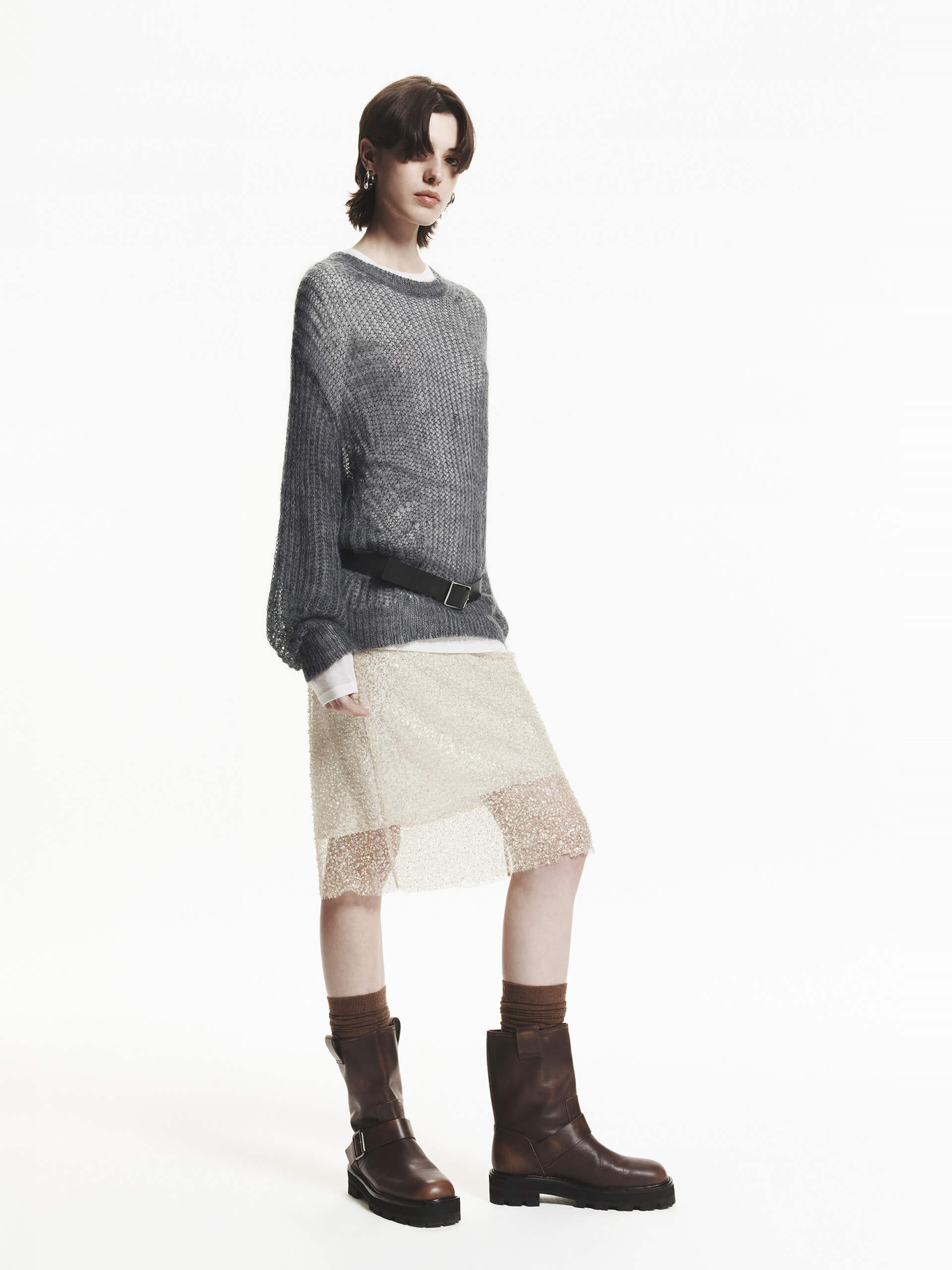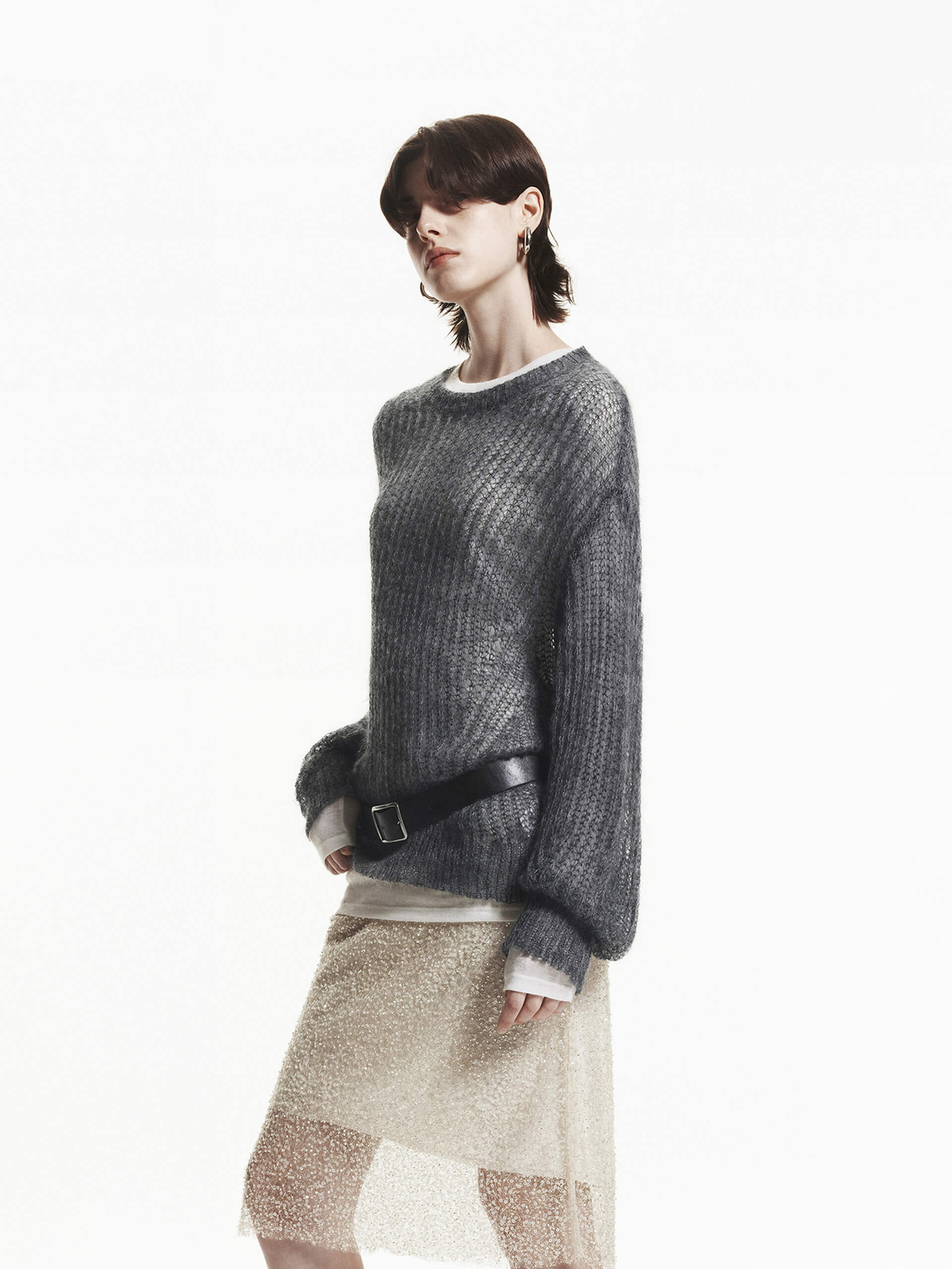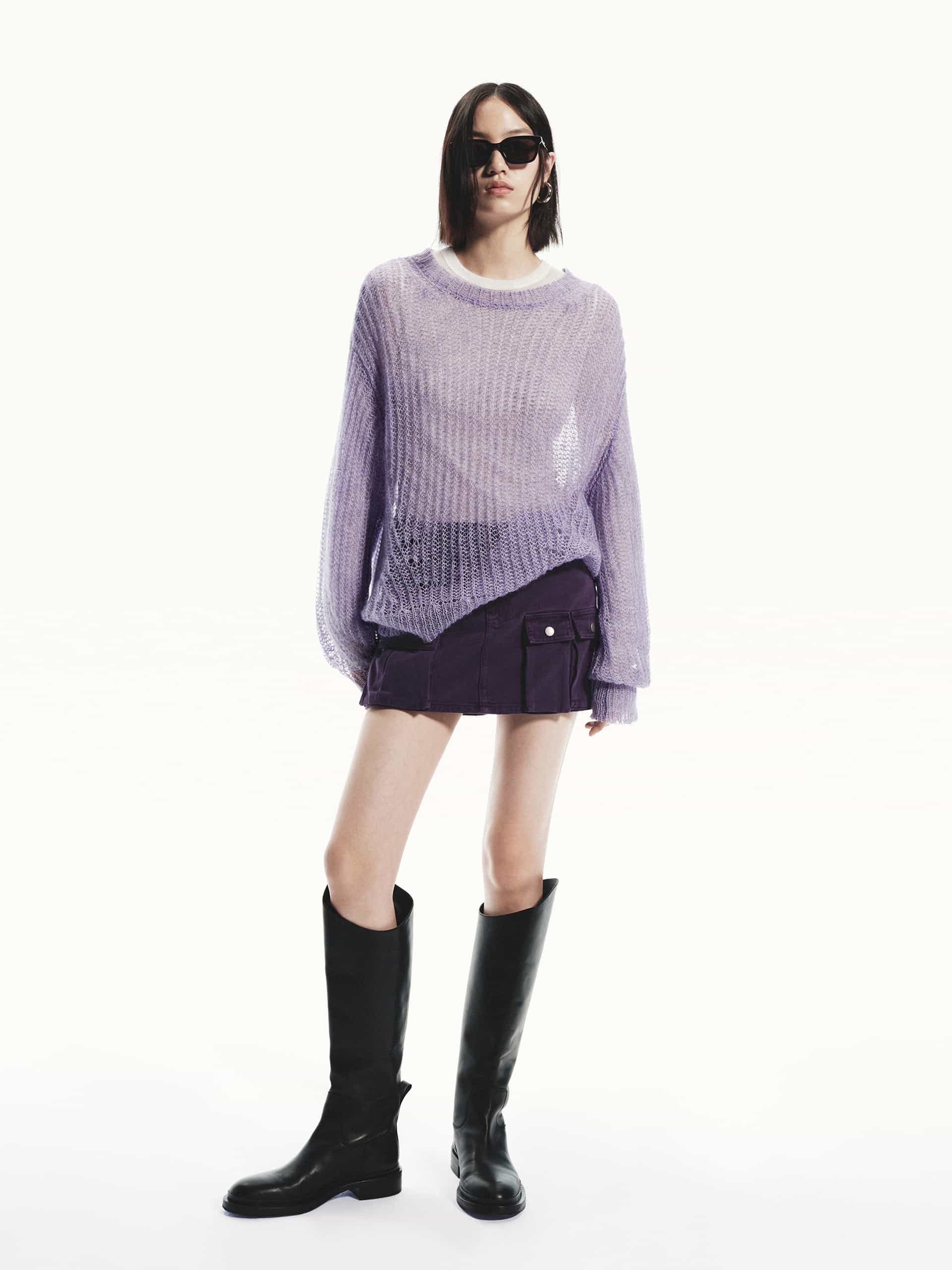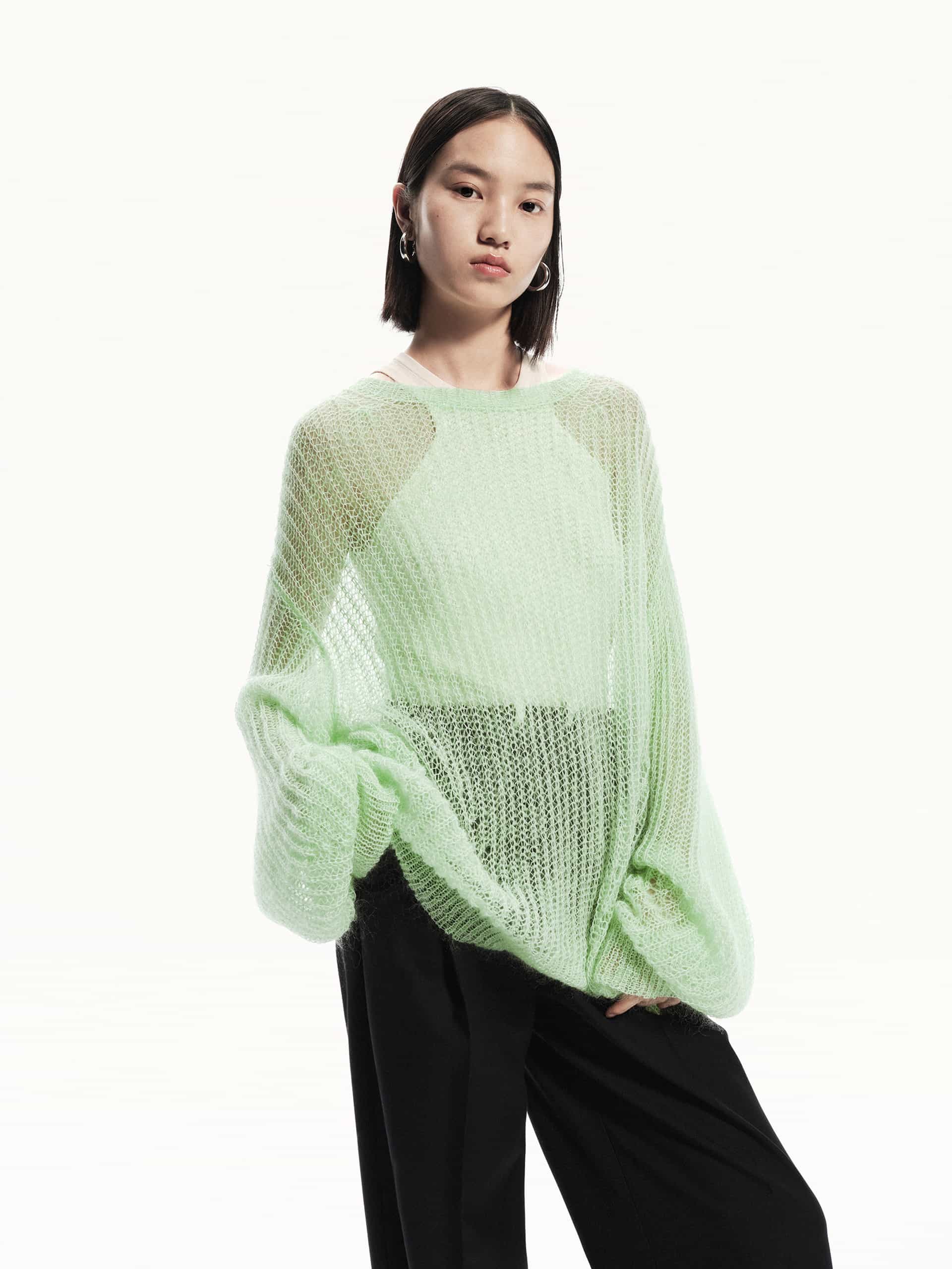 This sweater is crafted with a mohair and wool blend, providing a soft and lightweight feel. The crochet knit design creates a sheer effect, adding a touch of elegance to this cozy piece. Pair with a tank top for a layered look.