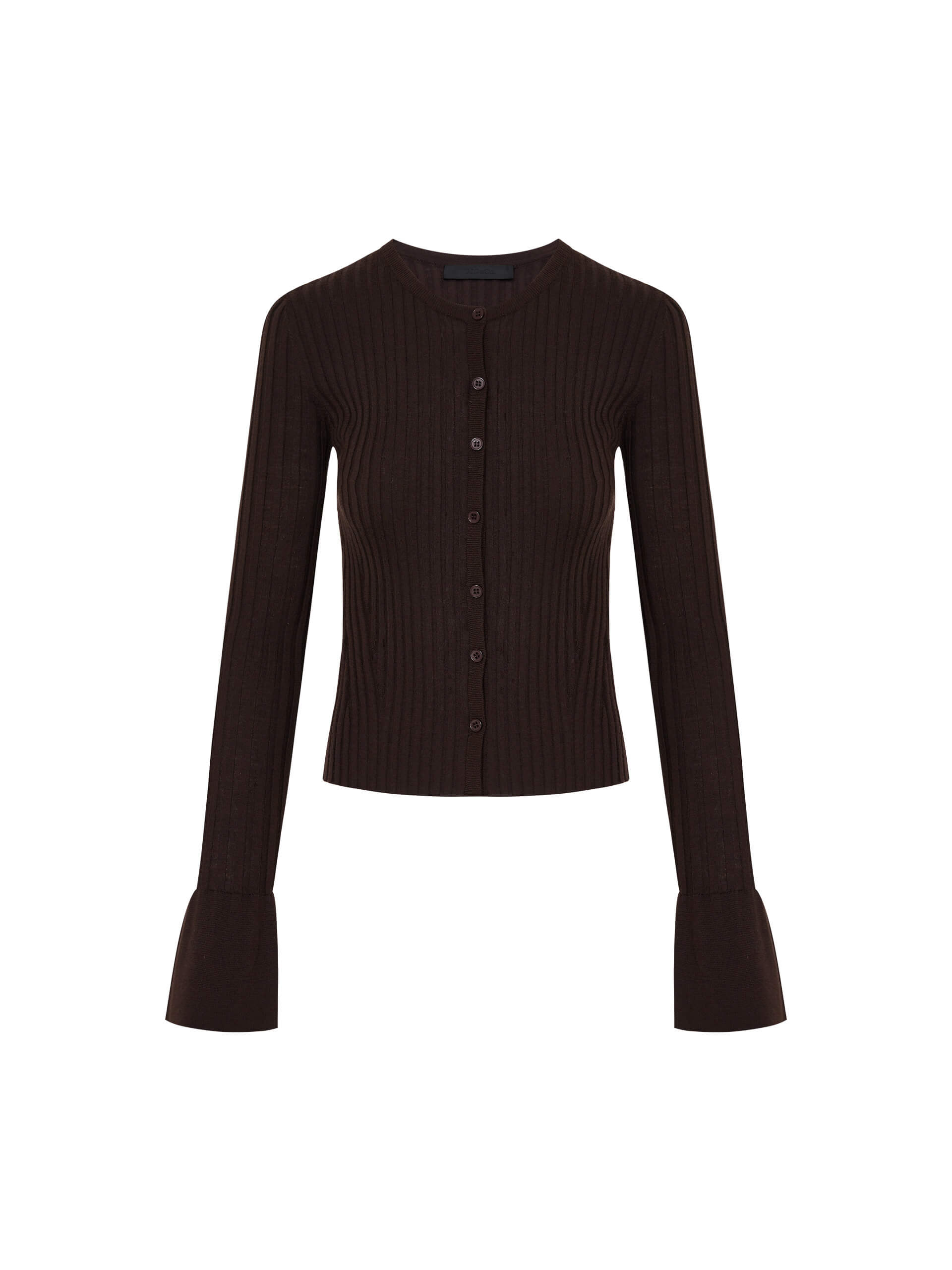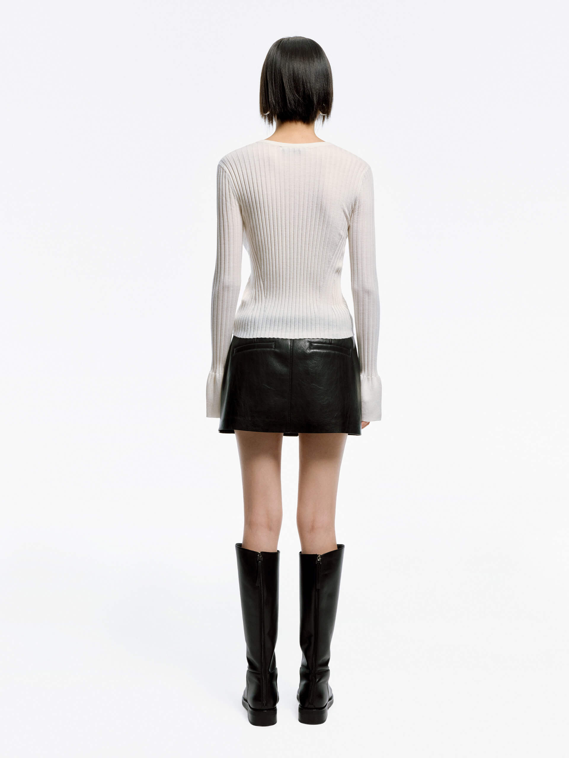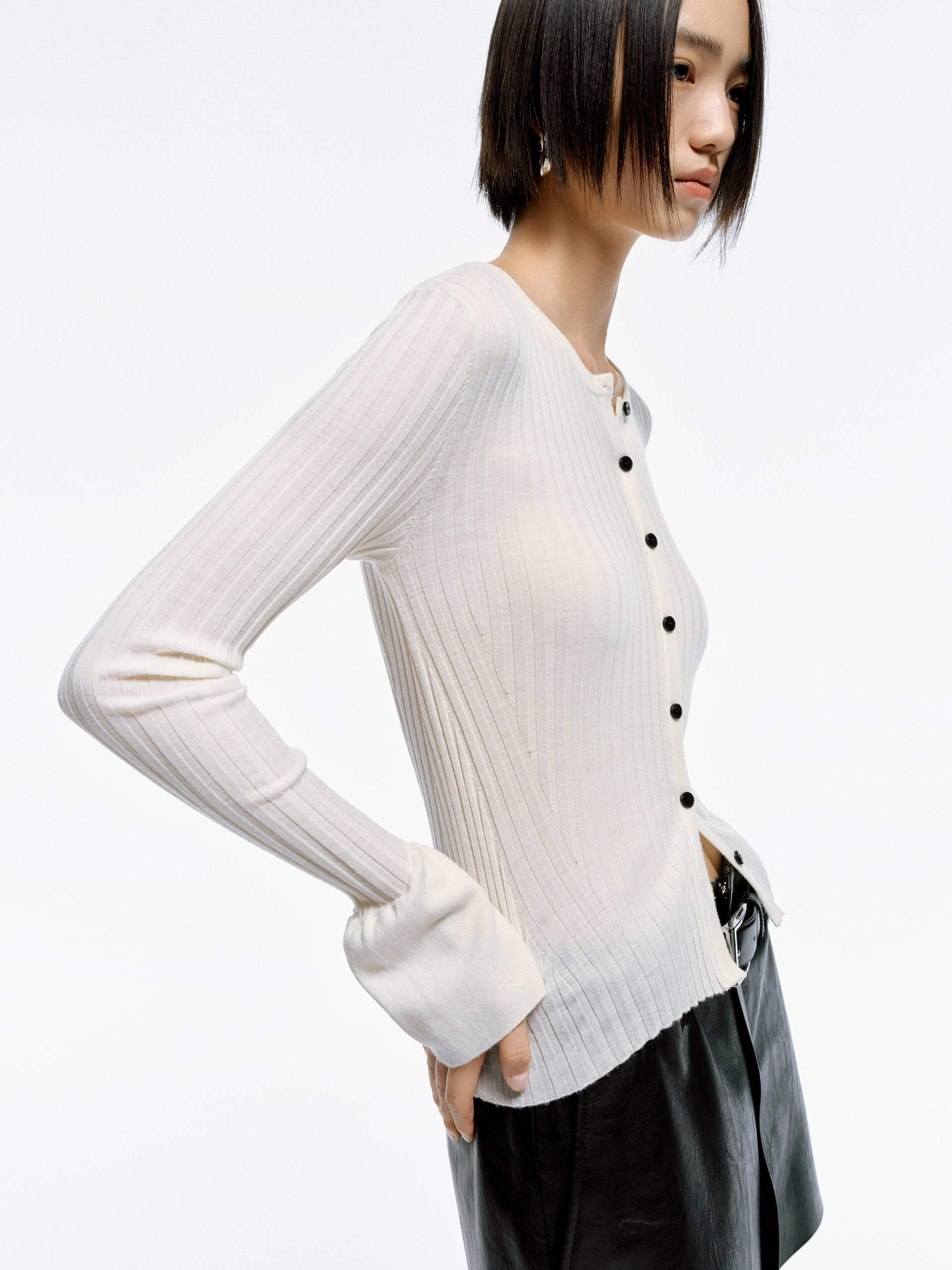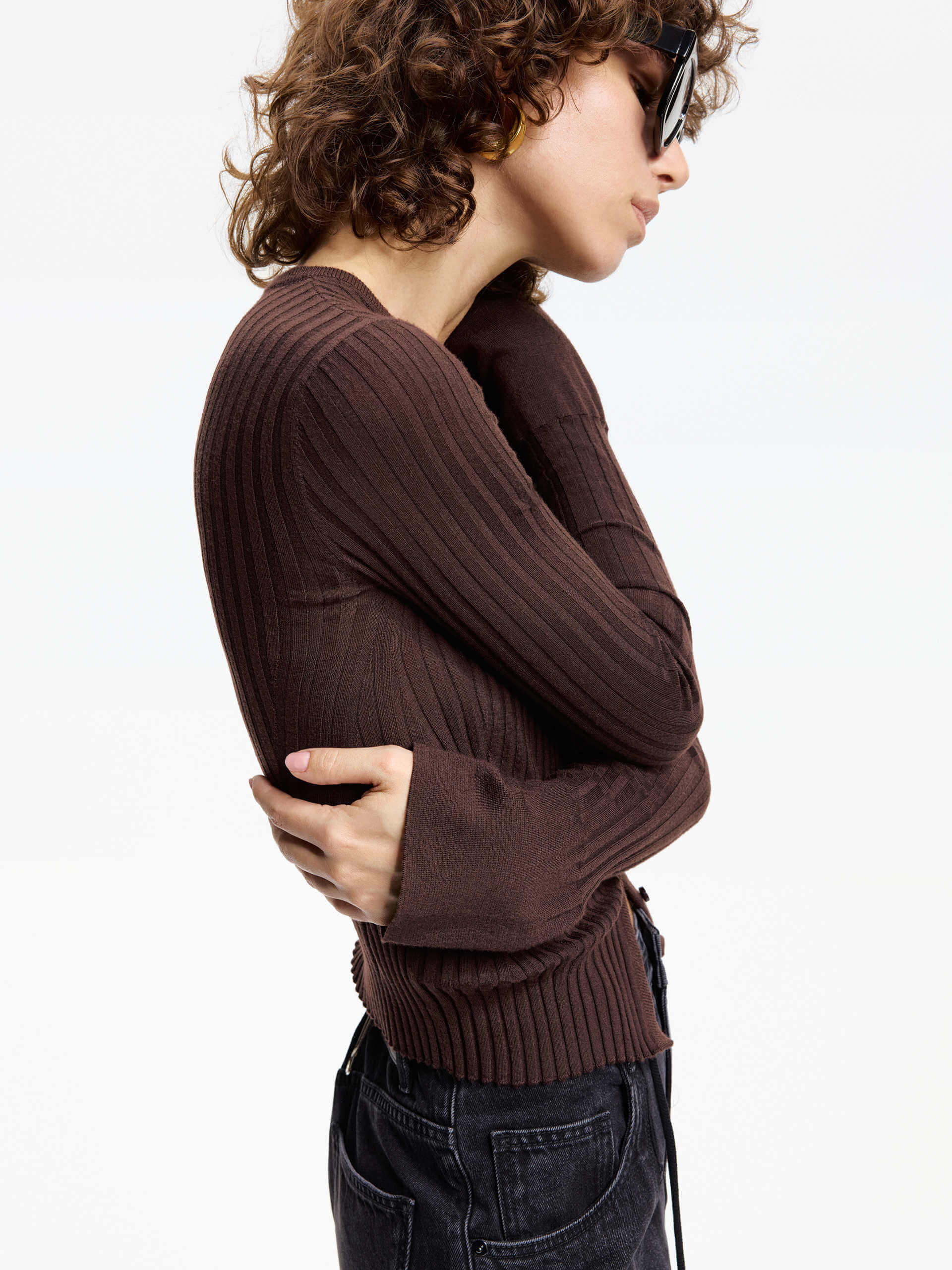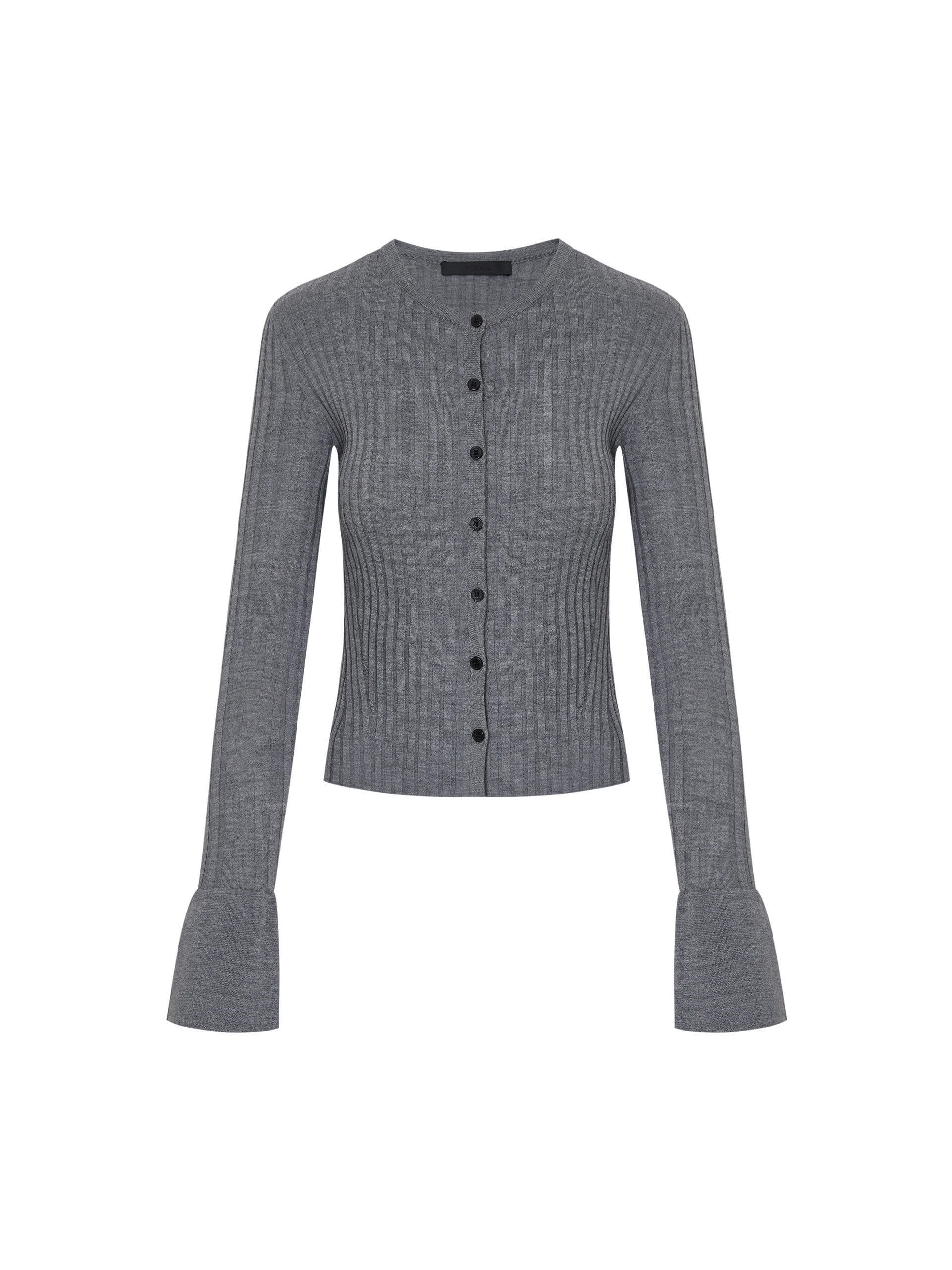 Indulge in the luxurious comfort of our sweater, crafted from pure, soft wool. Its slimming ribbed design features a round neckline, delicate trumpet cuffs, and decorative buttons. Available in multiple colors to suit your style.