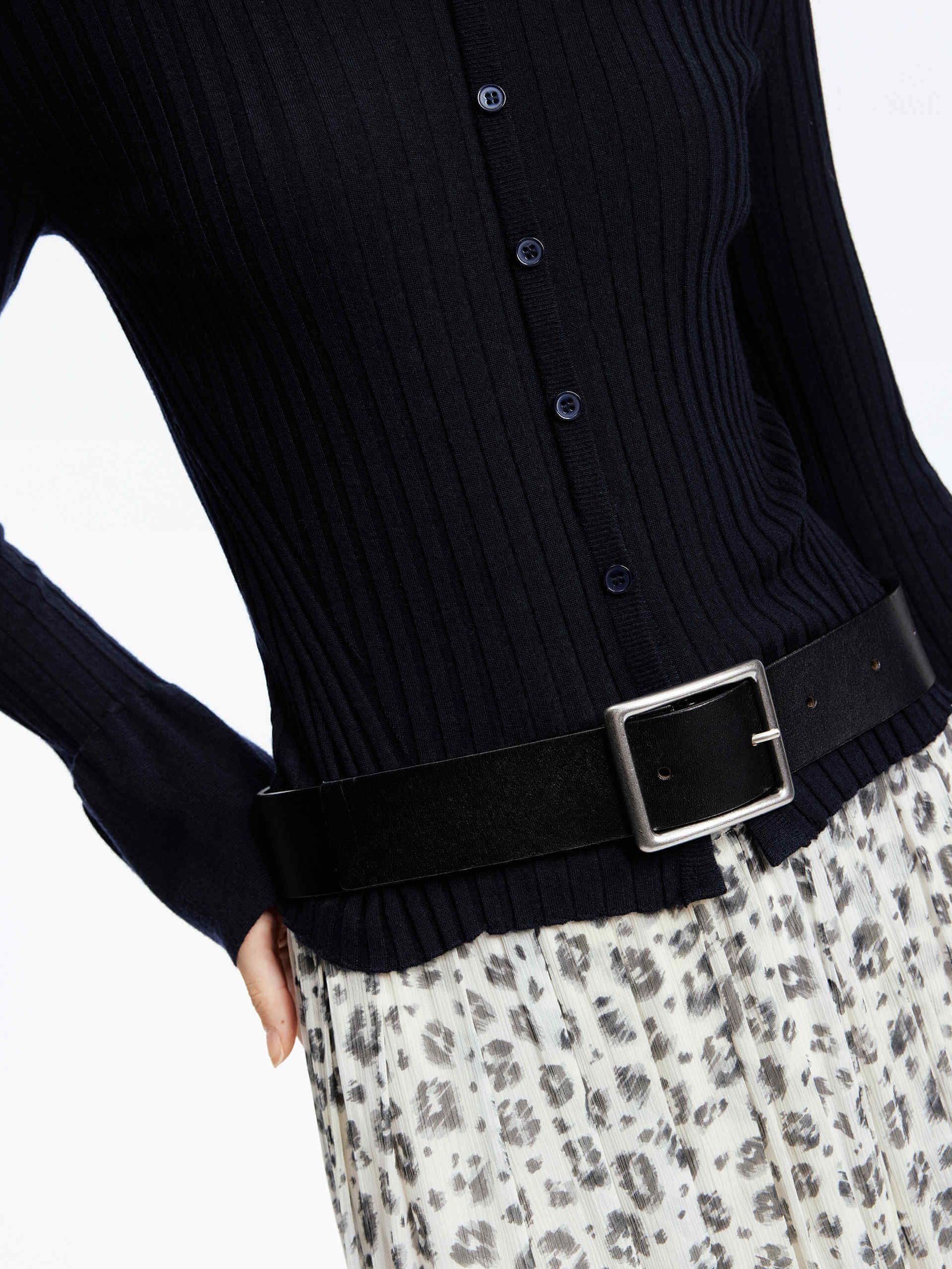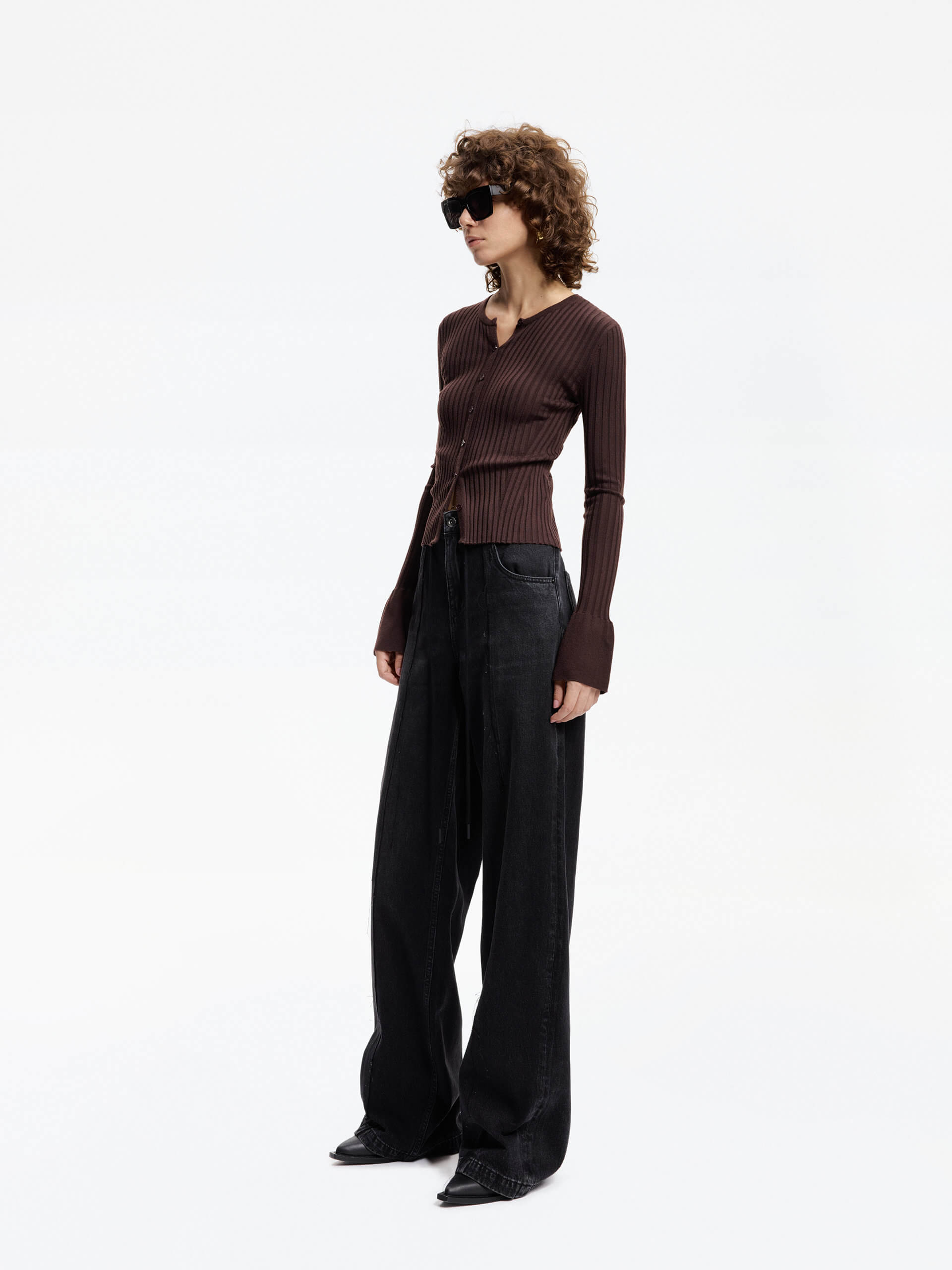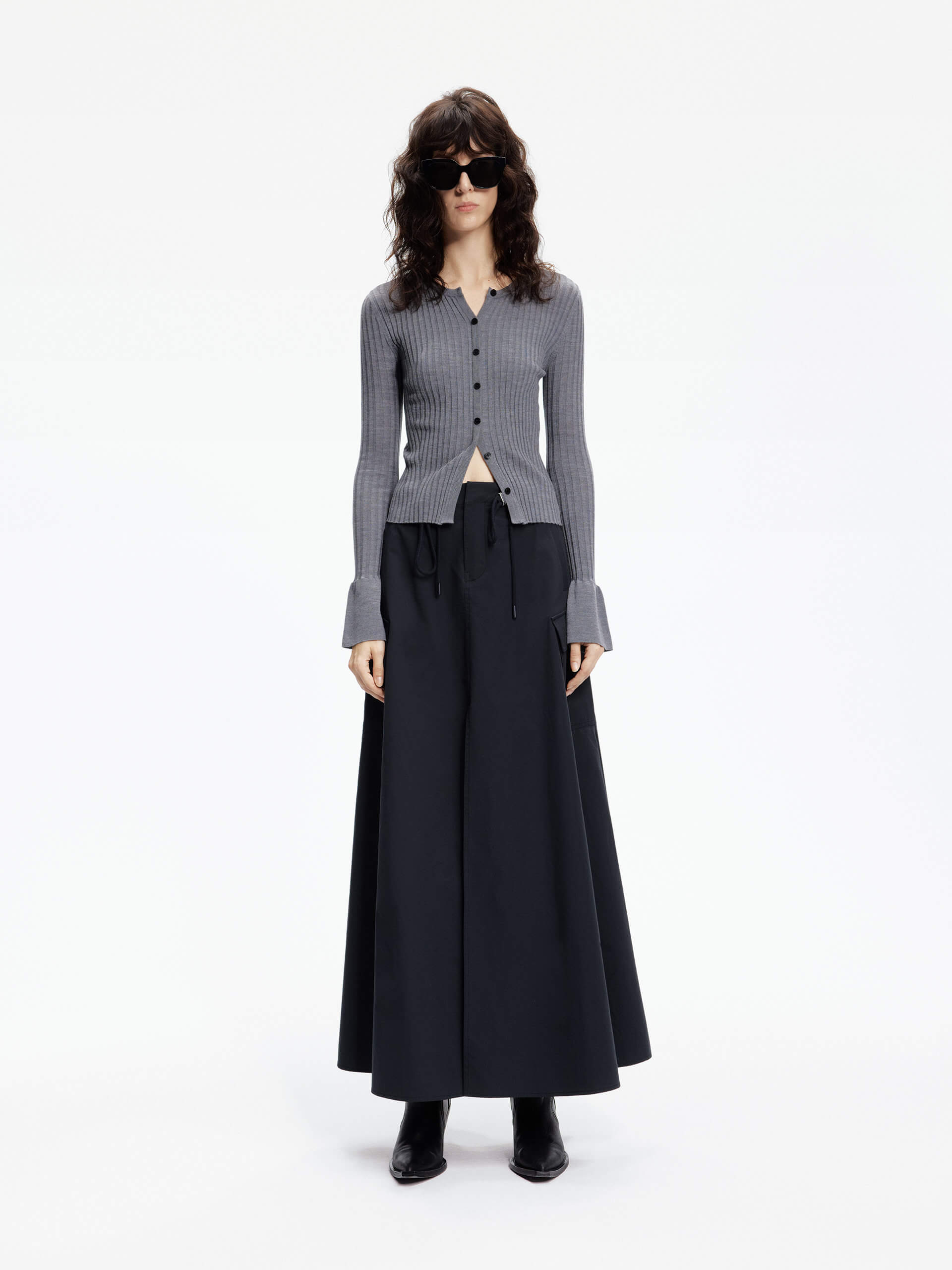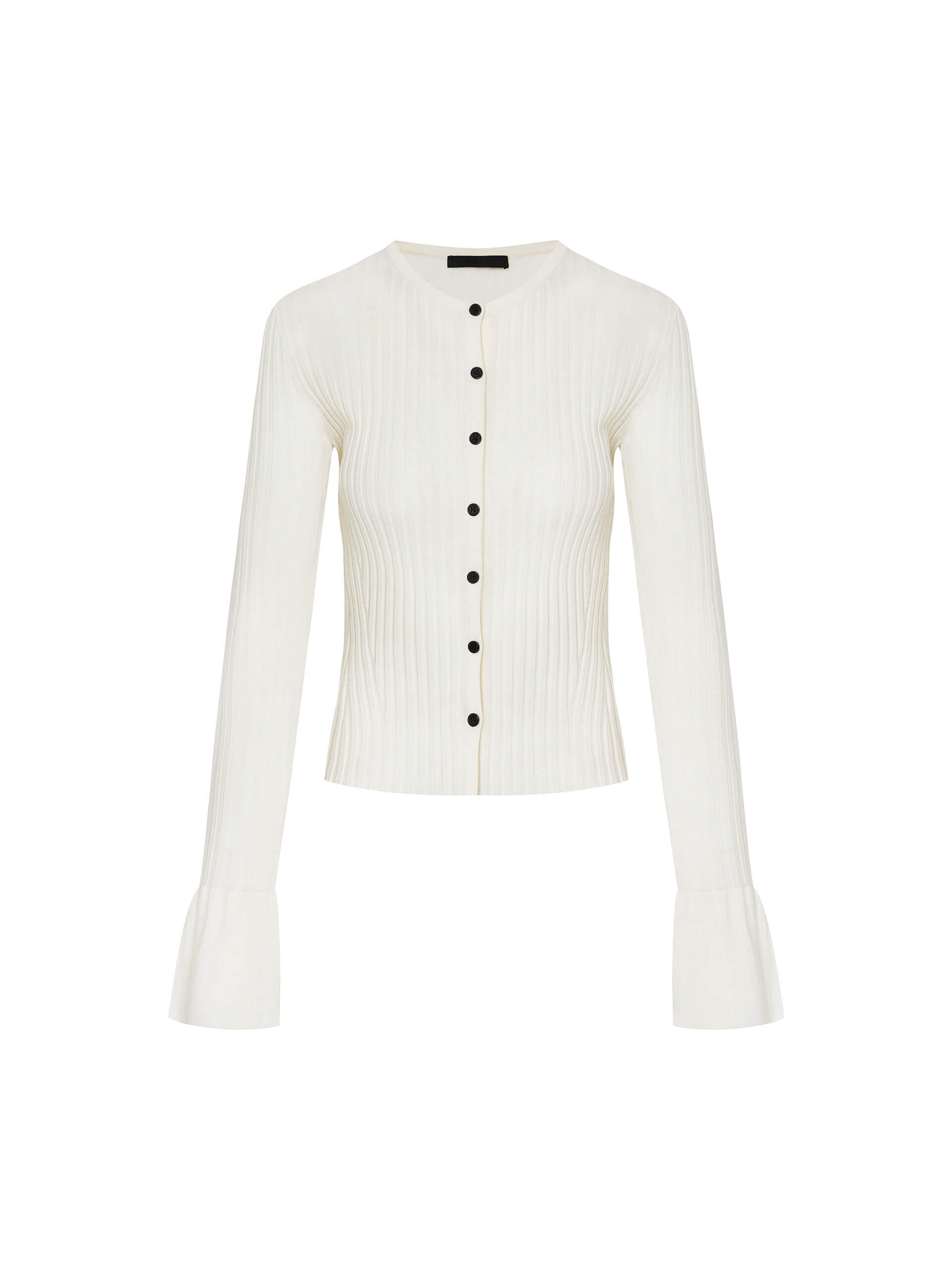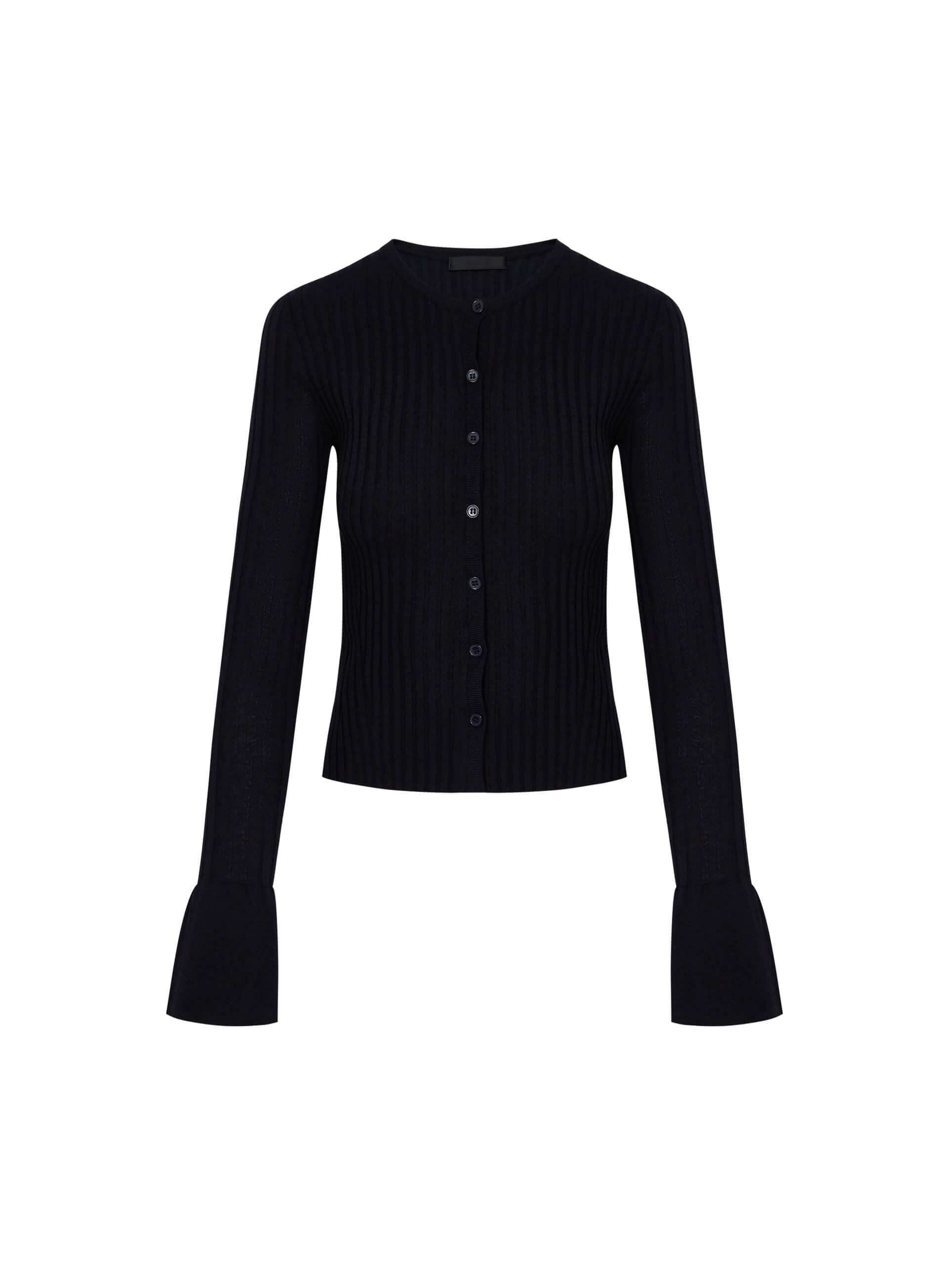Indulge in the luxurious comfort of our sweater, crafted from pure, soft wool. Its slimming ribbed design features a round neckline, delicate trumpet cuffs, and decorative buttons. Available in multiple colors to suit your style.