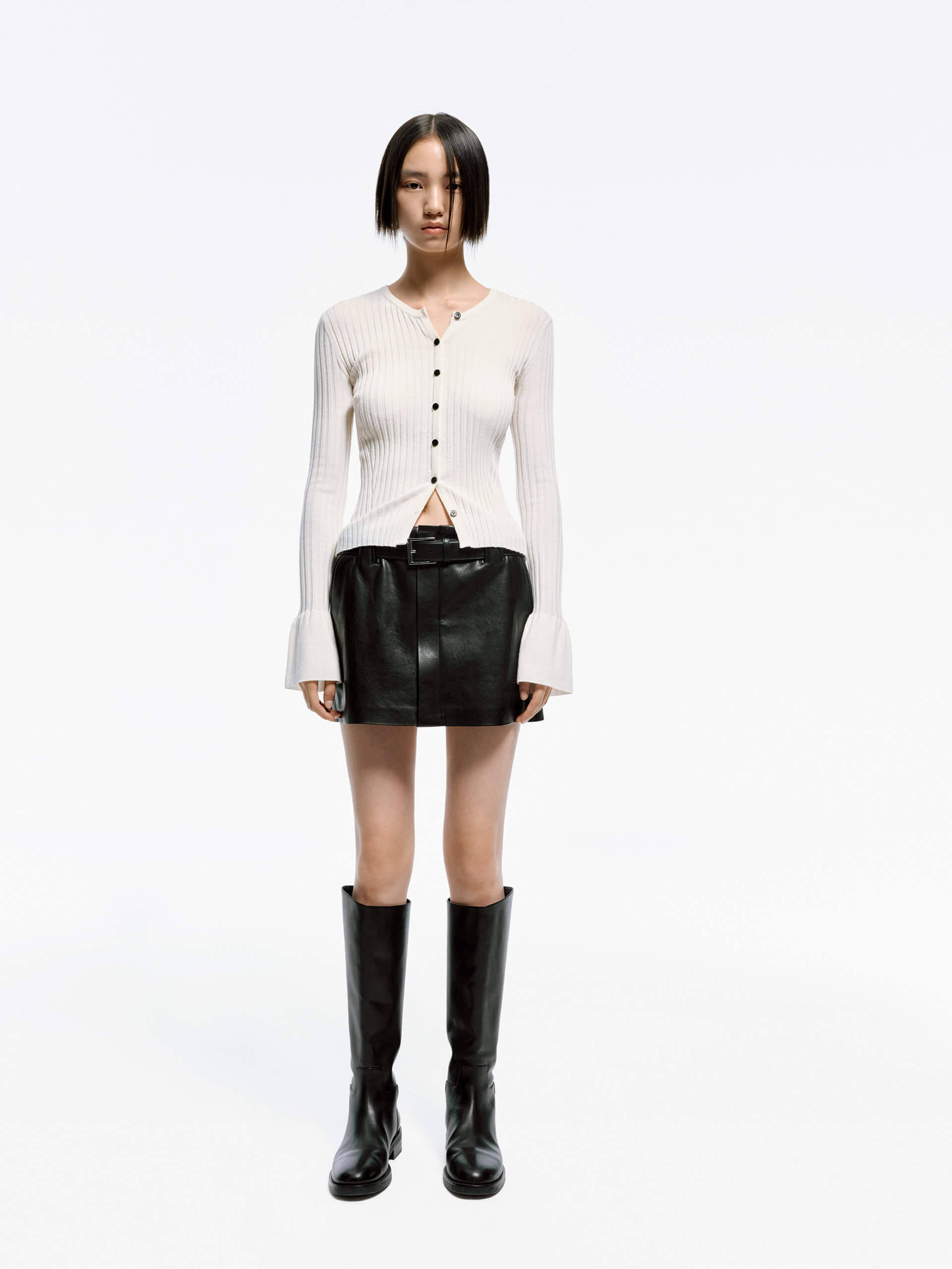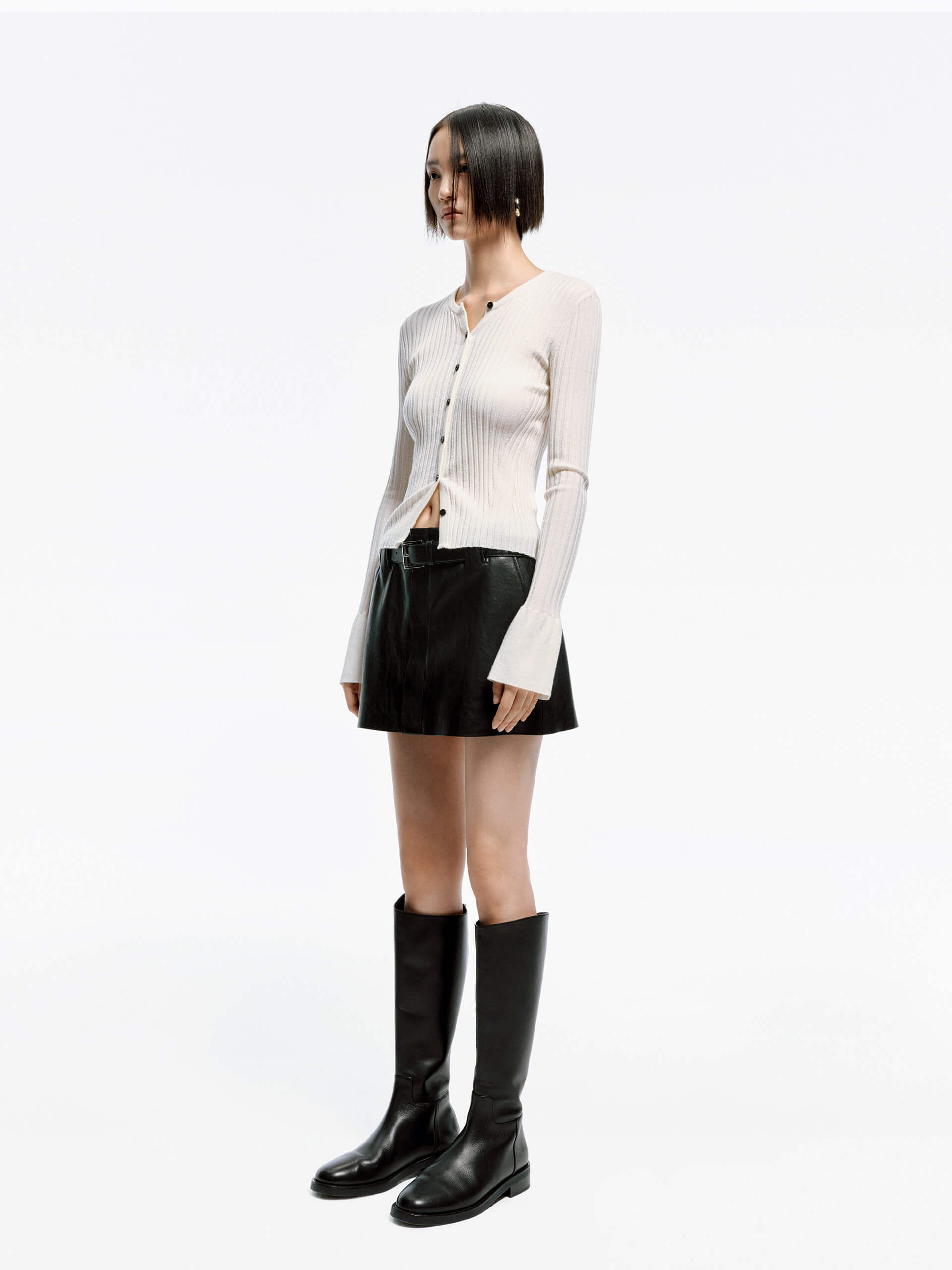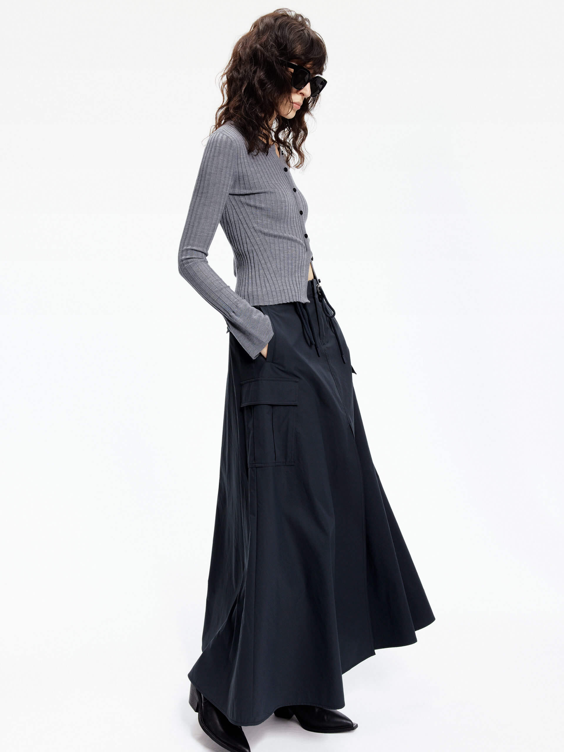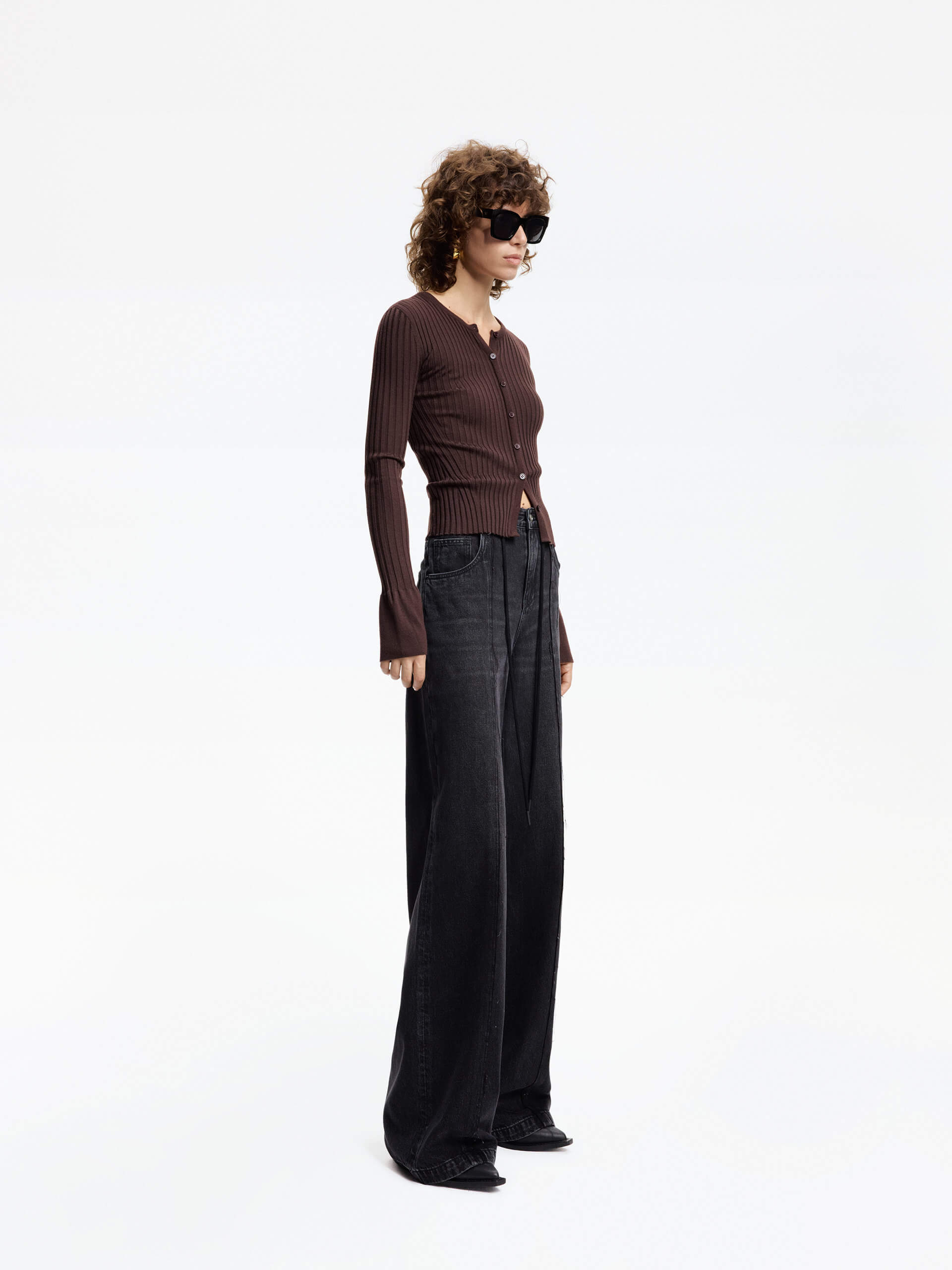 Indulge in the luxurious comfort of our sweater, crafted from pure, soft wool. Its slimming ribbed design features a round neckline, delicate trumpet cuffs, and decorative buttons. Available in multiple colors to suit your style.