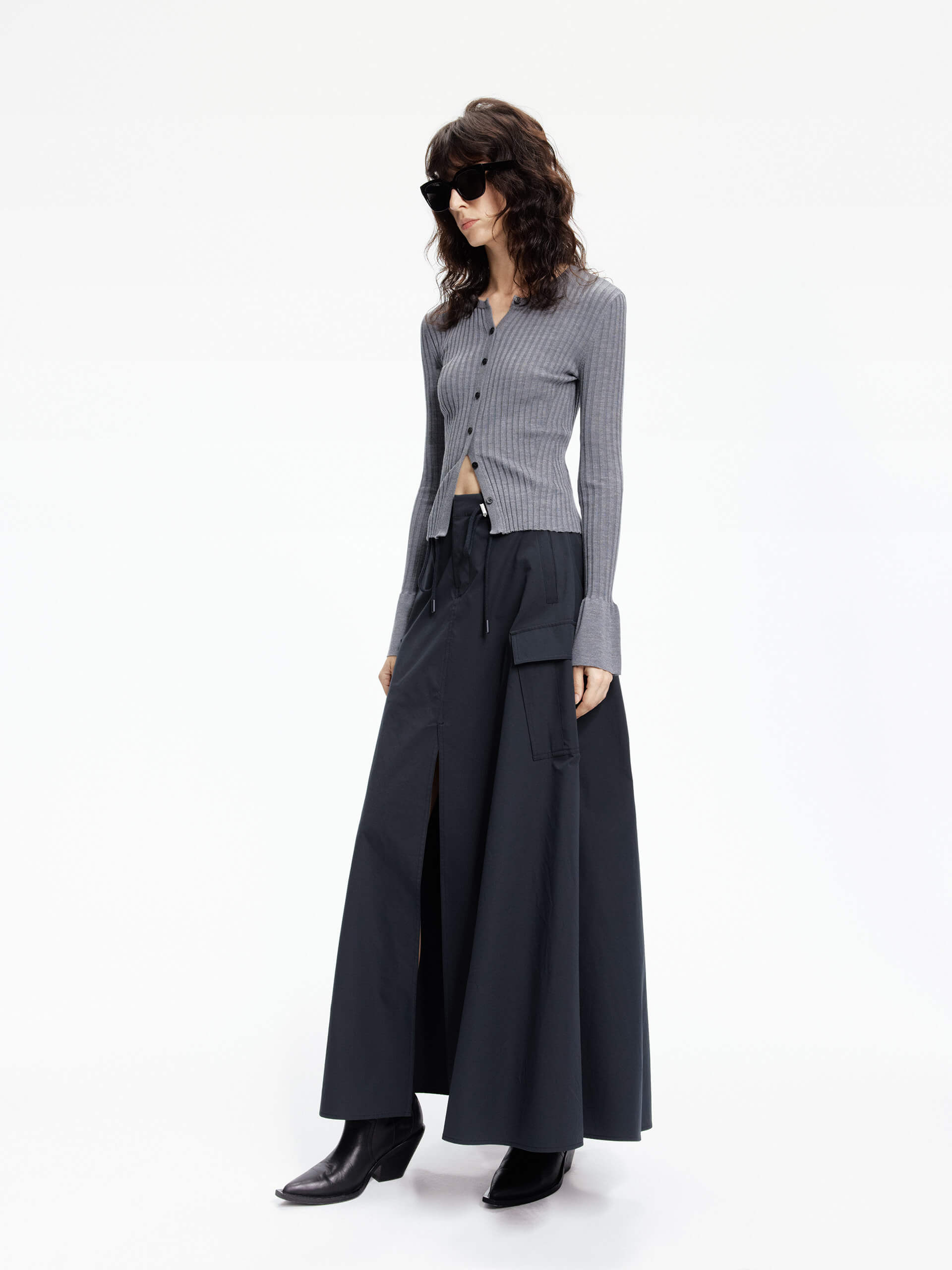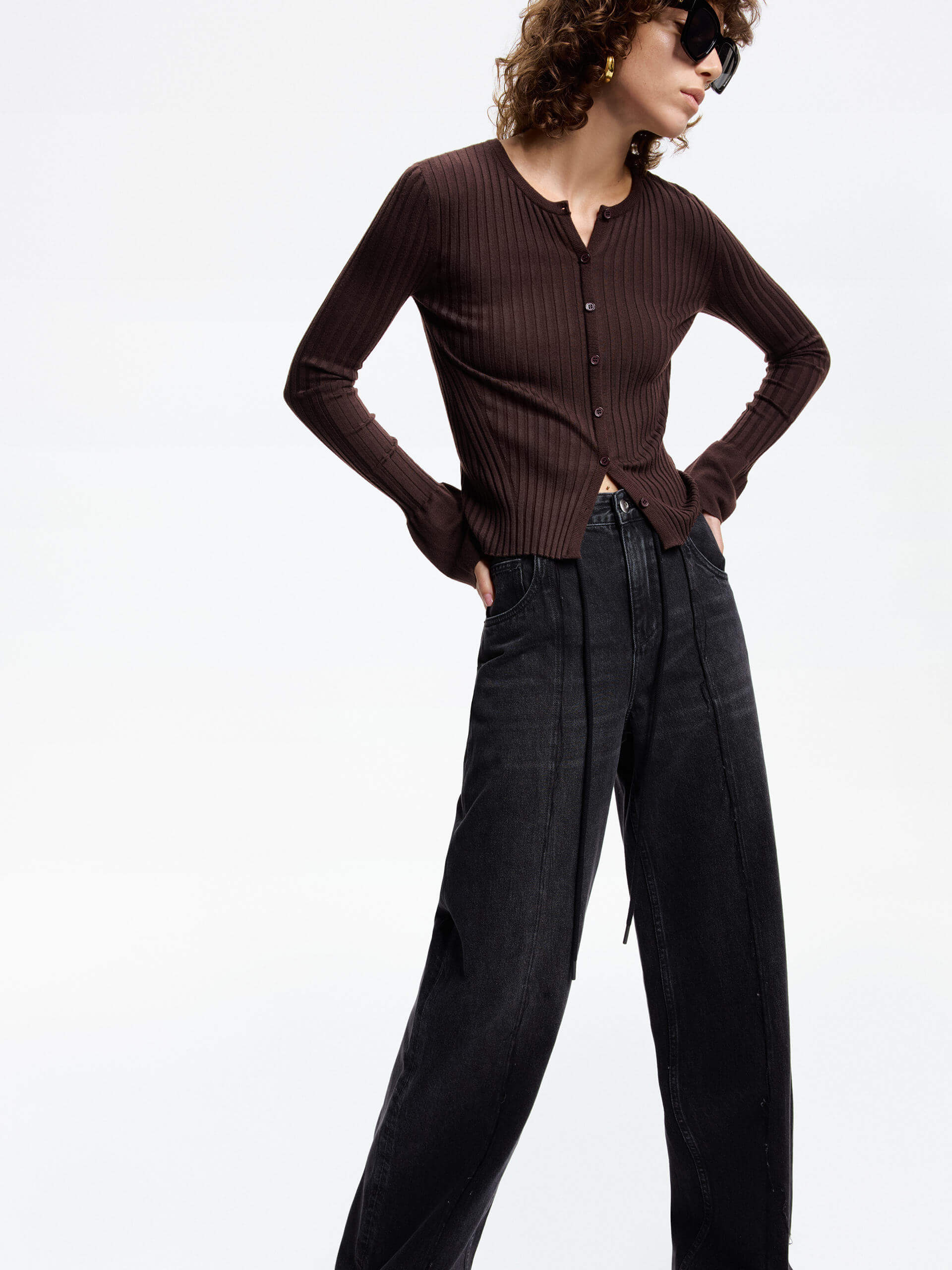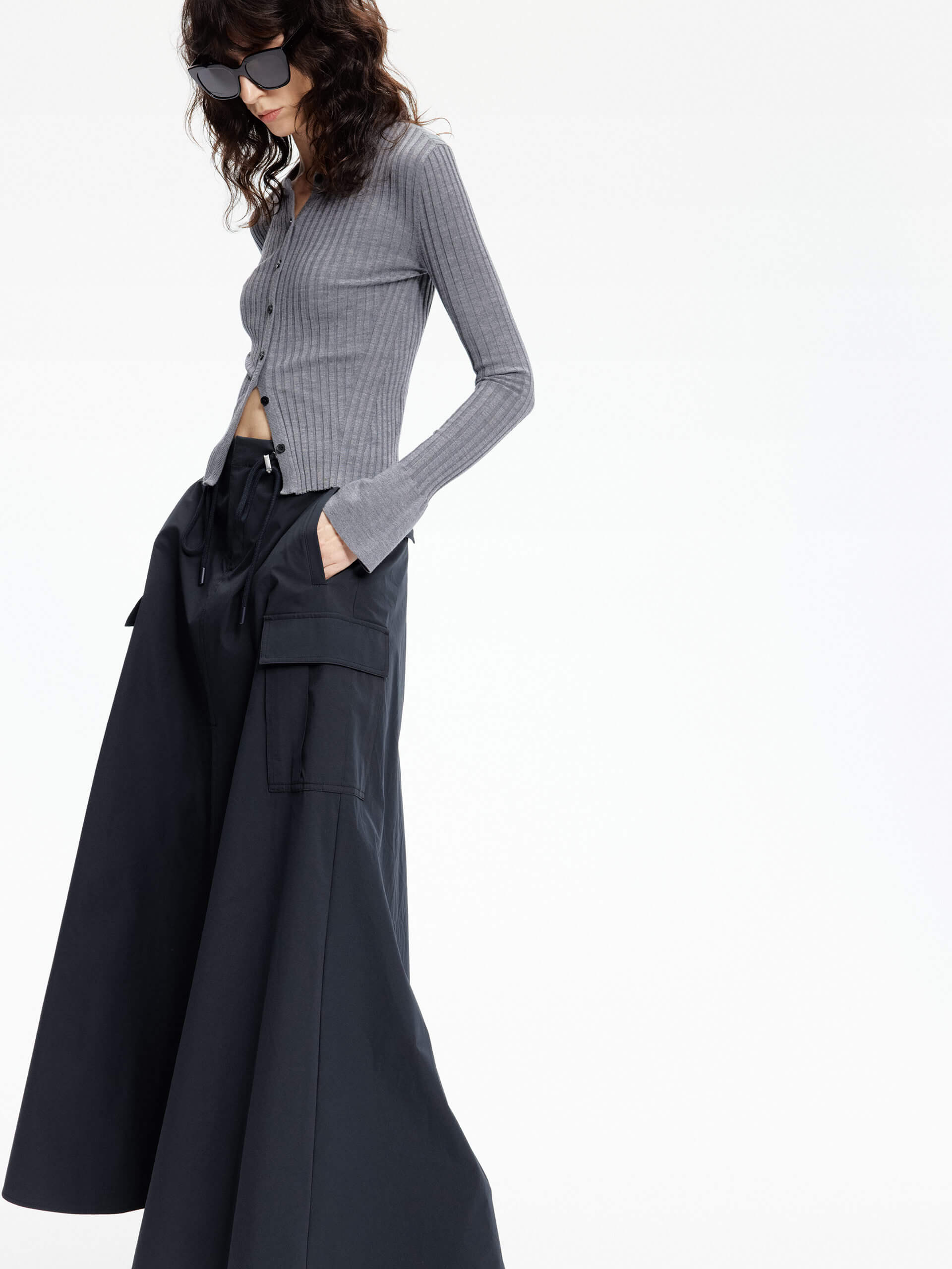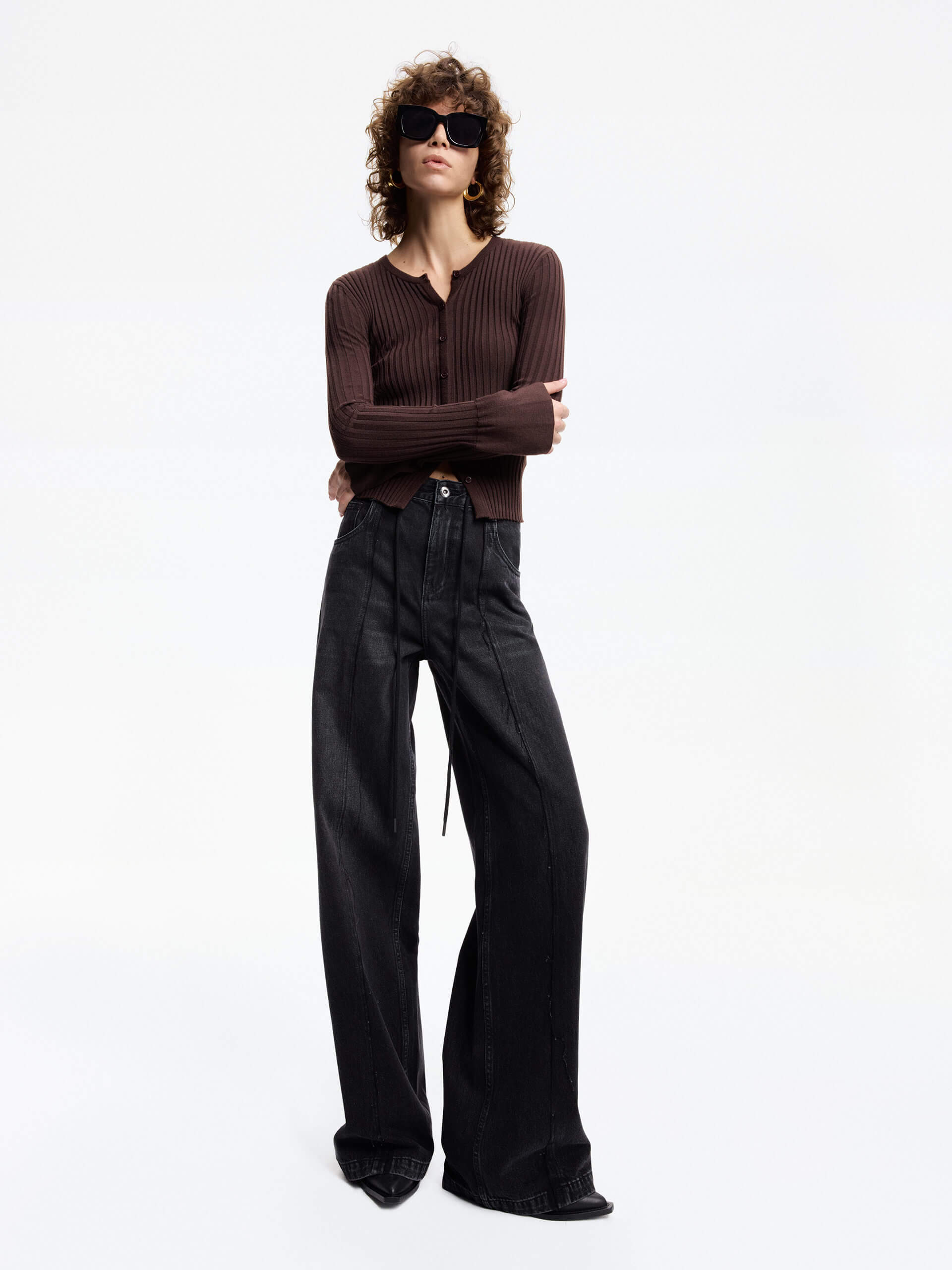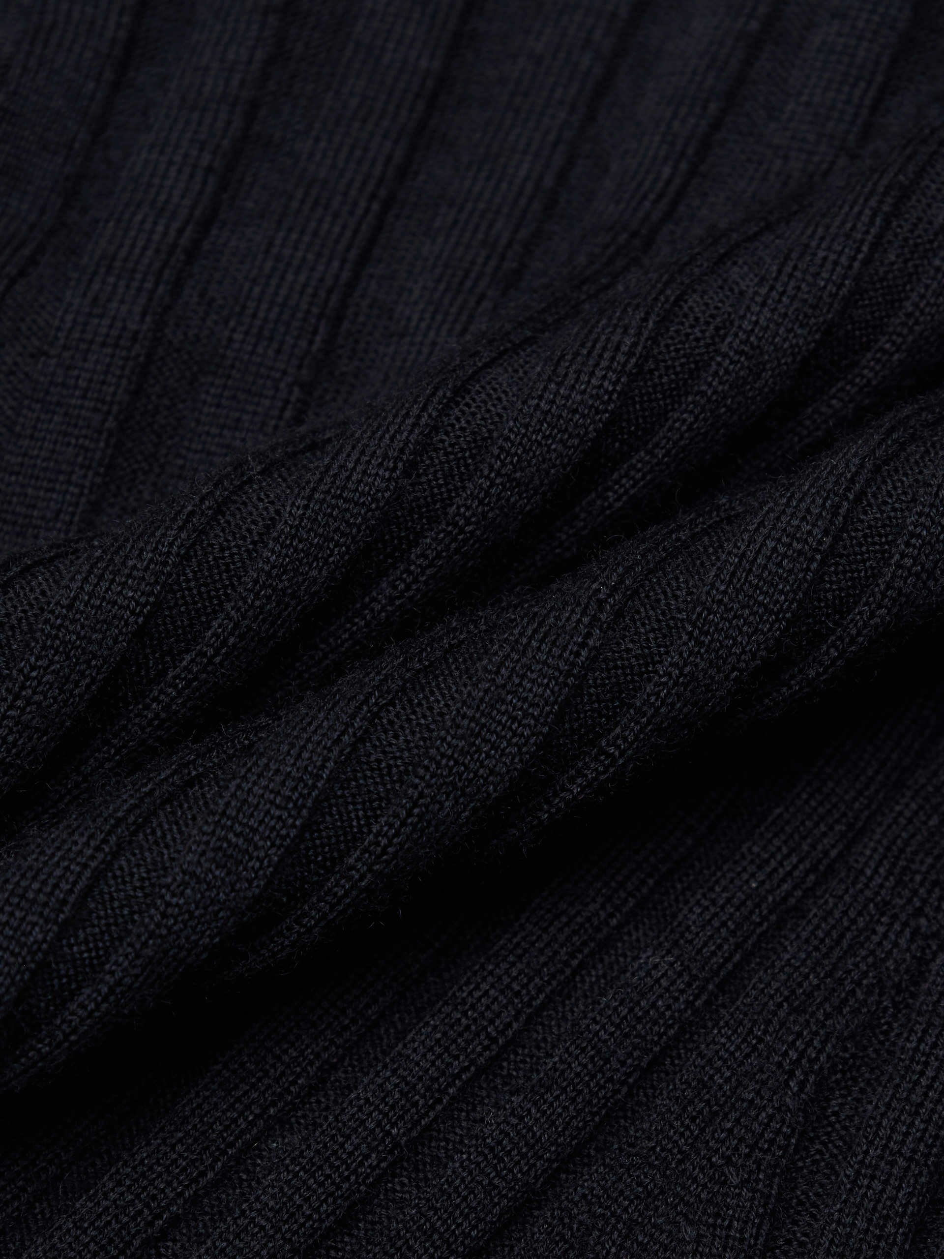 Indulge in the luxurious comfort of our sweater, crafted from pure, soft wool. Its slimming ribbed design features a round neckline, delicate trumpet cuffs, and decorative buttons. Available in multiple colors to suit your style.