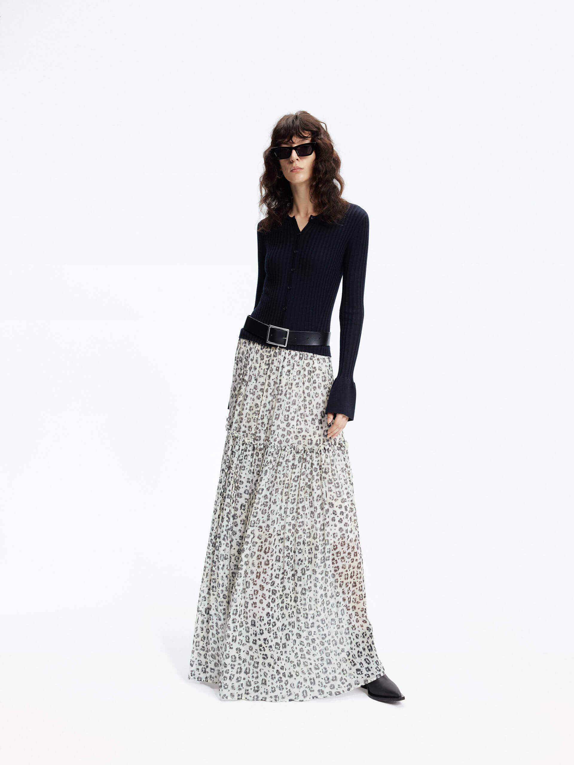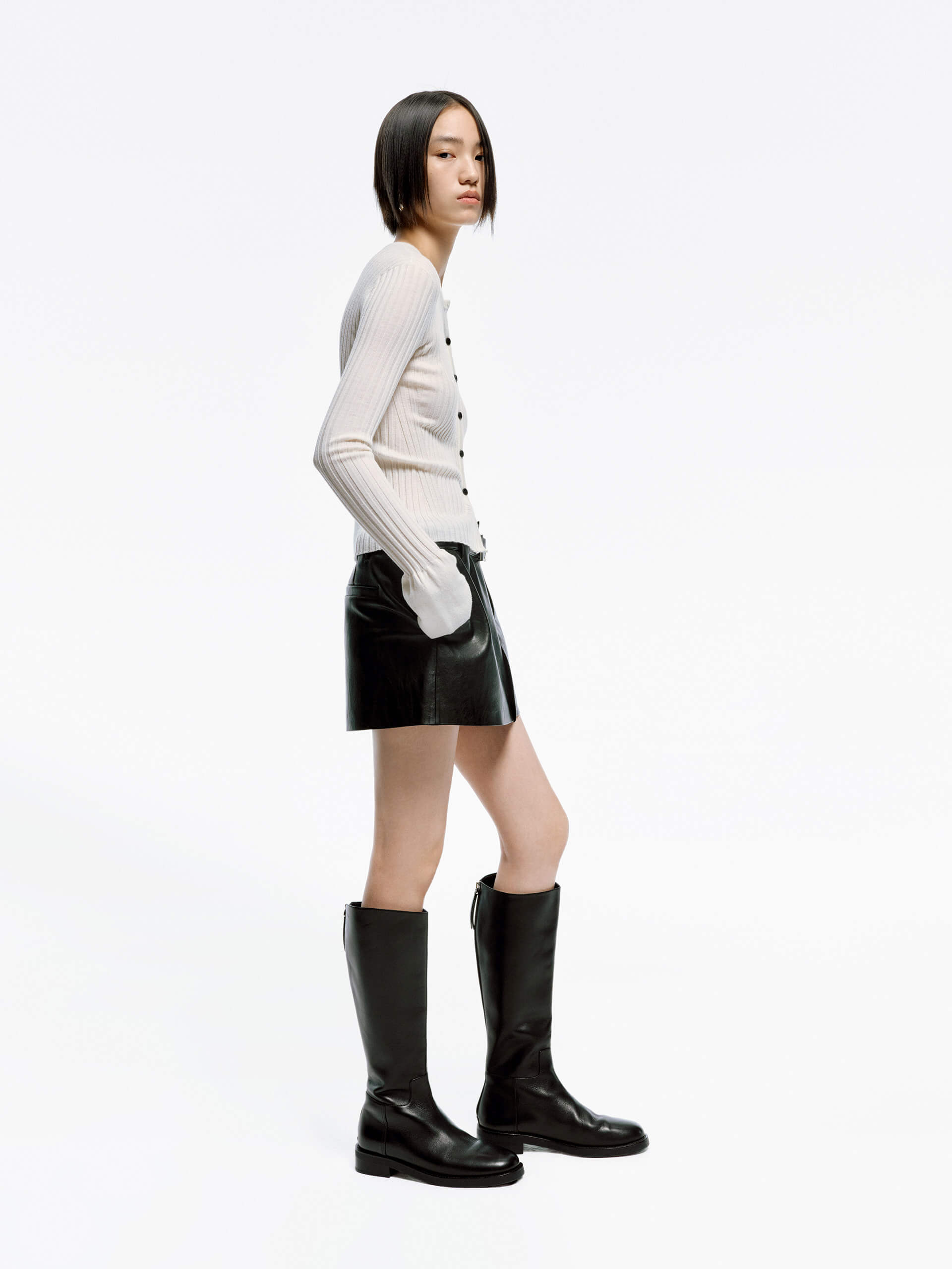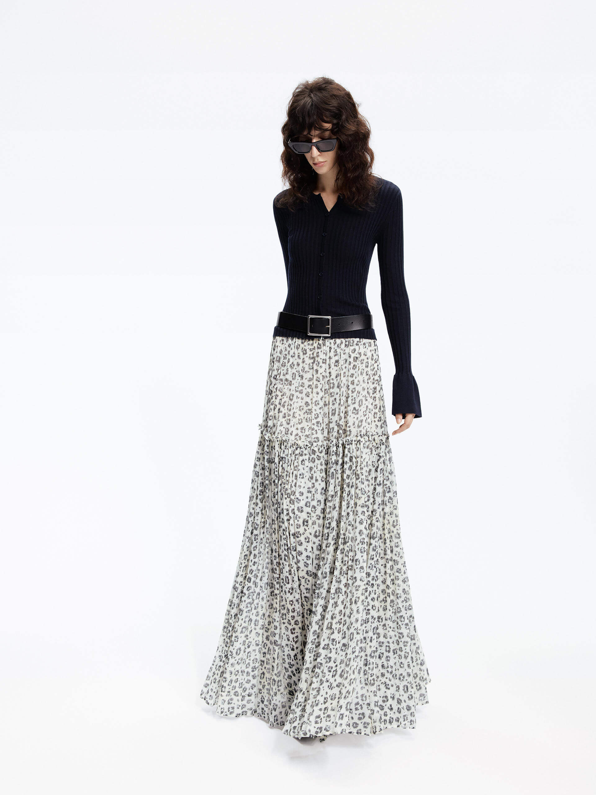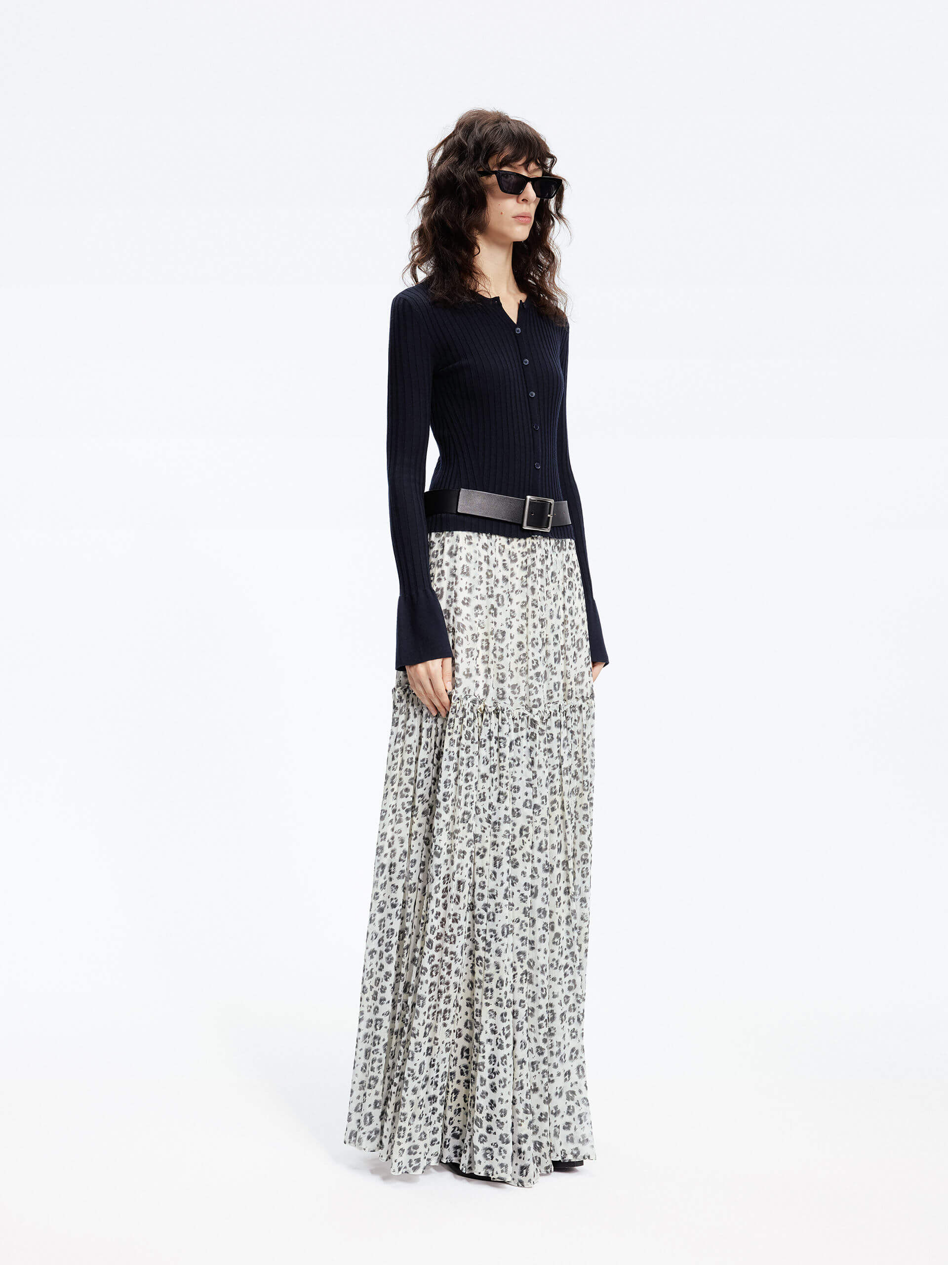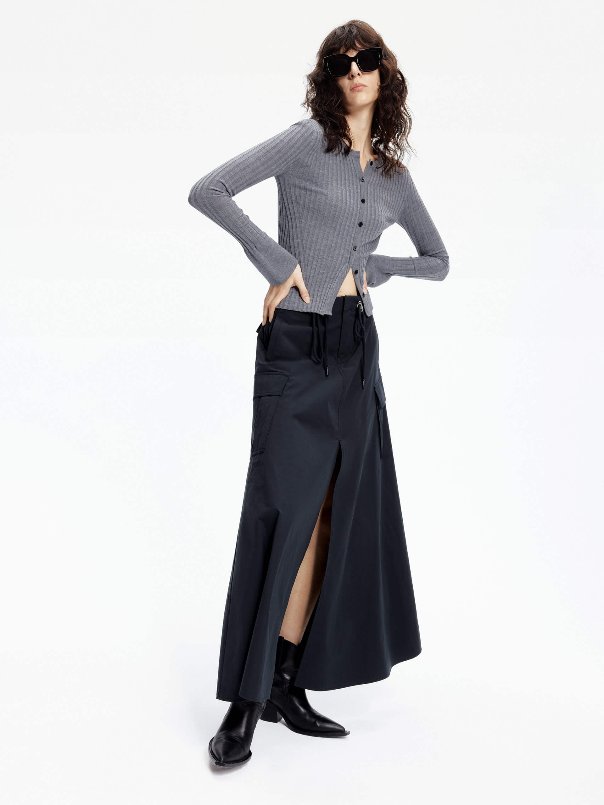 Indulge in the luxurious comfort of our sweater, crafted from pure, soft wool. Its slimming ribbed design features a round neckline, delicate trumpet cuffs, and decorative buttons. Available in multiple colors to suit your style.