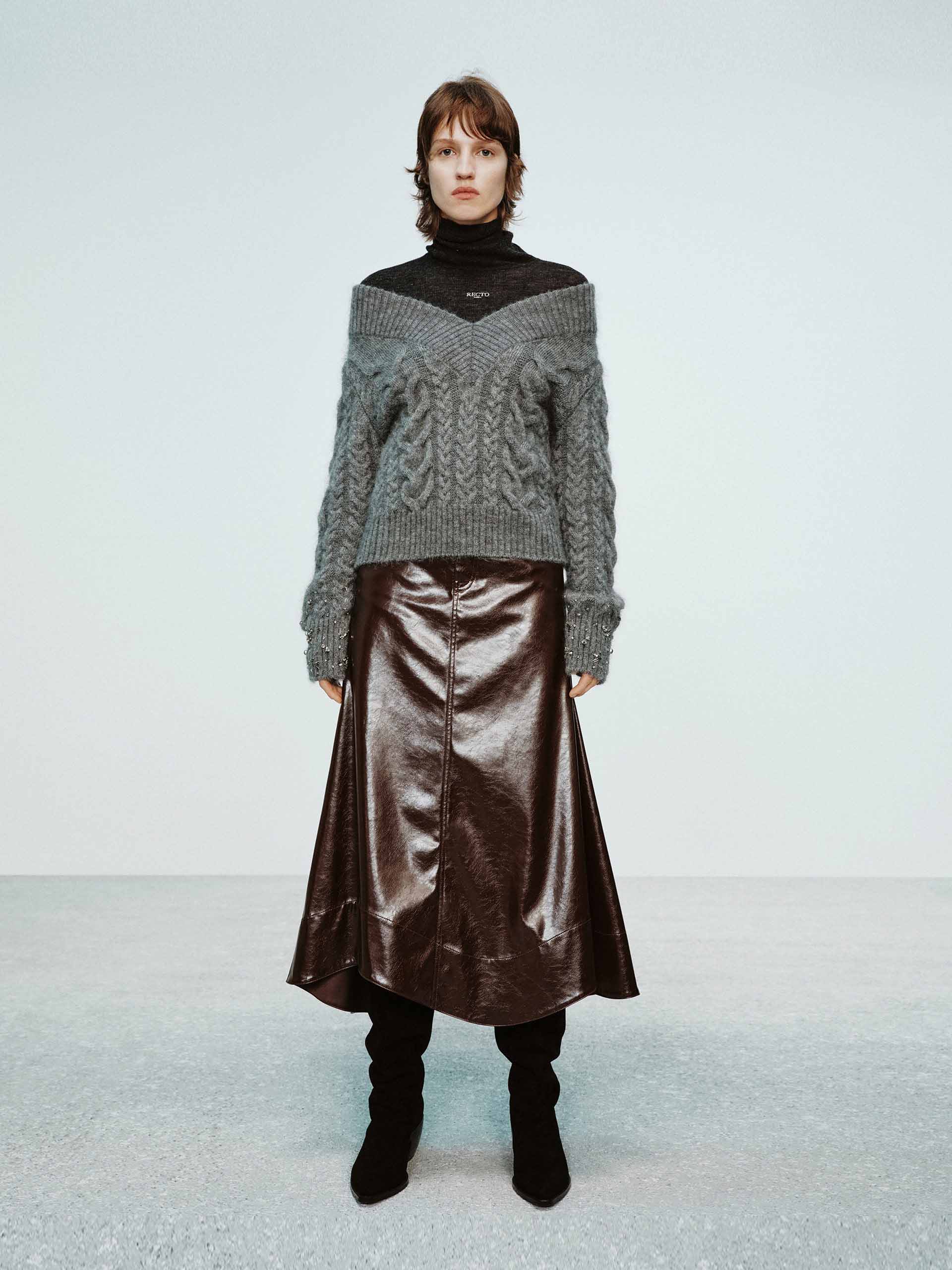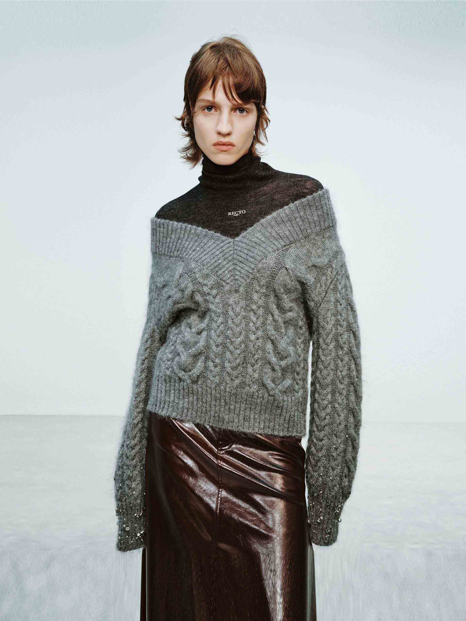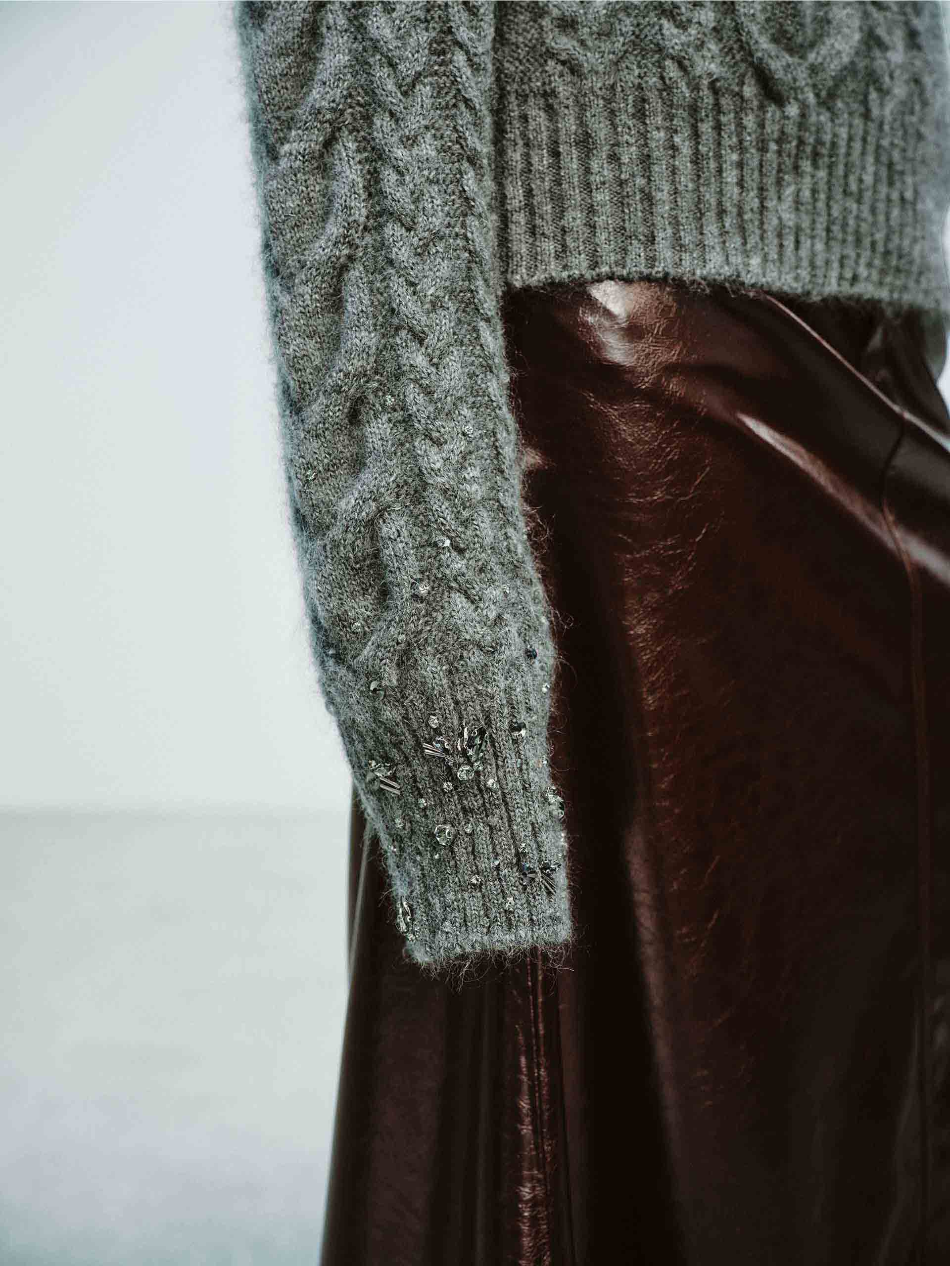 - Cable knit texture and crystal details at cuffs