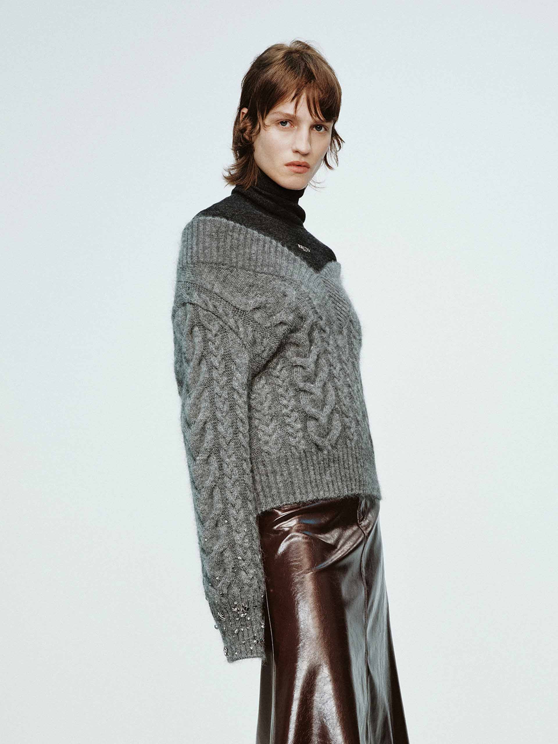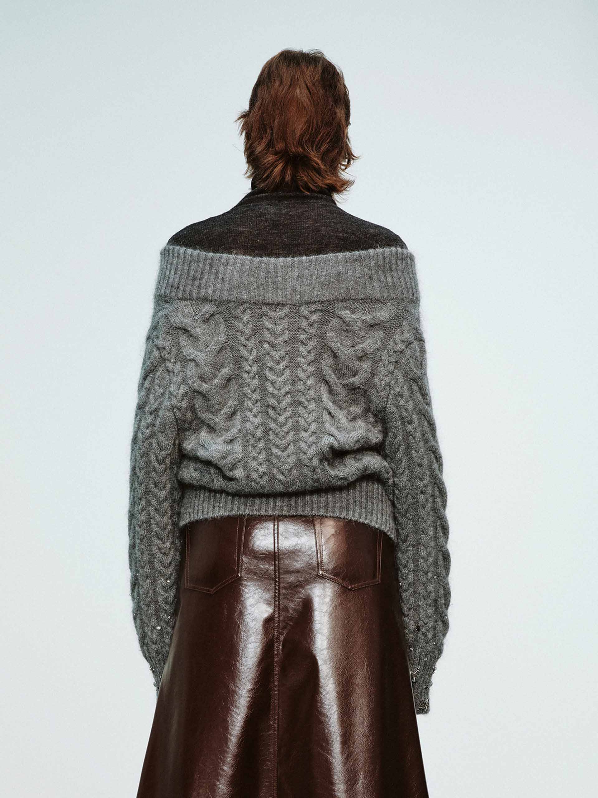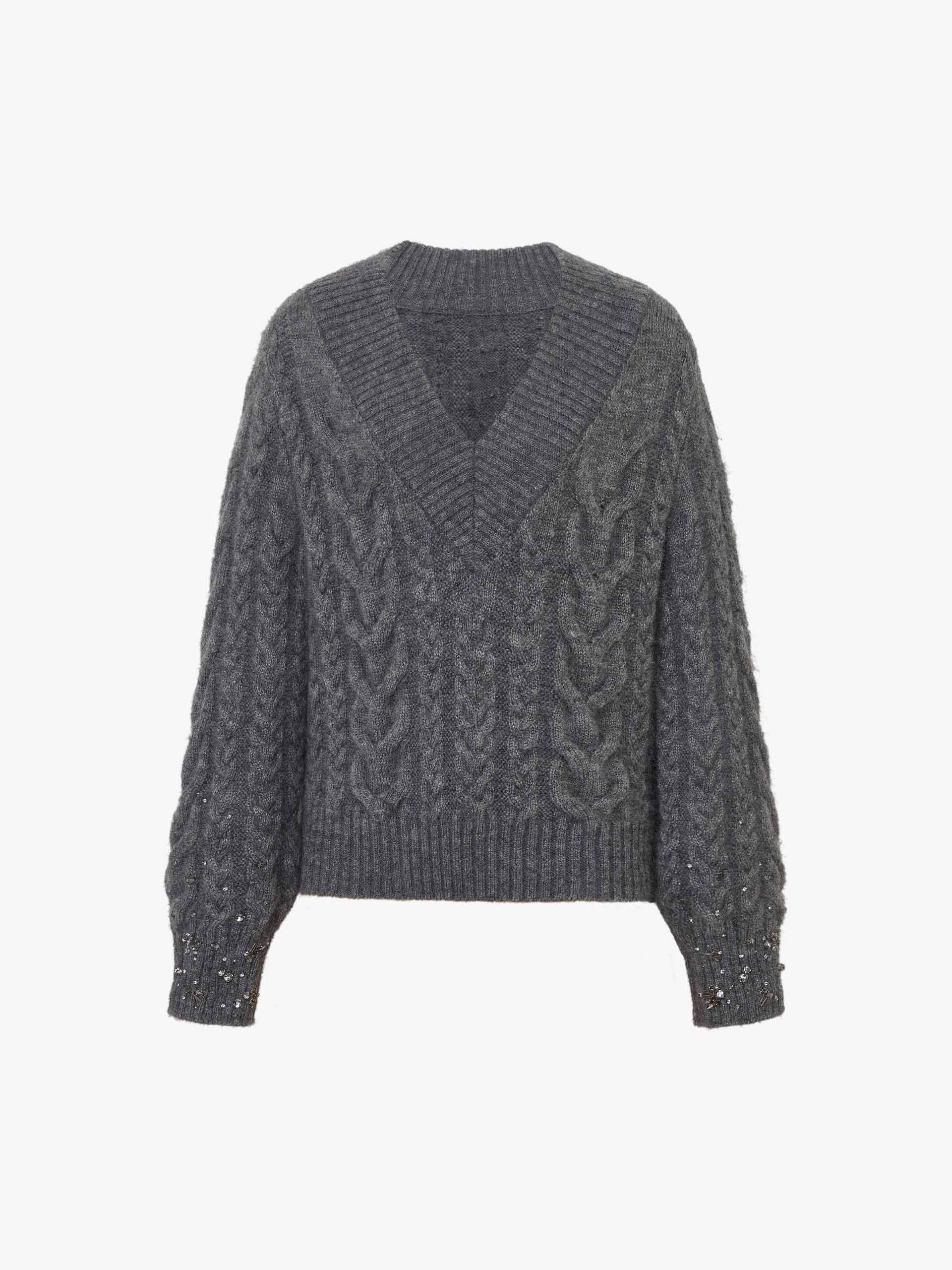 Expertly crafted from a warm mohair blend, this sweater boasts a chunky knit and cable texture for a cozy yet stylish look. It is accented with crystal details at the cuffs and cut in a classic grey hue.