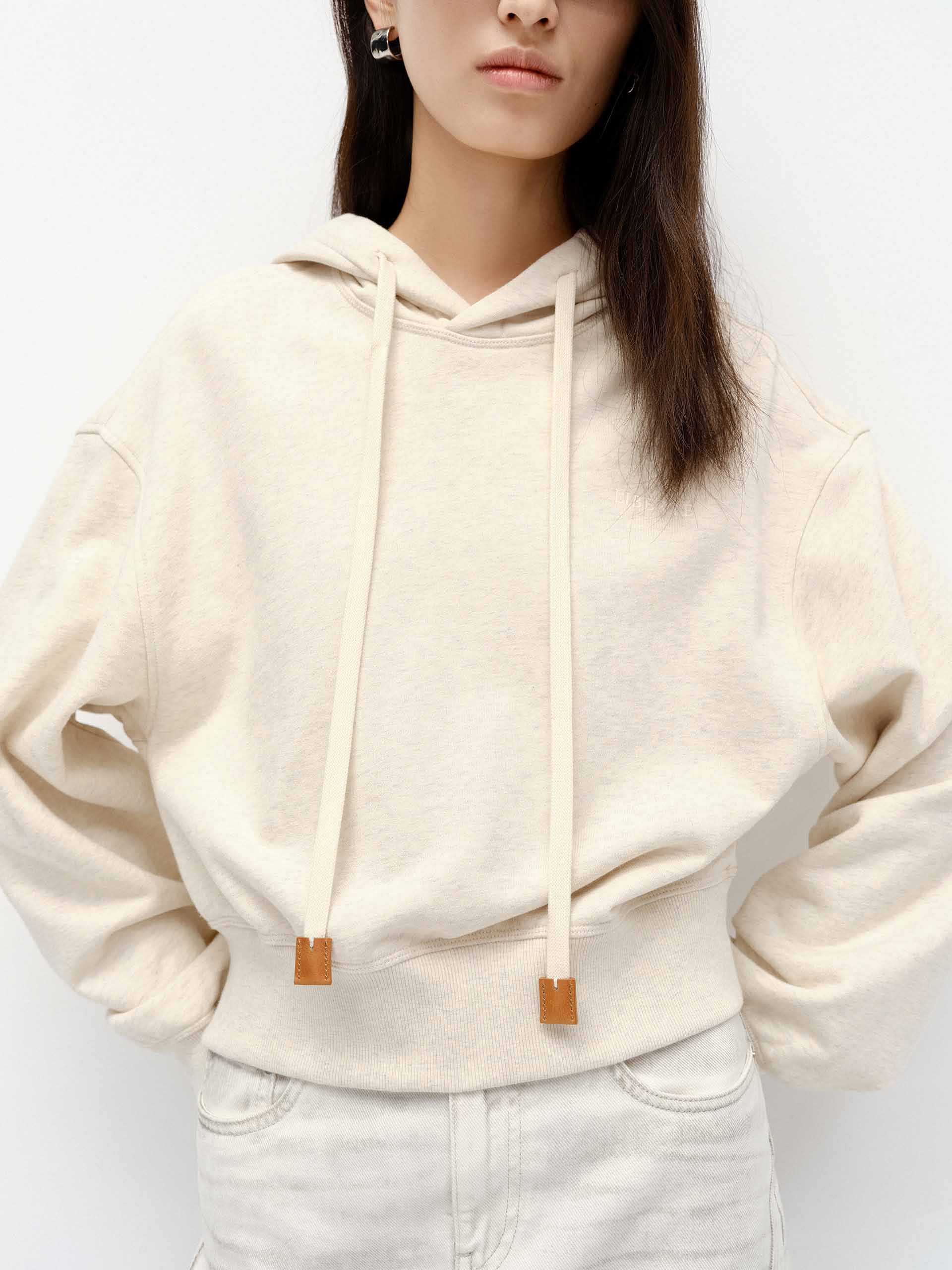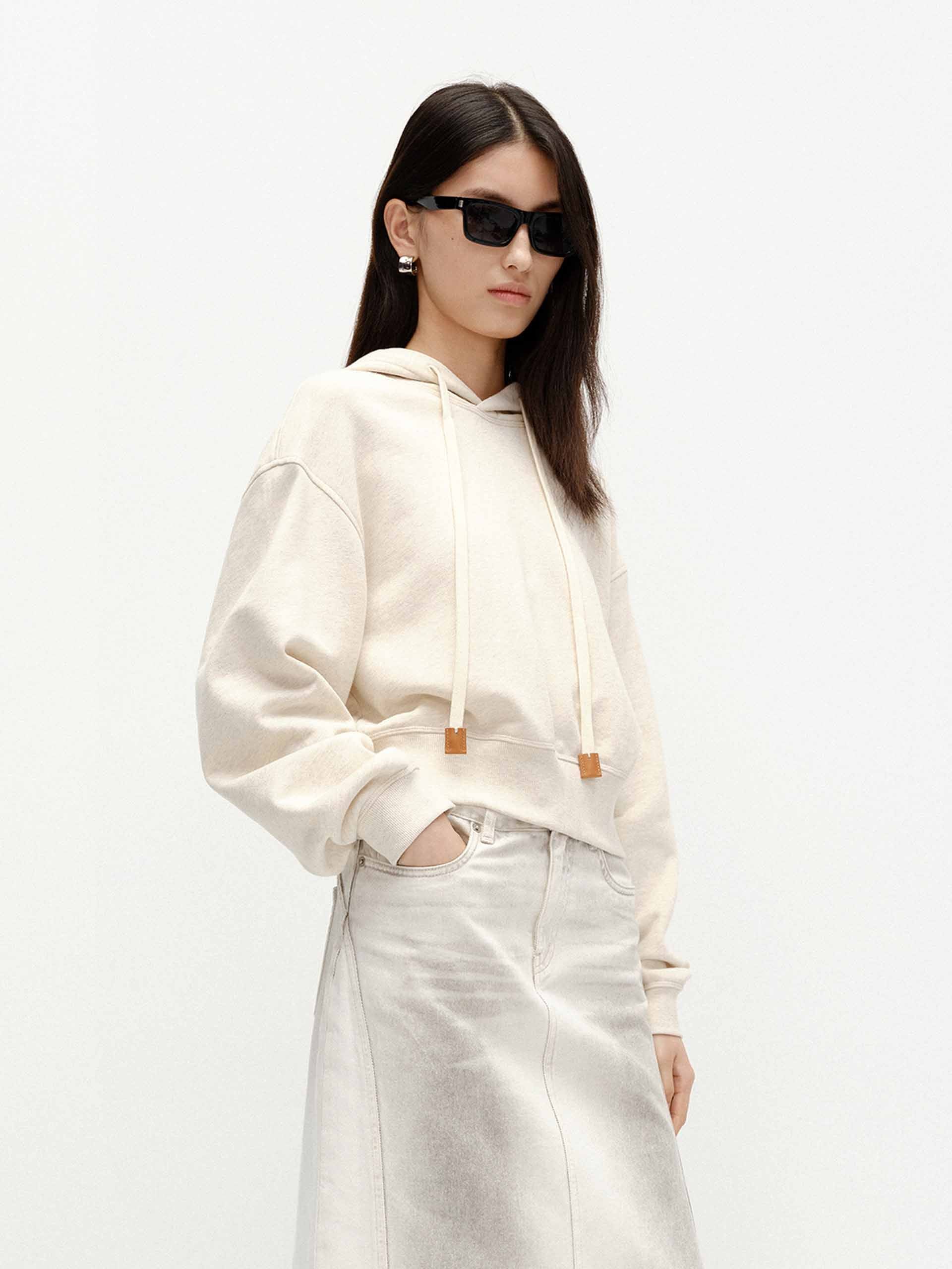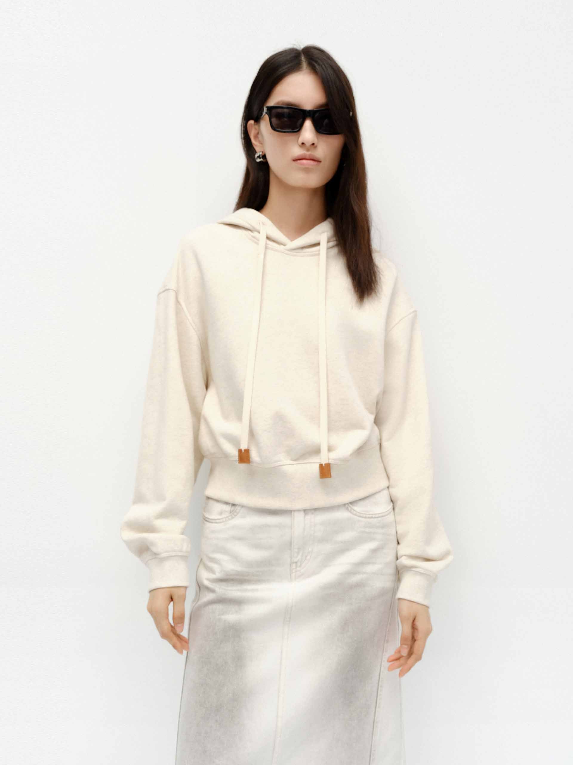 Made from cotton with a hint of durable hemp, this sweatshirt features a short length, drop shoulder and hood design for a fashionable and cozy fit. Offered in a light hue, pair it with any denim skirt or jeans.