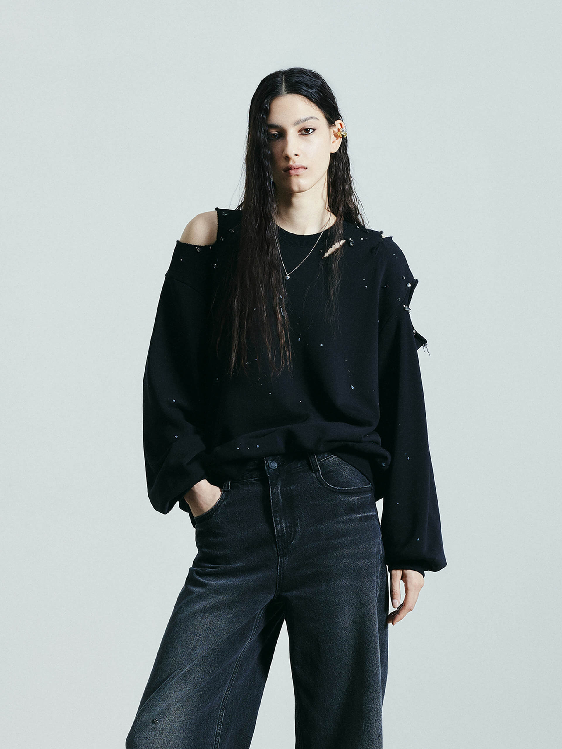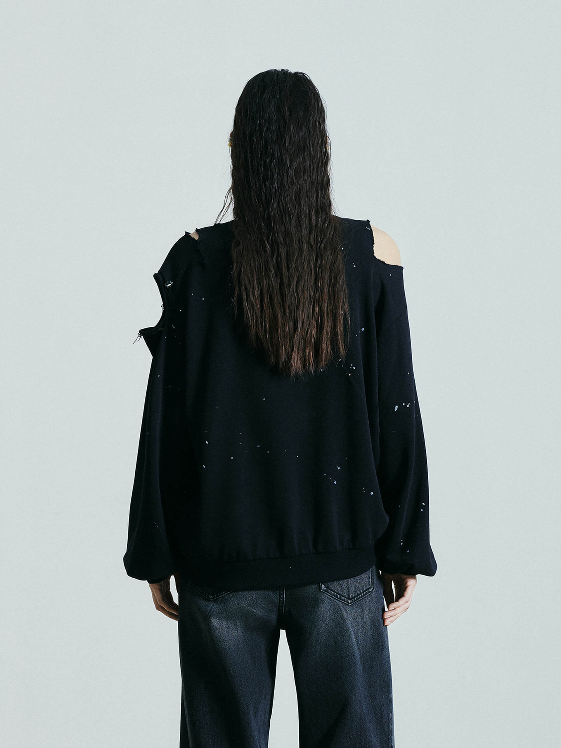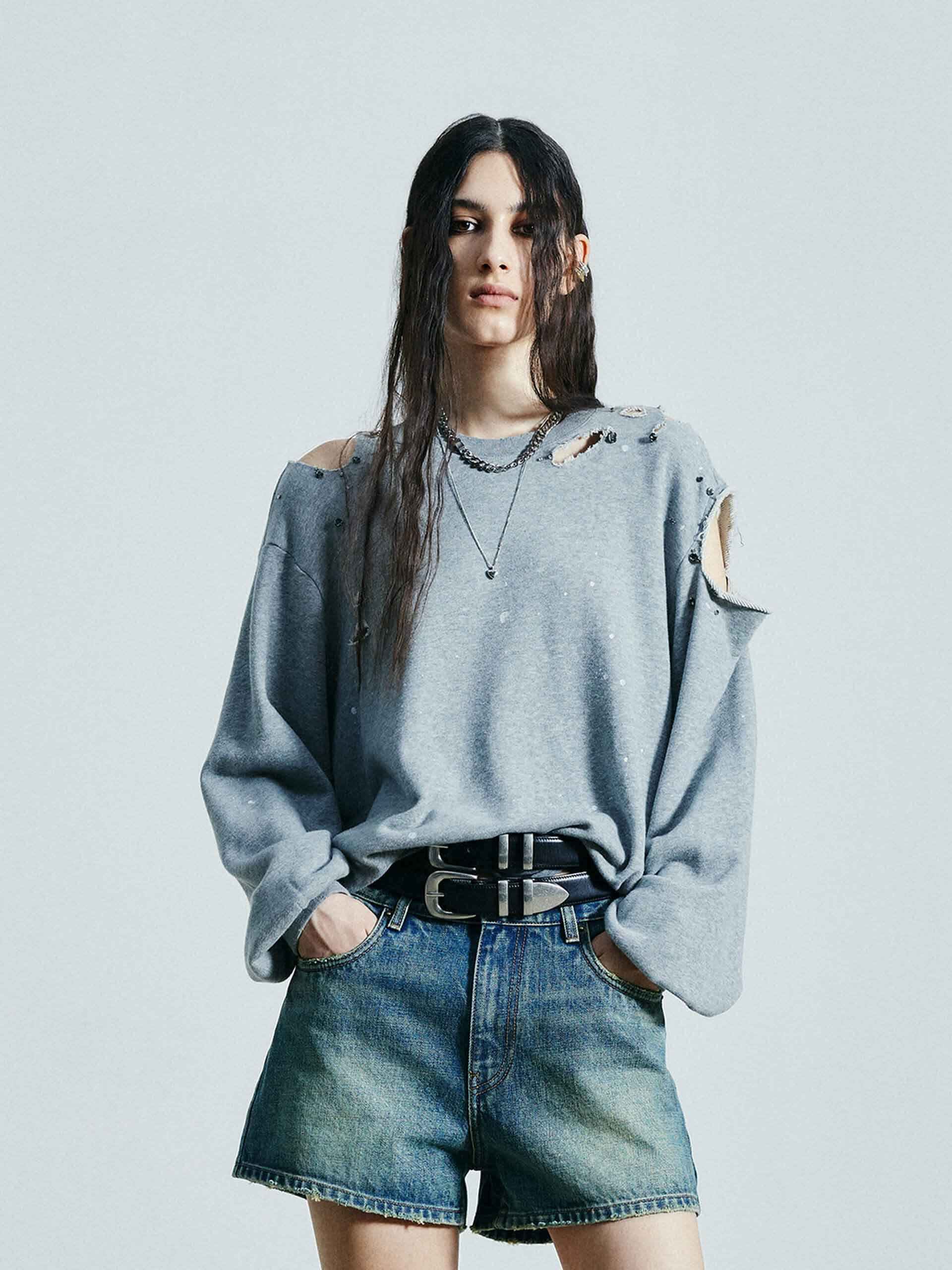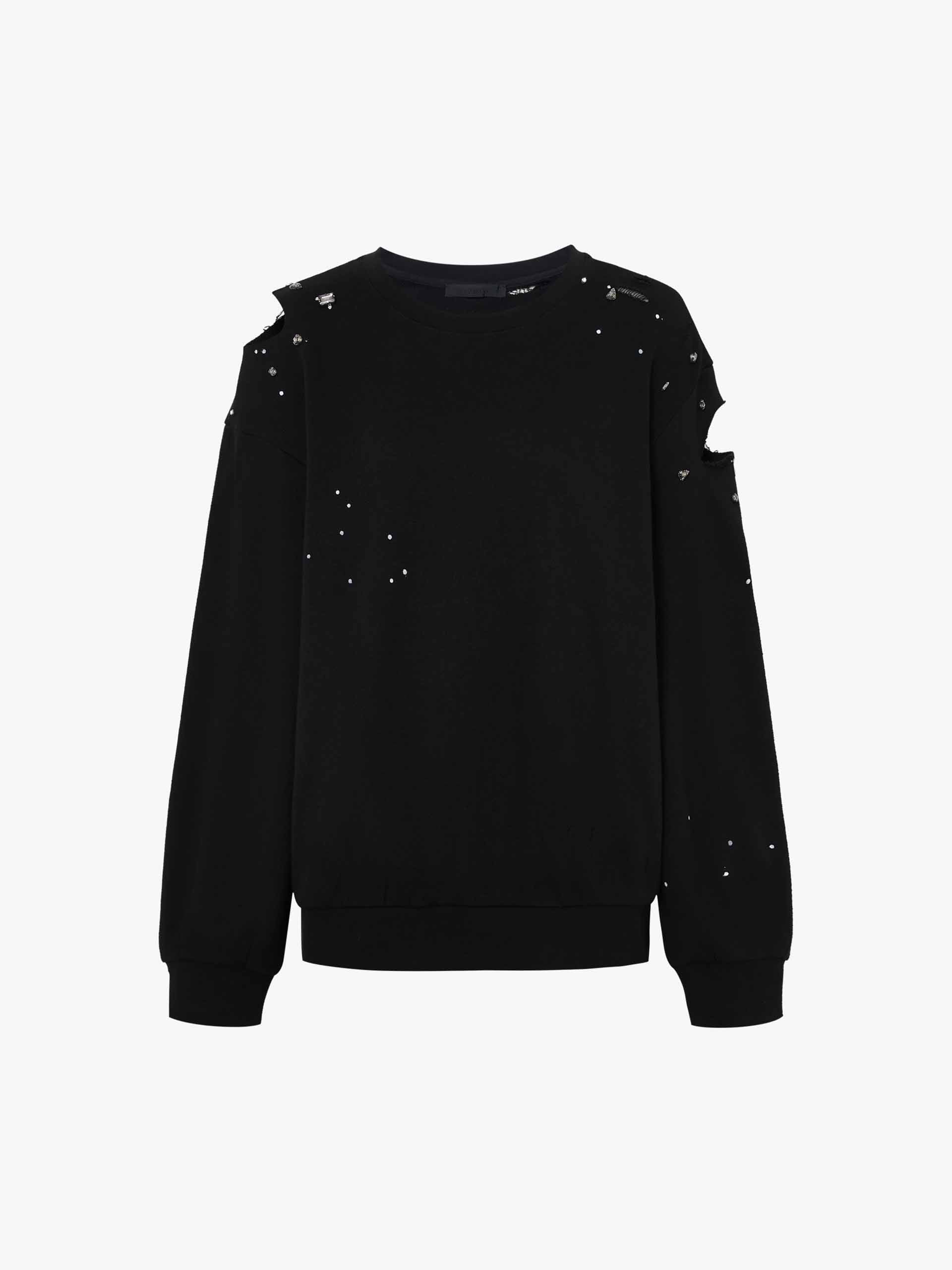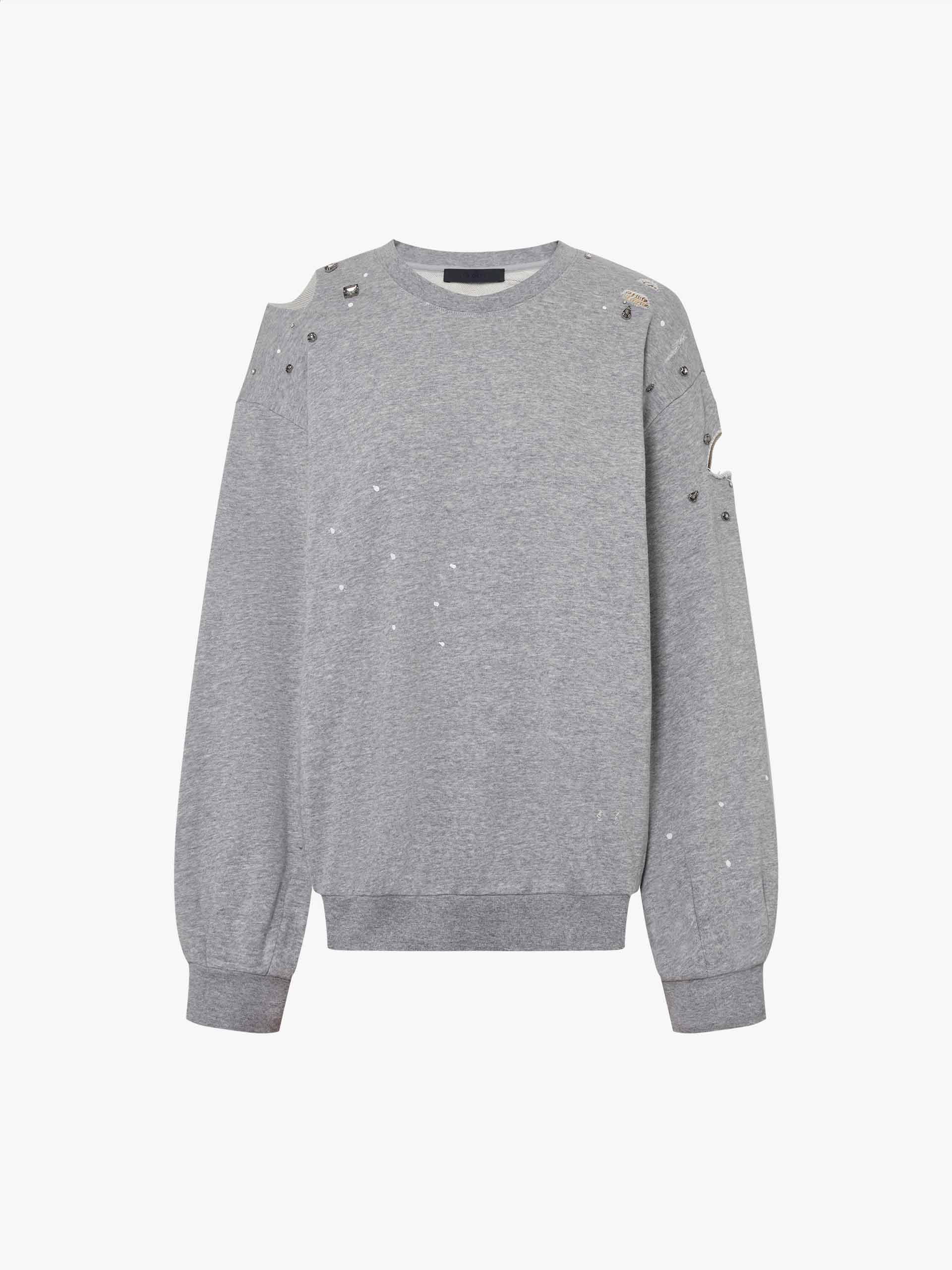 Discover a new take on sweatshirts. Made from a comfortable cotton blend, this sweatshirt features a unique destroyed and ripped design, adorned with crystal decorations and paint details. Its loose fit adds both comfort and style to your wardrobe.