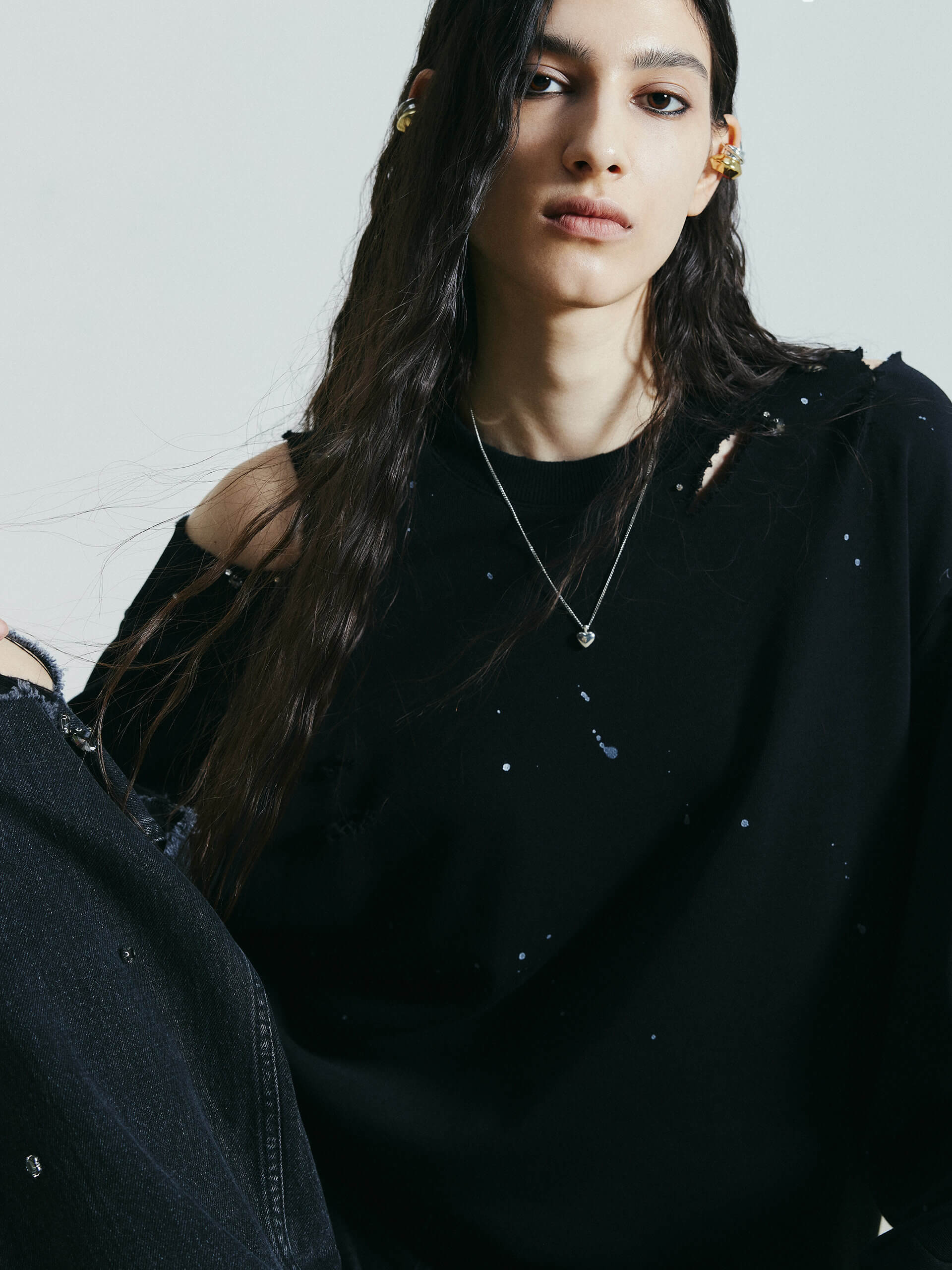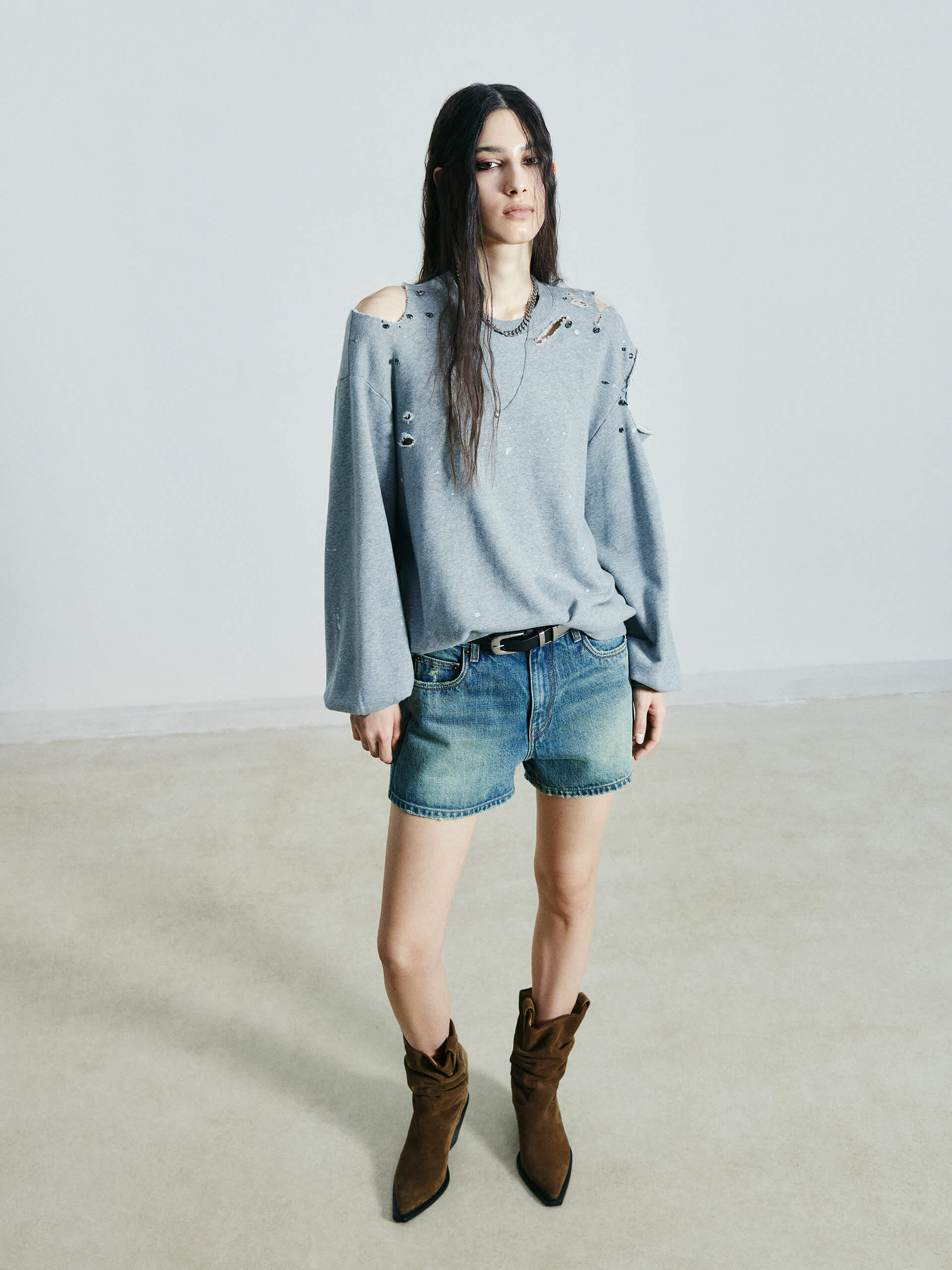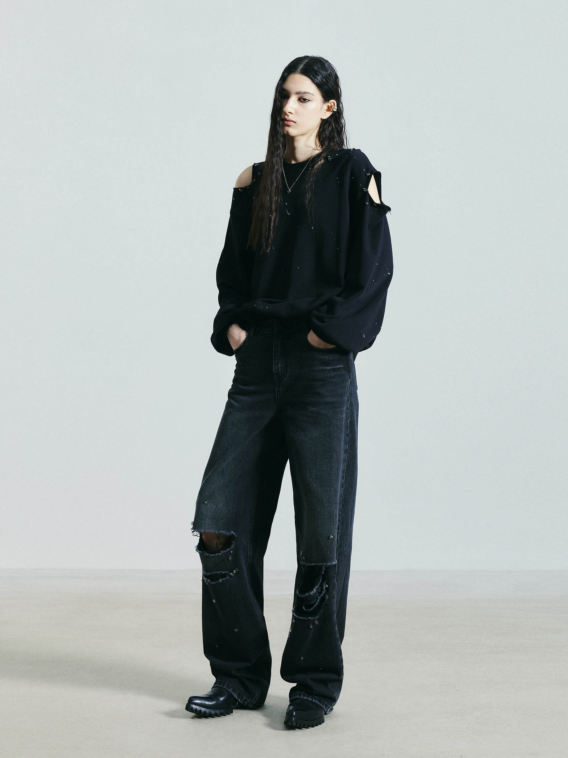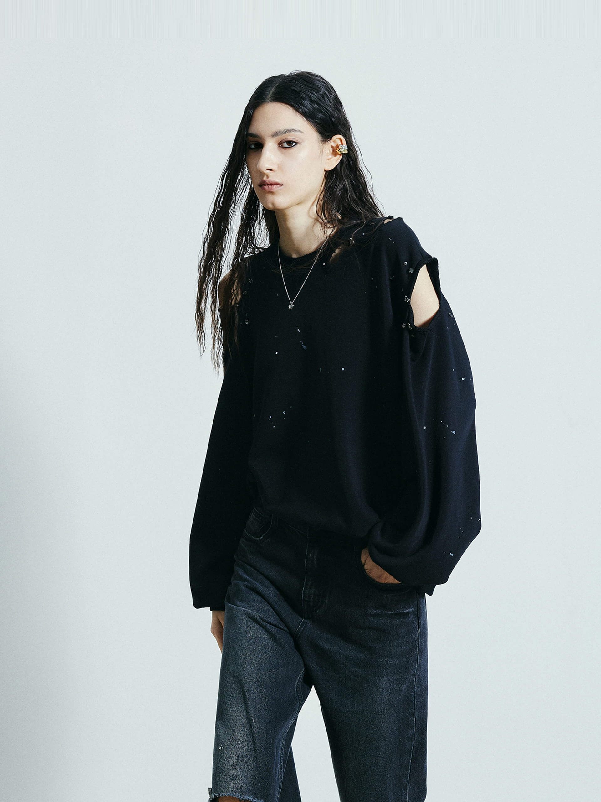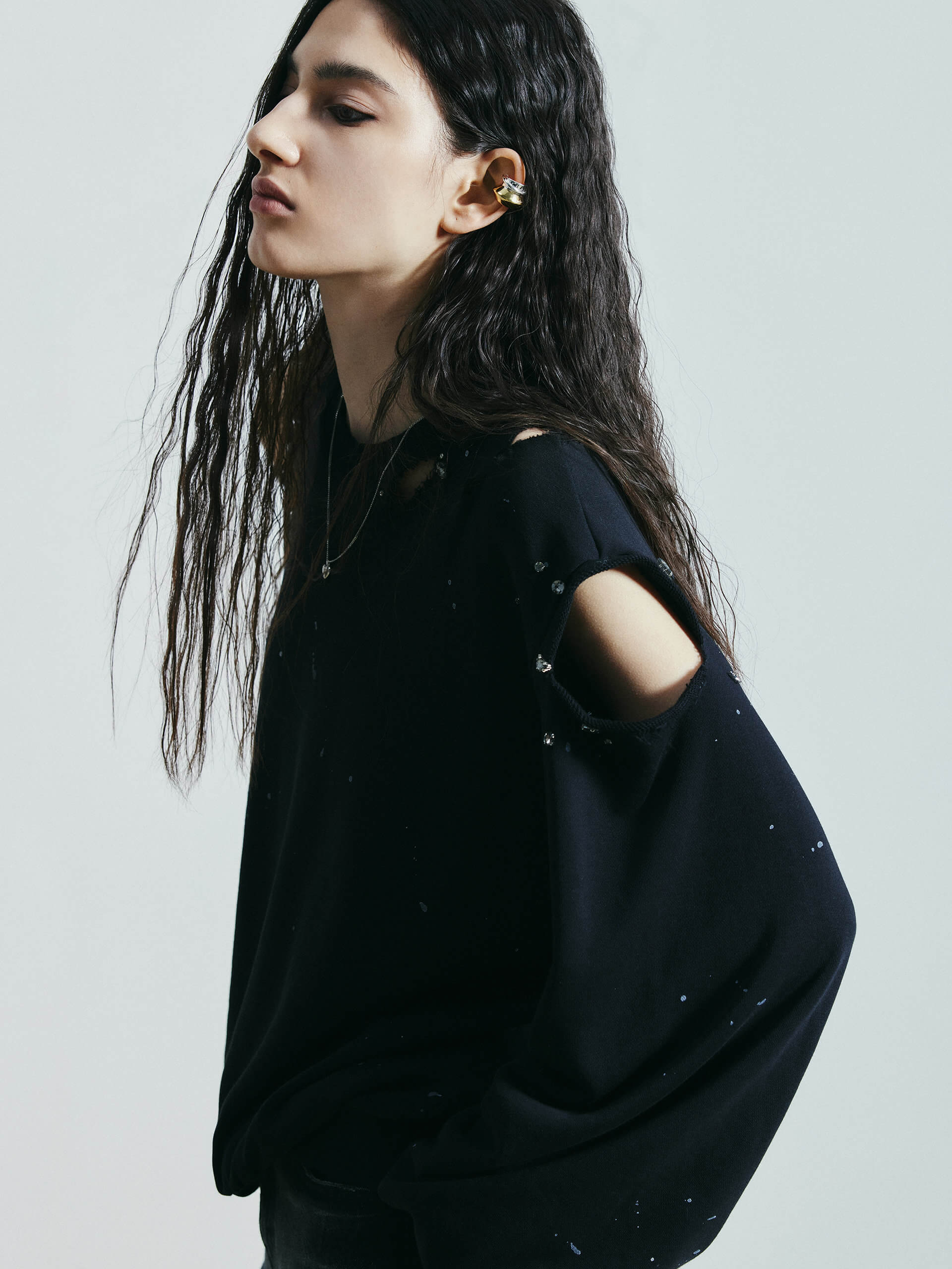 Discover a new take on sweatshirts. Made from a comfortable cotton blend, this sweatshirt features a unique destroyed and ripped design, adorned with crystal decorations and paint details. Its loose fit adds both comfort and style to your wardrobe.