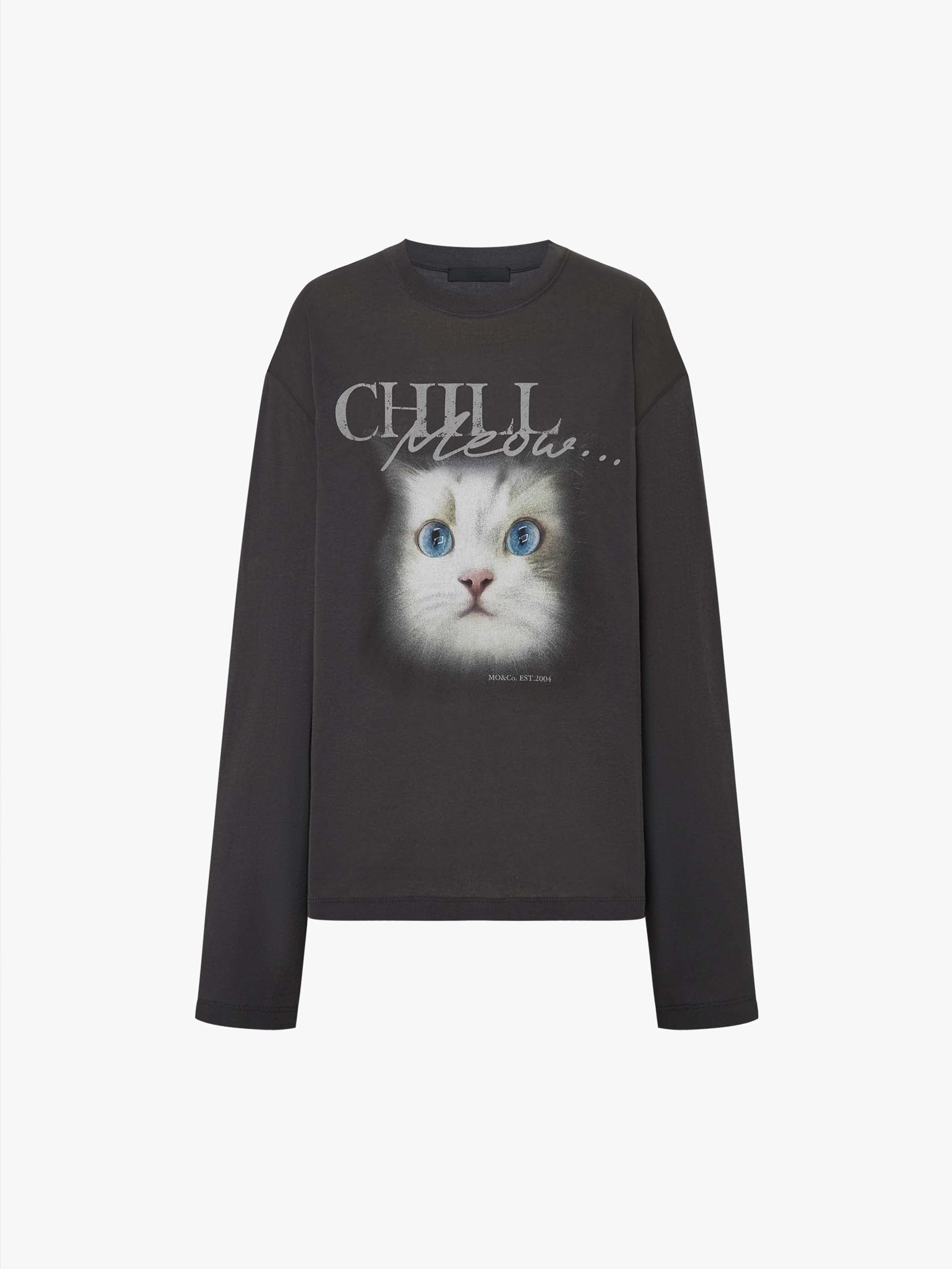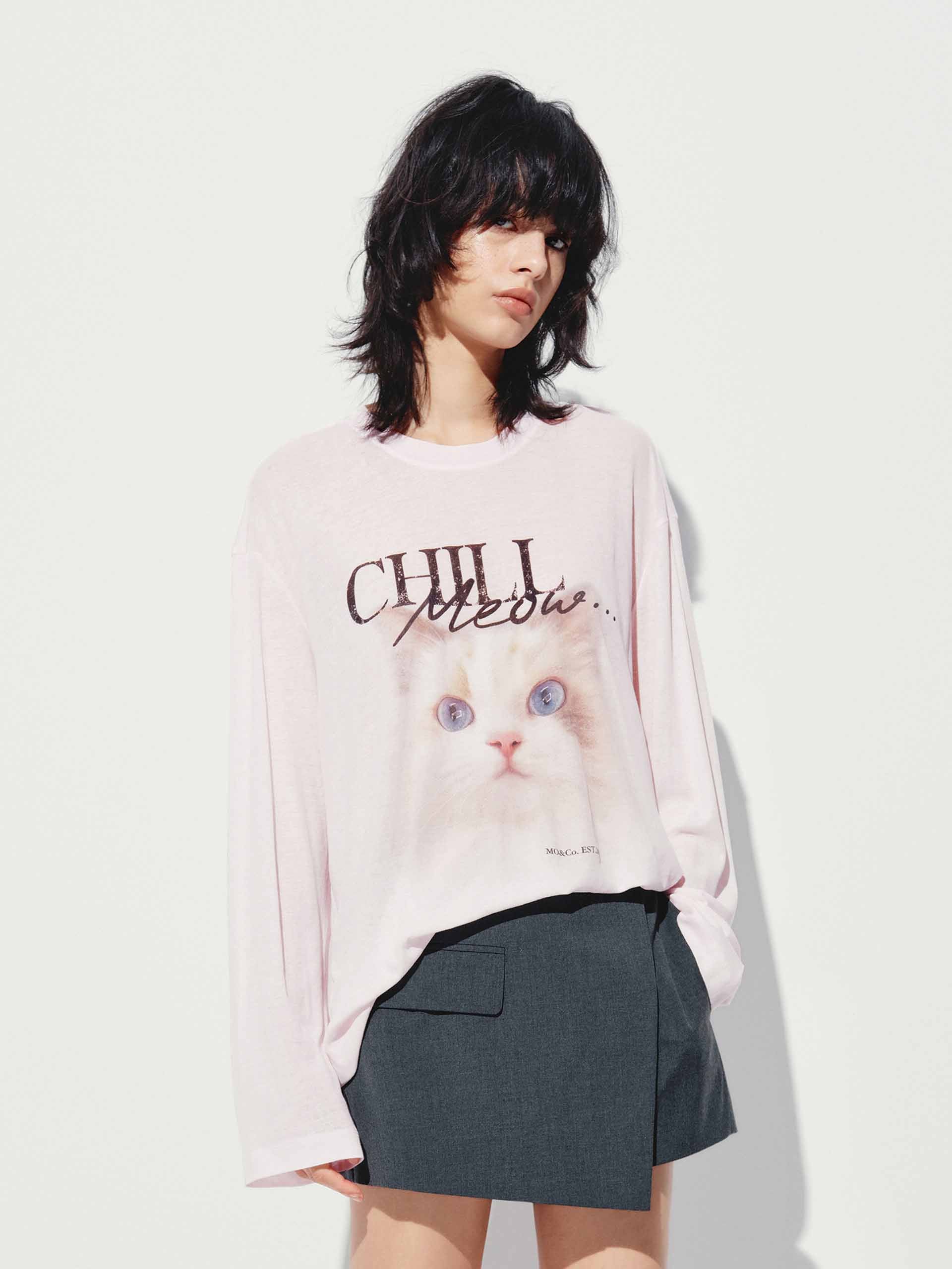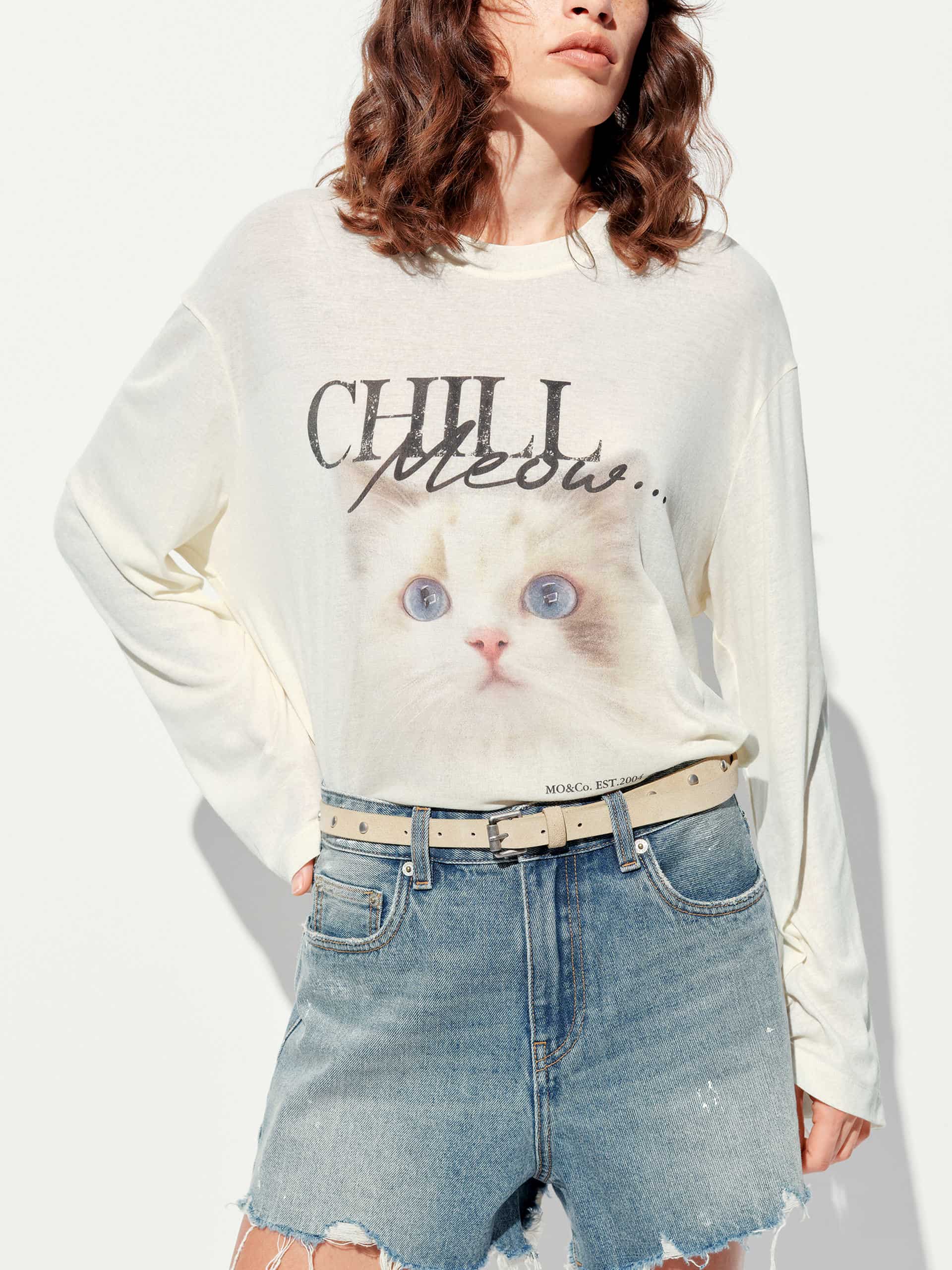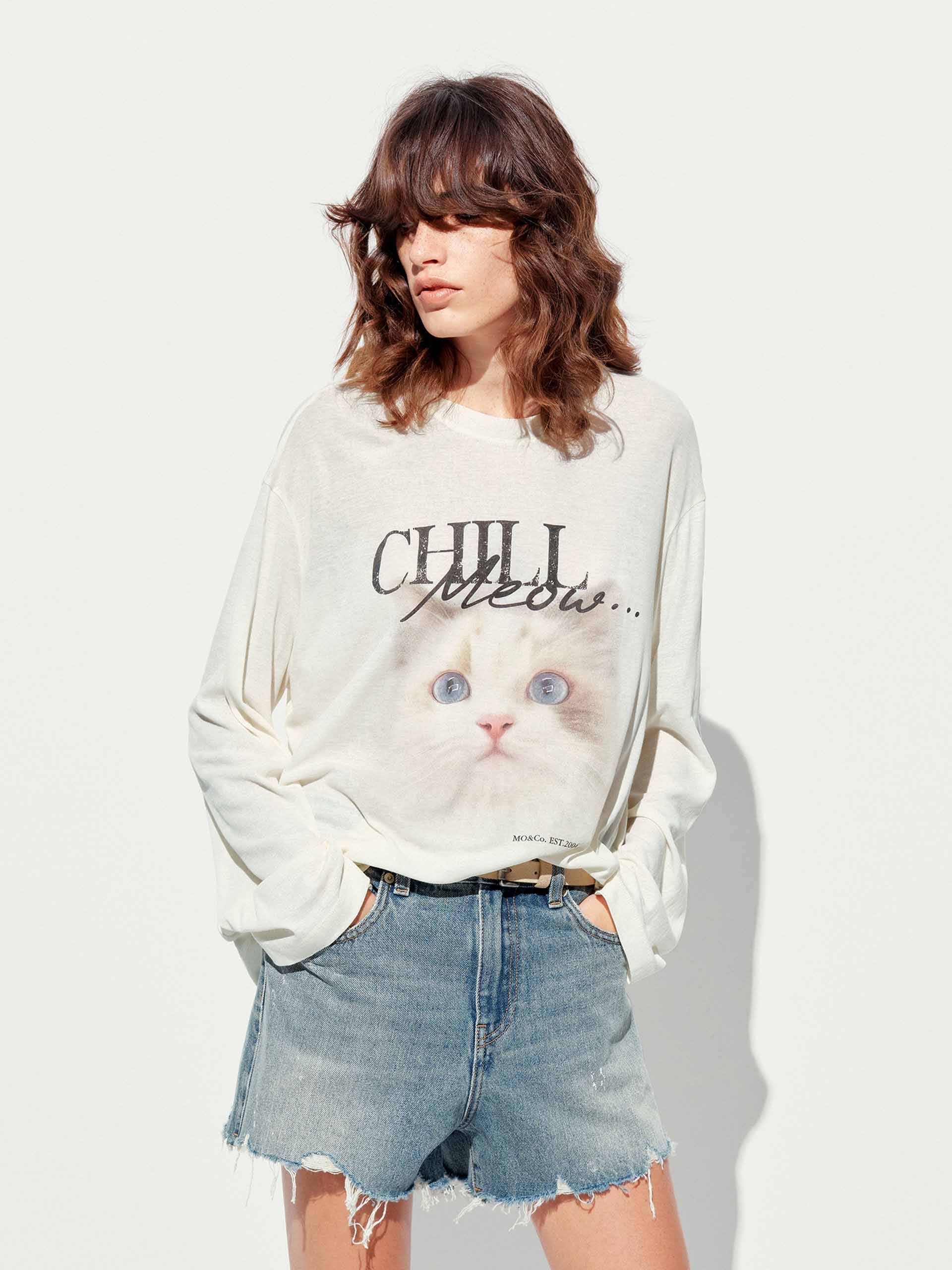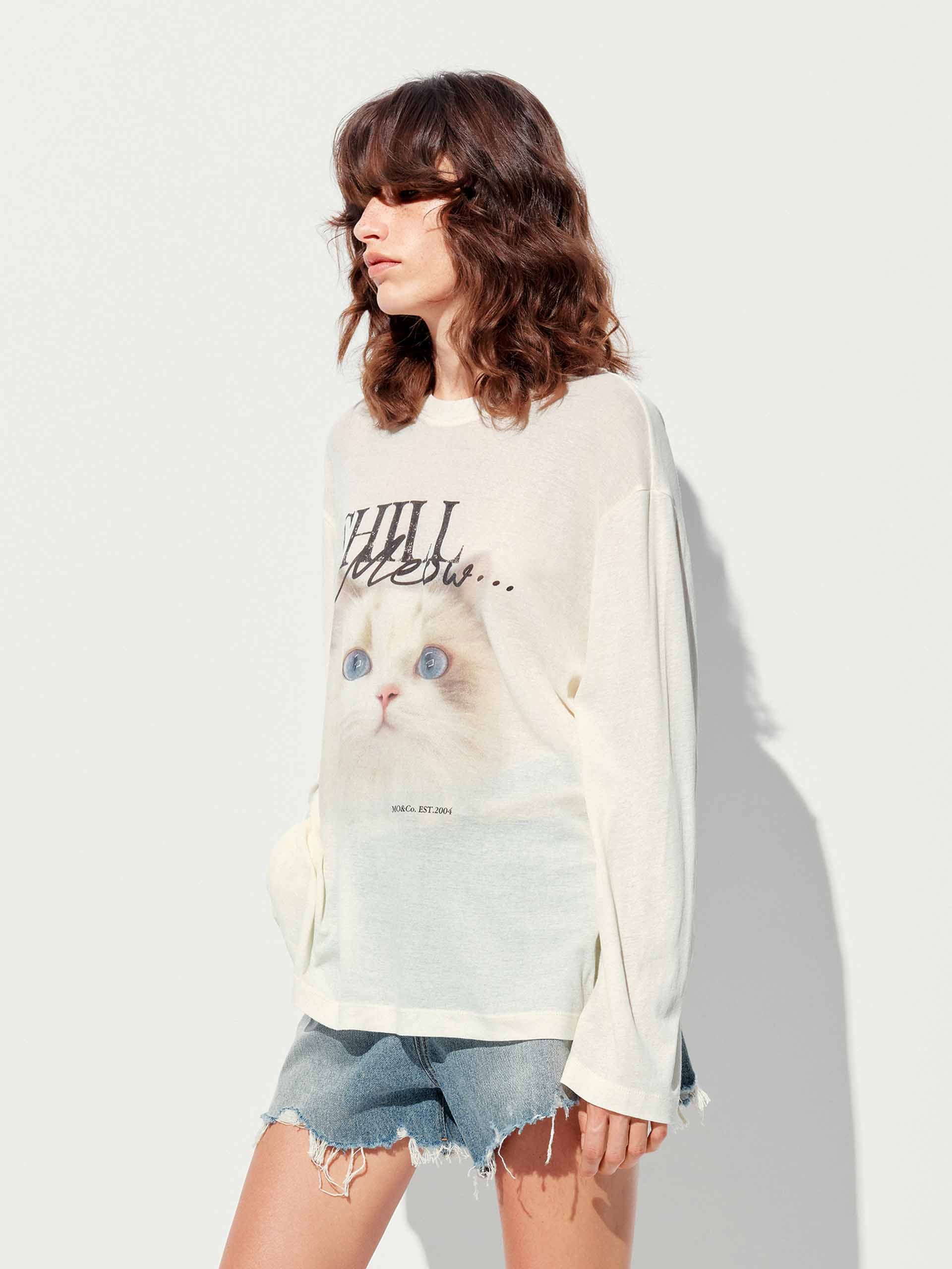 Introducing our cozy T-shirts, crafted from soft and comfortable cotton for ultimate wearability. Designed with a relaxed, easy-going fit, these tees feature stylish drop shoulders and long sleeves for a laid-back vibe. Adding a touch of personality, each shirt showcases a charming front cat design paired with playful slogan print details, making it for everyday comfort and style!