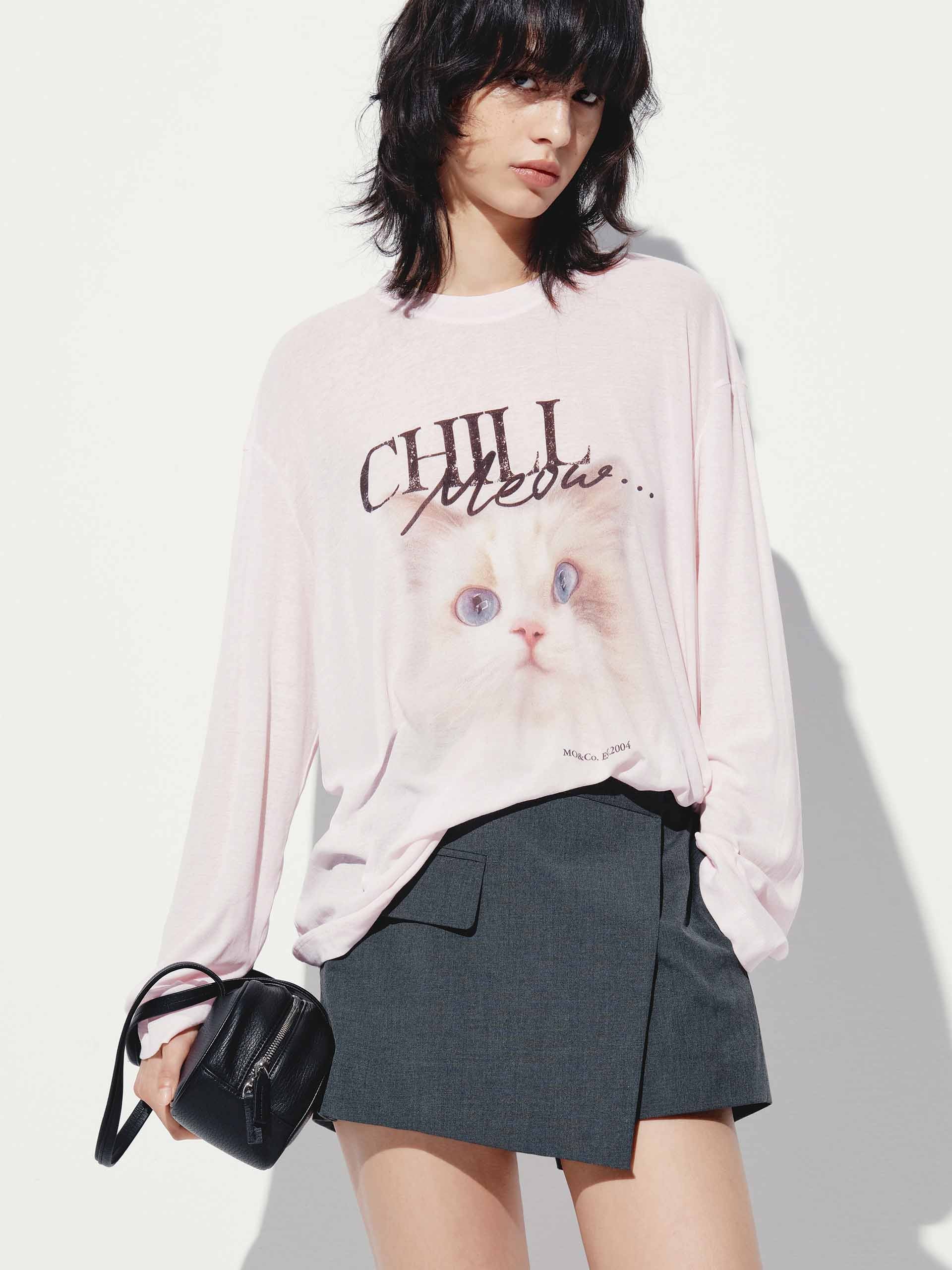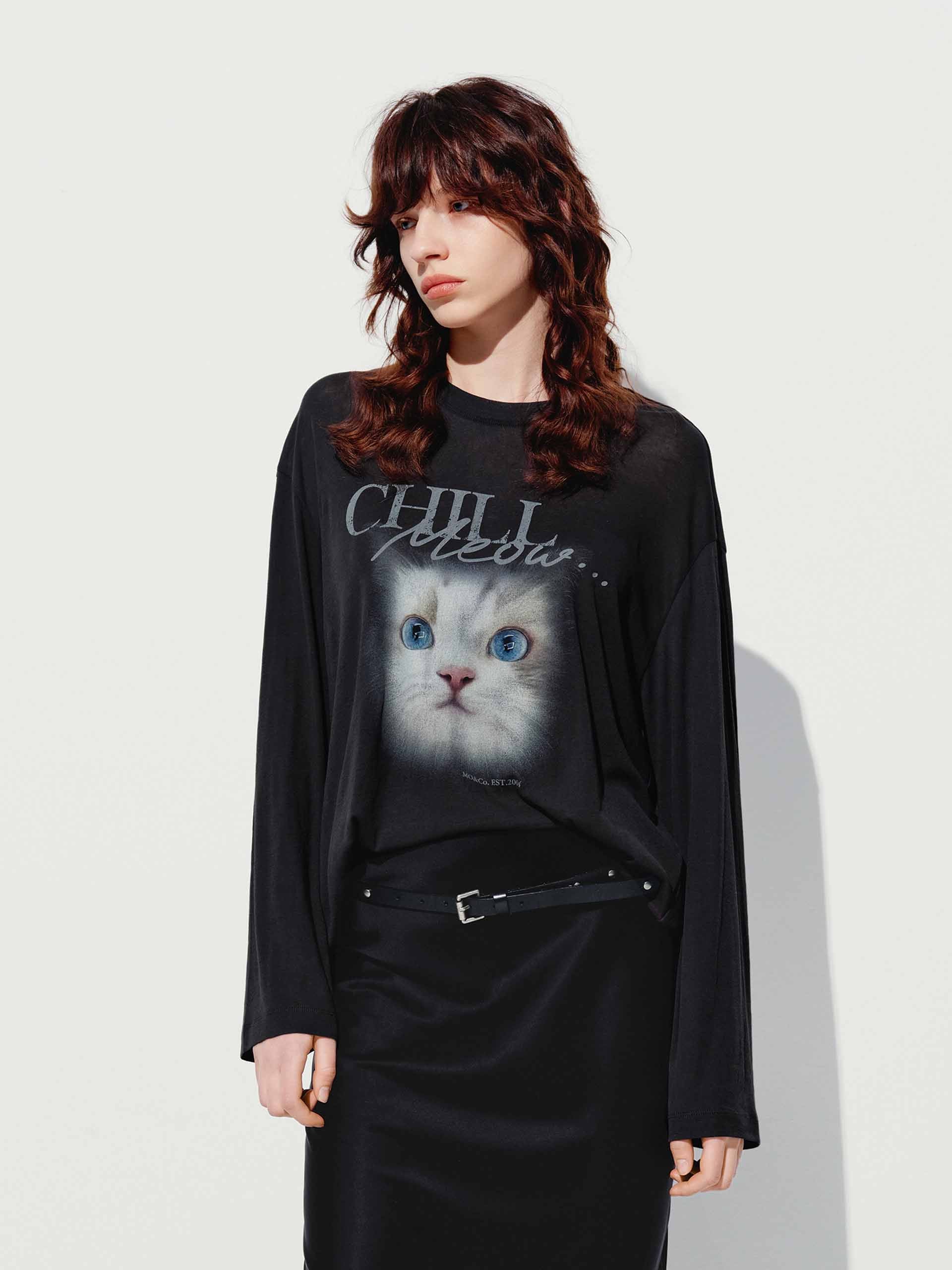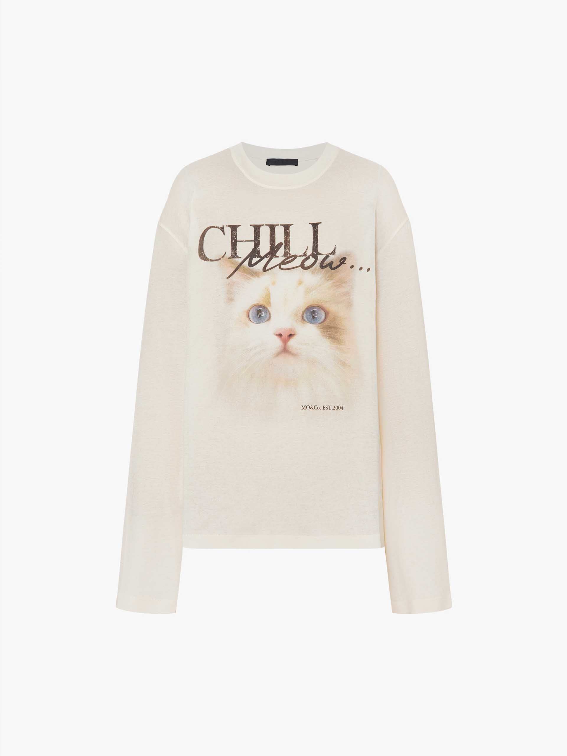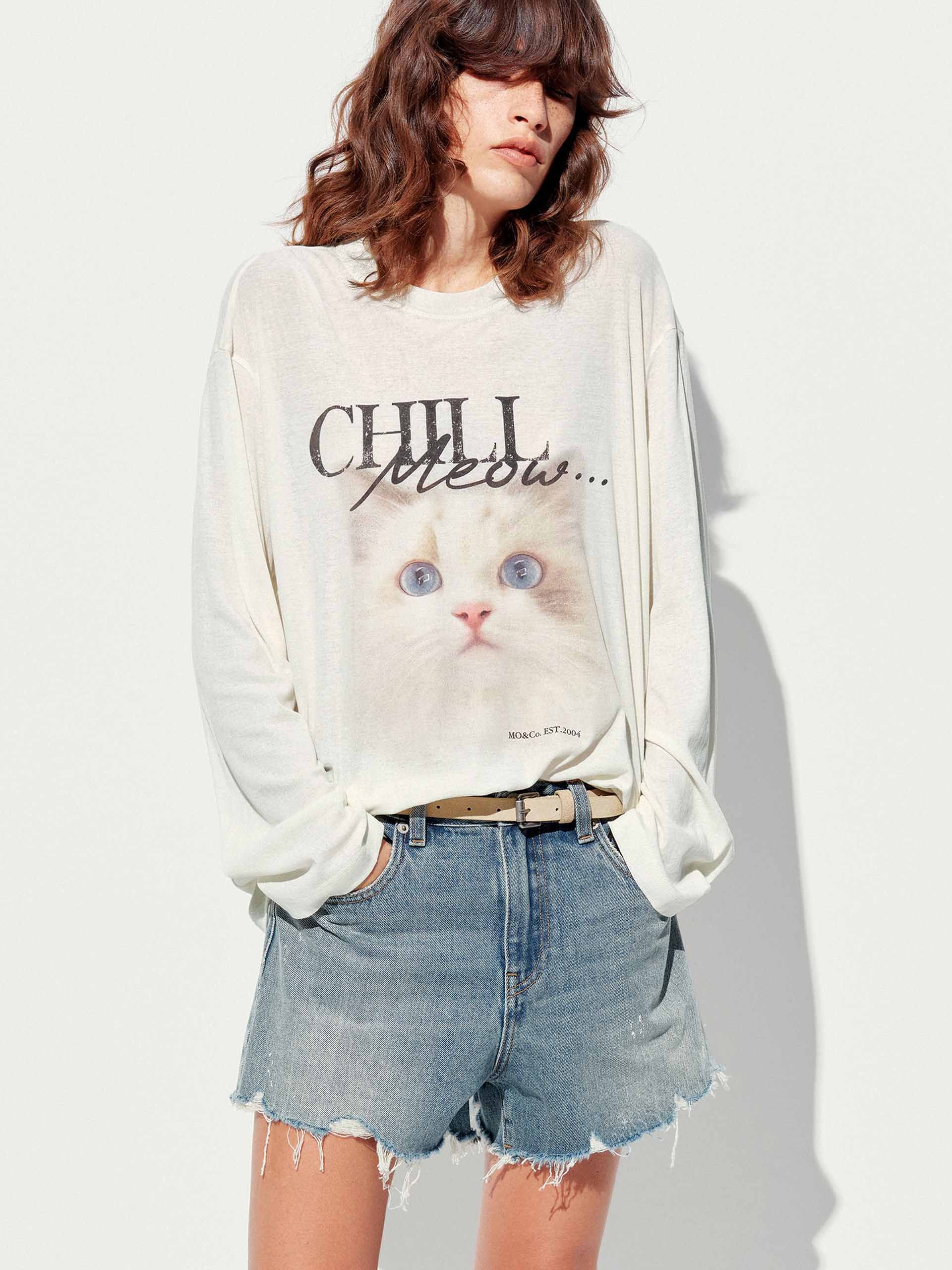 Introducing our cozy T-shirts, crafted from soft and comfortable cotton for ultimate wearability. Designed with a relaxed, easy-going fit, these tees feature stylish drop shoulders and long sleeves for a laid-back vibe. Adding a touch of personality, each shirt showcases a charming front cat design paired with playful slogan print details, making it for everyday comfort and style!