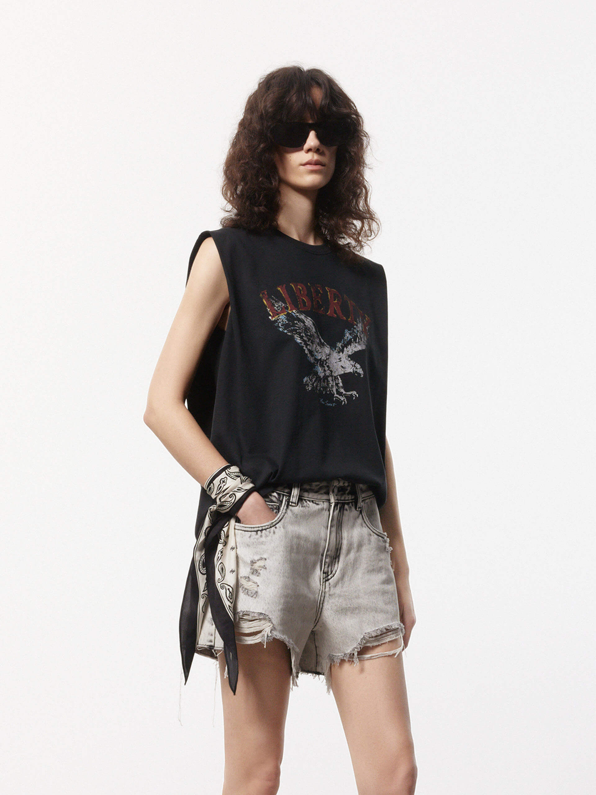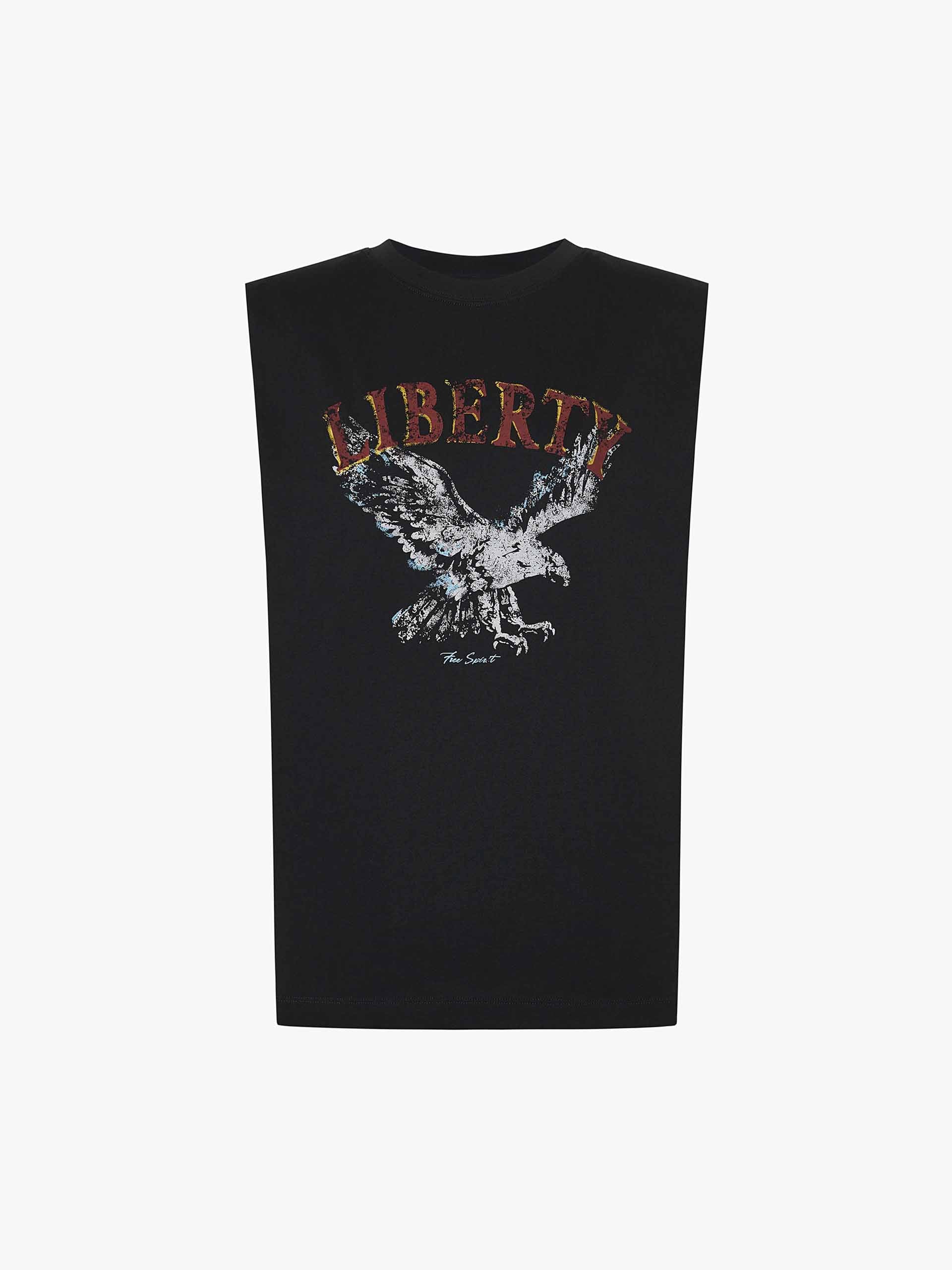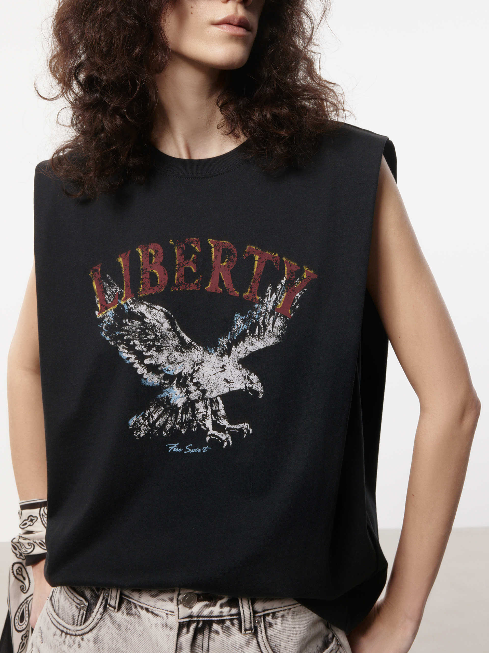 This T-shirt is made from soft and comfortable cotton, perfect for everyday wear. It has wide shoulders and padded shoulders, adding a touch of style and structure to the design. The bold front lettering and eagle print create a retro feel.