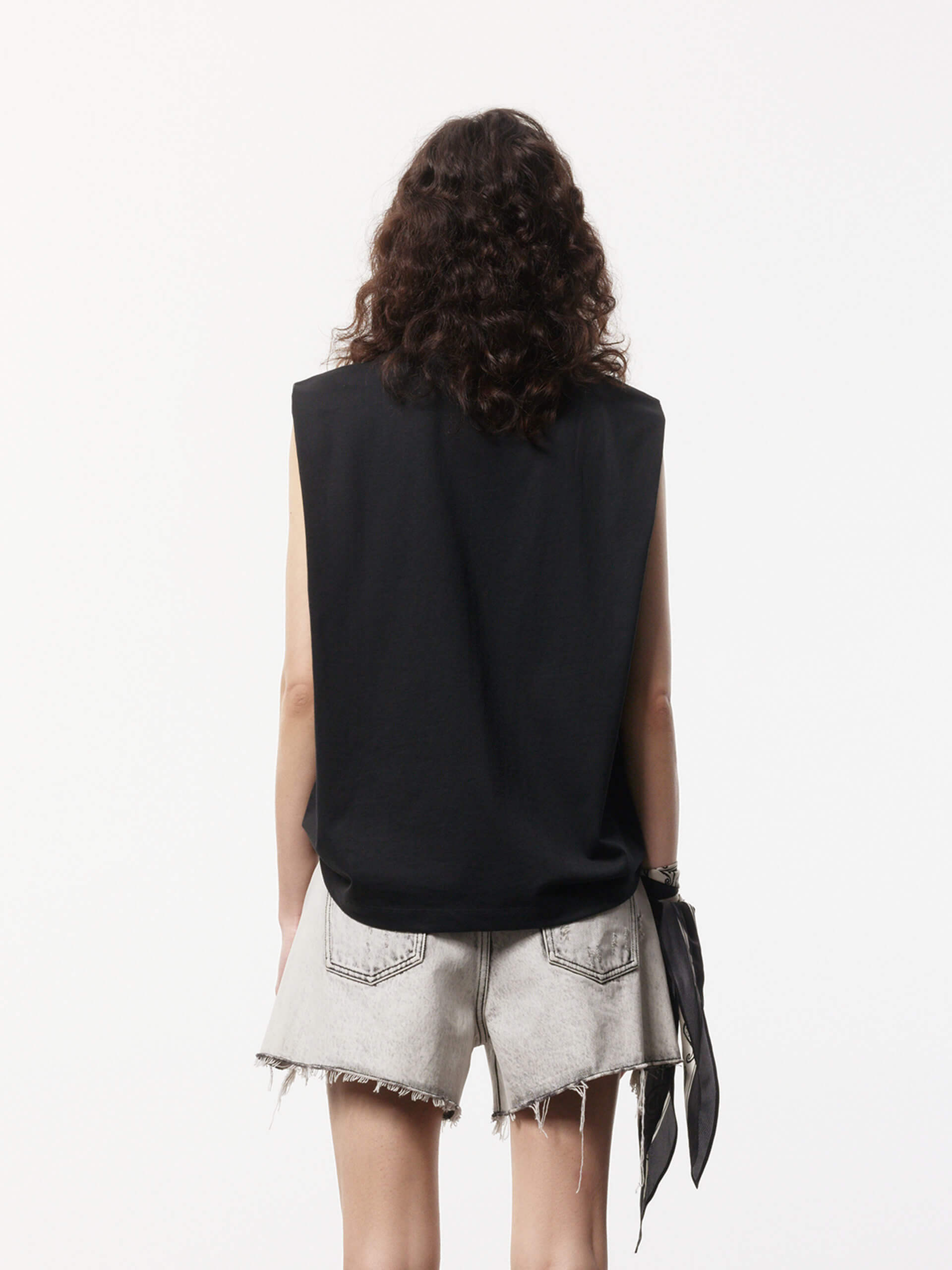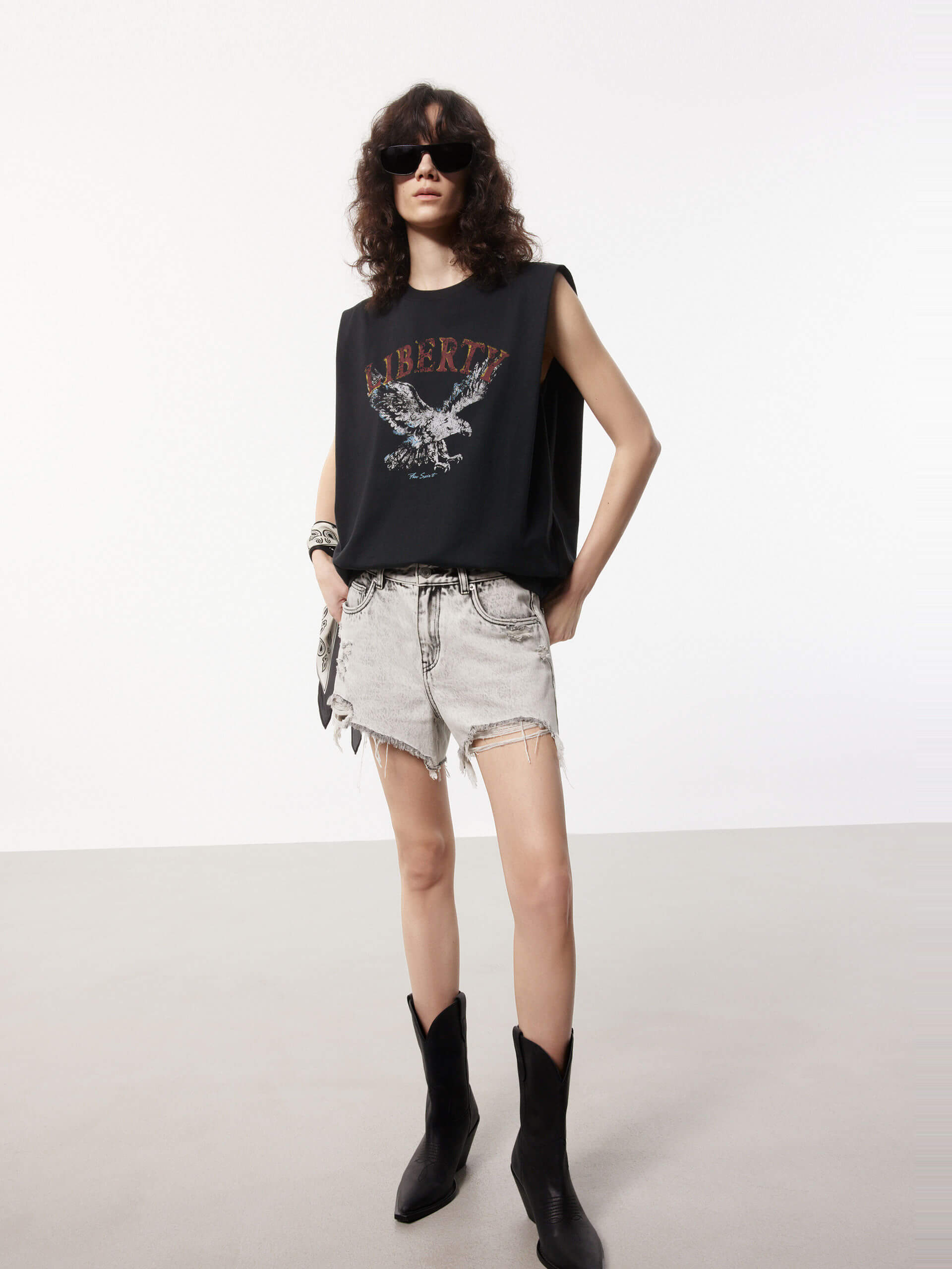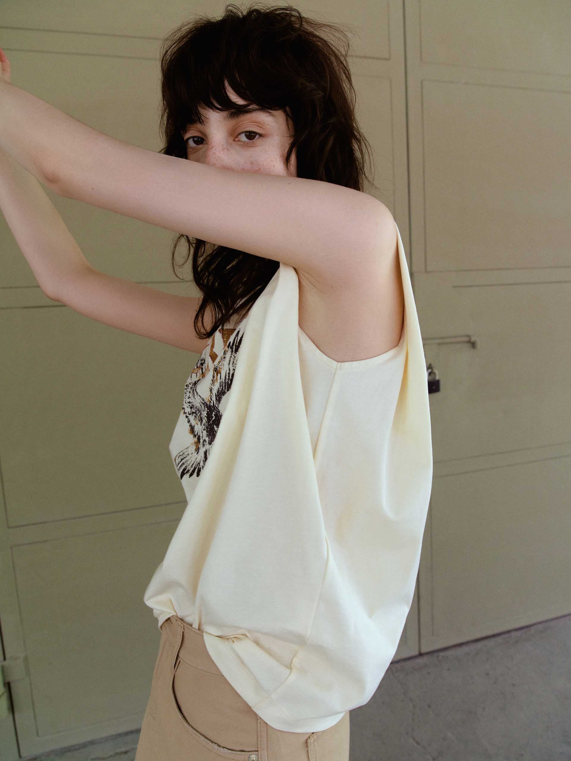 This T-shirt is made from soft and comfortable cotton, perfect for everyday wear. It has wide shoulders and padded shoulders, adding a touch of style and structure to the design. The bold front lettering and eagle print create a retro feel.