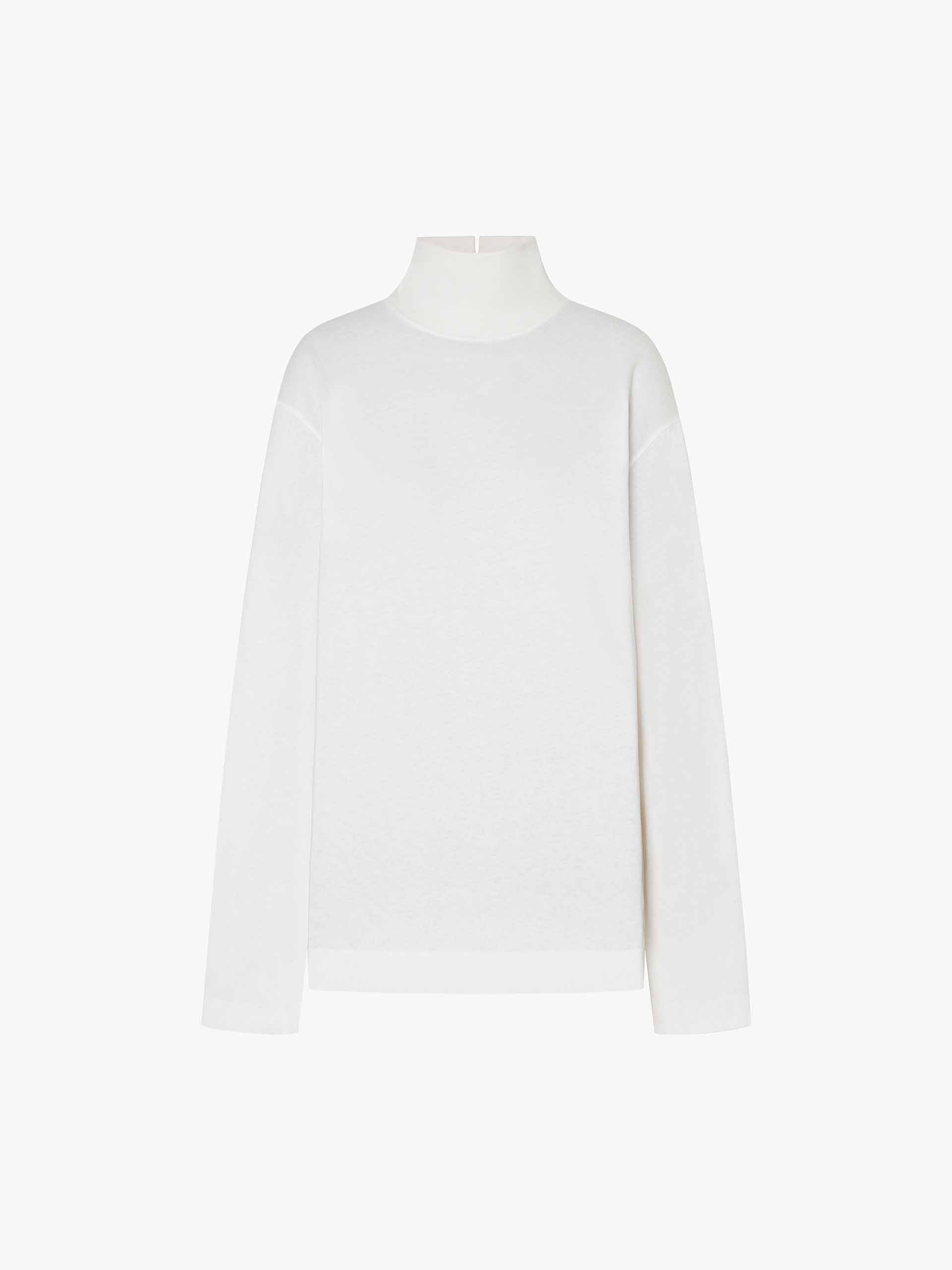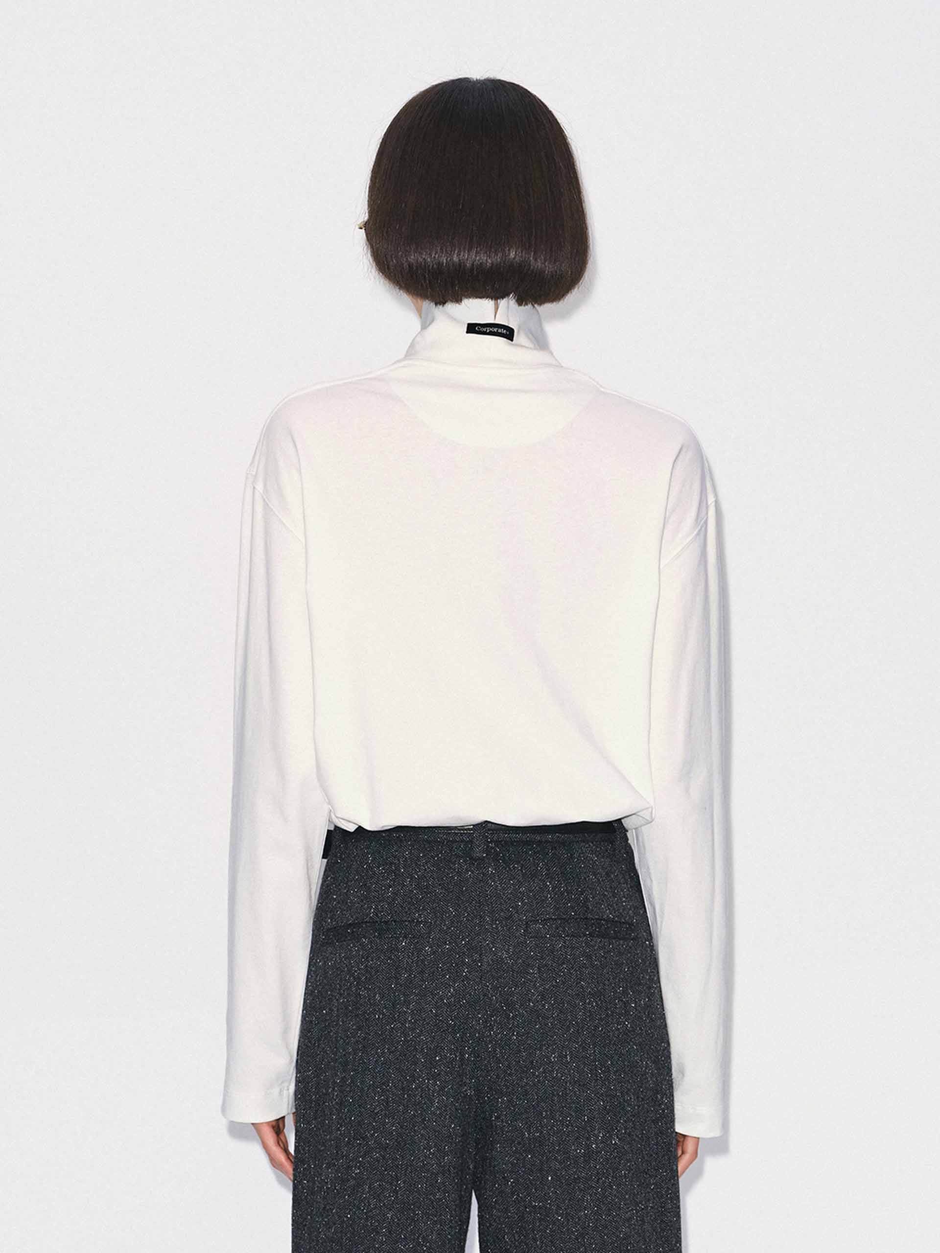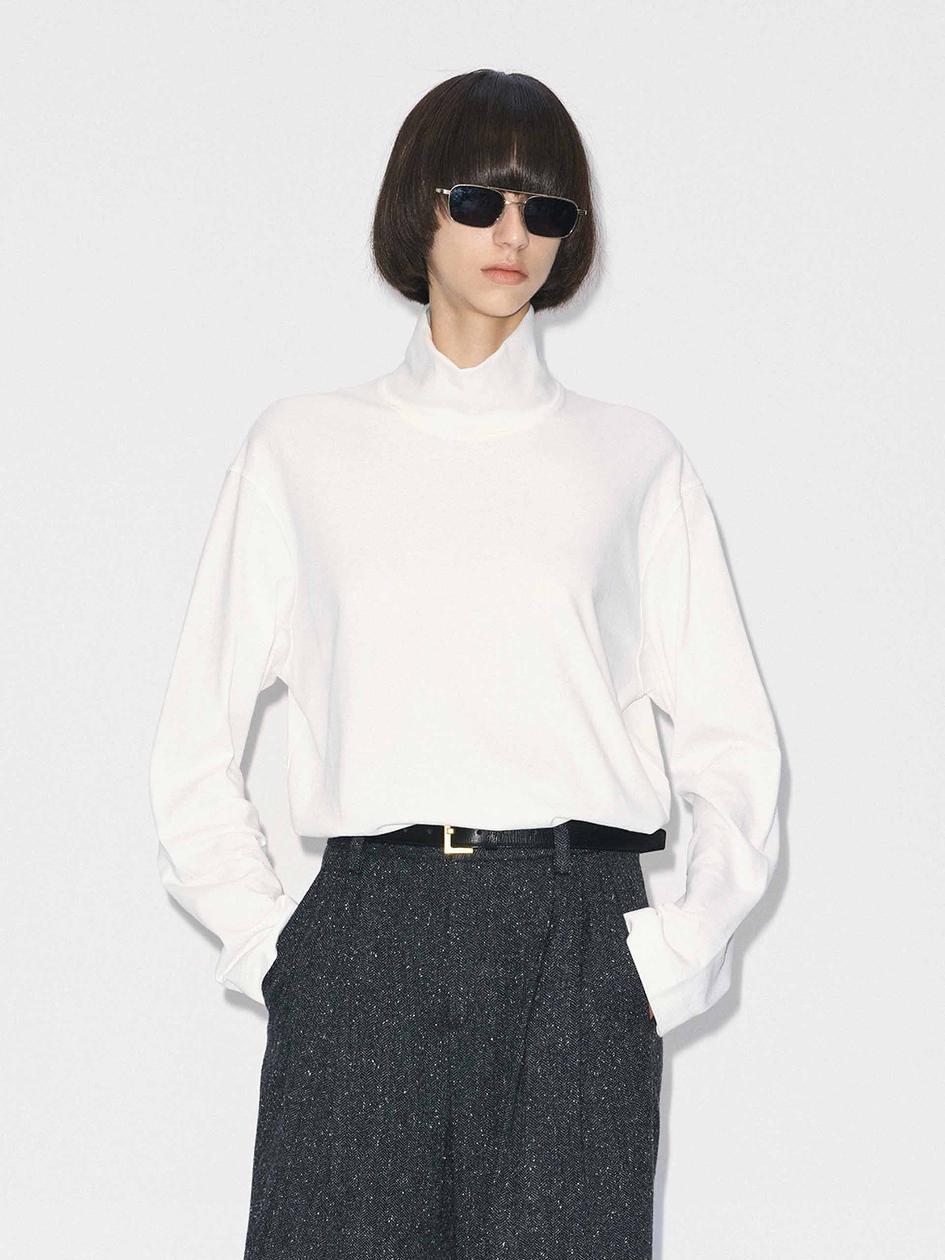 Embrace minimalist comfort with this T-shirt, cut in an easy relaxed fit for unrestrained movement and casual style. The sleek turtleneck collar and long sleeves create a clean, modern silhouette perfect for layering. Featuring a subtle woven label at the back and crafted from breathable 100% cotton, this essential piece champions understated design and everyday softness.