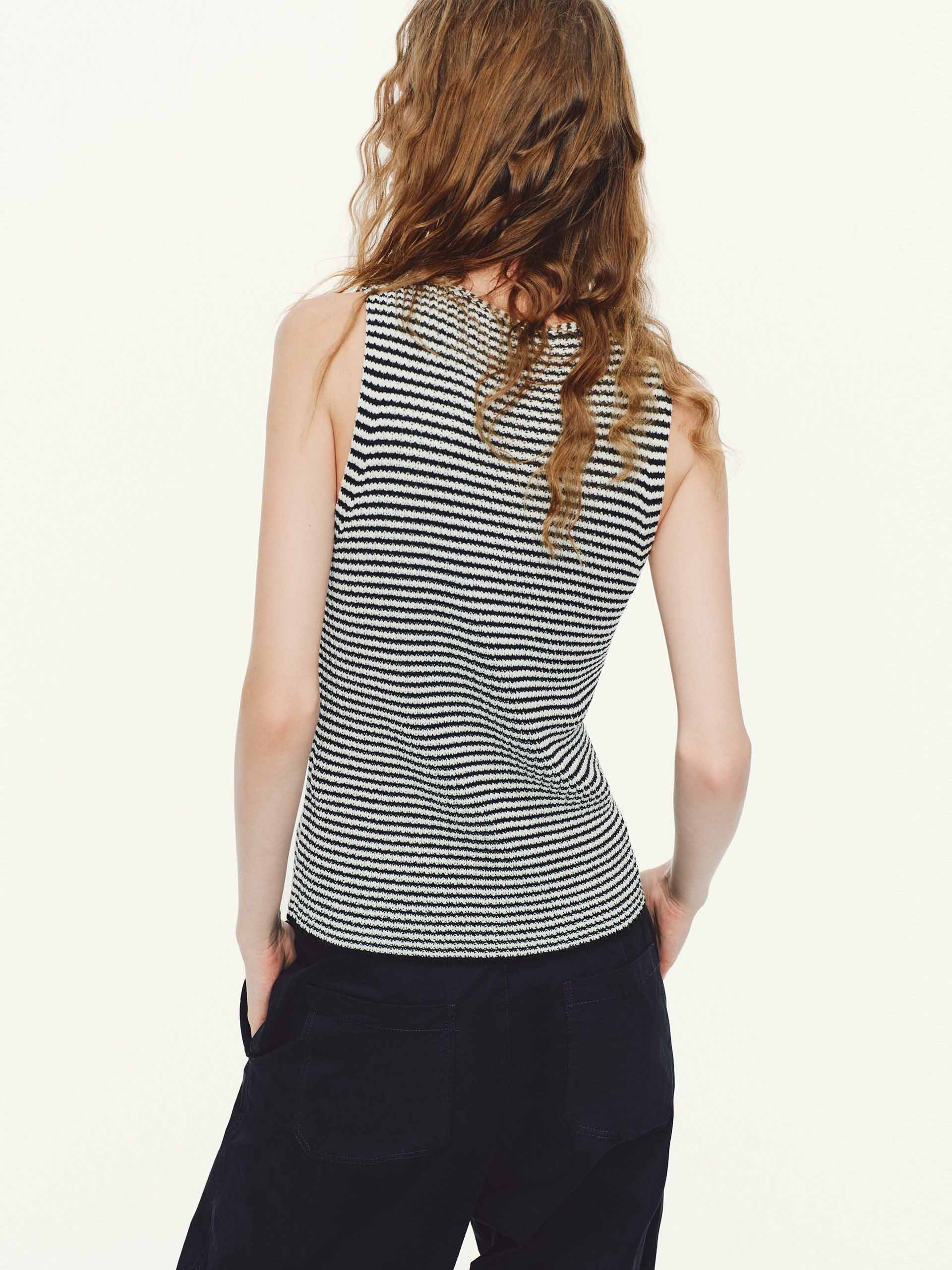 Elevate your spring style with this chic, sleeveless knit cardigan. Crafted from cozy materials with wool and cotton, it offers a luxurious, breathable feel with a body-contouring slim fit. Featuring a classic black-and-white striped design and a refined button closure, this versatile piece can be worn as a polished top or a layered vest.