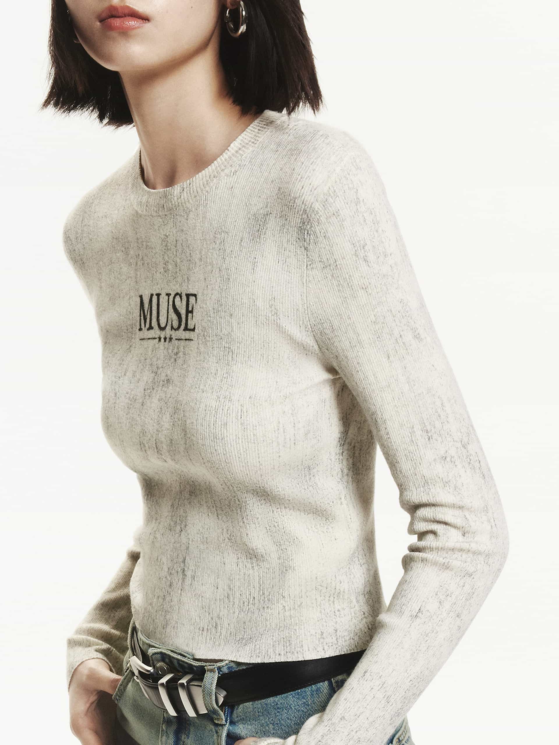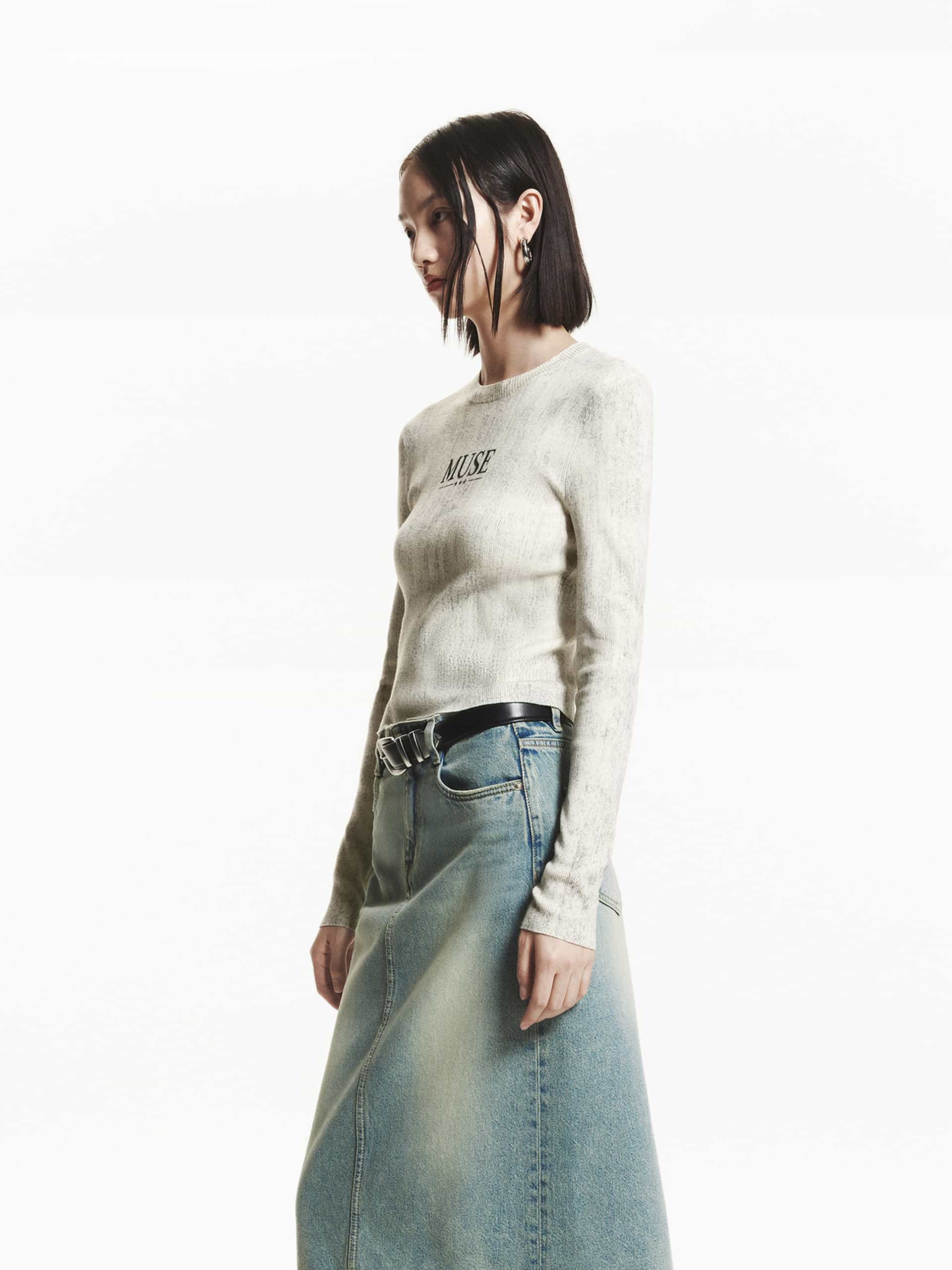 Made from stretchy knit materials, this top offers a comfortable and flattering fit. The round neck design and front letter print add a touch of chic style, while the light grey brush effect creates a subtle, eye-catching look.