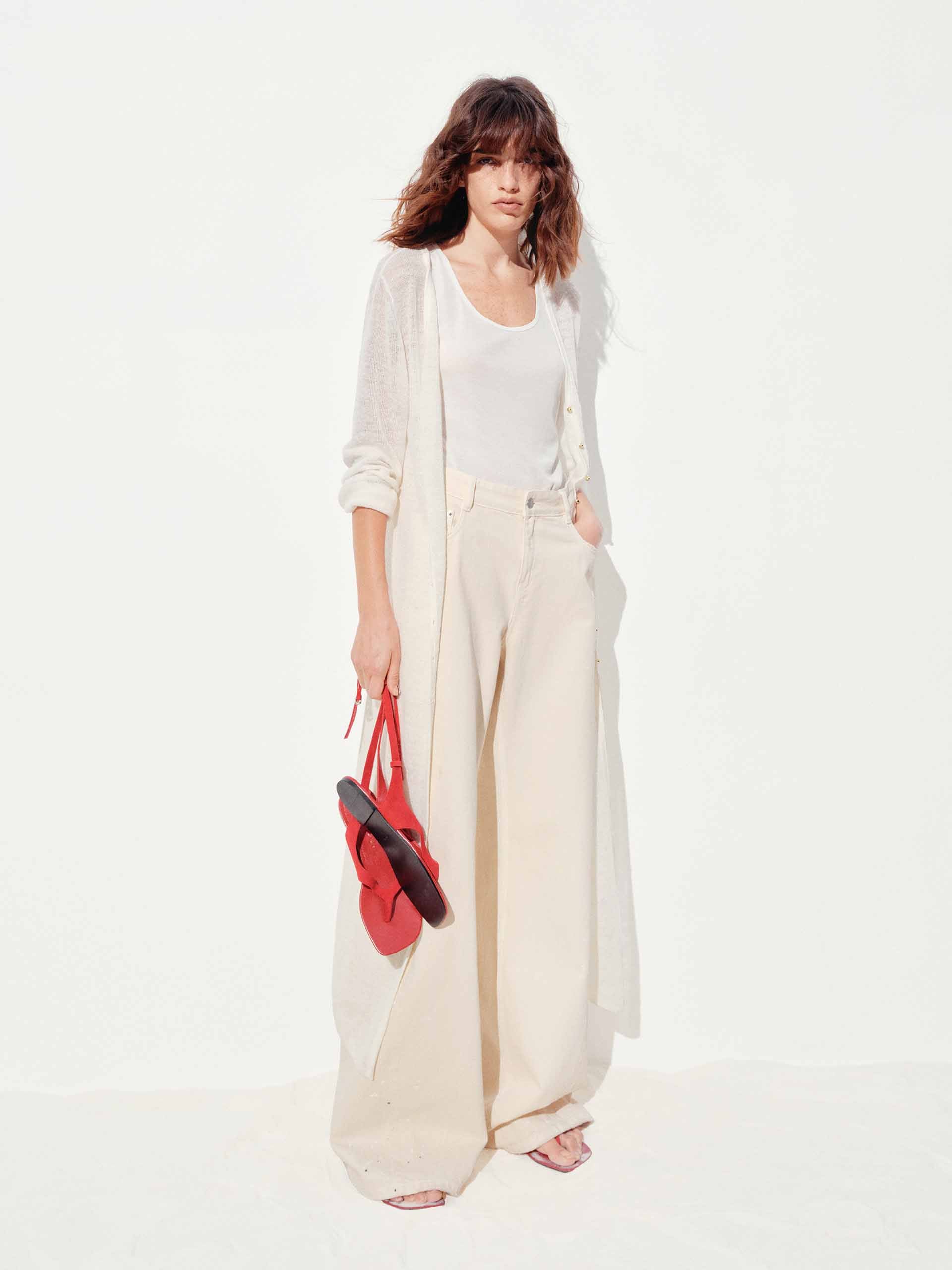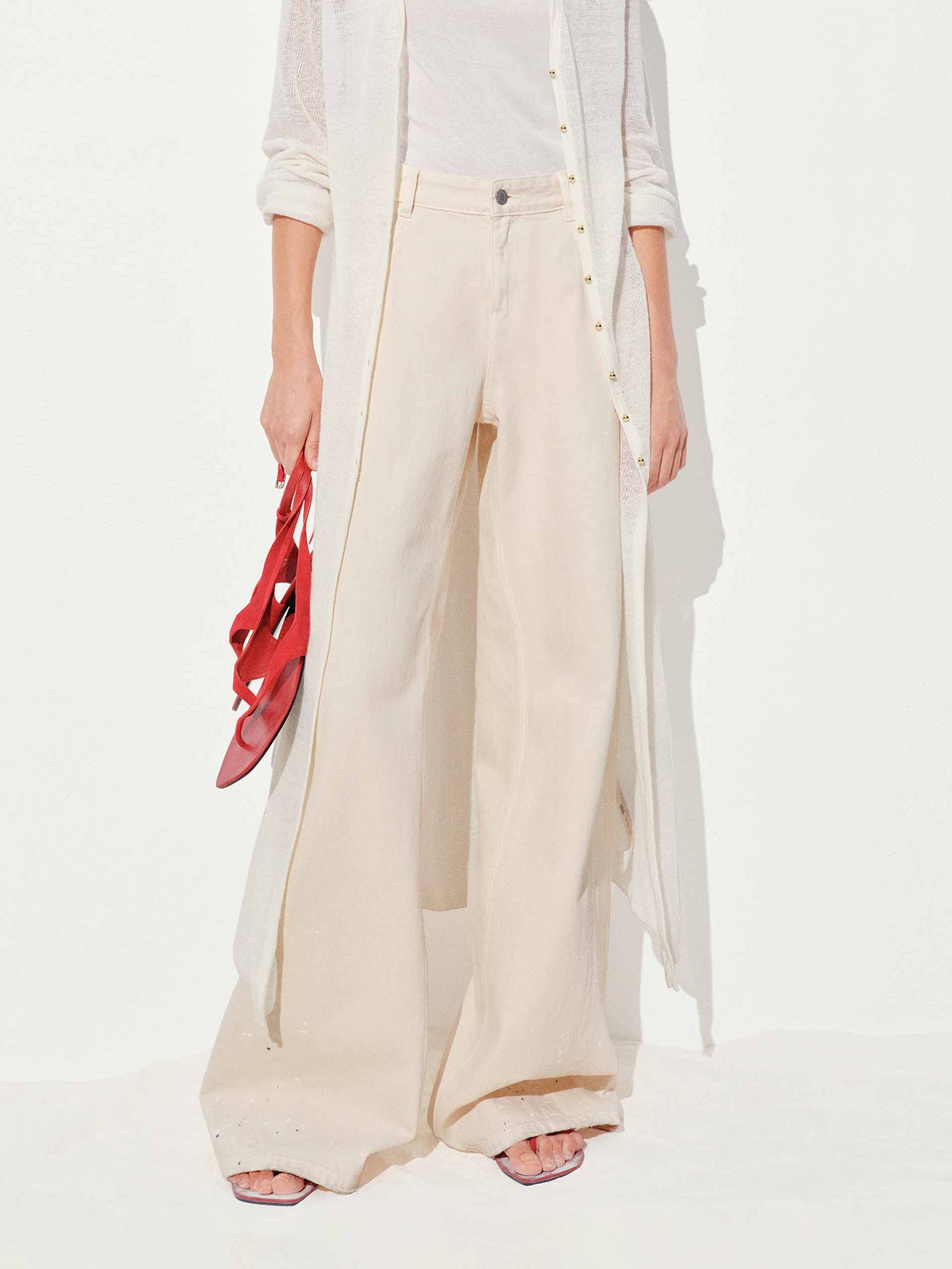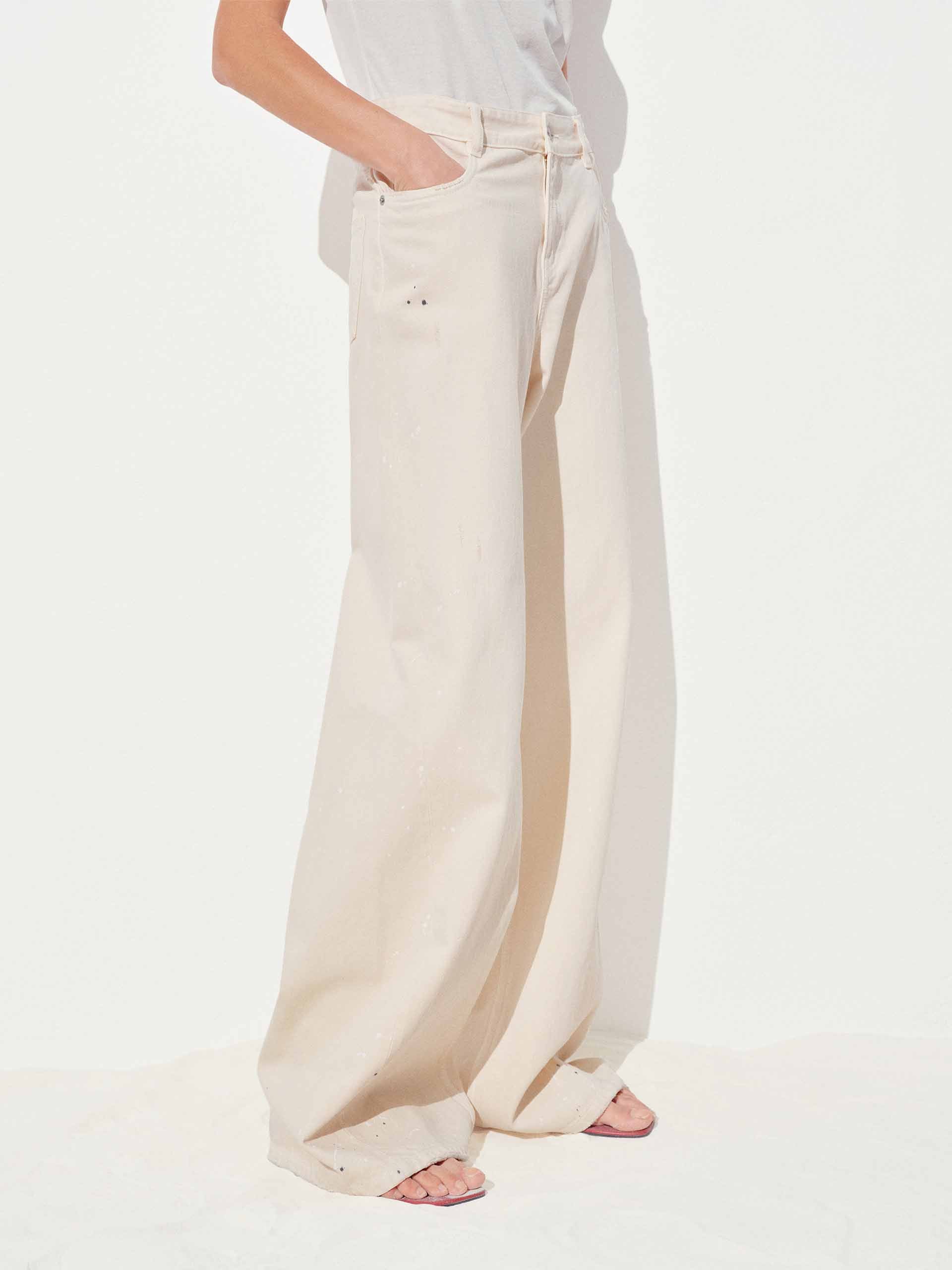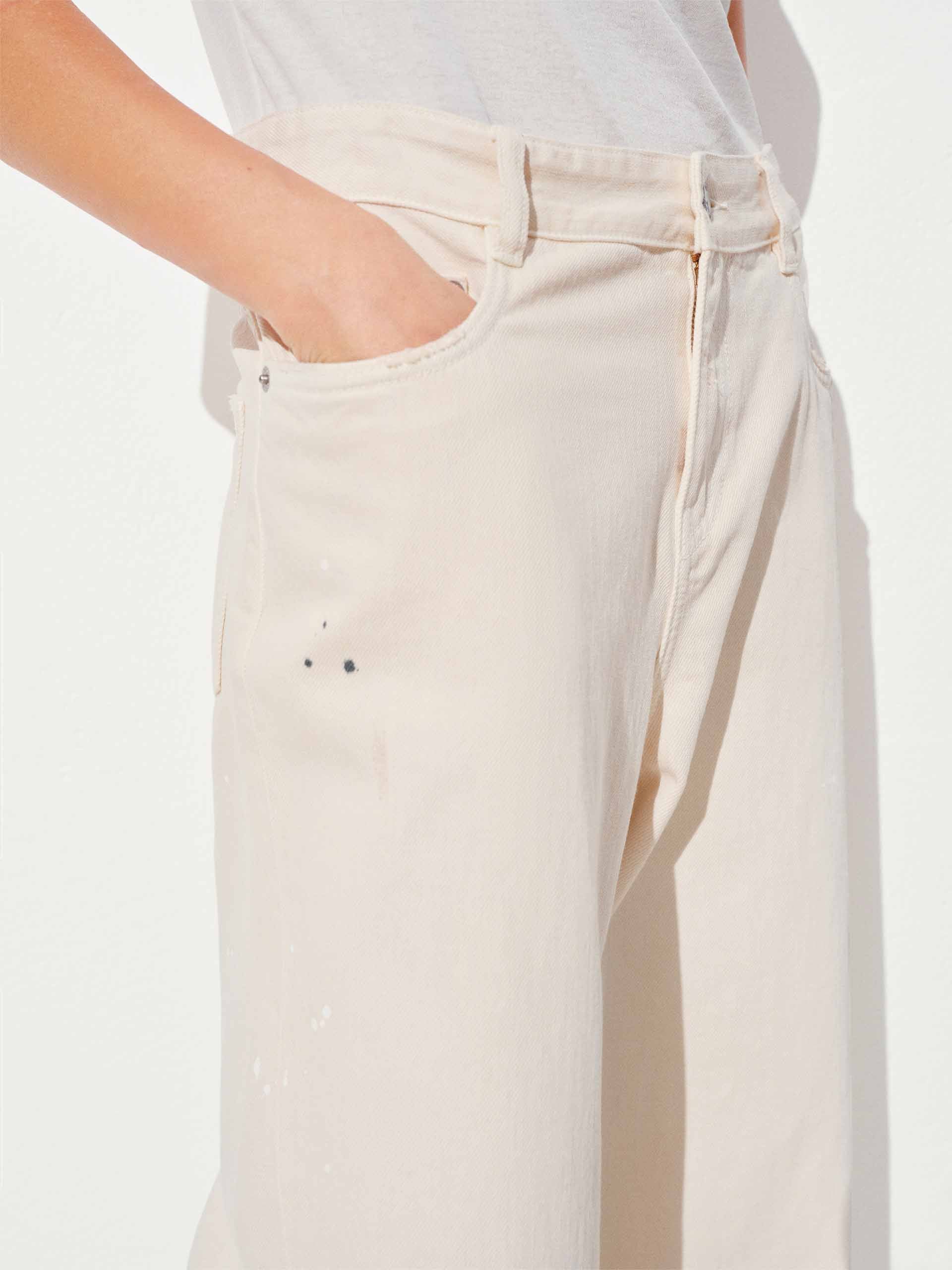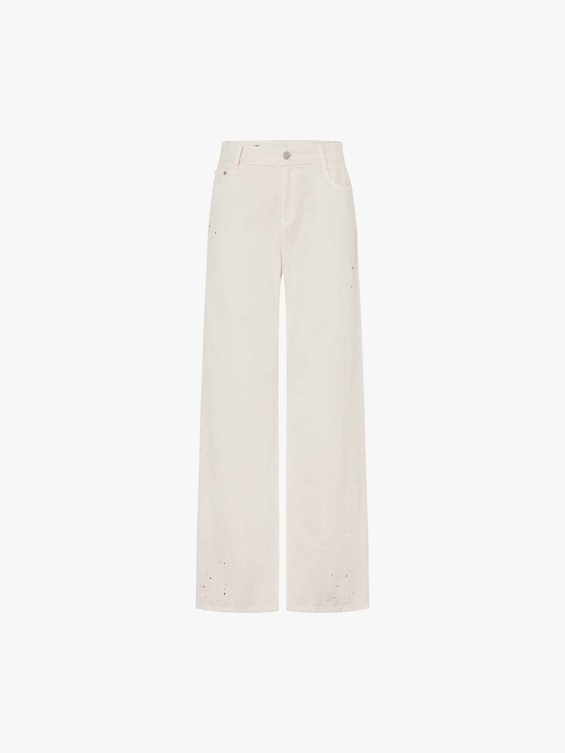 Make an artistic statement in these bold ink-splashed jeans, where creative flair meets vintage-inspired comfort. The relaxed wide-leg silhouette flows into a full-length cut. The zip-fly and button closure ensures a secure fit. Designed with classic five-pocket functionality and a premium leather logo patch, these jeans blend practicality with designer details.