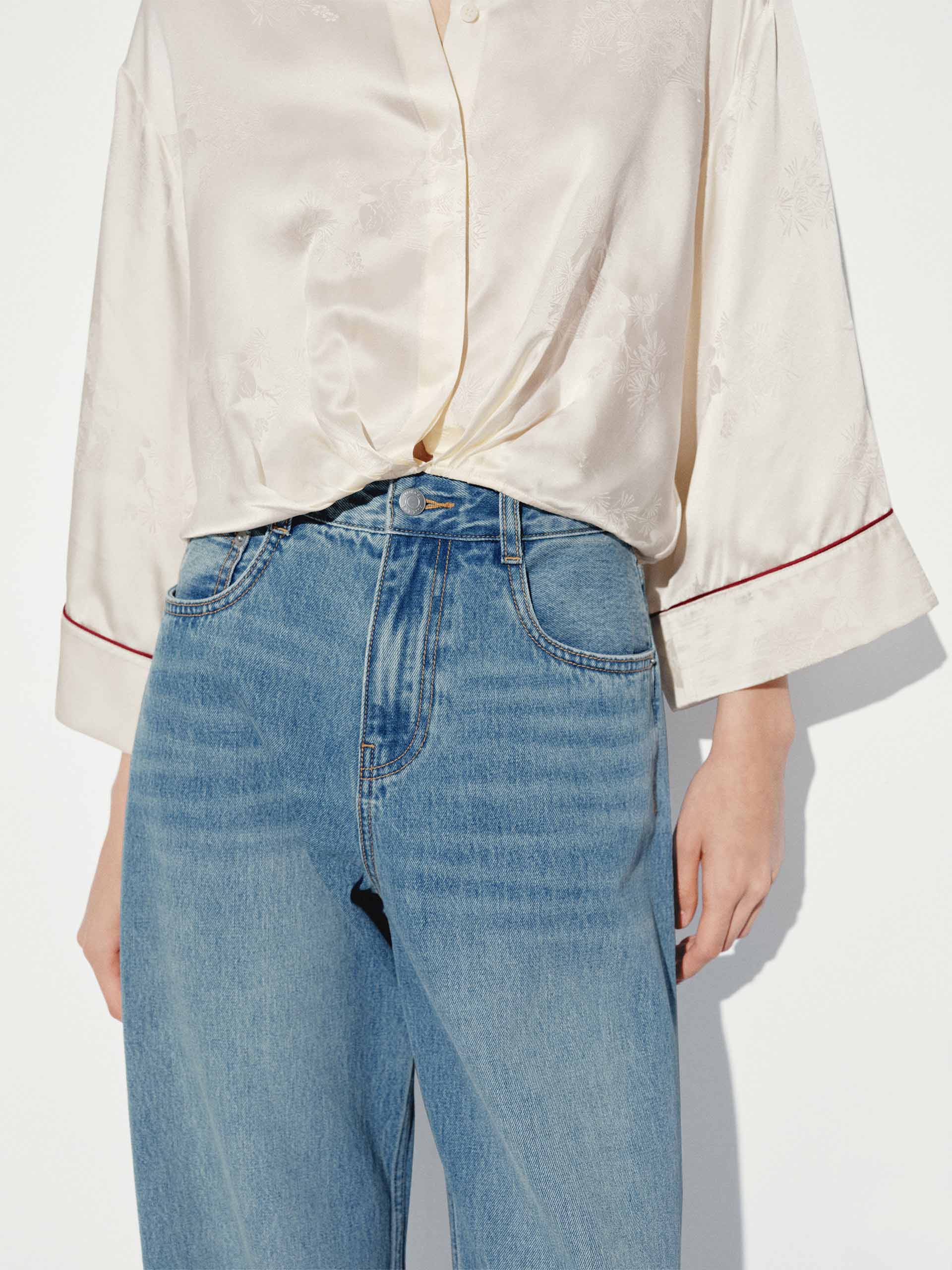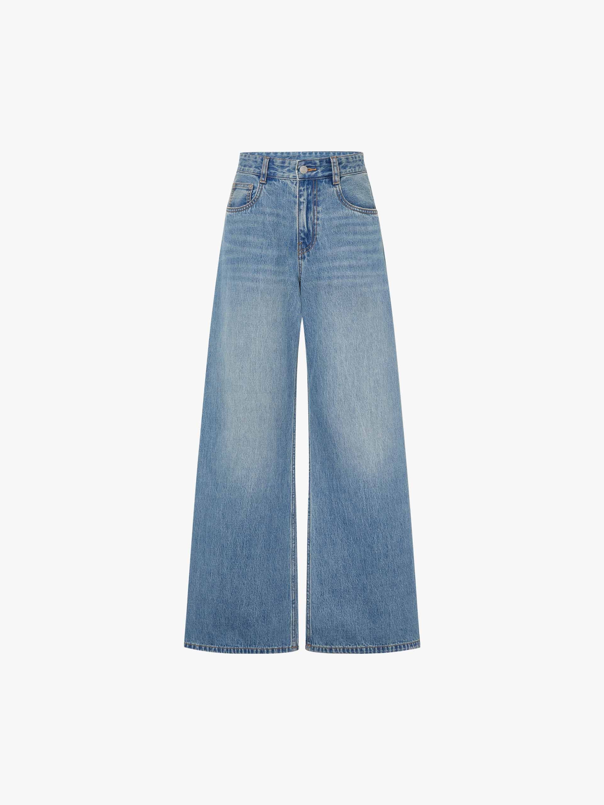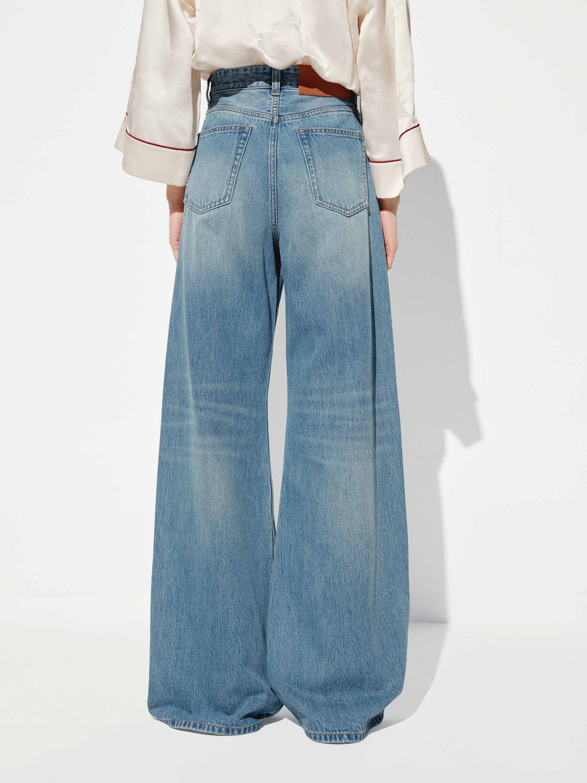 These stylish jeans are crafted from soft, comfortable cotton, offering a relaxed and cozy fit. The lightly faded blue wash gives them a vintage, lived-in look, perfect for casual wear. Designed with a wide-leg, full-length silhouette, they provide a modern, effortless style that pairs well with various outfits.