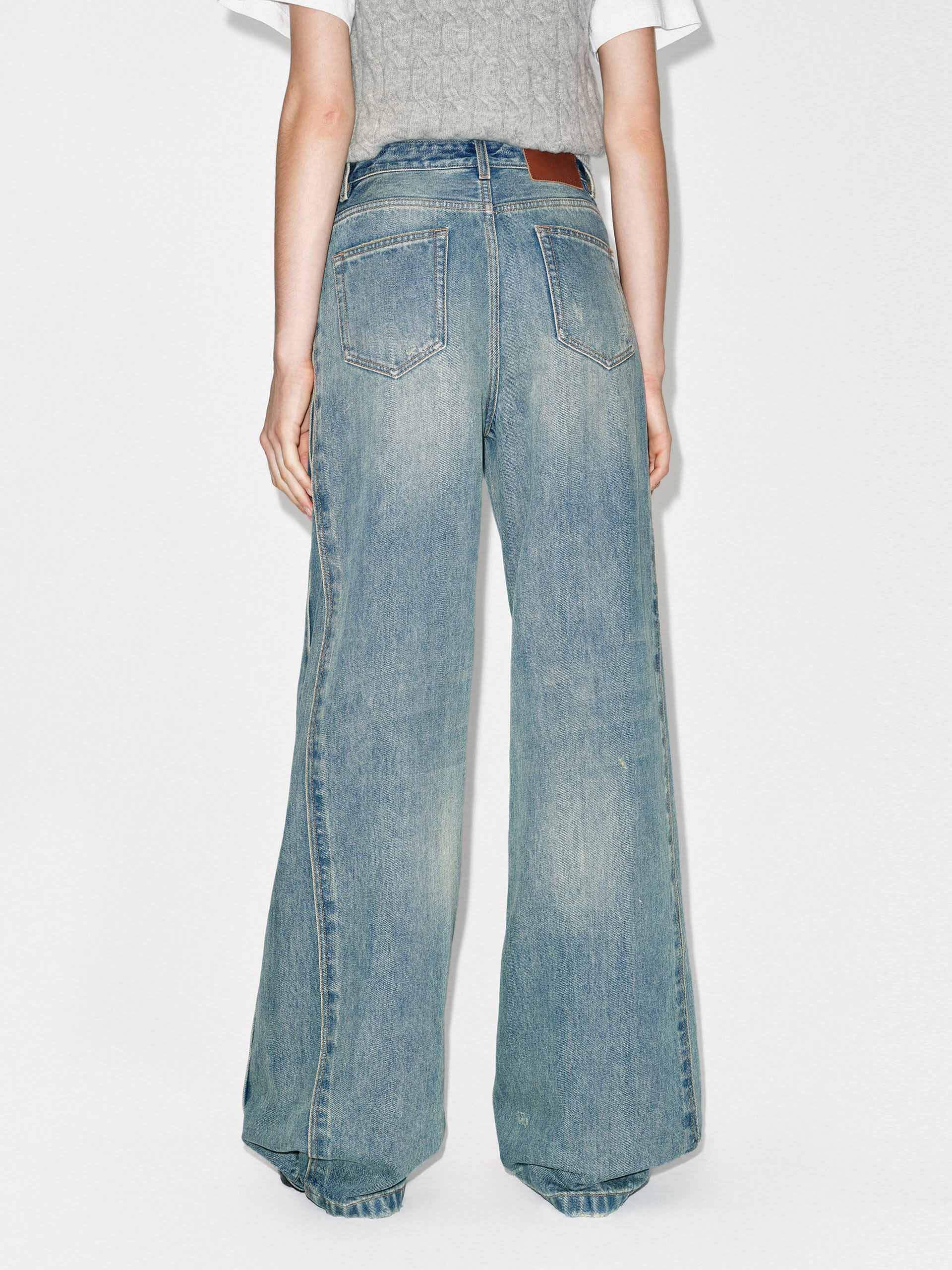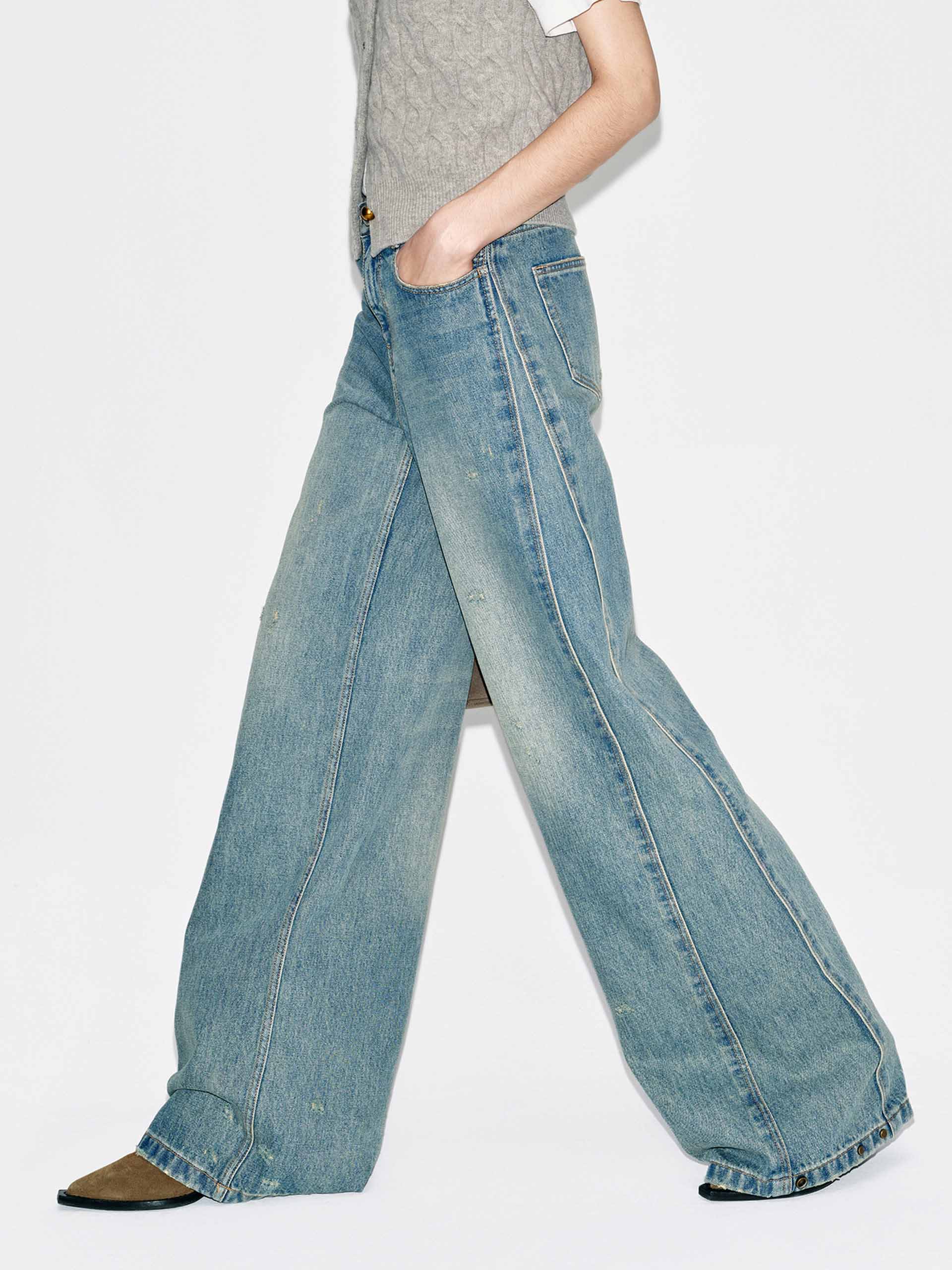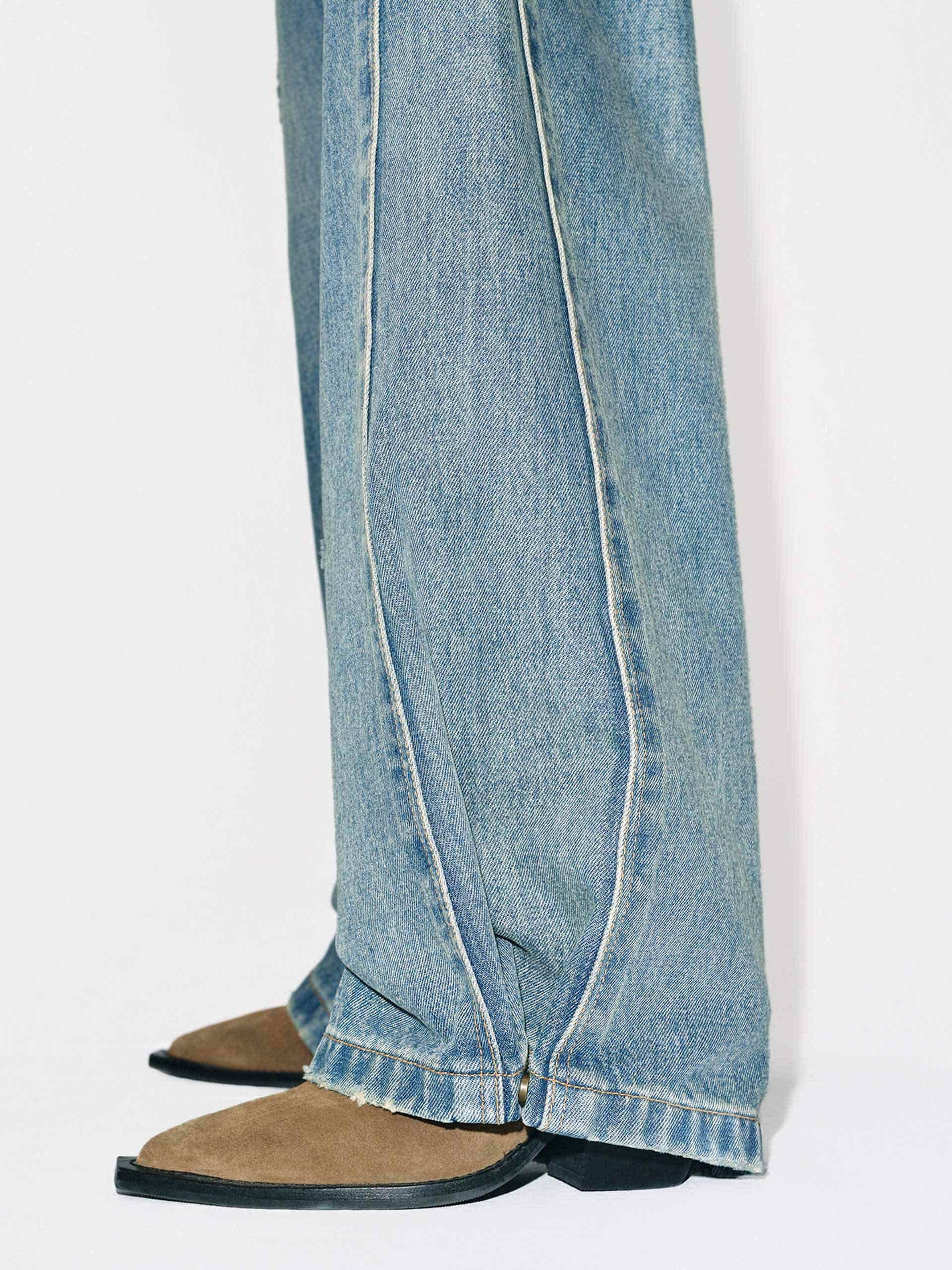 Elevate your denim collection with these jeans, where timeless style meets modern edge. Detailed with bold side seams that highlight the clean silhouette, they feature carefully placed ripped accents for a touch of rebellious flair. The unique snap button at the hem adds an unexpected detail, allowing subtle customization and a contemporary finish.