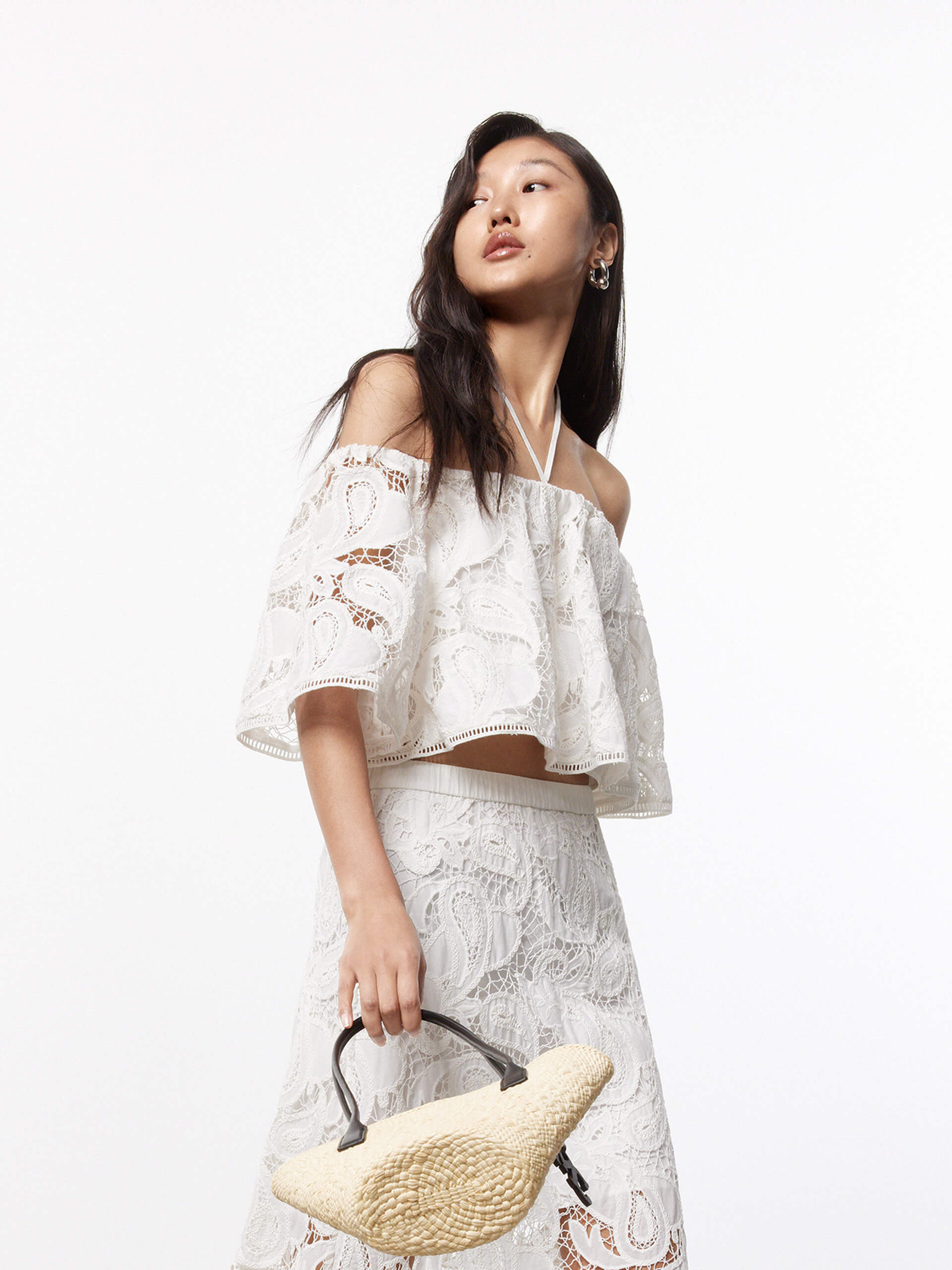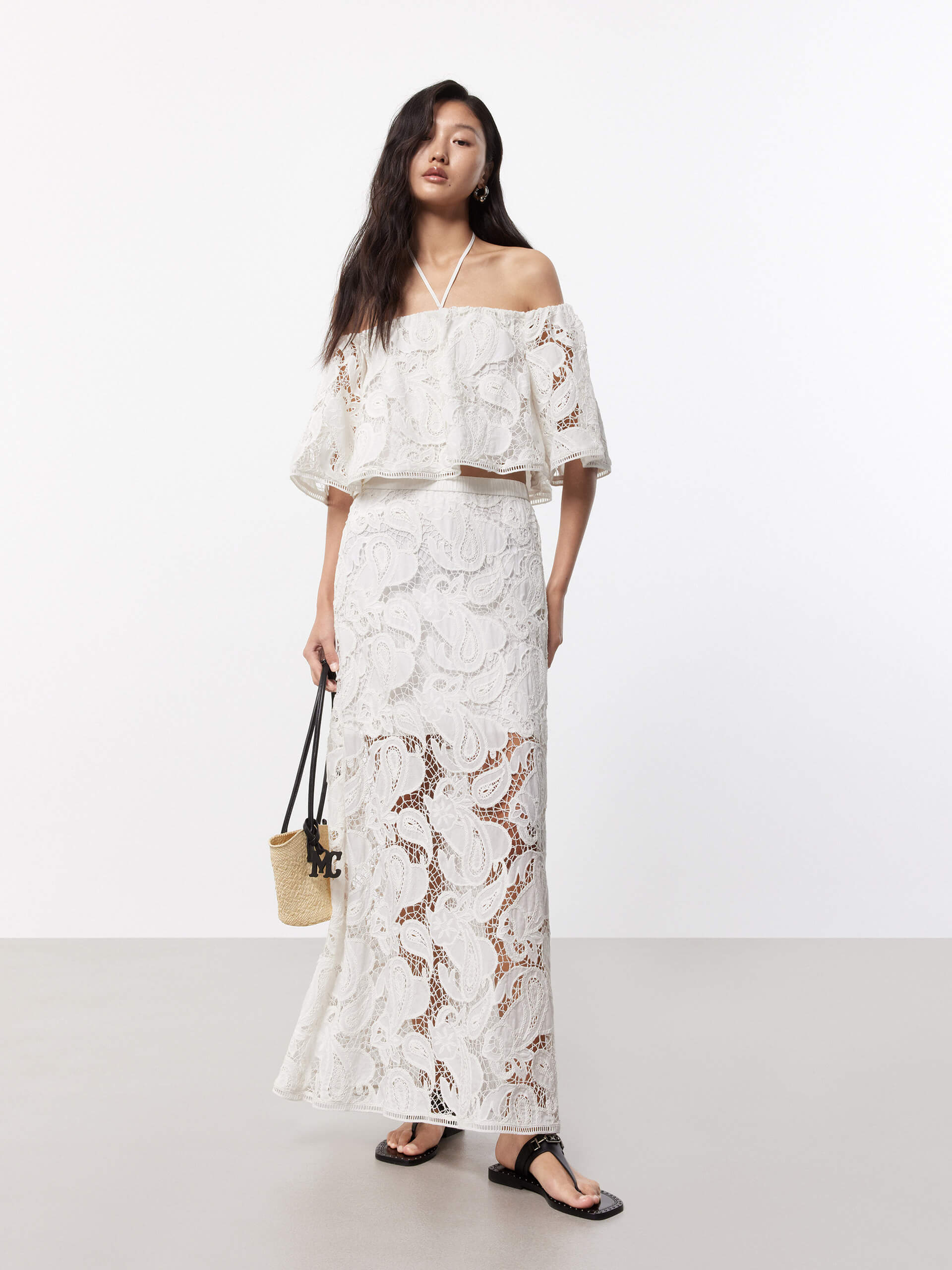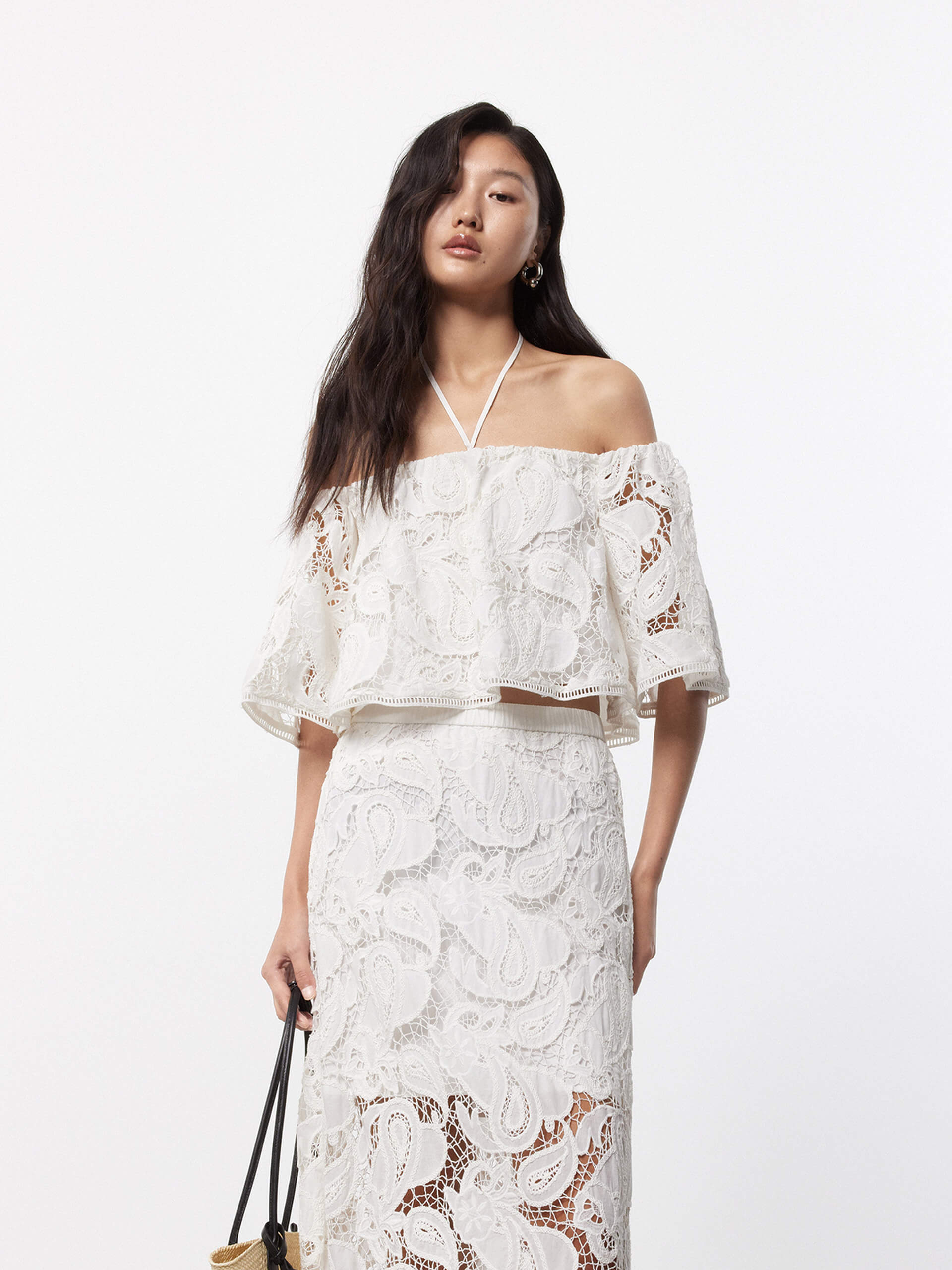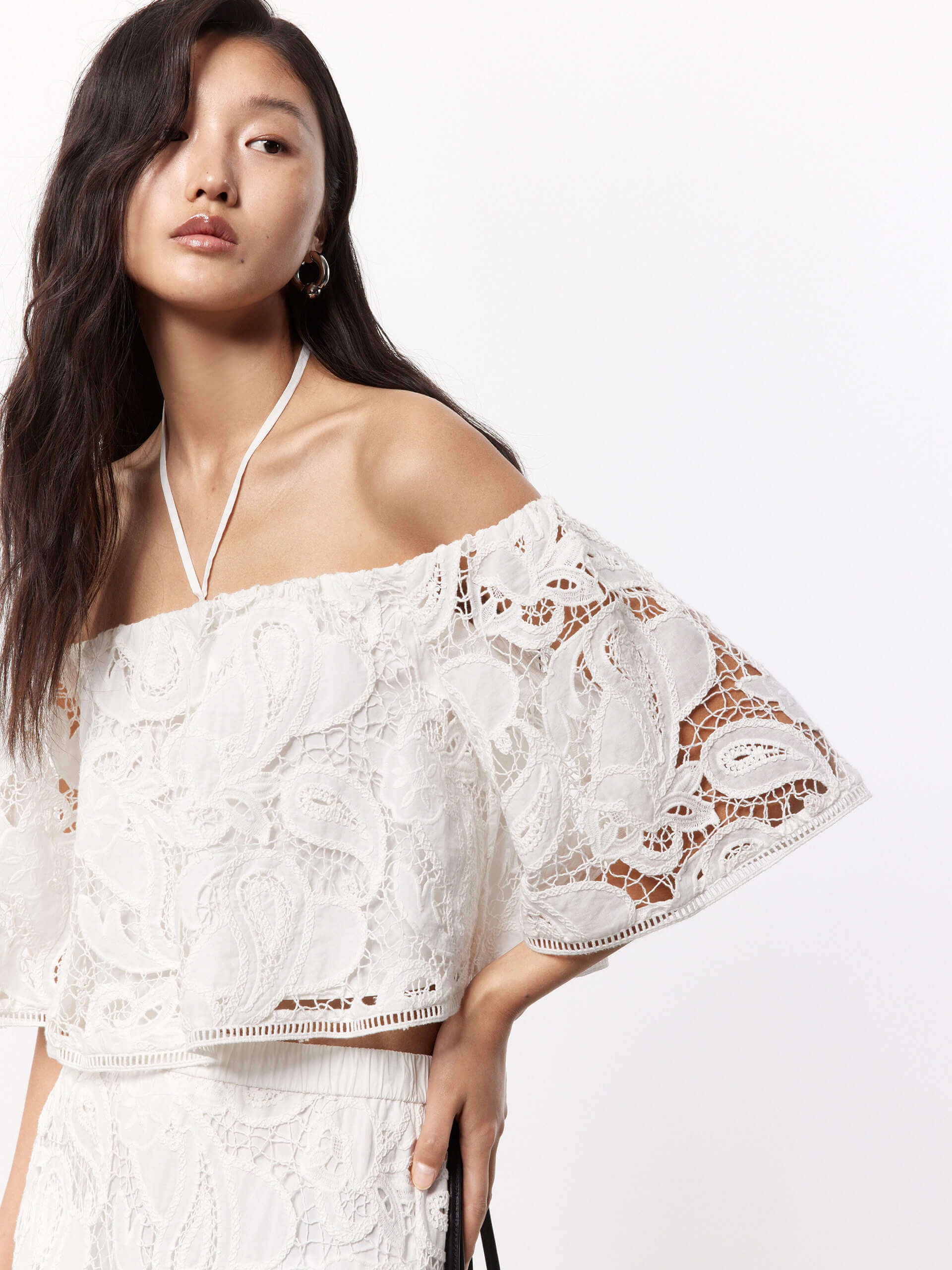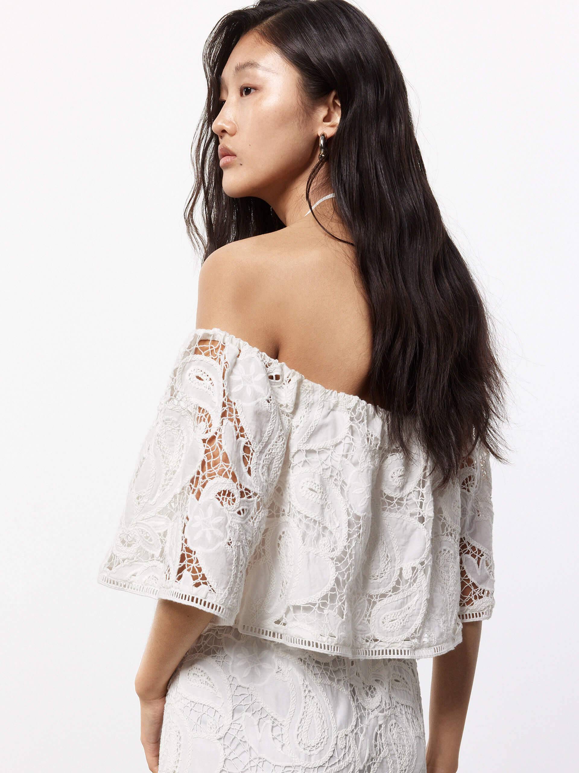 Made from a comfy cotton blend, this short blouse features delicate lace embroidery and an alluring off-shoulder design. Perfectly paired with our matching skirt for a fashionable, yet casual look.