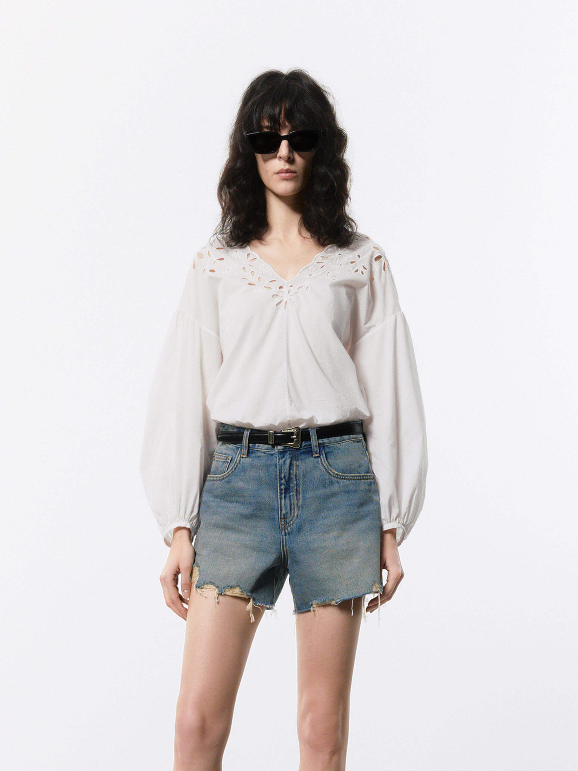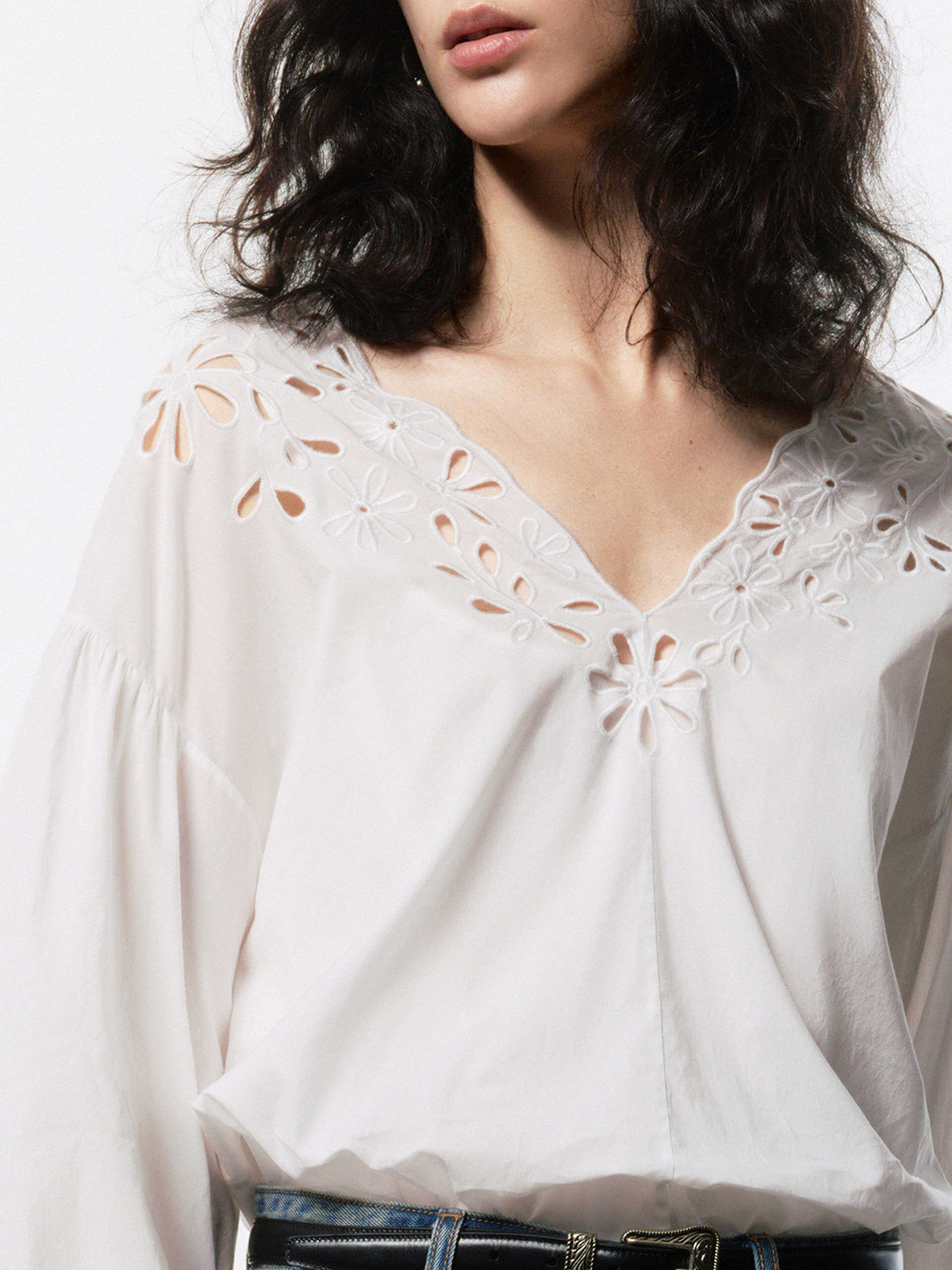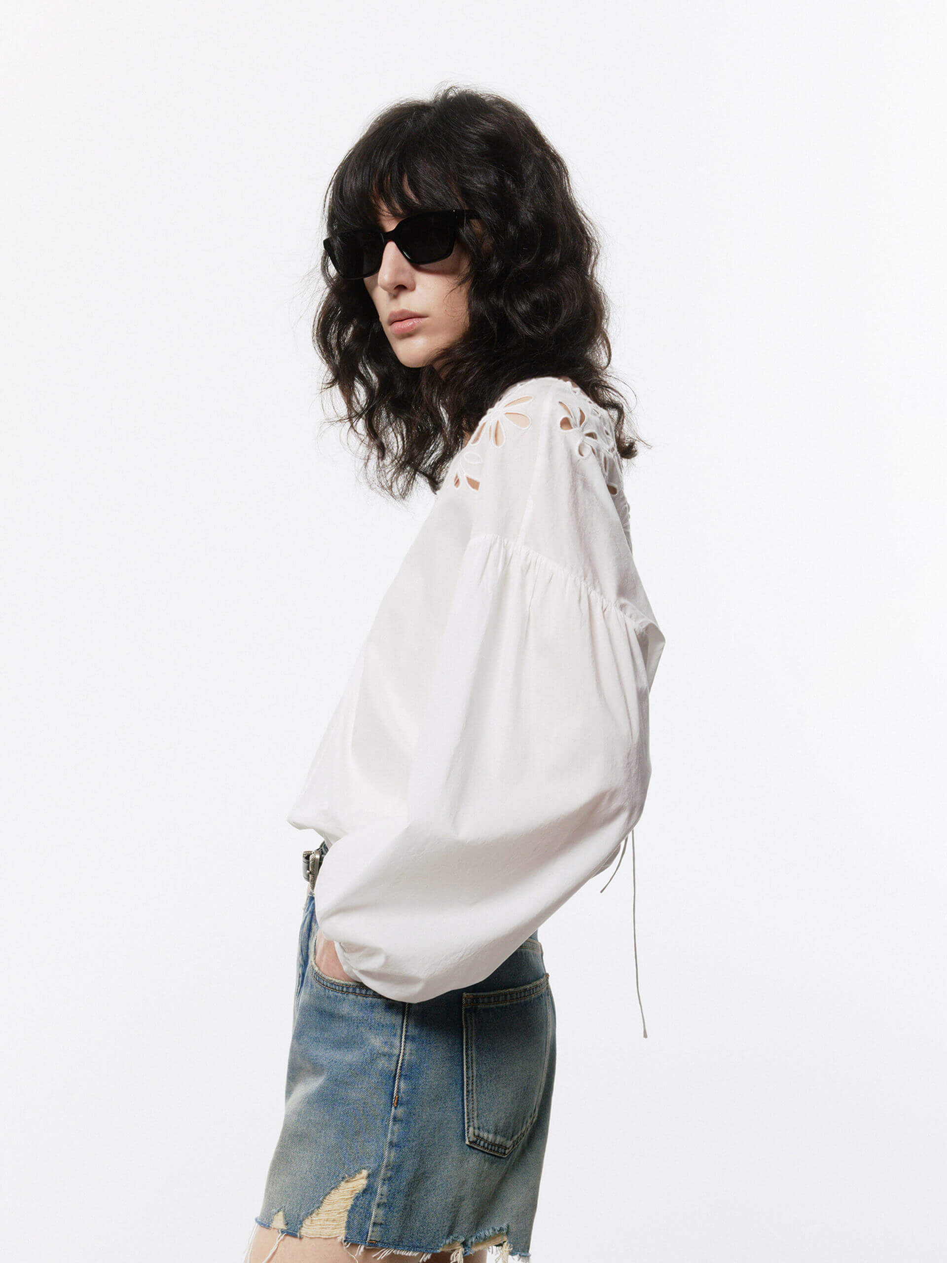 Made from 100% cotton, this blouse is soft, breathable, and comfortable to wear. Designed with a charming Broderie Anglaise design, the V-neckline adds a touch of elegance, while the volume sleeves add a playful, modern twist. Pair it with your favorite jeans or a skirt for a chic look.