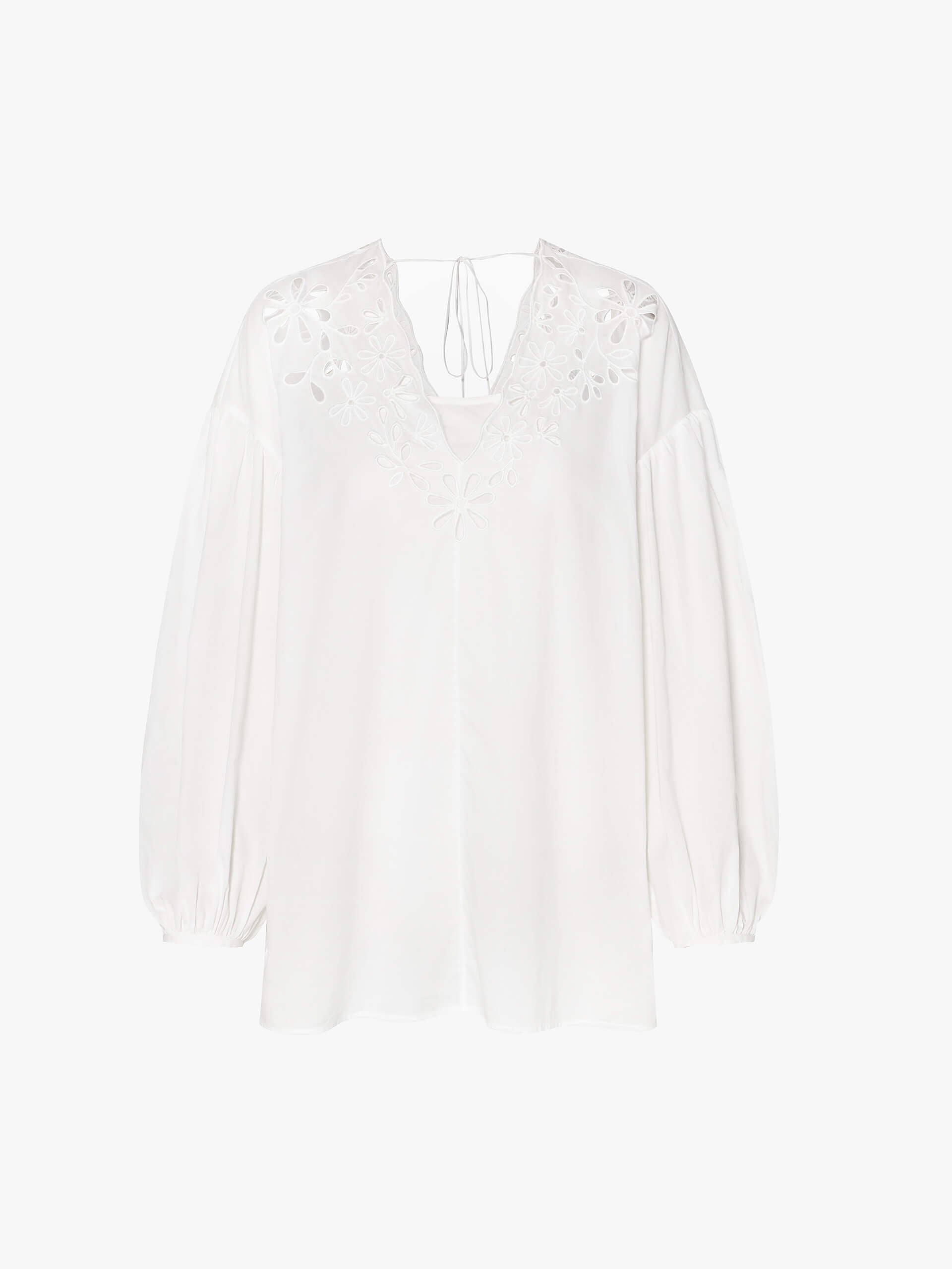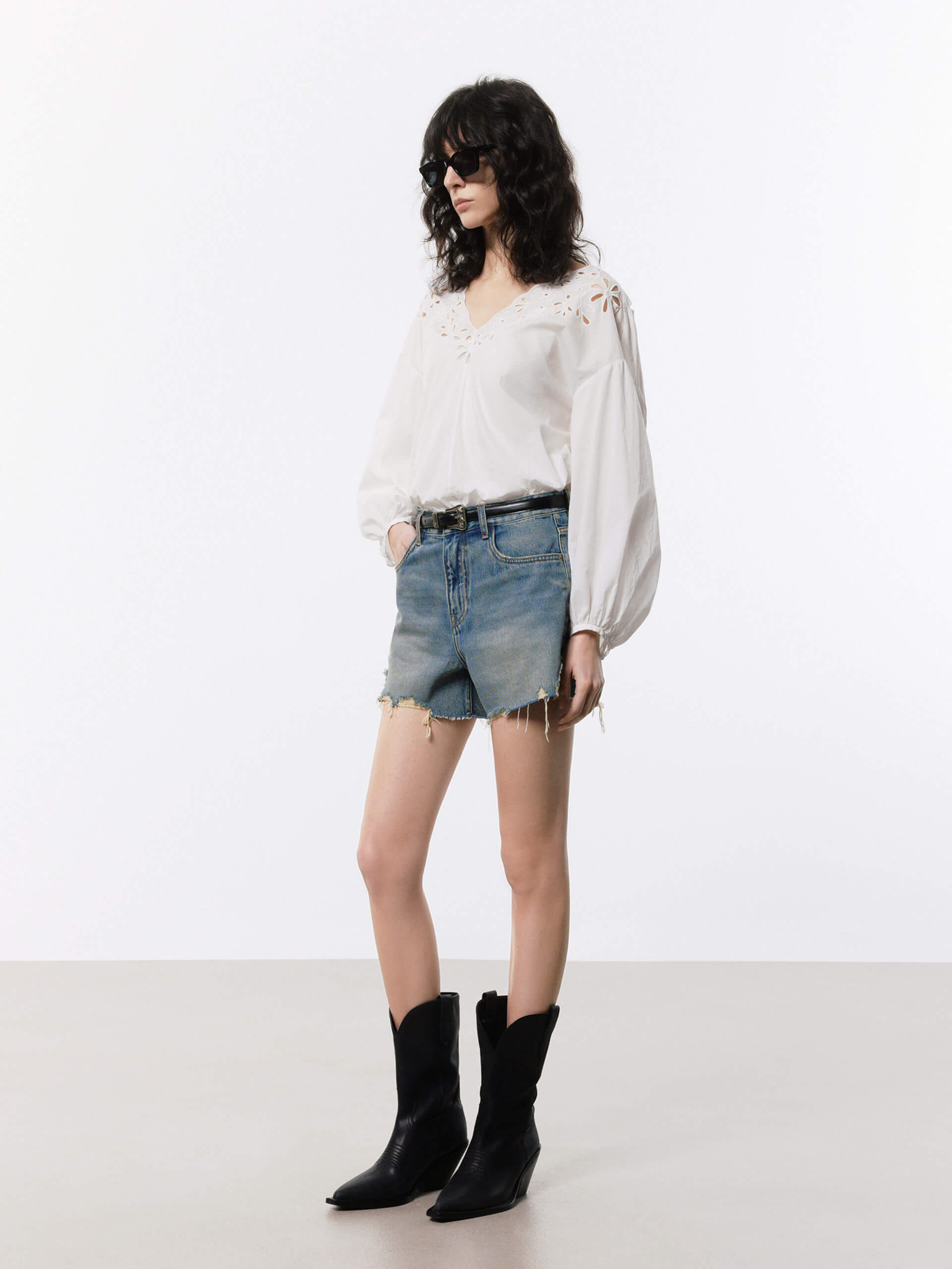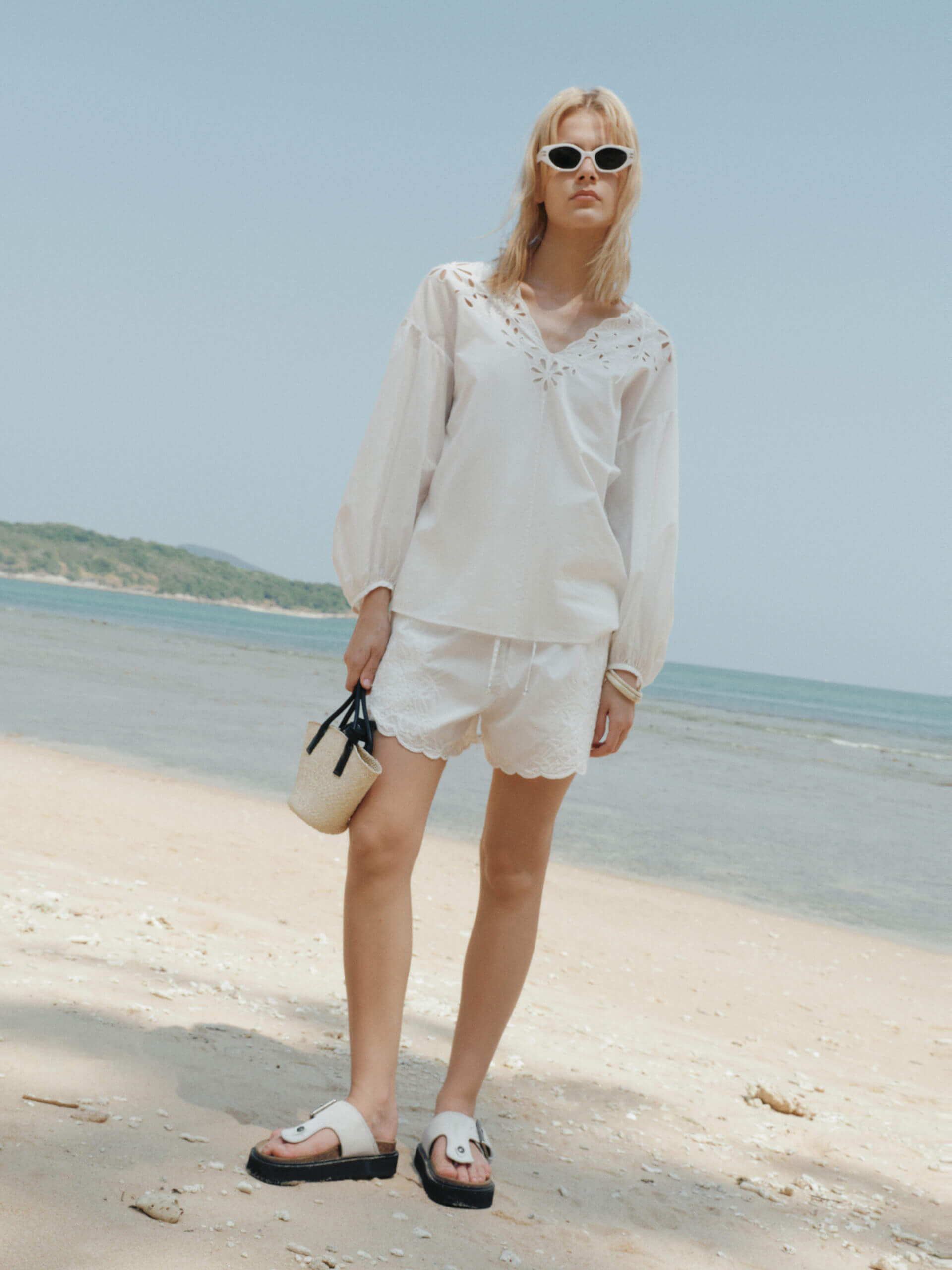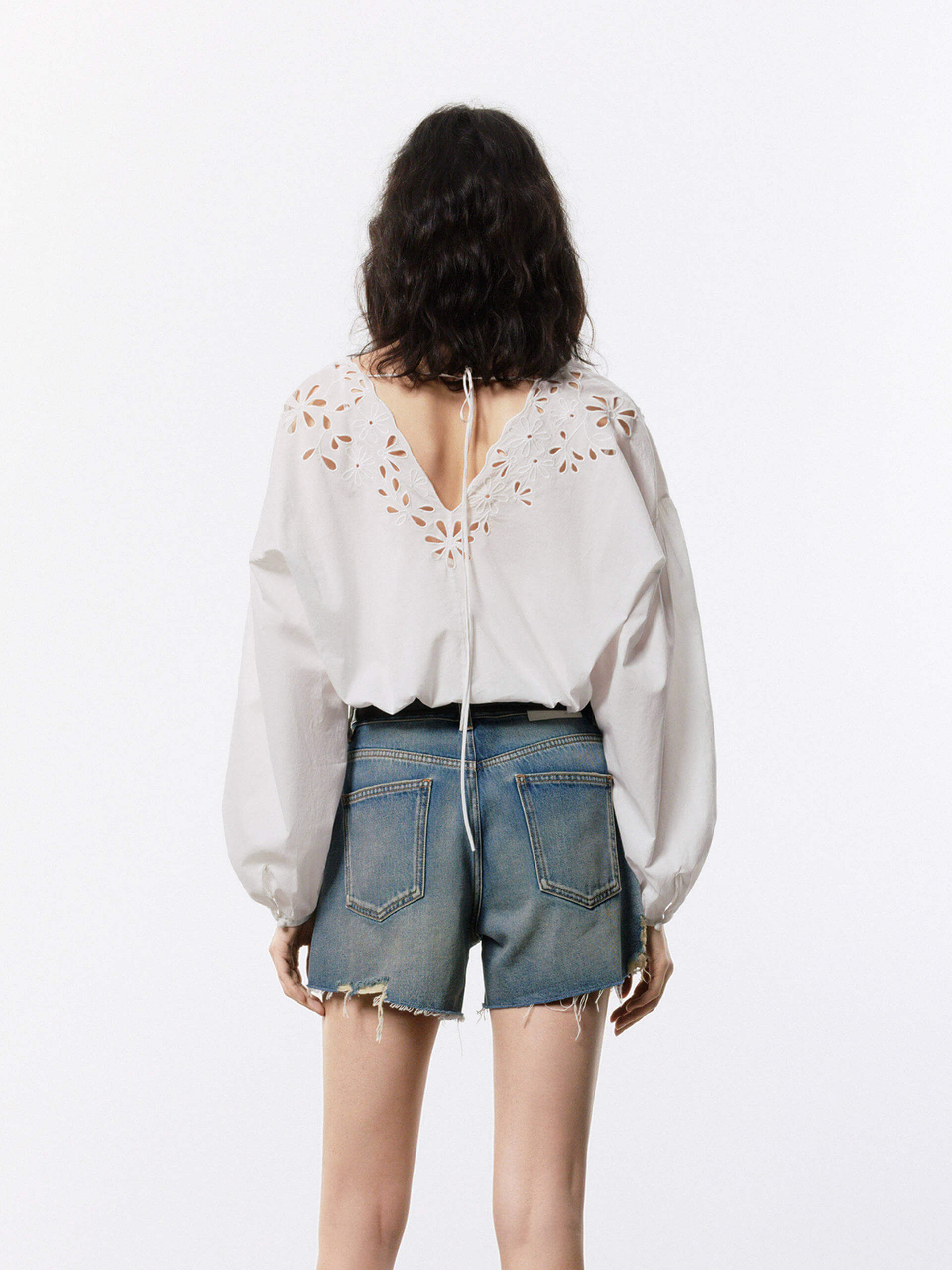 Made from 100% cotton, this blouse is soft, breathable, and comfortable to wear. Designed with a charming Broderie Anglaise design, the V-neckline adds a touch of elegance, while the volume sleeves add a playful, modern twist. Pair it with your favorite jeans or a skirt for a chic look.