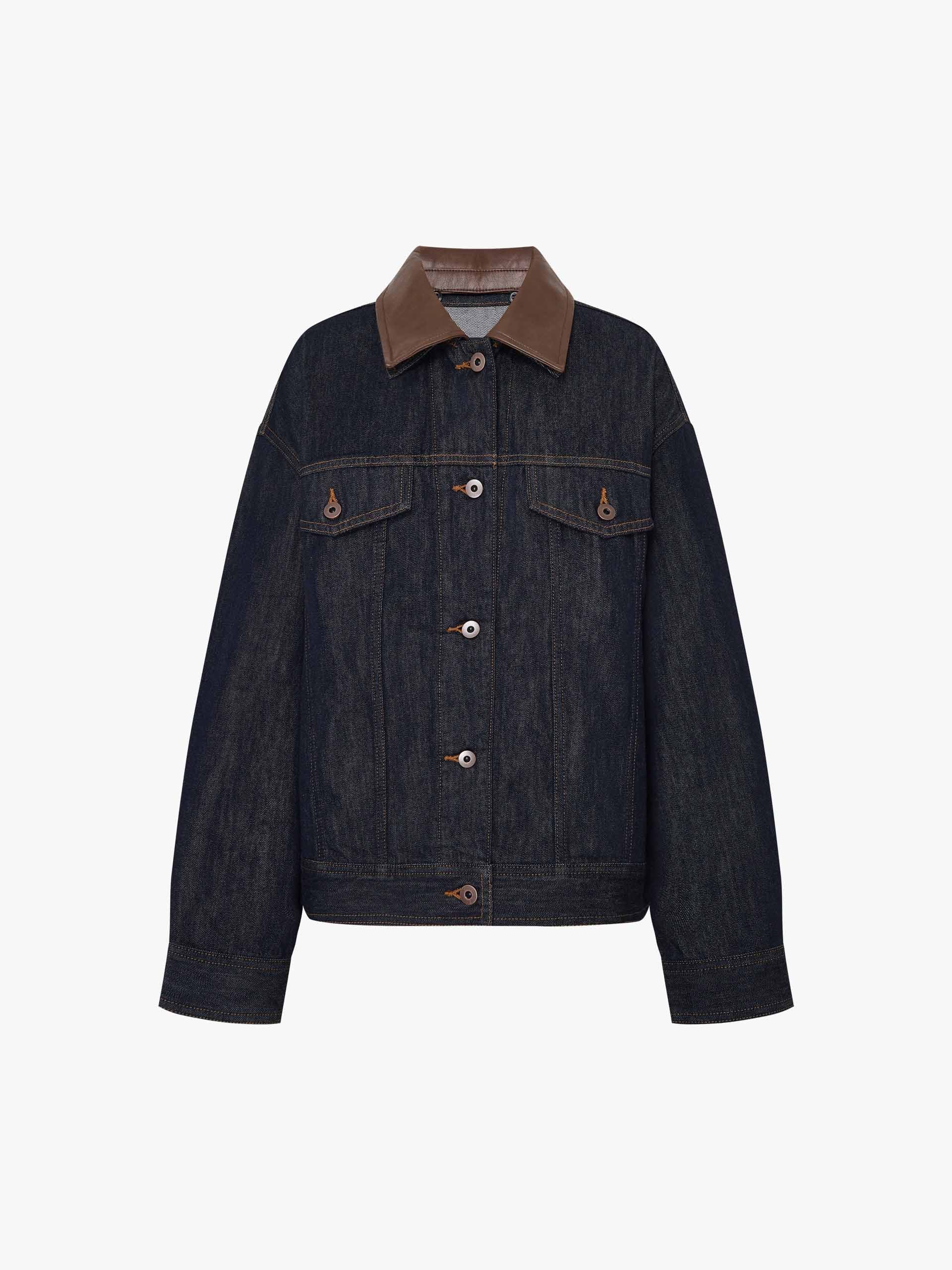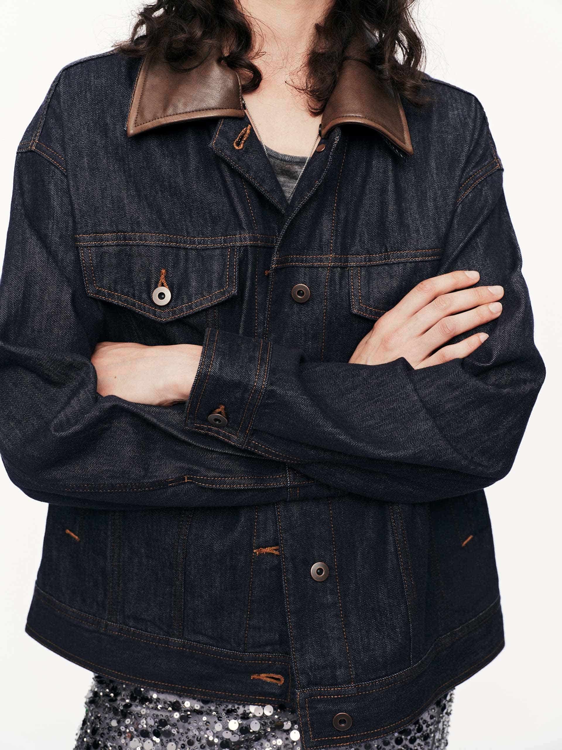 Elevate your outerwear game with this jacket, where classic workwear meets modern edge. A striking contrast leather collar adds unexpected sophistication, while functional chest pockets provide utilitarian charm. The full-length sleeves and secure button closure ensure versatile wearability, and the leather logo patch at the back hem delivers subtle branding.