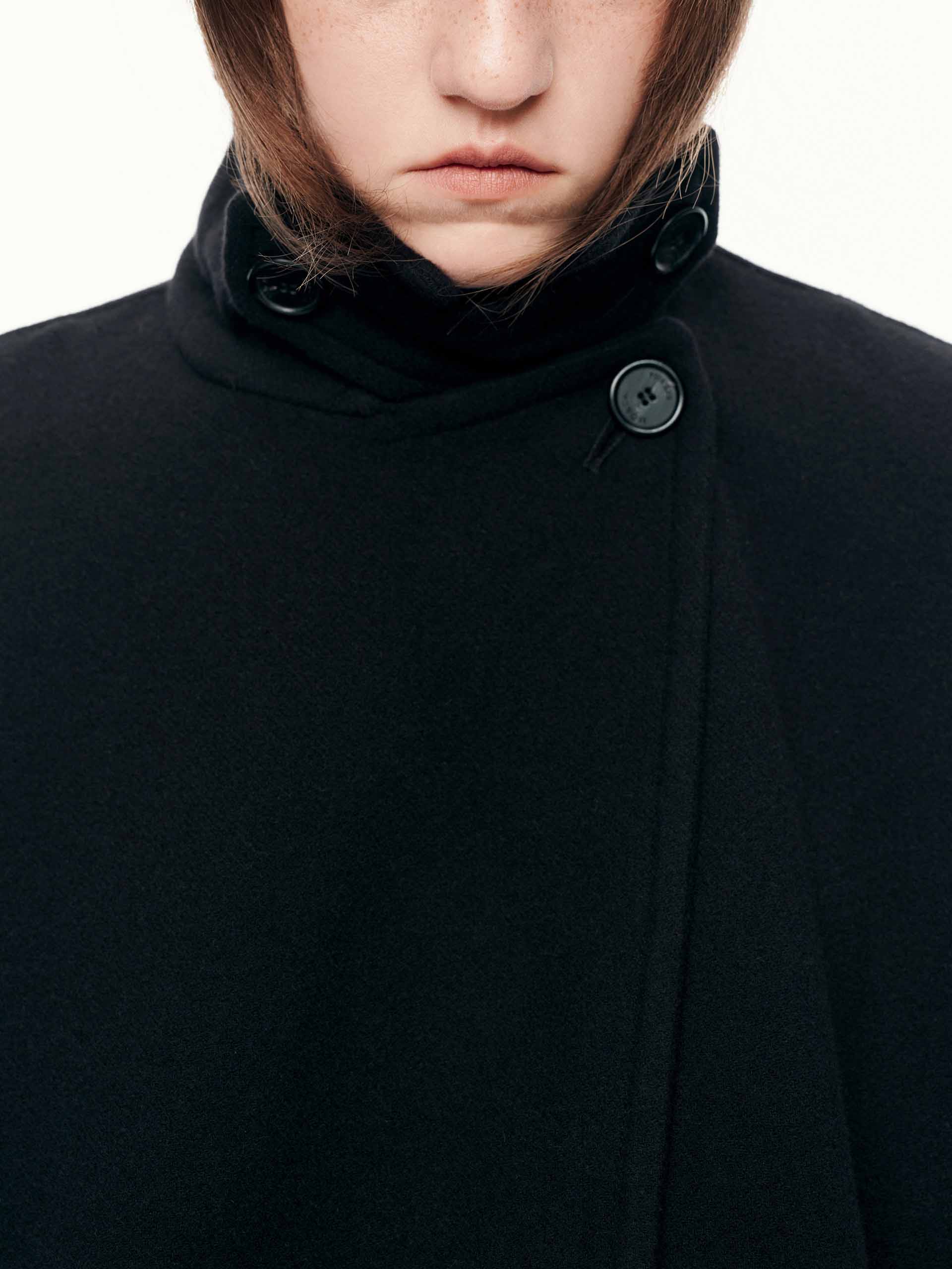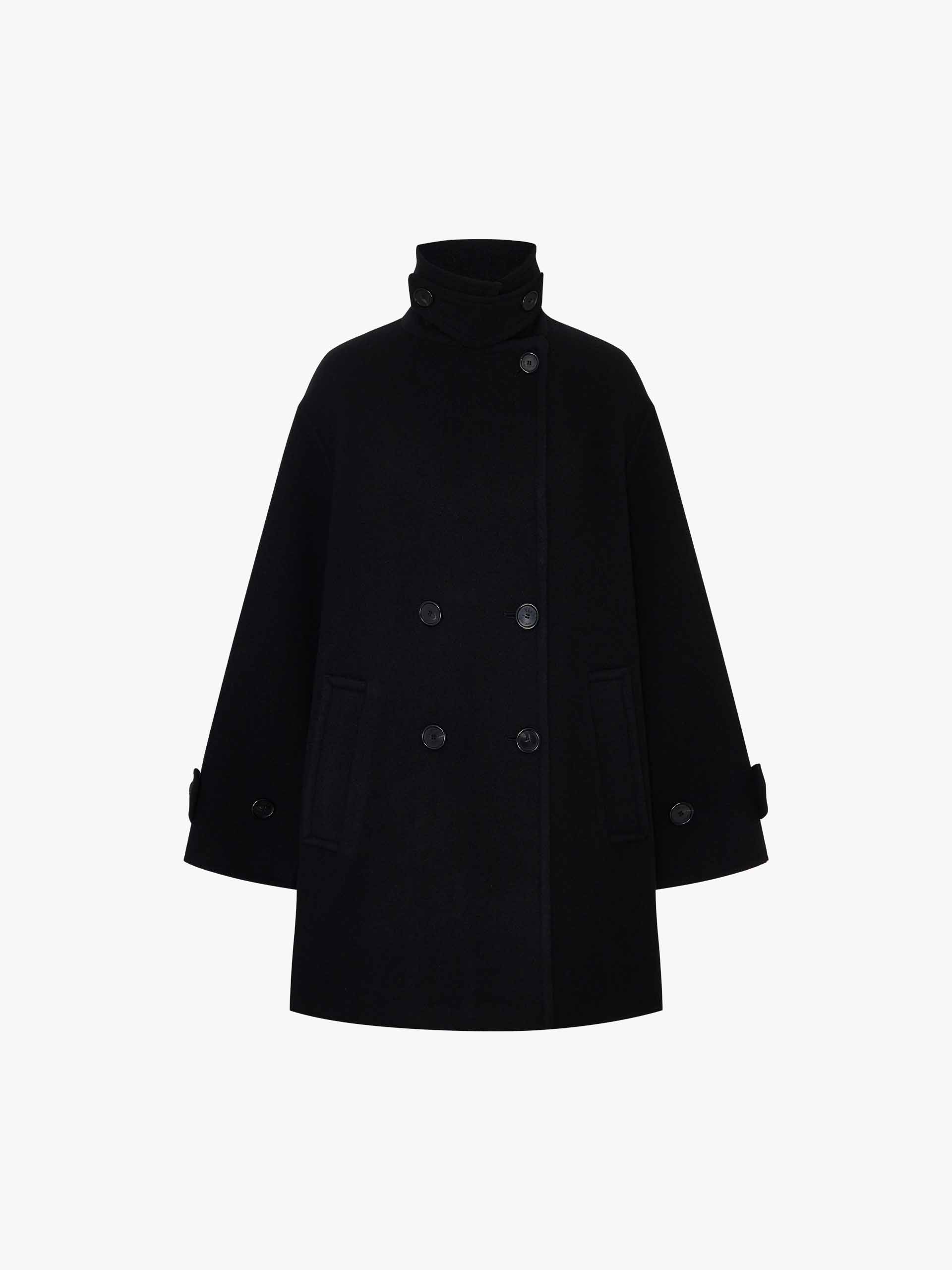 Command timeless elegance with the coat, expertly tailored from 100% wool for uncompromising luxury, warmth, and structure. The refined lapel and double-breasted detail evoke classic tailoring, while the functional buttoned throat latch ensures added protection against the cold. Finished with long sleeves and buttons, it embodies heritage craftsmanship with modern wearability.