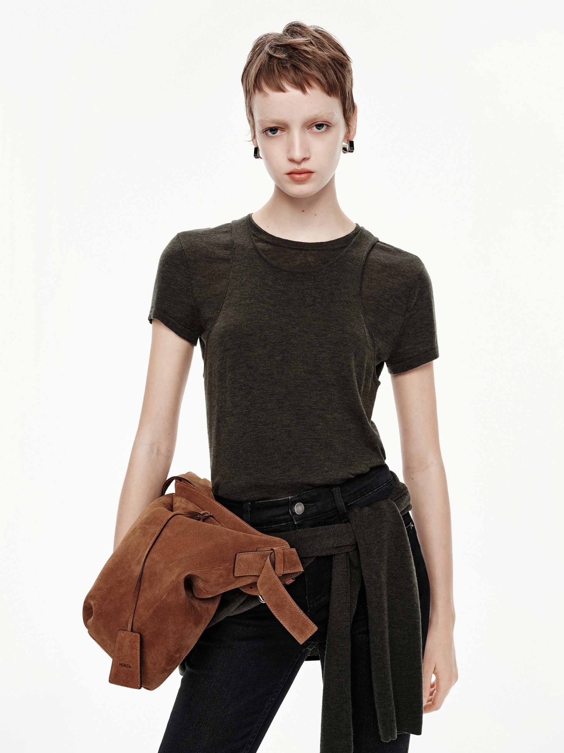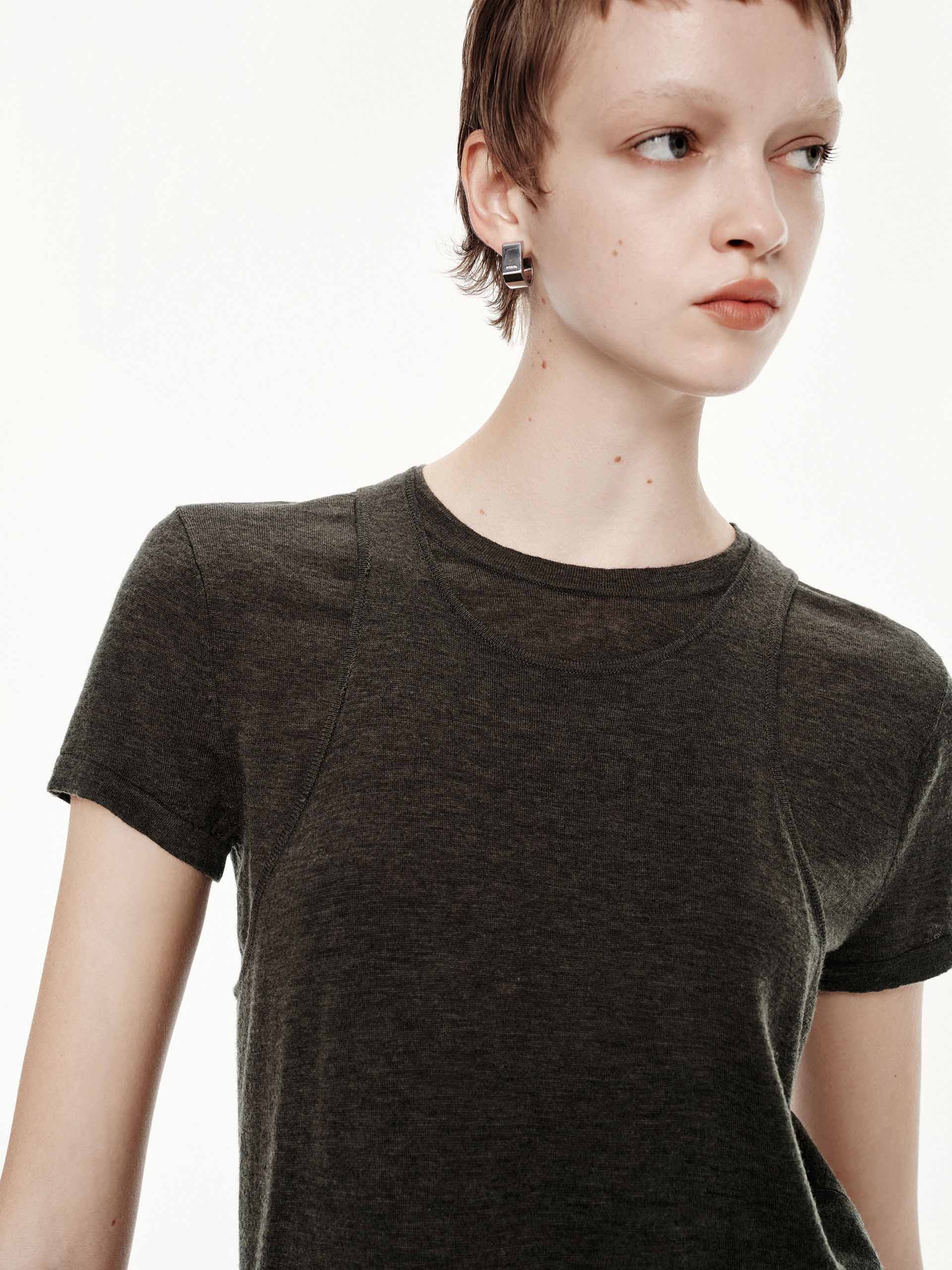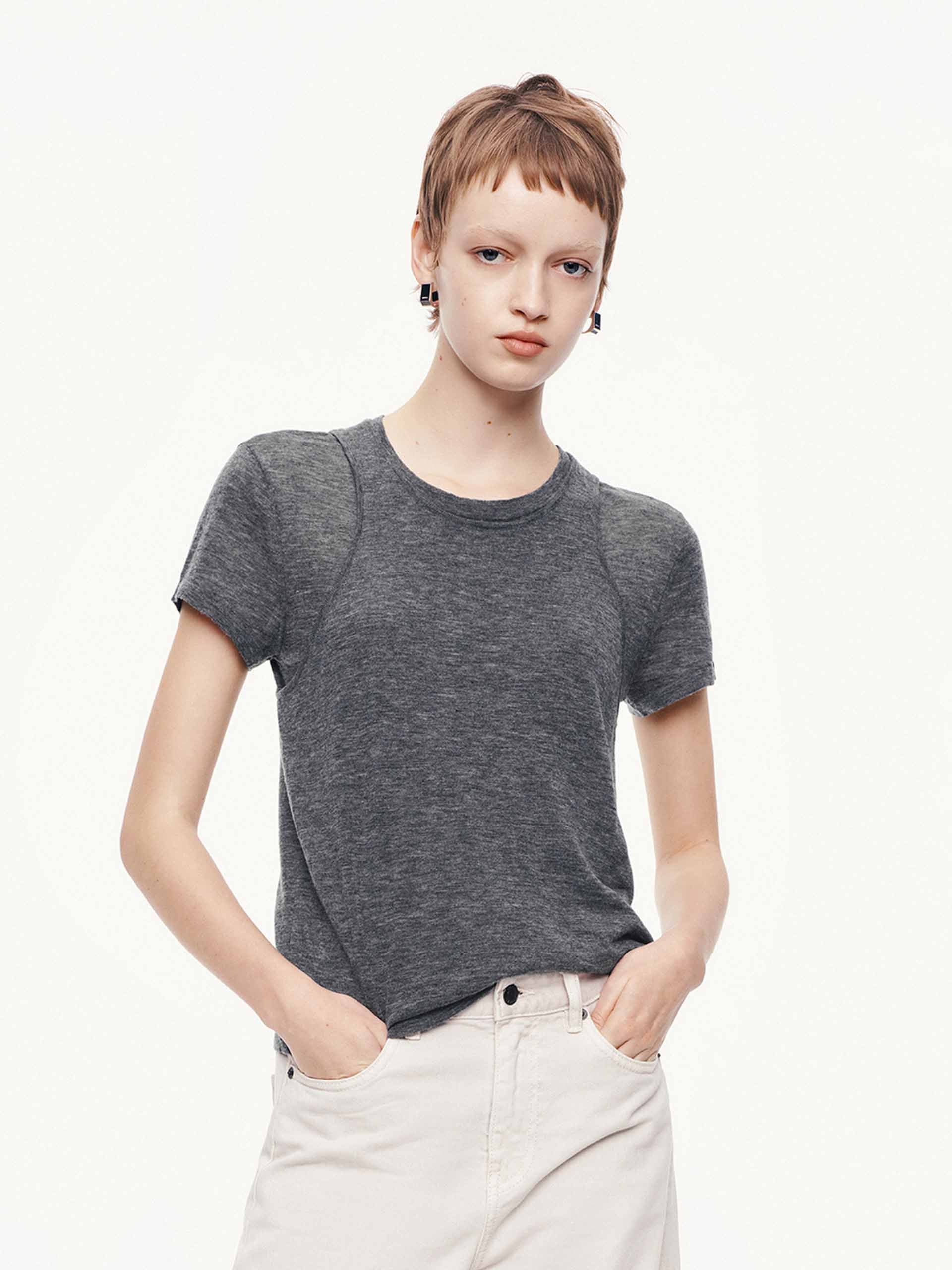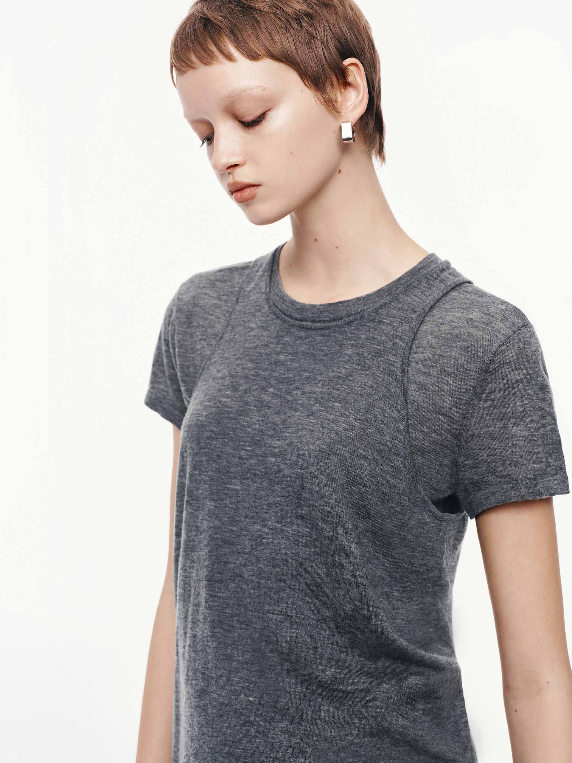 Experience timeless sophistication with this knitted top, crafted from 100% premium wool for exceptional softness and breathable comfort. The slim-fit silhouette flatters the figure with understated elegance, while the classic round neck and short sleeves offer versatile, seasonless appeal. Designed as a stylish layered set, it pairs perfectly with its matching tank for added coverage and dimension.