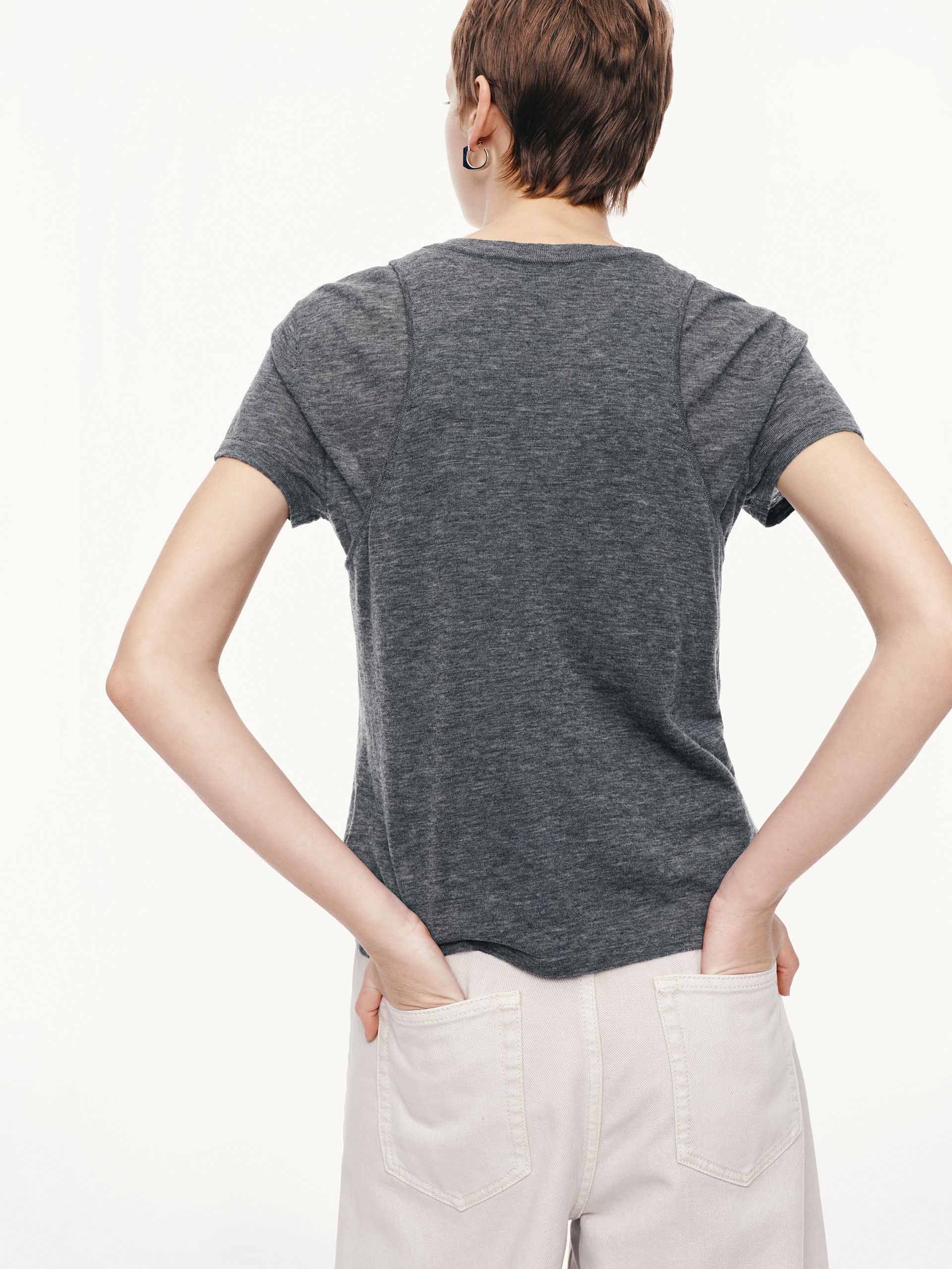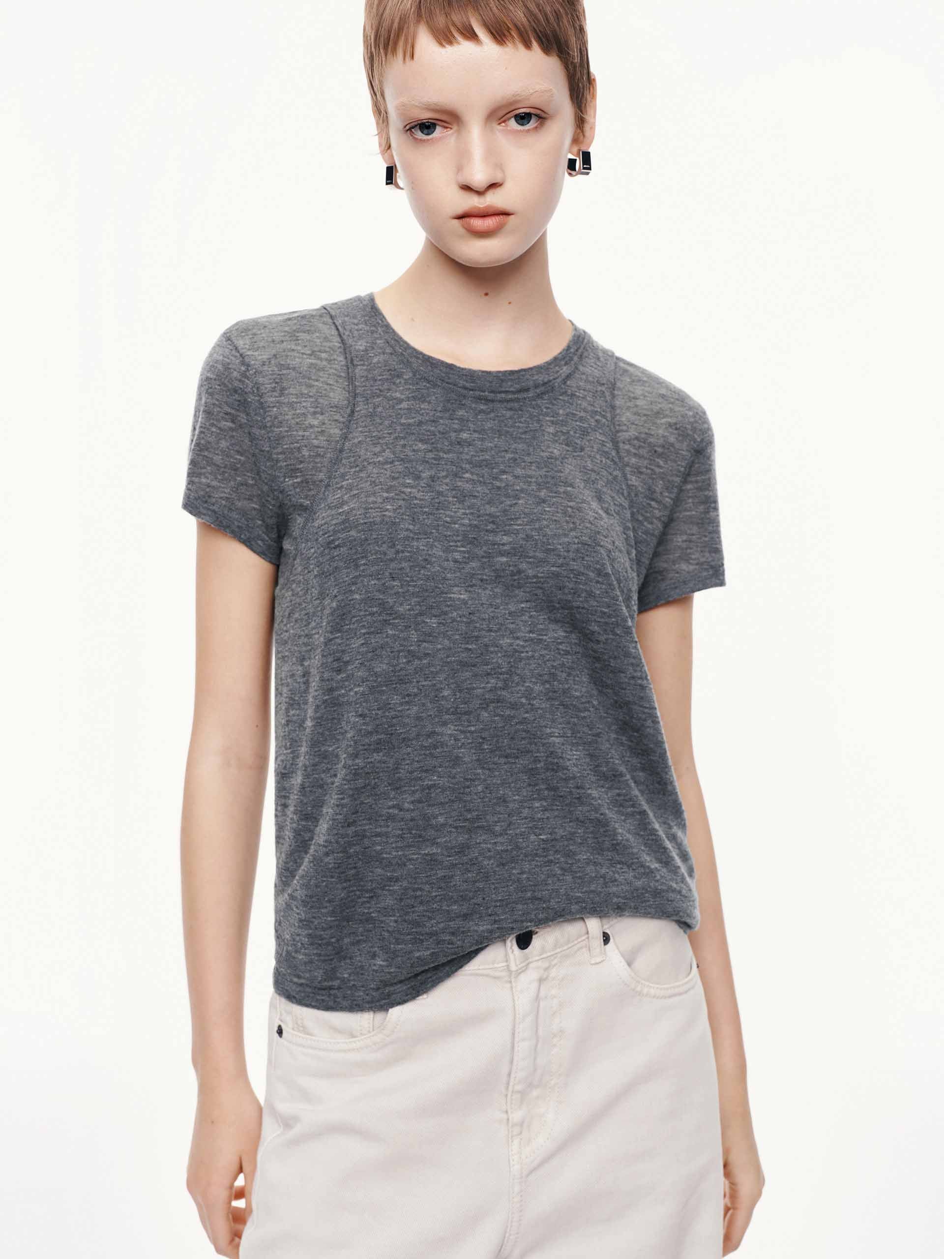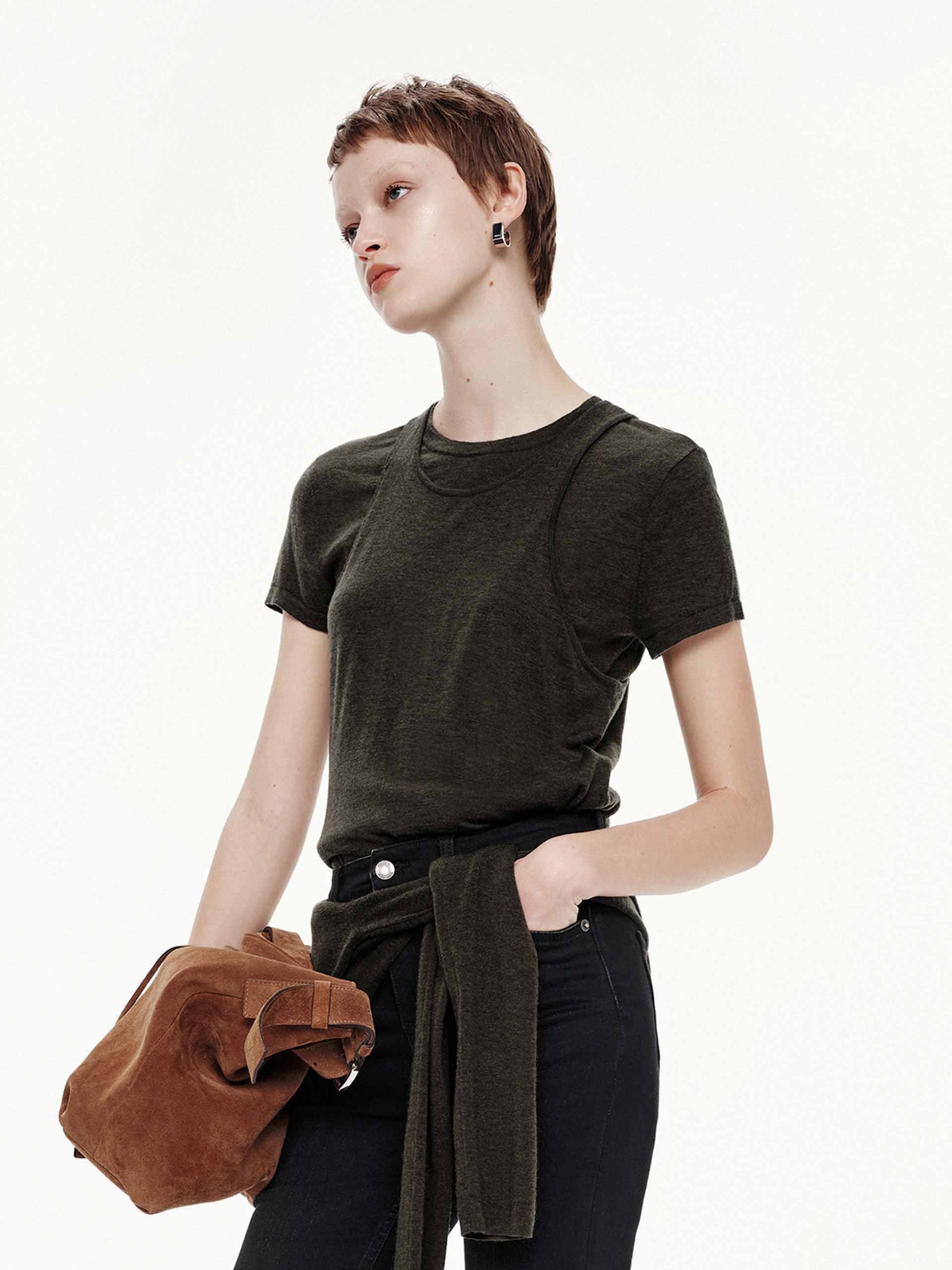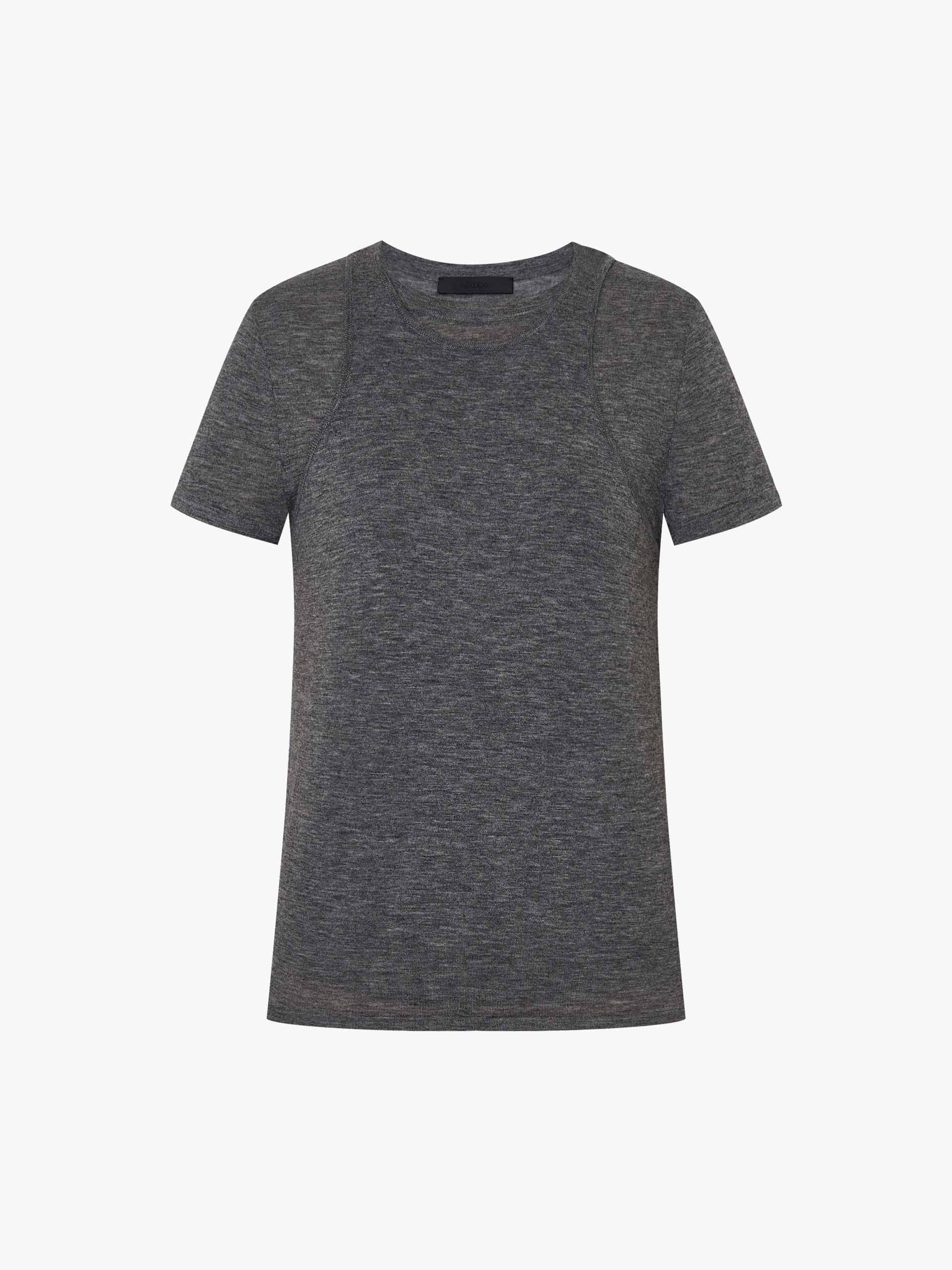 Experience timeless sophistication with this knitted top, crafted from 100% premium wool for exceptional softness and breathable comfort. The slim-fit silhouette flatters the figure with understated elegance, while the classic round neck and short sleeves offer versatile, seasonless appeal. Designed as a stylish layered set, it pairs perfectly with its matching tank for added coverage and dimension.