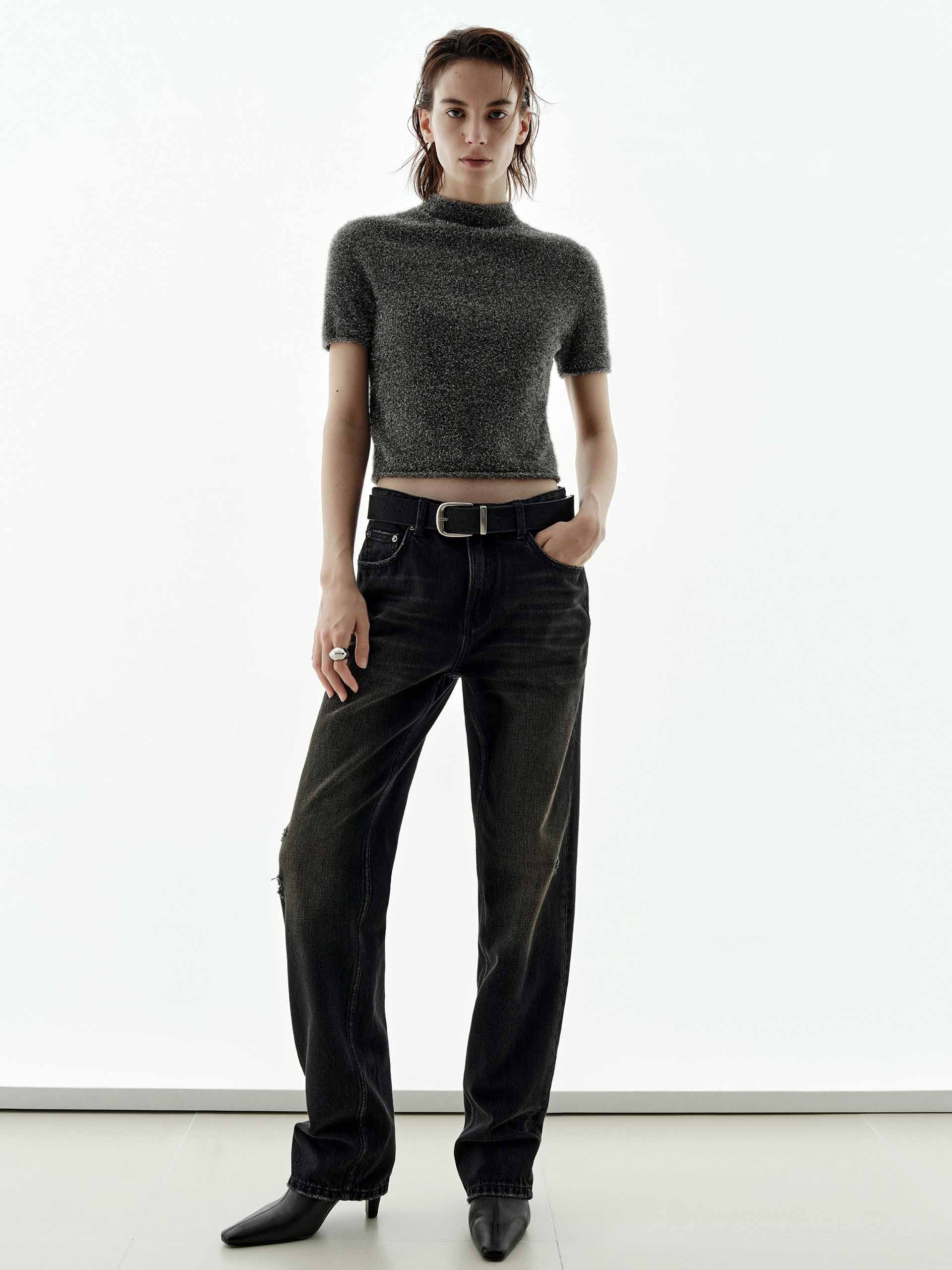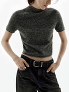 Crafted from luminous metallic yarn, this knitted top blends retro-futuristic shine with contemporary comfort. The fitted cropped fit is accented by a subtle half-turtleneck collar and short sleeves with rolled cuffs, offering a playful yet polished silhouette. The lightweight, stretch-knit fabrication ensures movement and wearability.