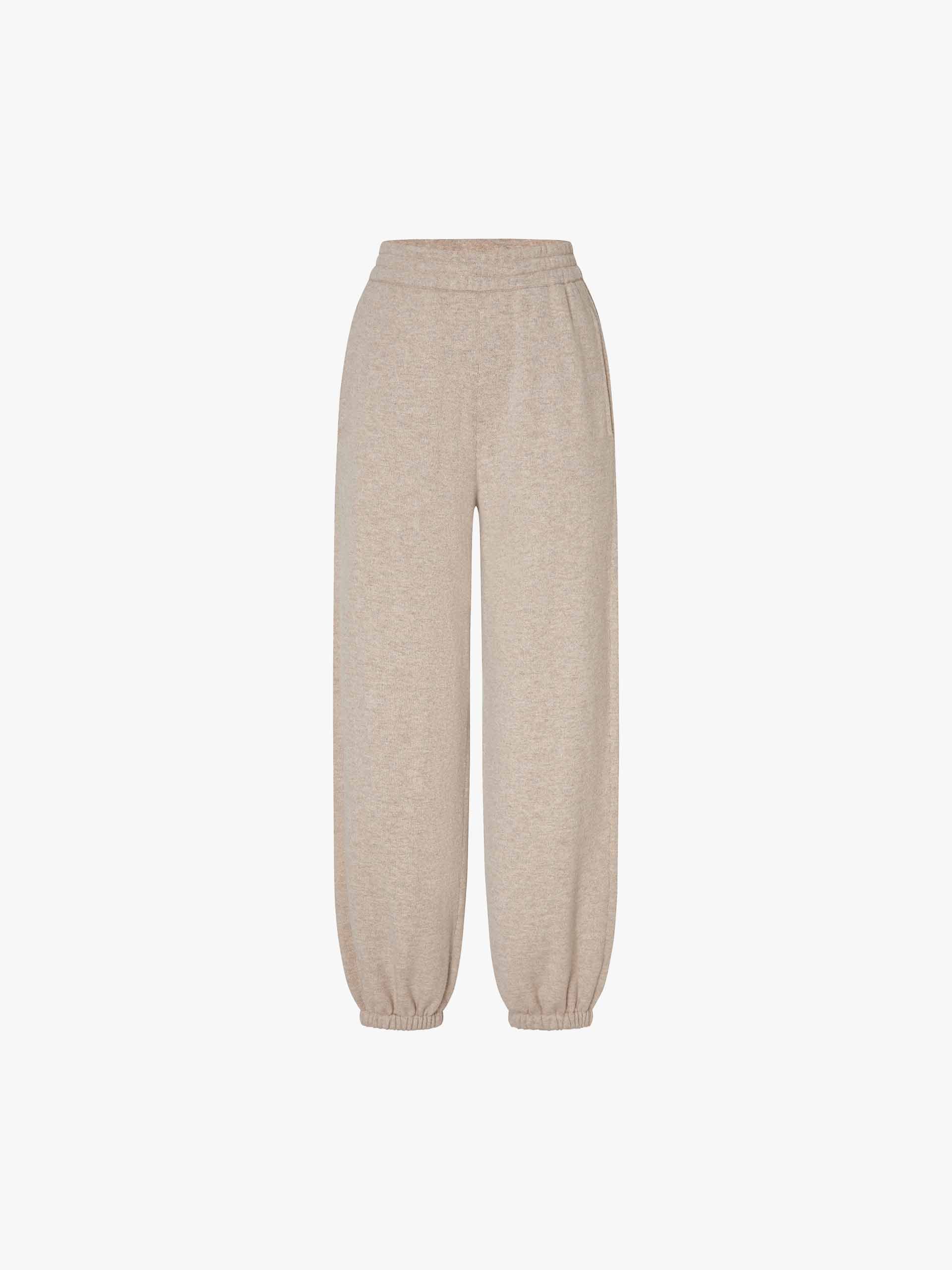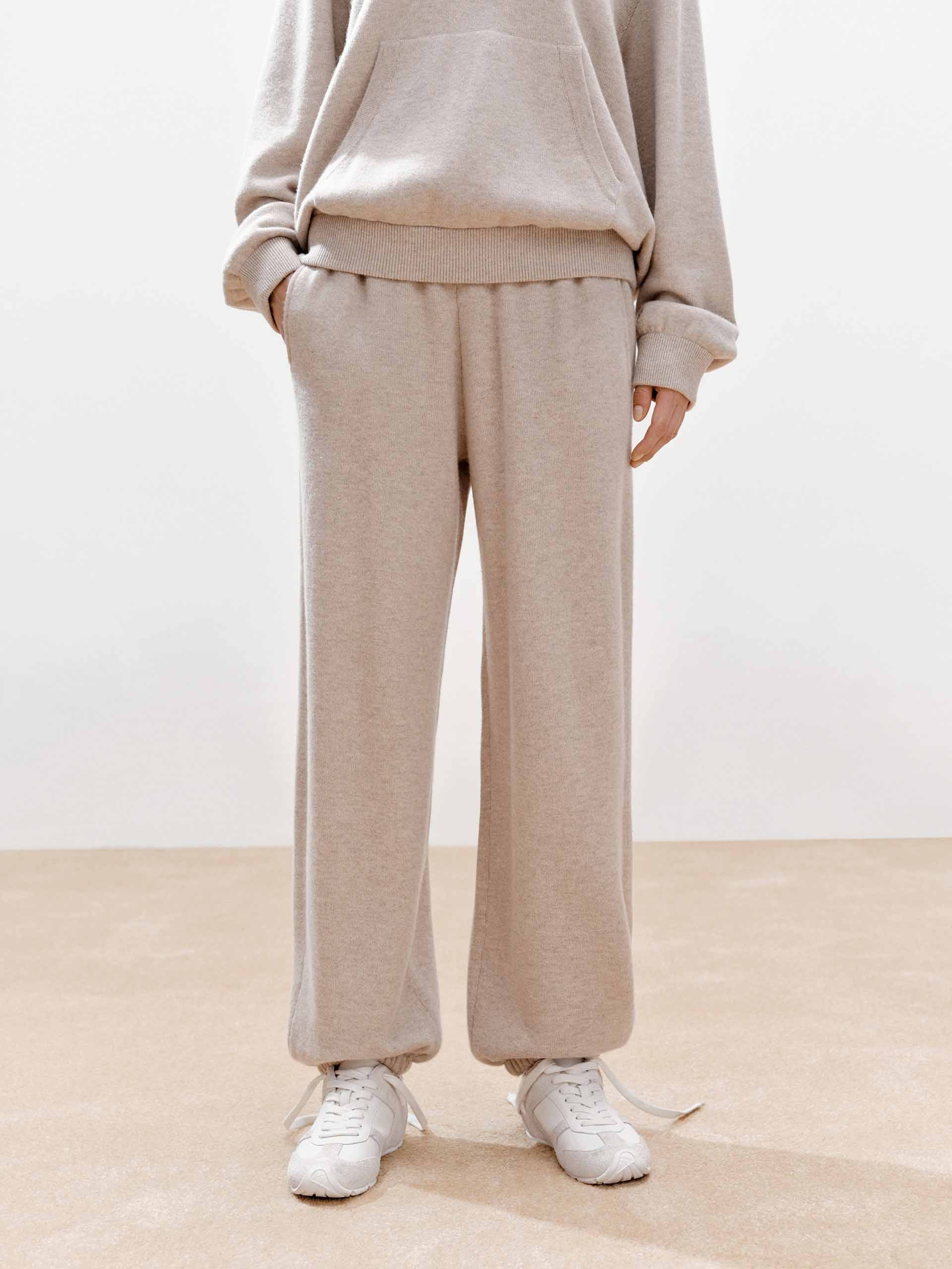 Redefine sophisticated comfort with these trousers, expertly crafted from a premium blend of wool and cashmere for unparalleled softness and warmth. Designed with a modern athleisure silhouette, they feature a fully elasticated waistband and cuffs for a secure, cozy fit. Practical side pockets are seamlessly integrated, creating the perfect synthesis of luxury fabrication, relaxed tailoring, and athletic-inspired ease.