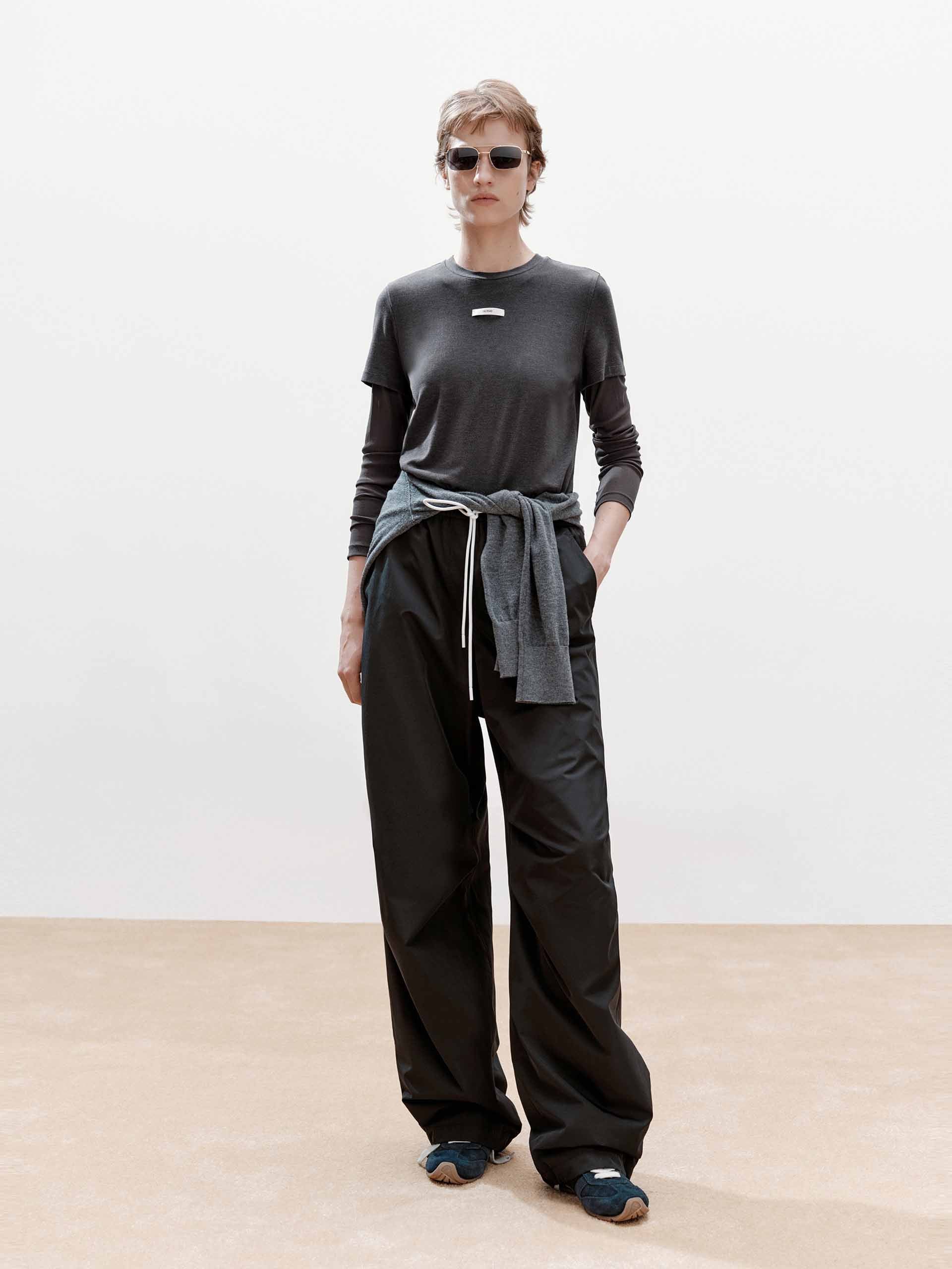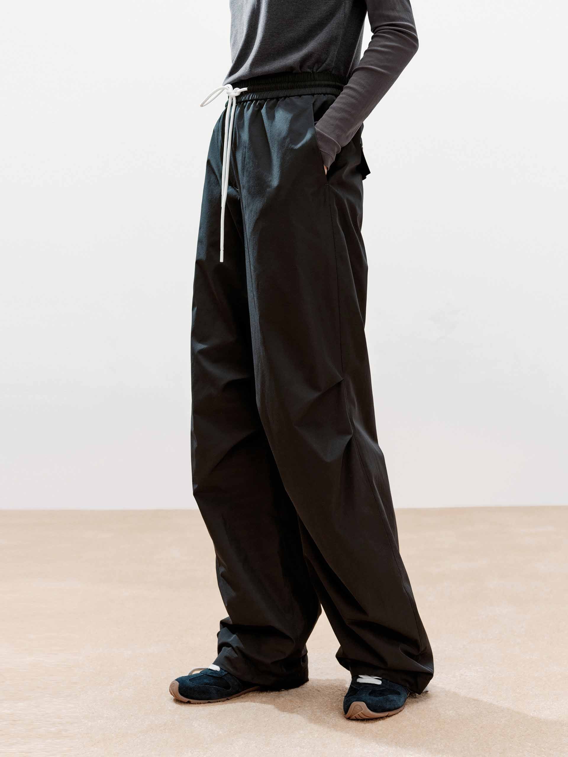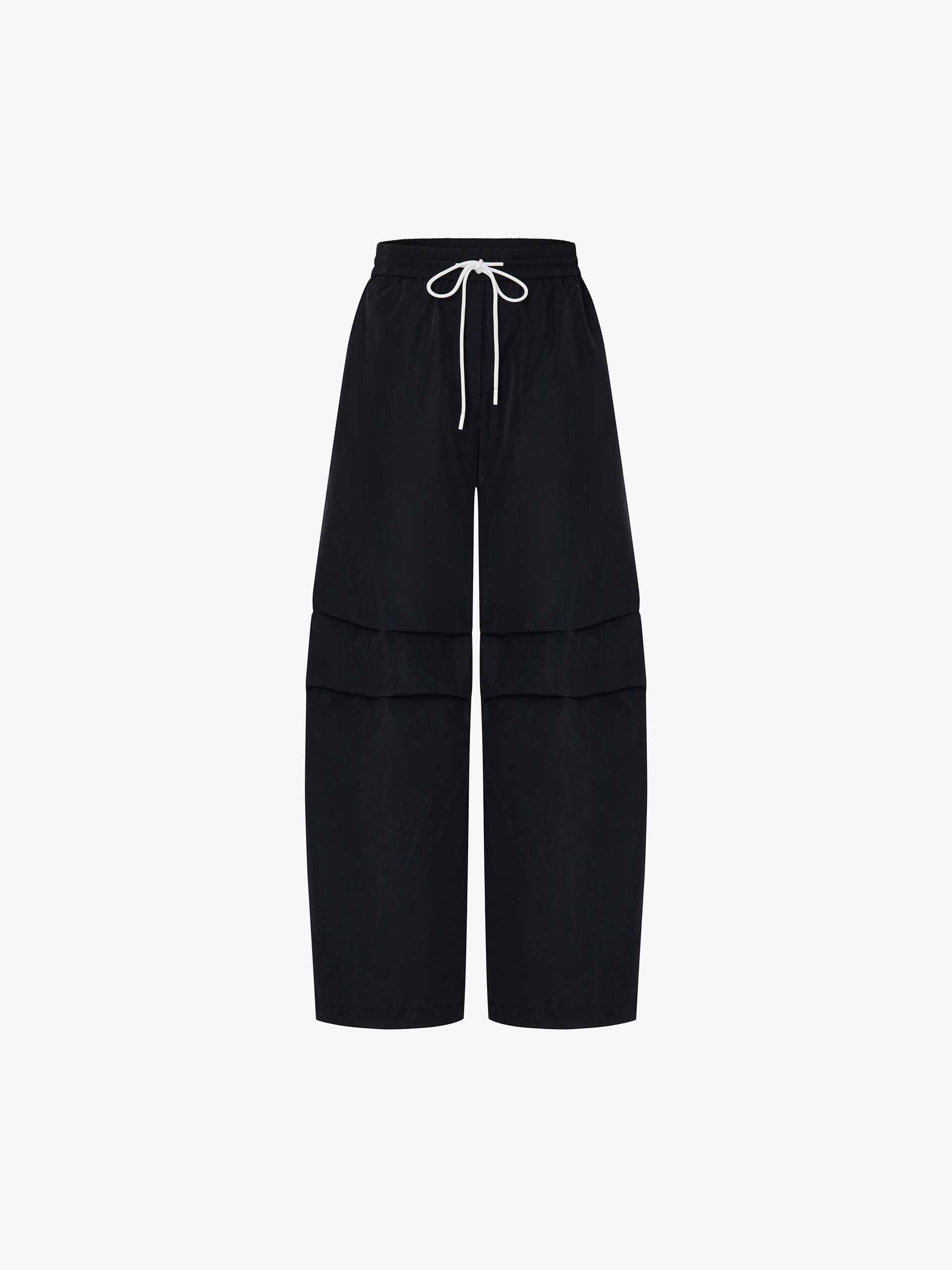Embrace a bold and architectural silhouette with these trousers, defined by their distinctive rounded barrel leg shape that creates a striking modern profile. The design features elegant front pleats that add volume and movement, combined with a fully elasticated waistband and an adjustable drawstring hem for a customizable, sculptural fit.