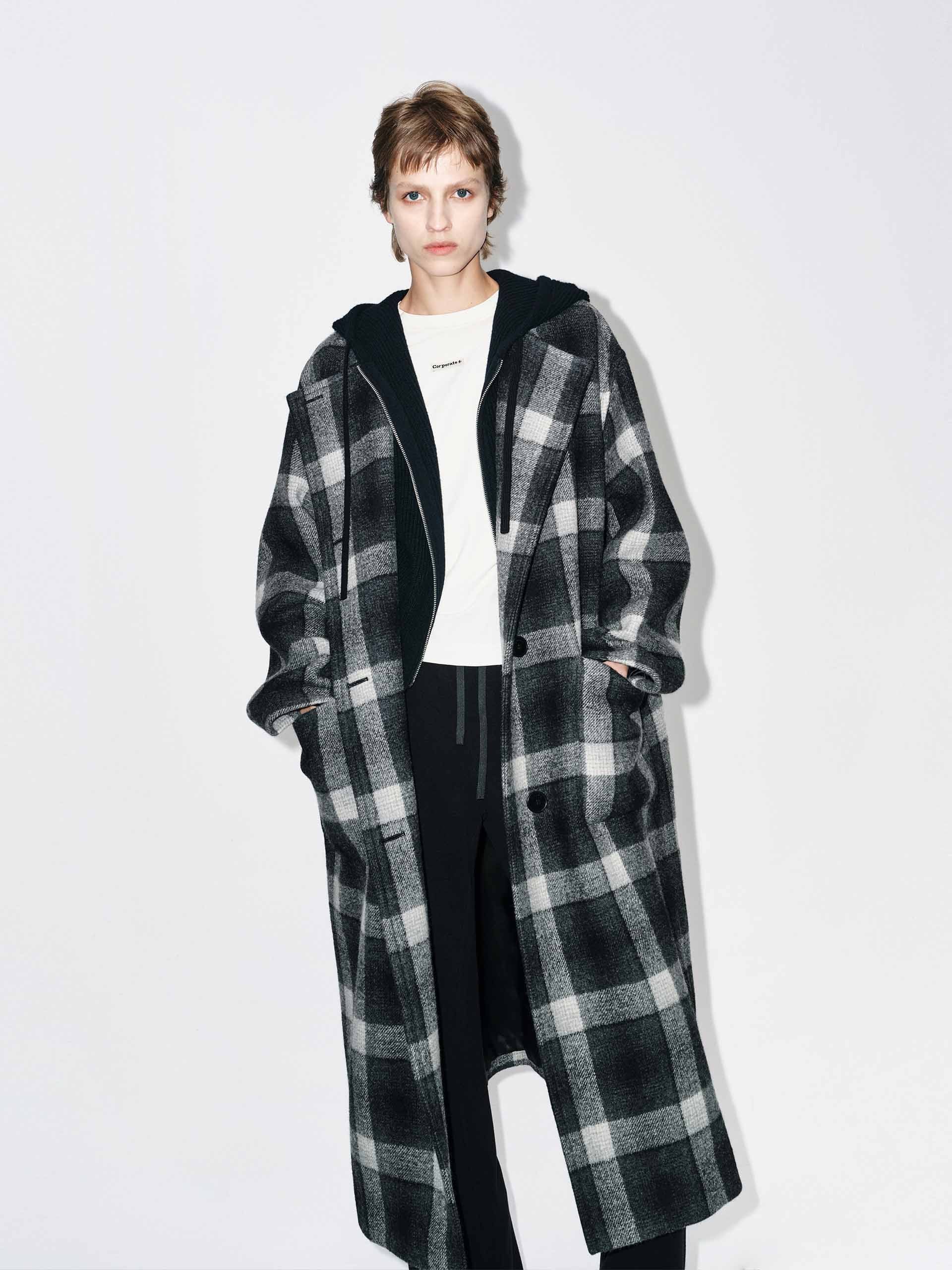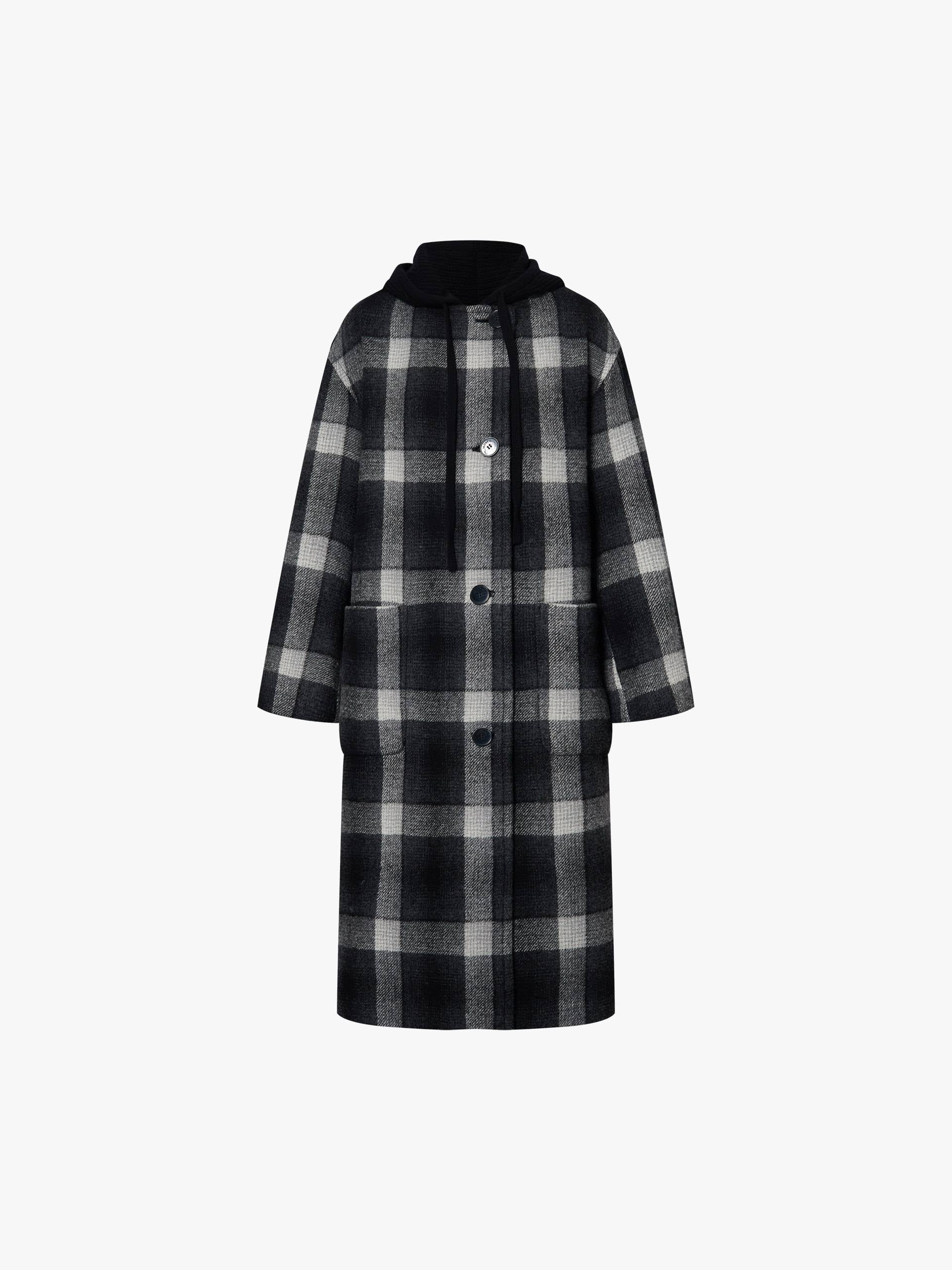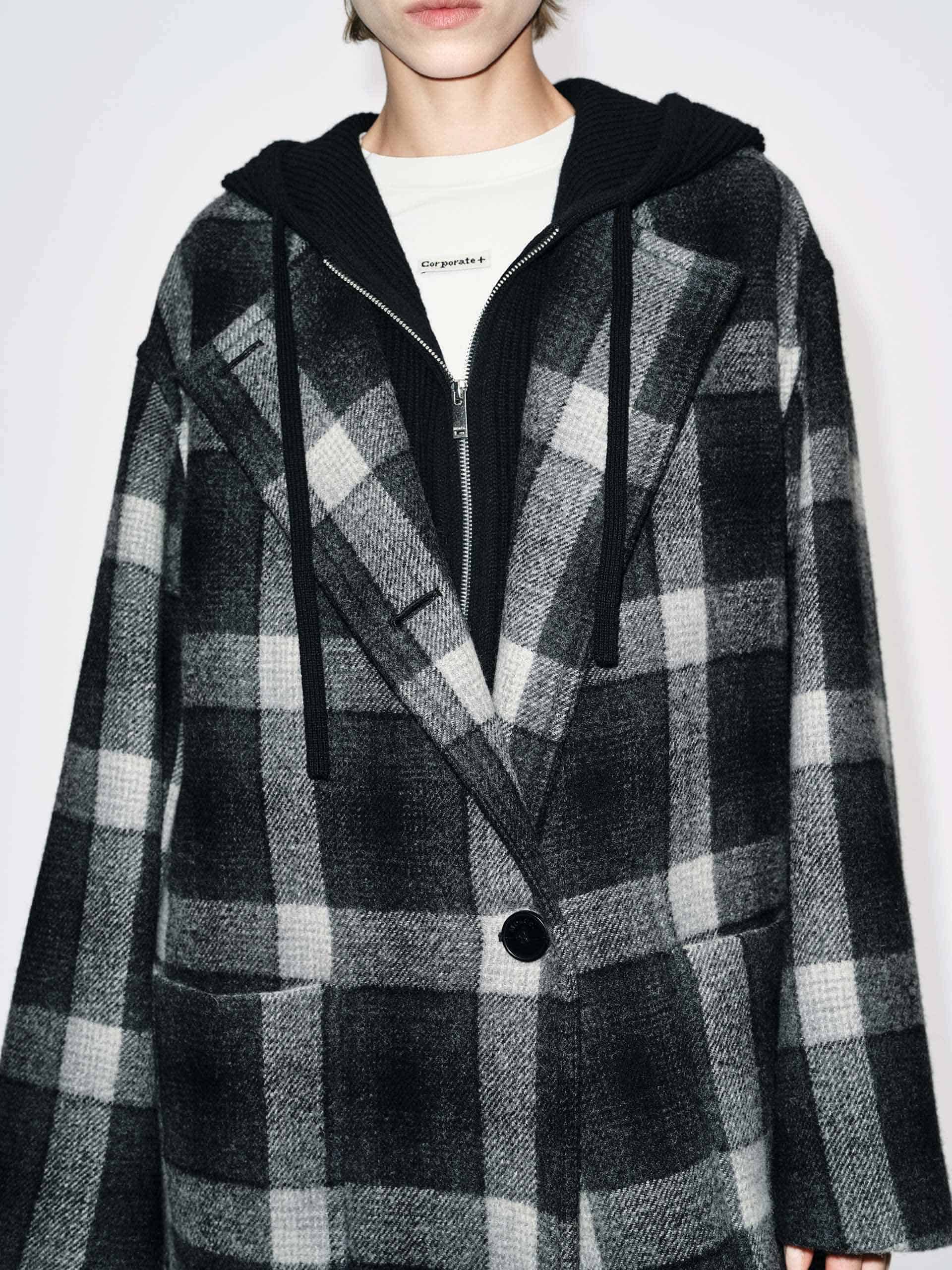 Unveil a masterful blend of structure and softness in this coat. Practical details like the classic button closure and spacious patch pockets are thoughtfully integrated, offering both style and utility. The defining feature is the innovative paneled knitted drawstring hood, introducing a textural contrast and customizable fit that elevates the entire piece with a modern, architecturally-inspired detail.