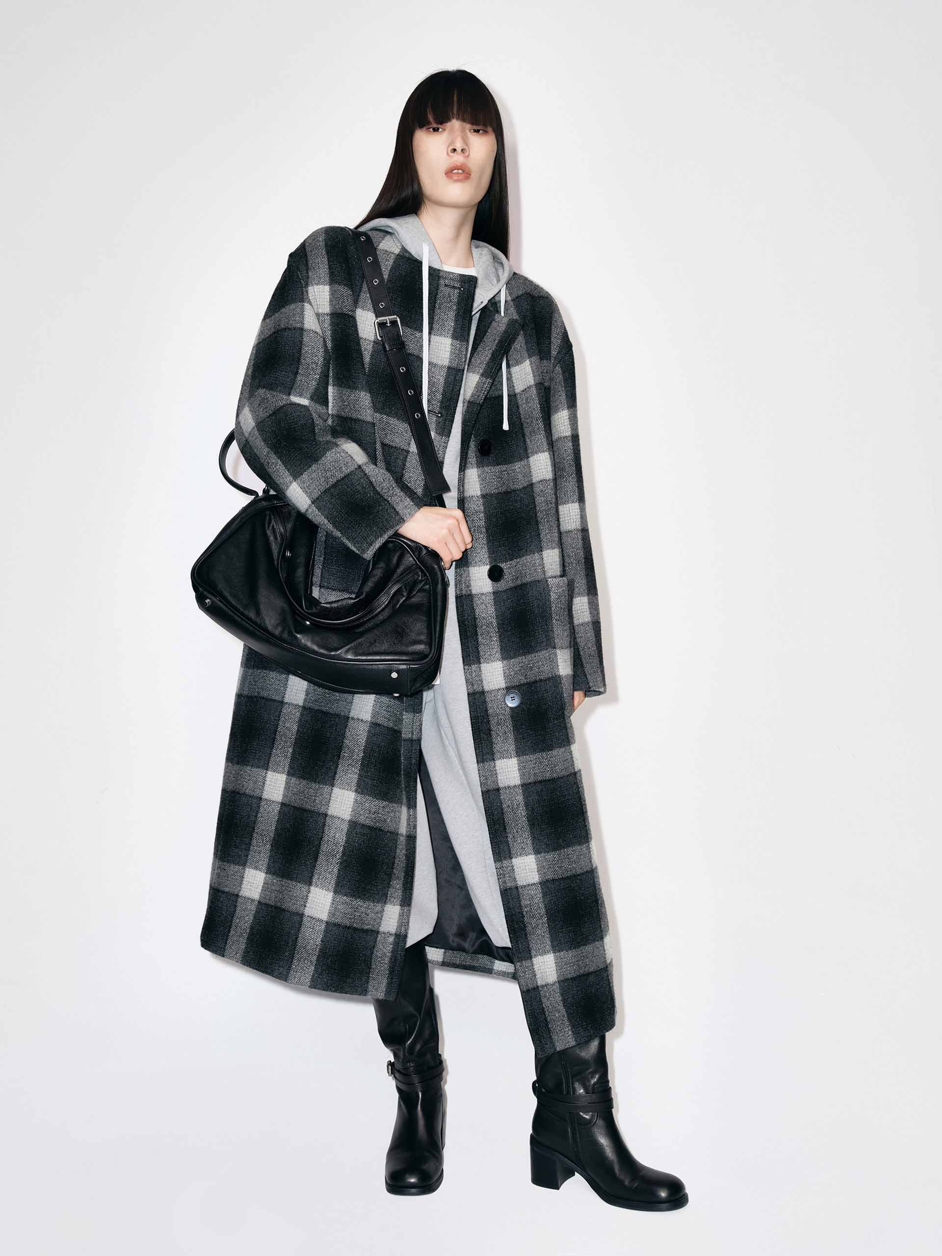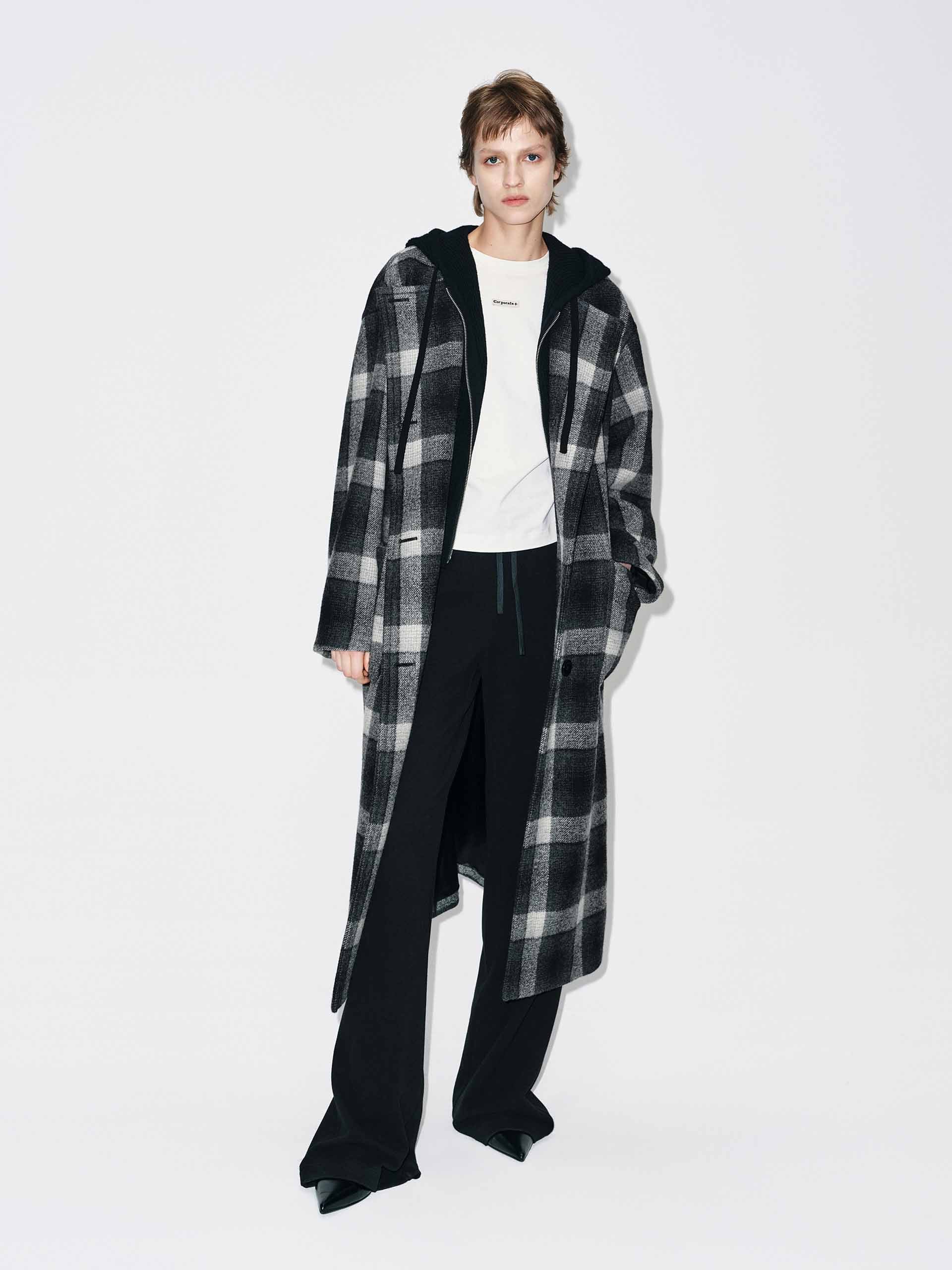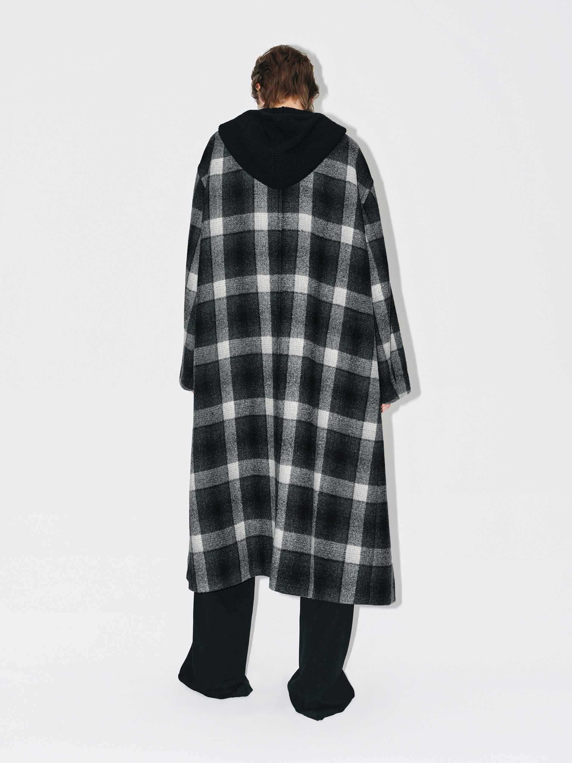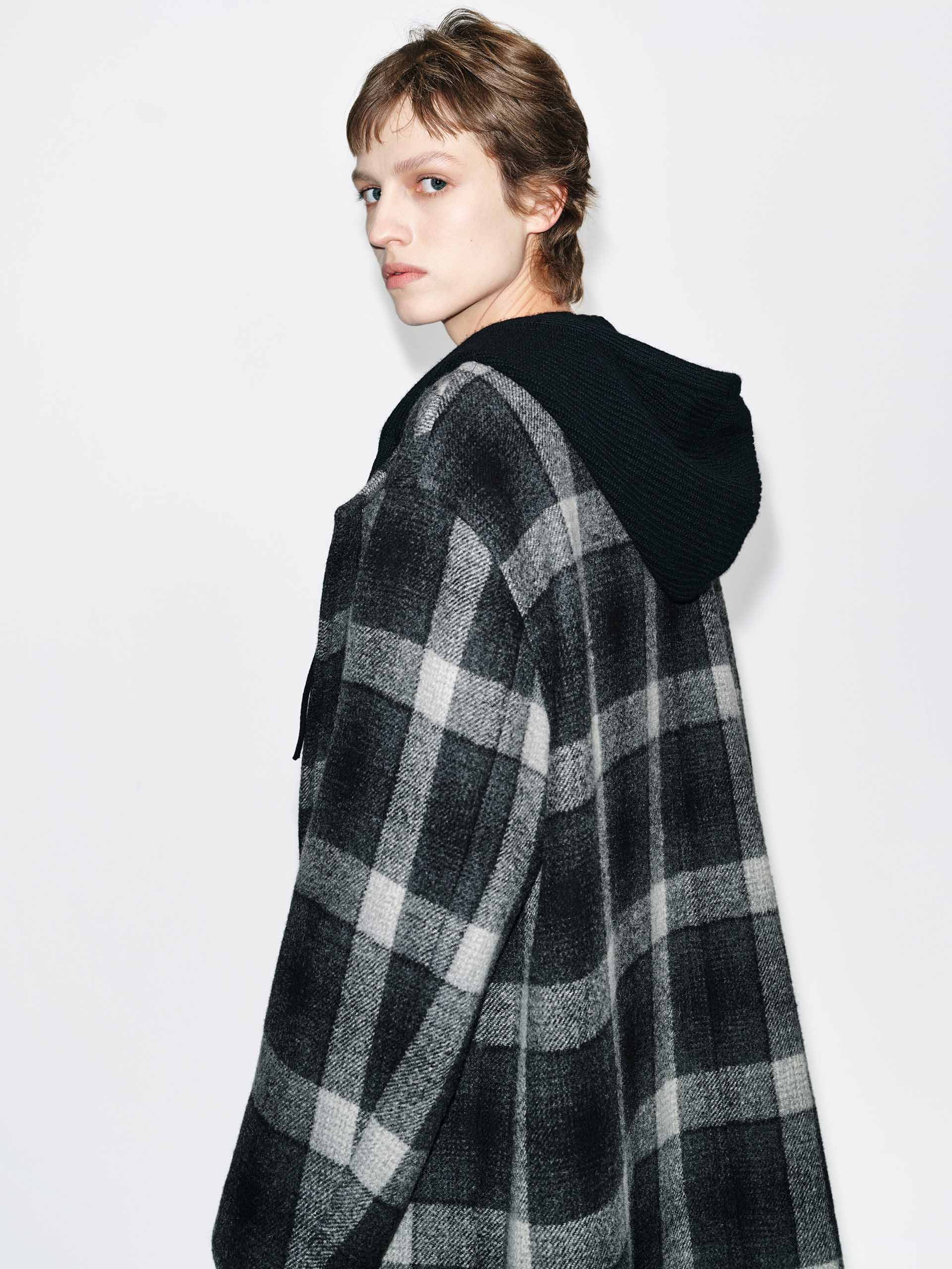 Unveil a masterful blend of structure and softness in this coat. Practical details like the classic button closure and spacious patch pockets are thoughtfully integrated, offering both style and utility. The defining feature is the innovative paneled knitted drawstring hood, introducing a textural contrast and customizable fit that elevates the entire piece with a modern, architecturally-inspired detail.
