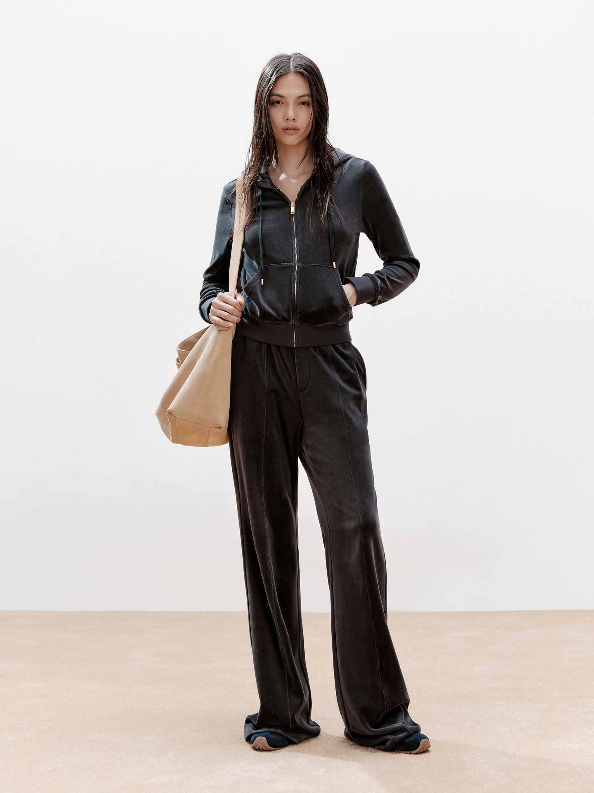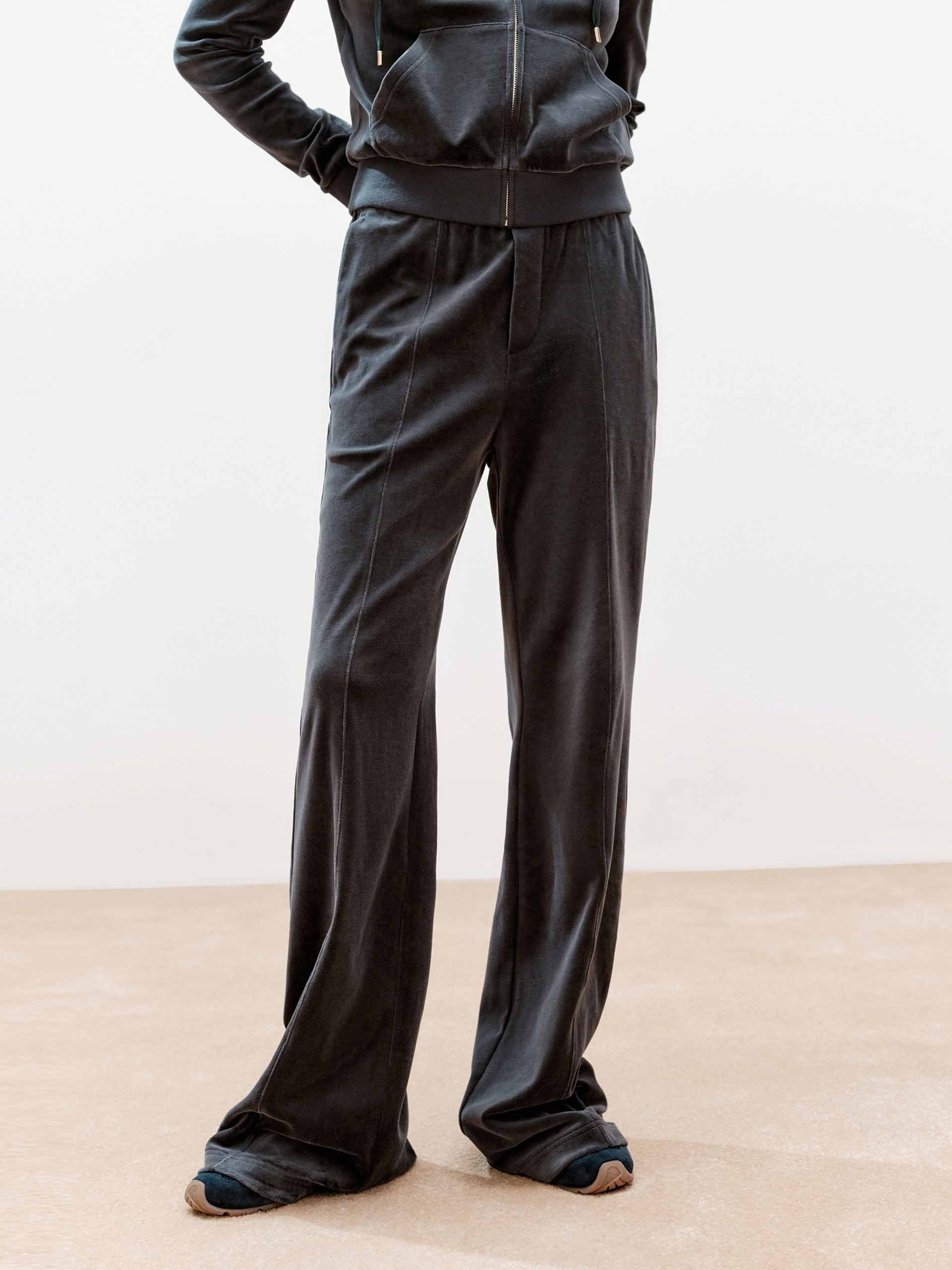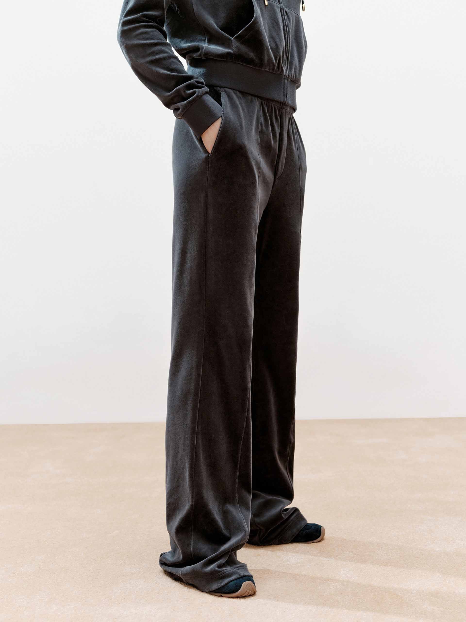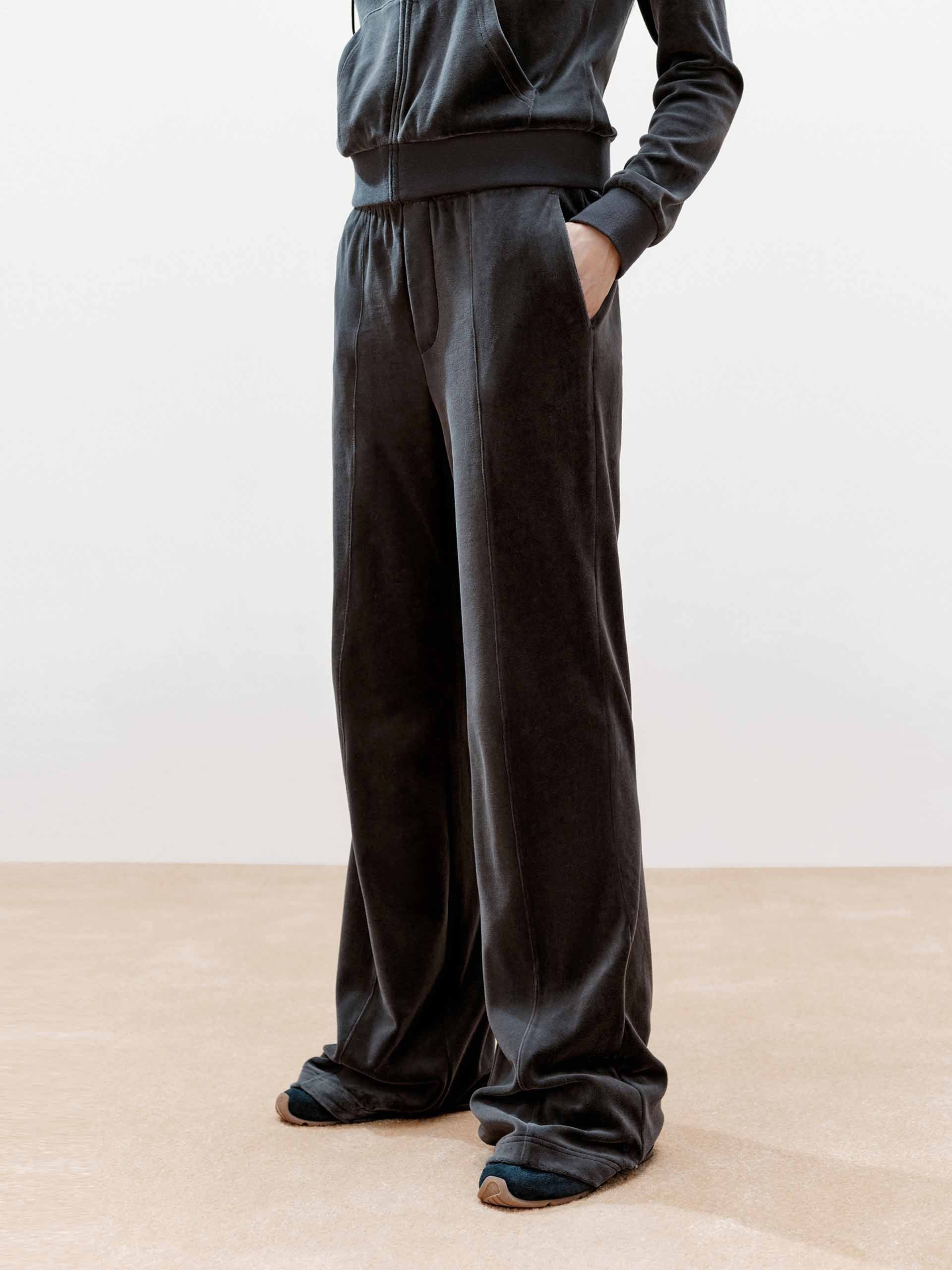 Channel retro glamour with these trousers, featuring a dramatic, flowing silhouette that elongates the leg for a statement-making profile. Designed with a comfortable elasticated waistband and functional side pockets, they seamlessly blend practical comfort with high style. The sleek front seams enhance the elegant drape of the luxurious velvet fabric. Pair with the matching jacket for a more sophisticated and charming look.