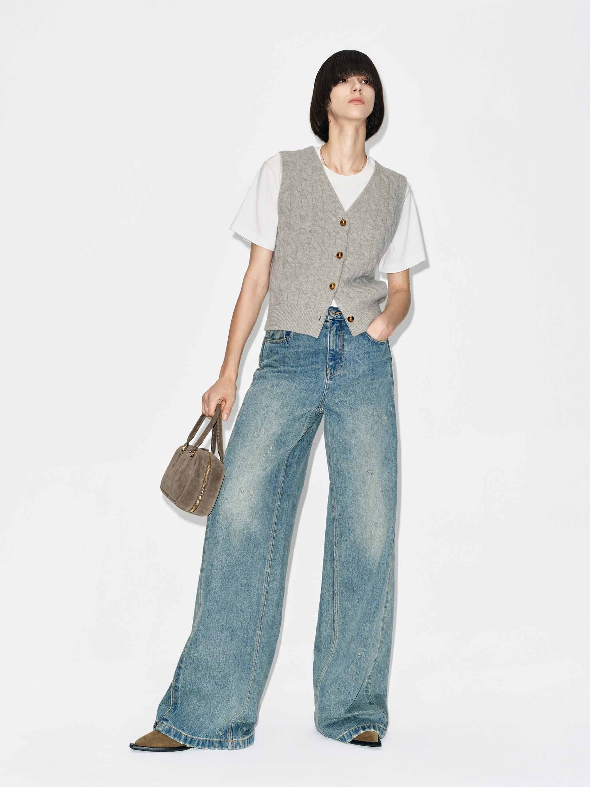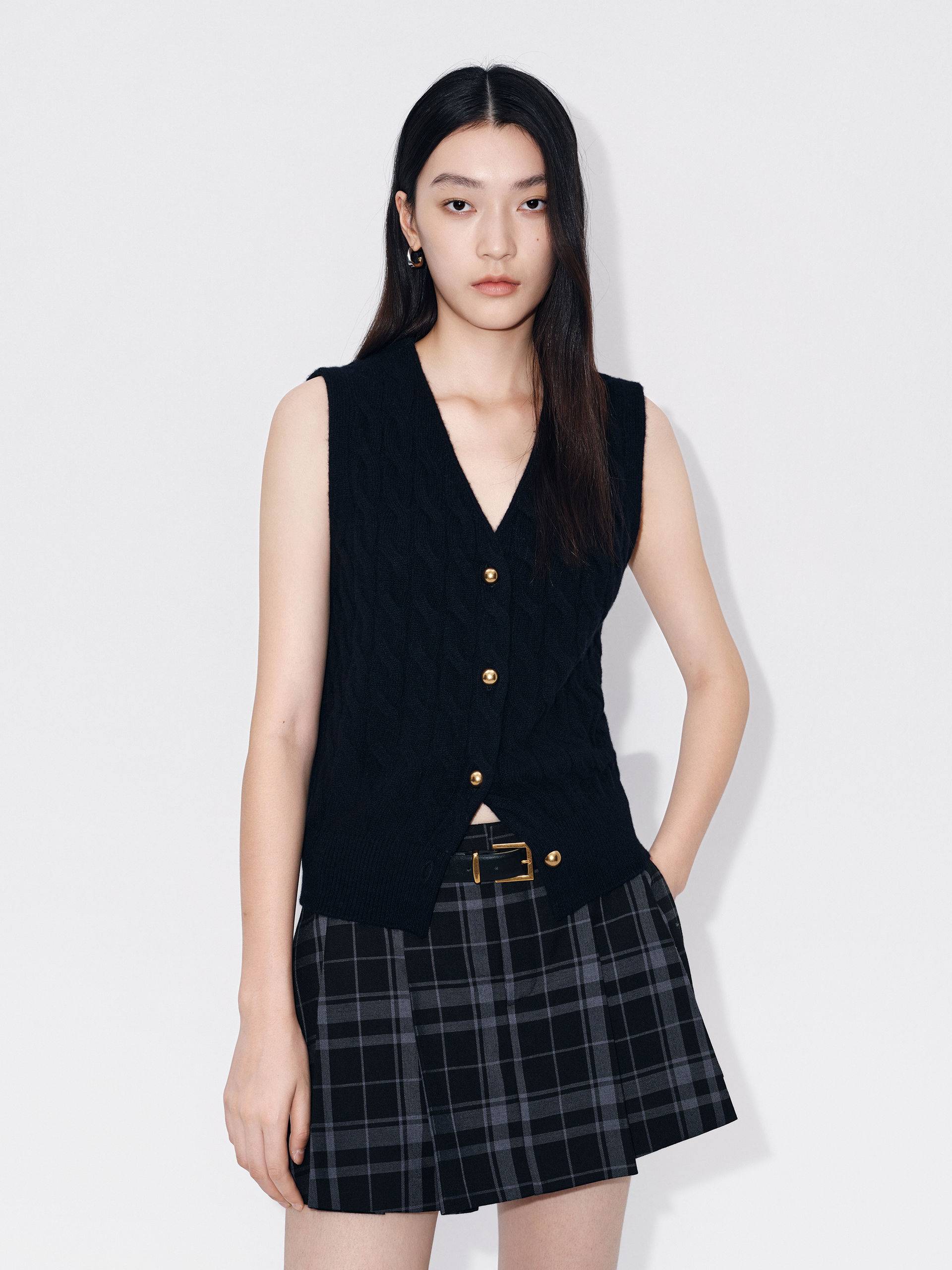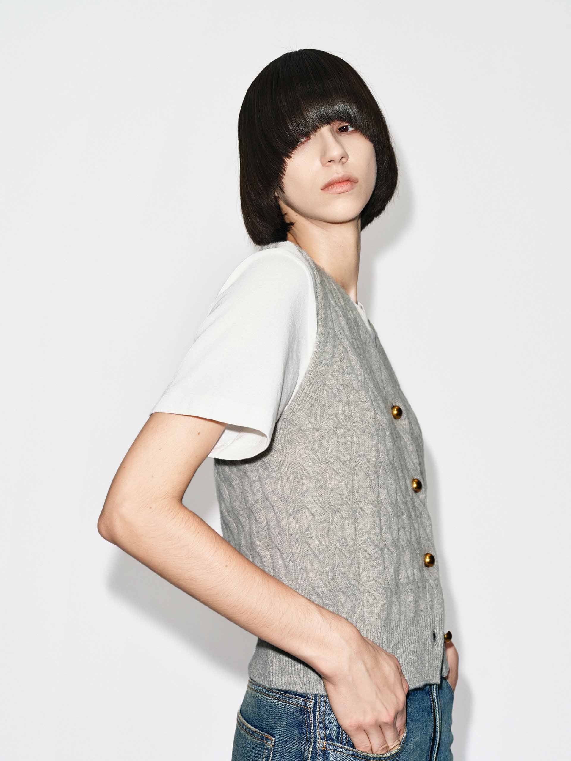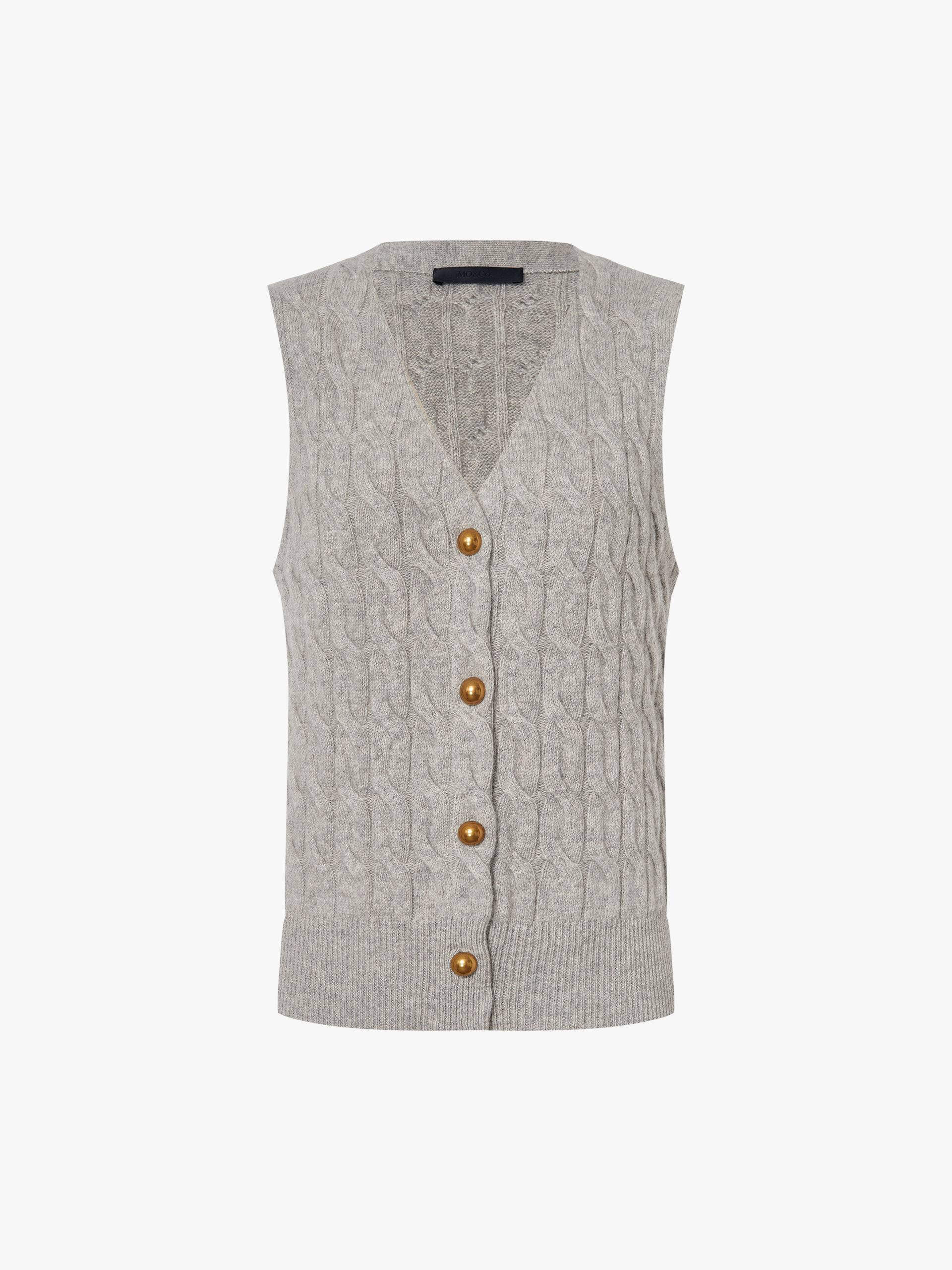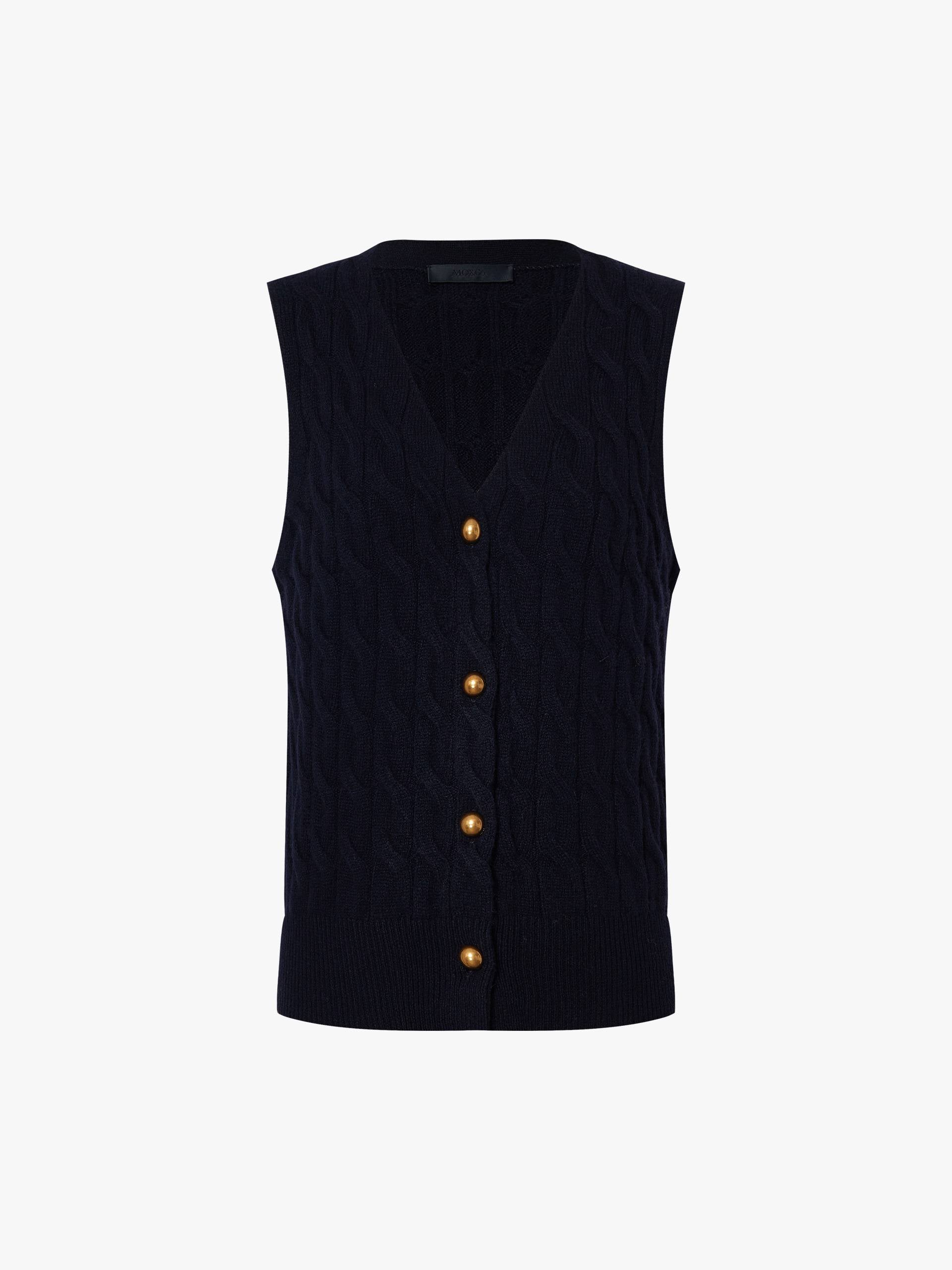 Effortlessly elevate your layered looks with this cardigan, designed with a slim fit for a modern silhouette. It features a flattering V-neckline and intricate cable knit design, crafted from a soft and warm wool blend fabric. The sleeveless cut and convenient button closure offer versatile styling options, making it the perfect piece for adding a touch of refined texture and cozy sophistication to any outfit.