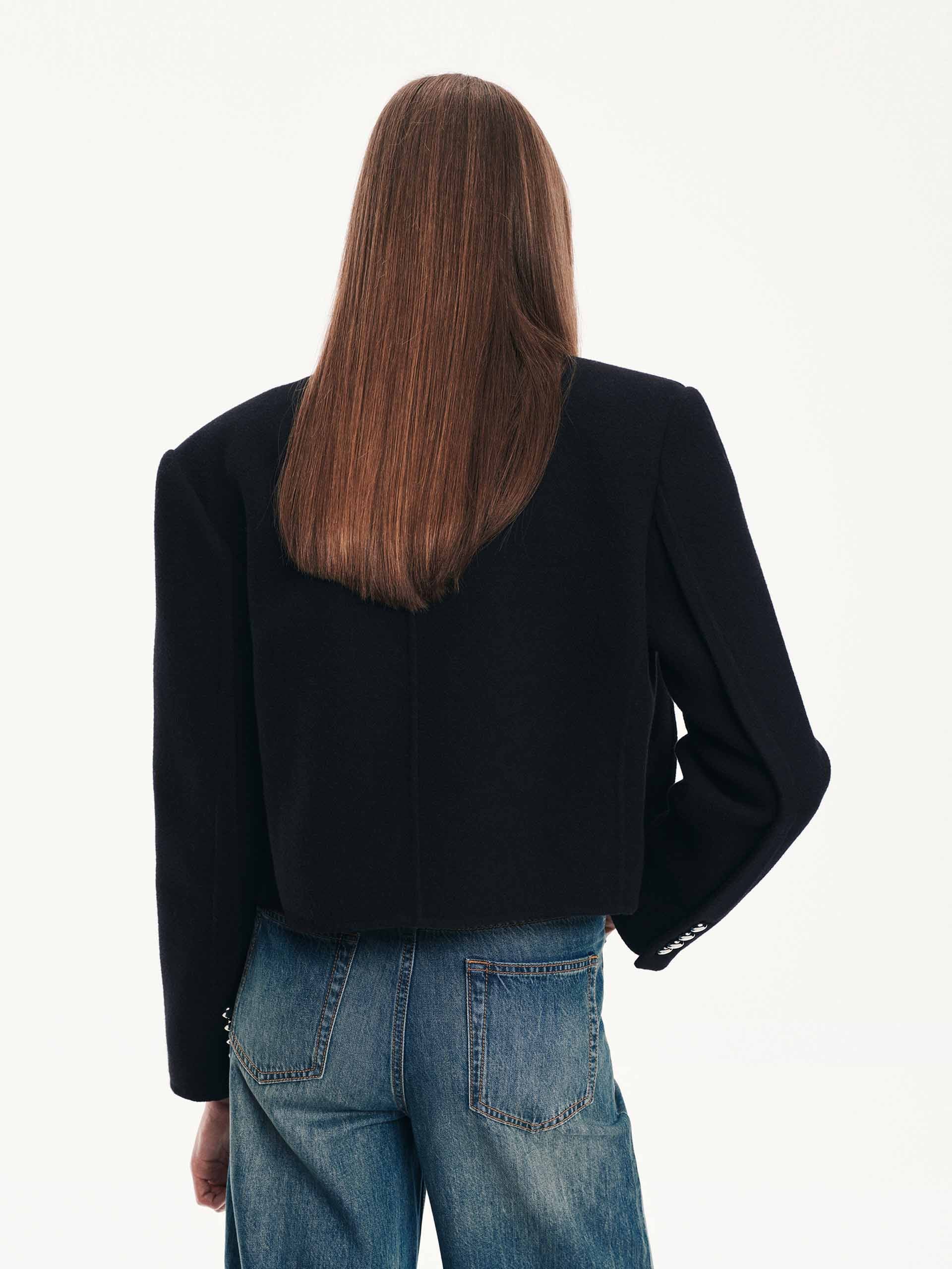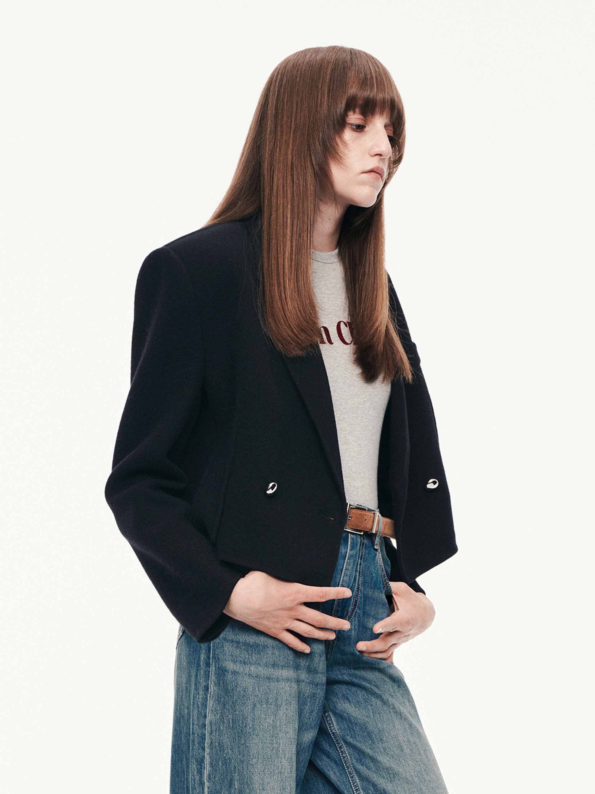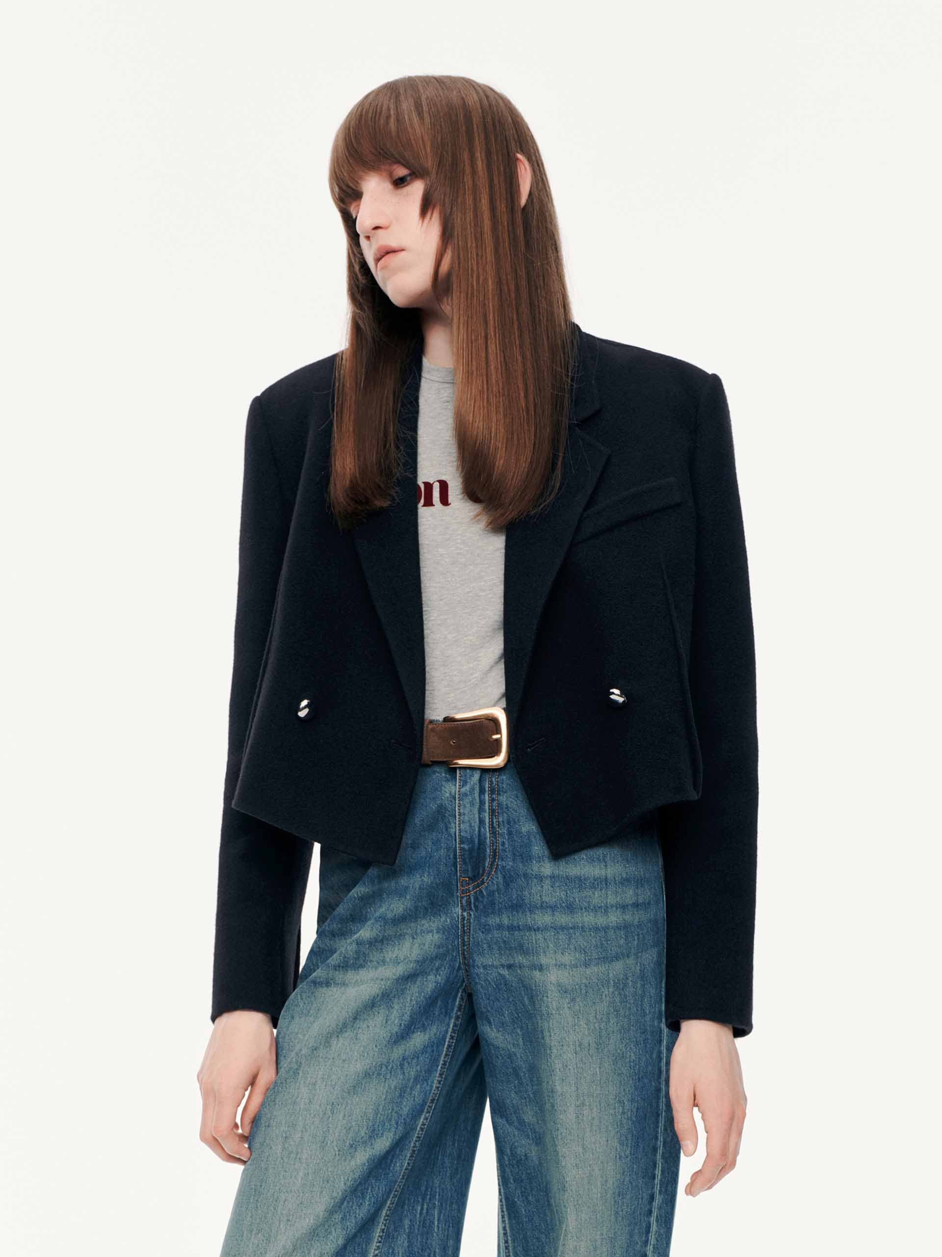 Command attention with our blazer, expertly tailored from 100% wool for a luxurious feel and timeless structure. Designed to make a statement, its cropped fit pairs perfectly with high-waisted trousers. The sharp peak lapel and structured pad shoulders create a powerful, confident frame, while the button closure ensures a clean and polished front.