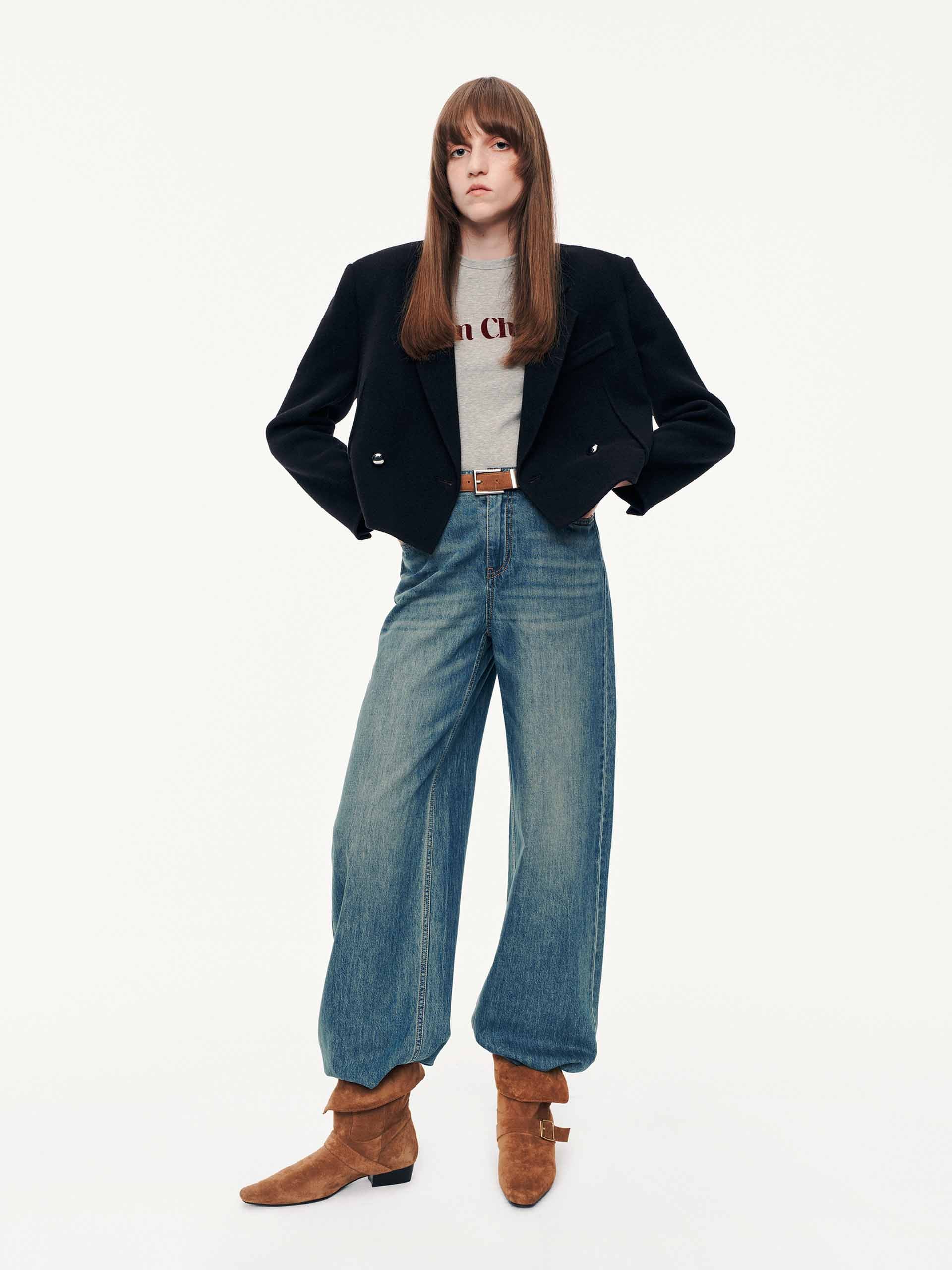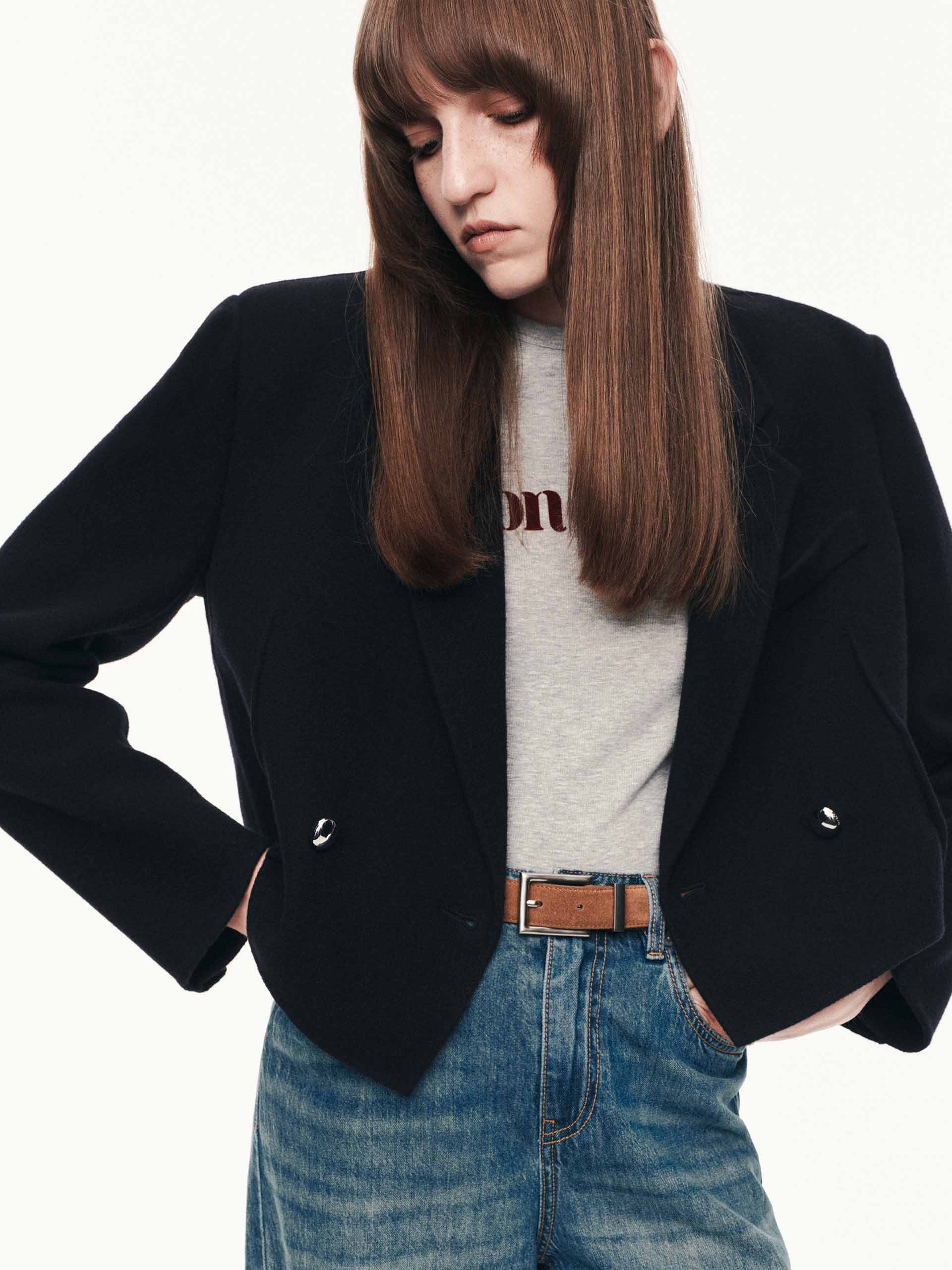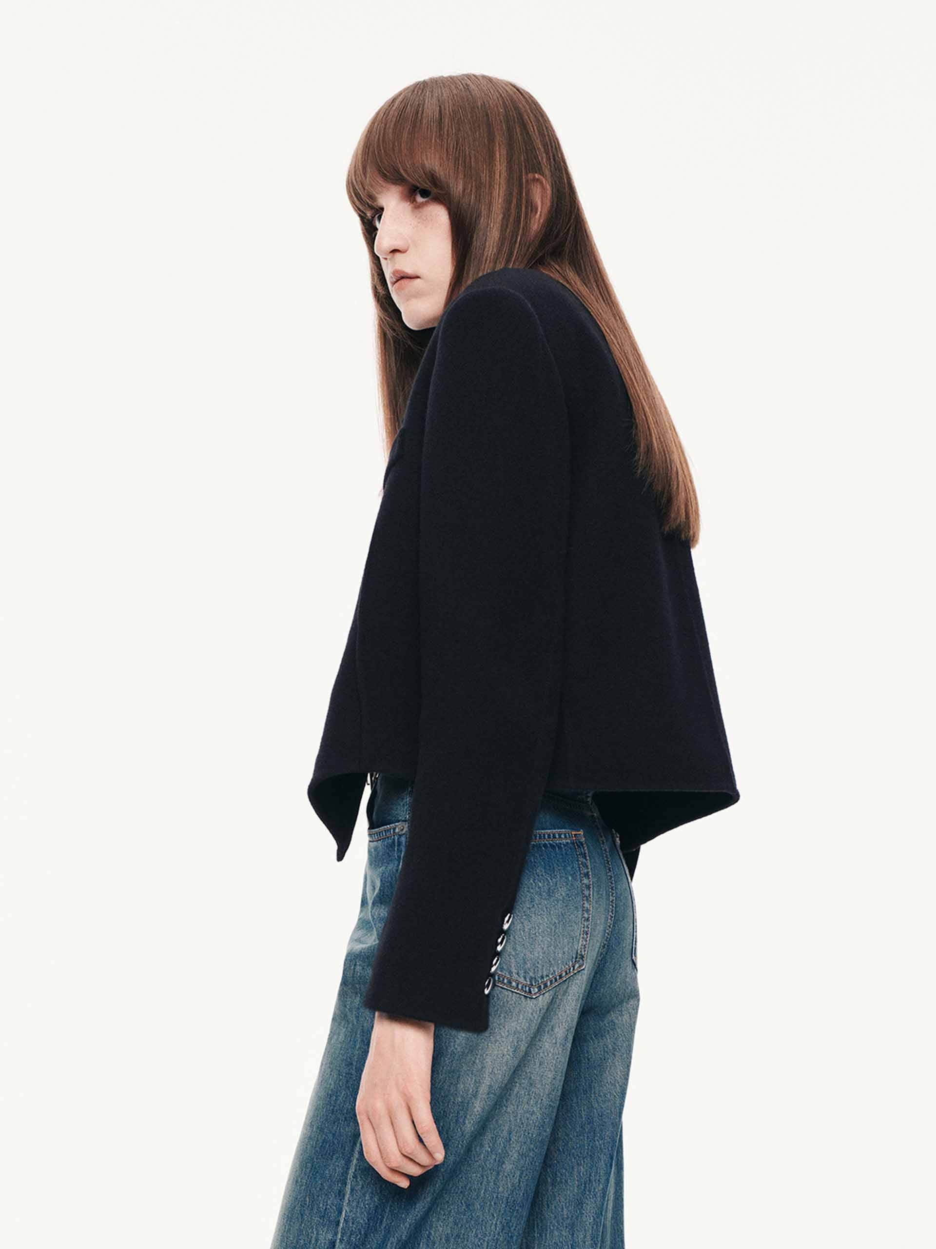 Command attention with our blazer, expertly tailored from 100% wool for a luxurious feel and timeless structure. Designed to make a statement, its cropped fit pairs perfectly with high-waisted trousers. The sharp peak lapel and structured pad shoulders create a powerful, confident frame, while the button closure ensures a clean and polished front.