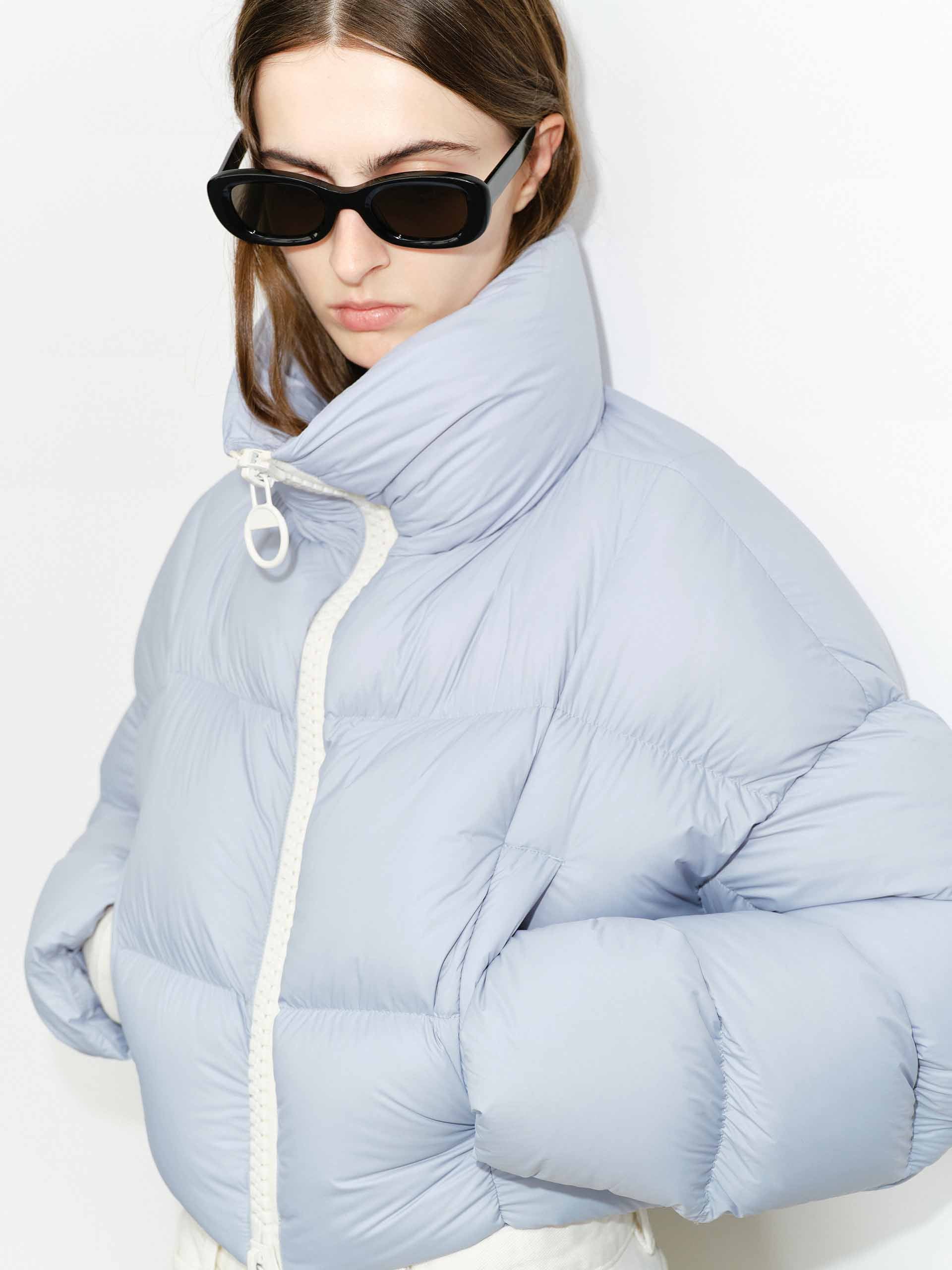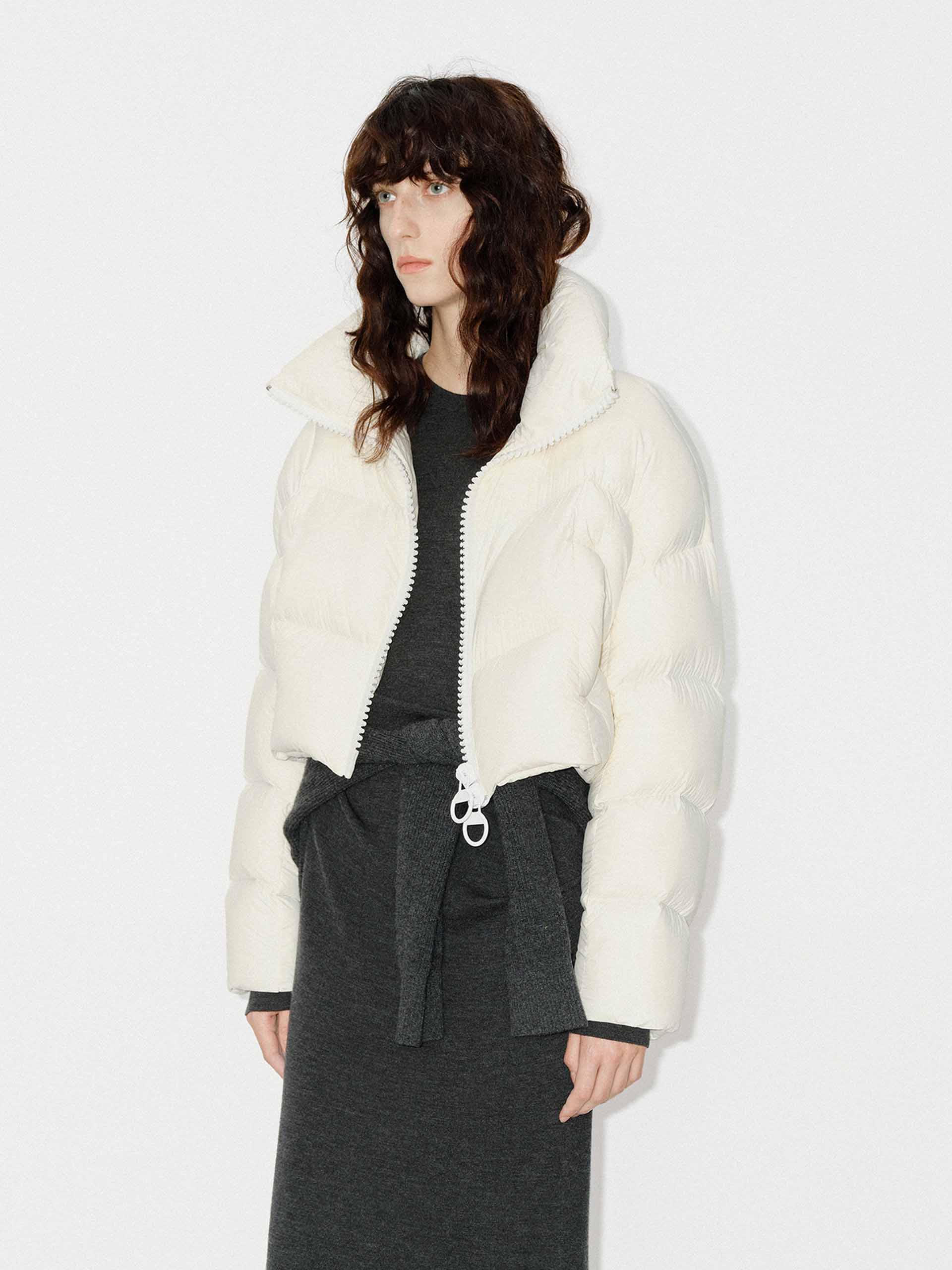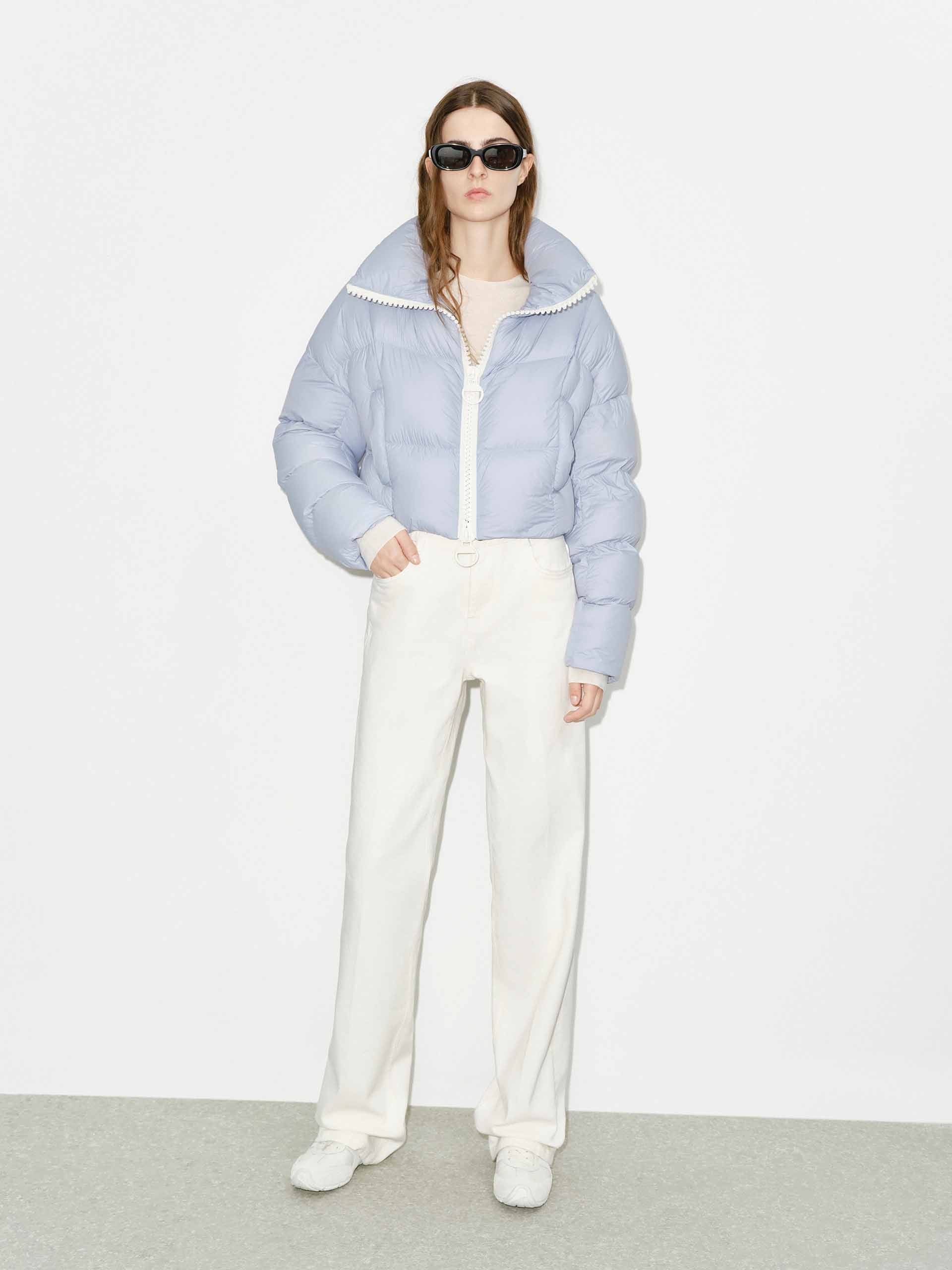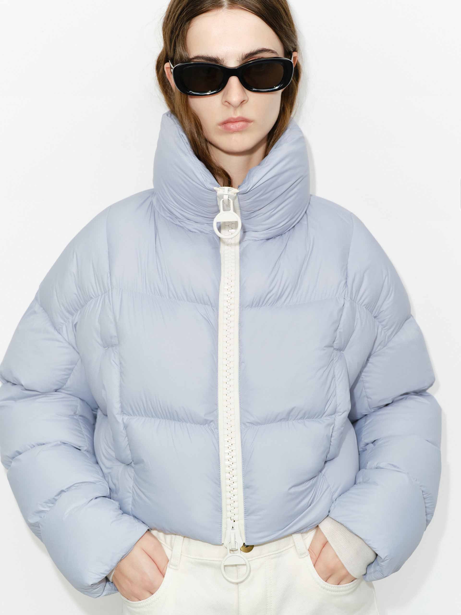 Designed for the cooler months ahead, this liner jacket is filled with recycled down and feather padding. It features a side pocket and a funnel neck for extra protection. With a unique short and contrast zipper design, it effortlessly combines fashion and practicality.