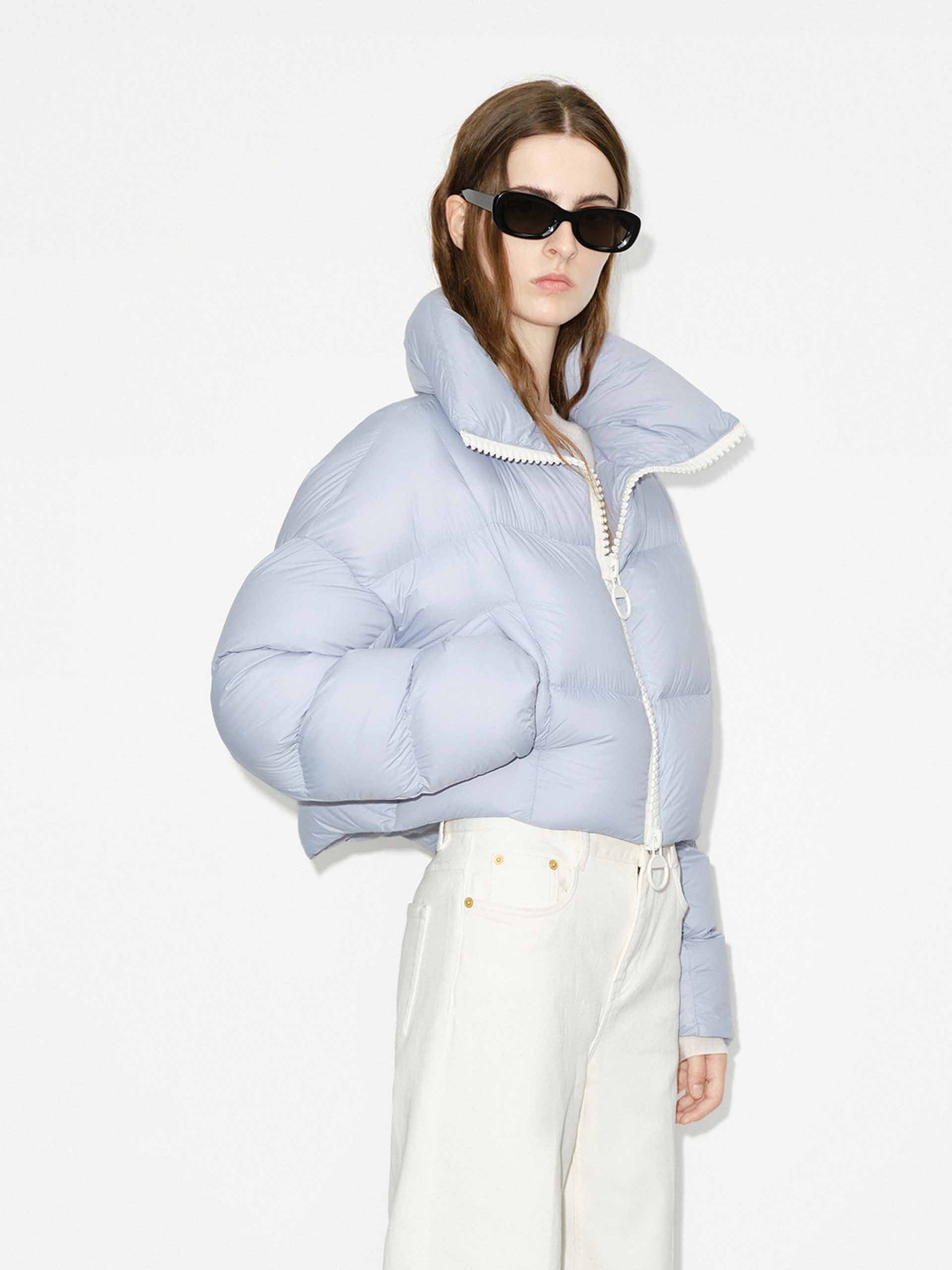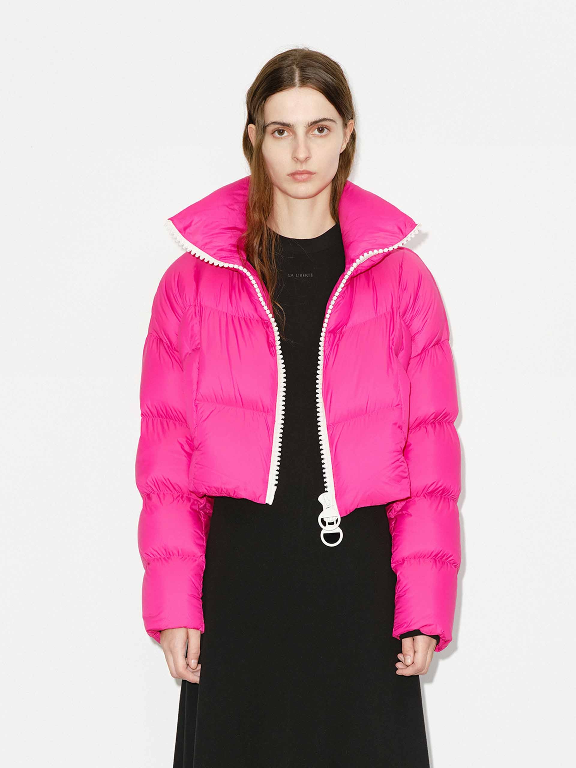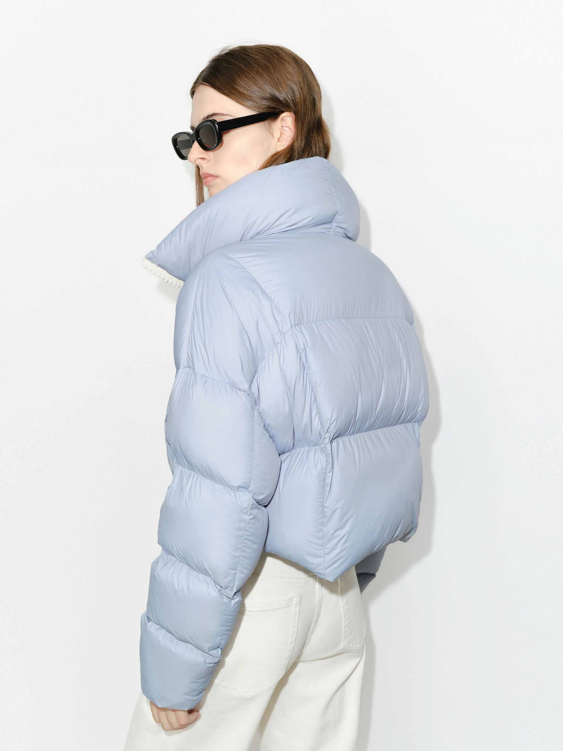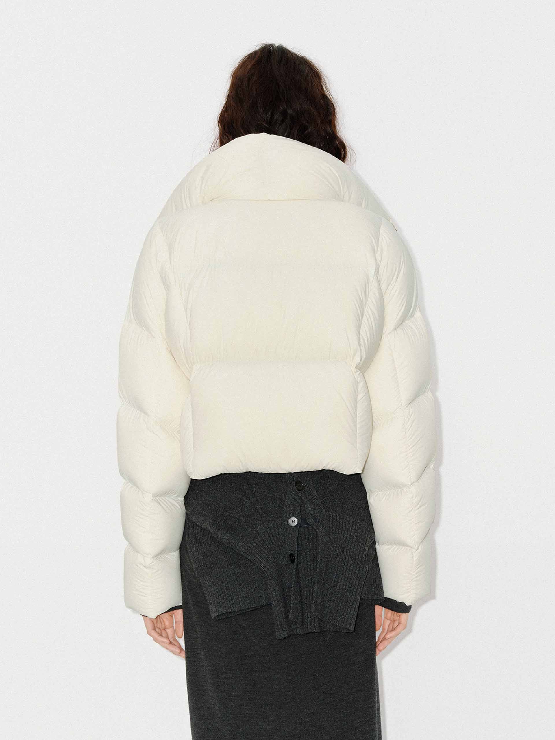 Designed for the cooler months ahead, this liner jacket is filled with recycled down and feather padding. It features a side pocket and a funnel neck for extra protection. With a unique short and contrast zipper design, it effortlessly combines fashion and practicality.